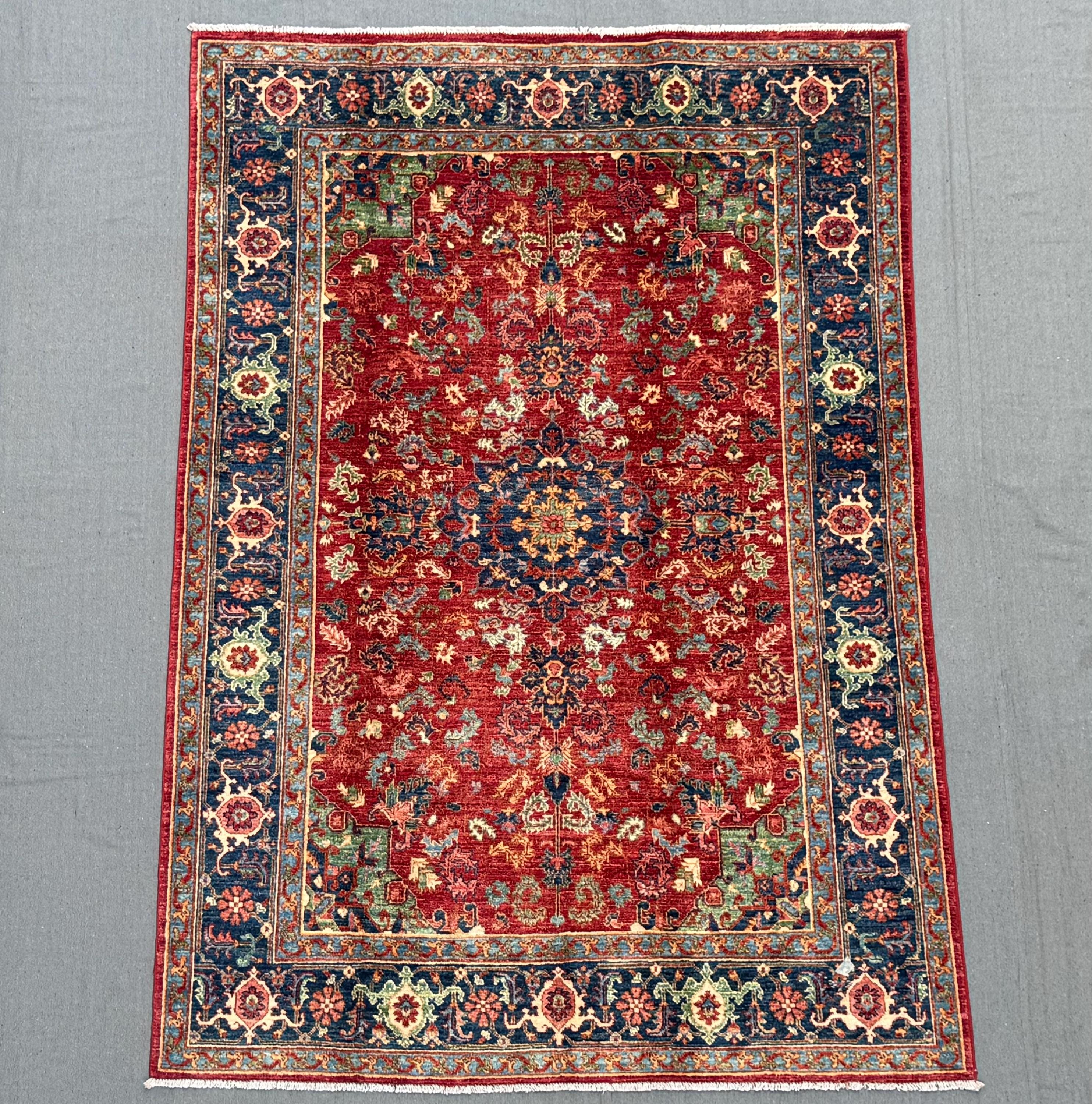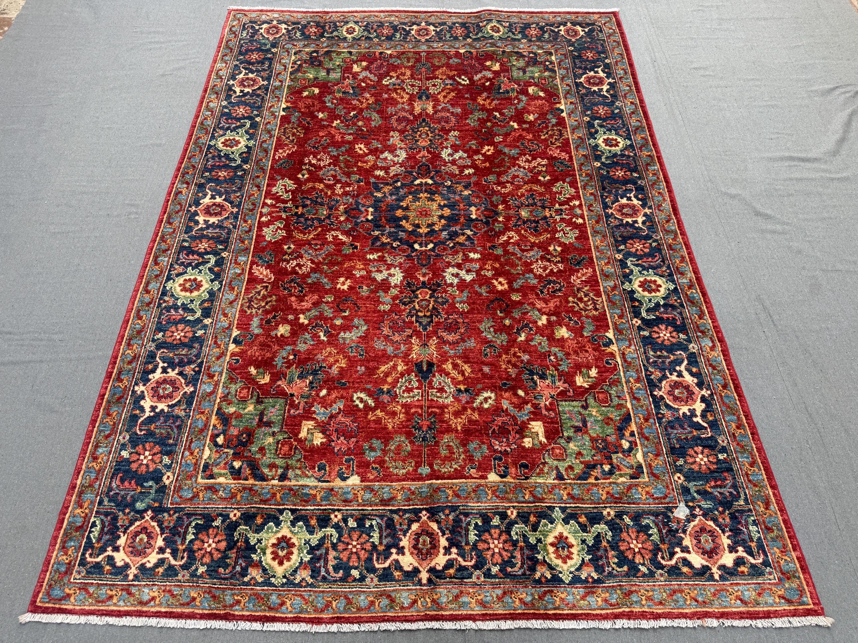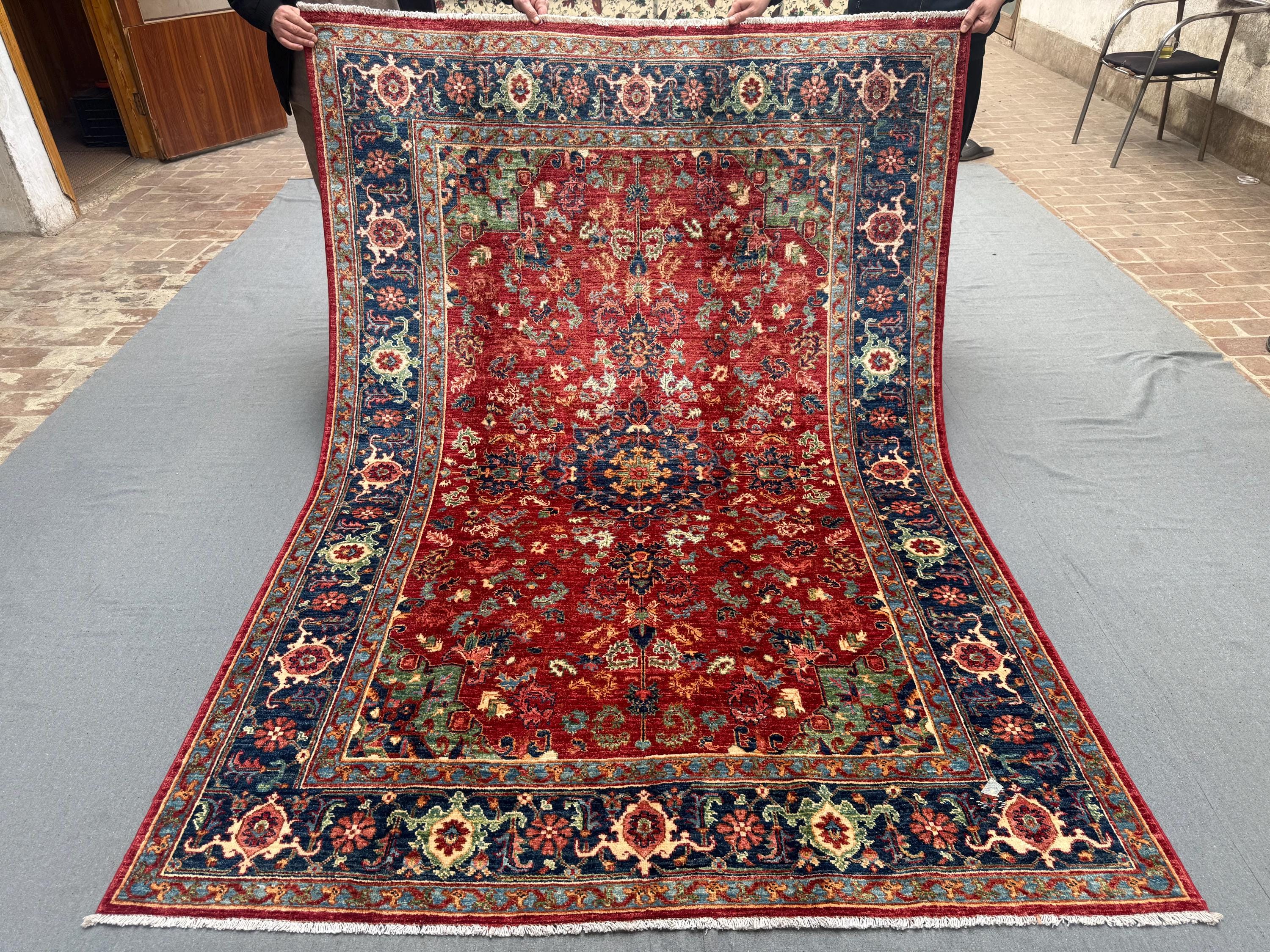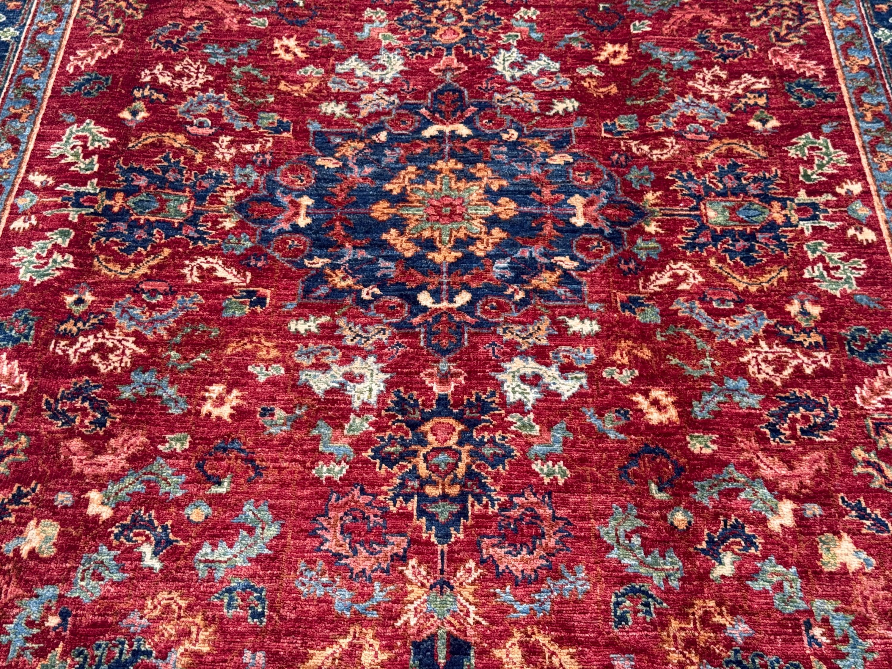 Heriz Area Rug 6x8 Handmade Wool Oriental Rug, Rich Red & Blue Floral Medallion Design Living Room Carpet