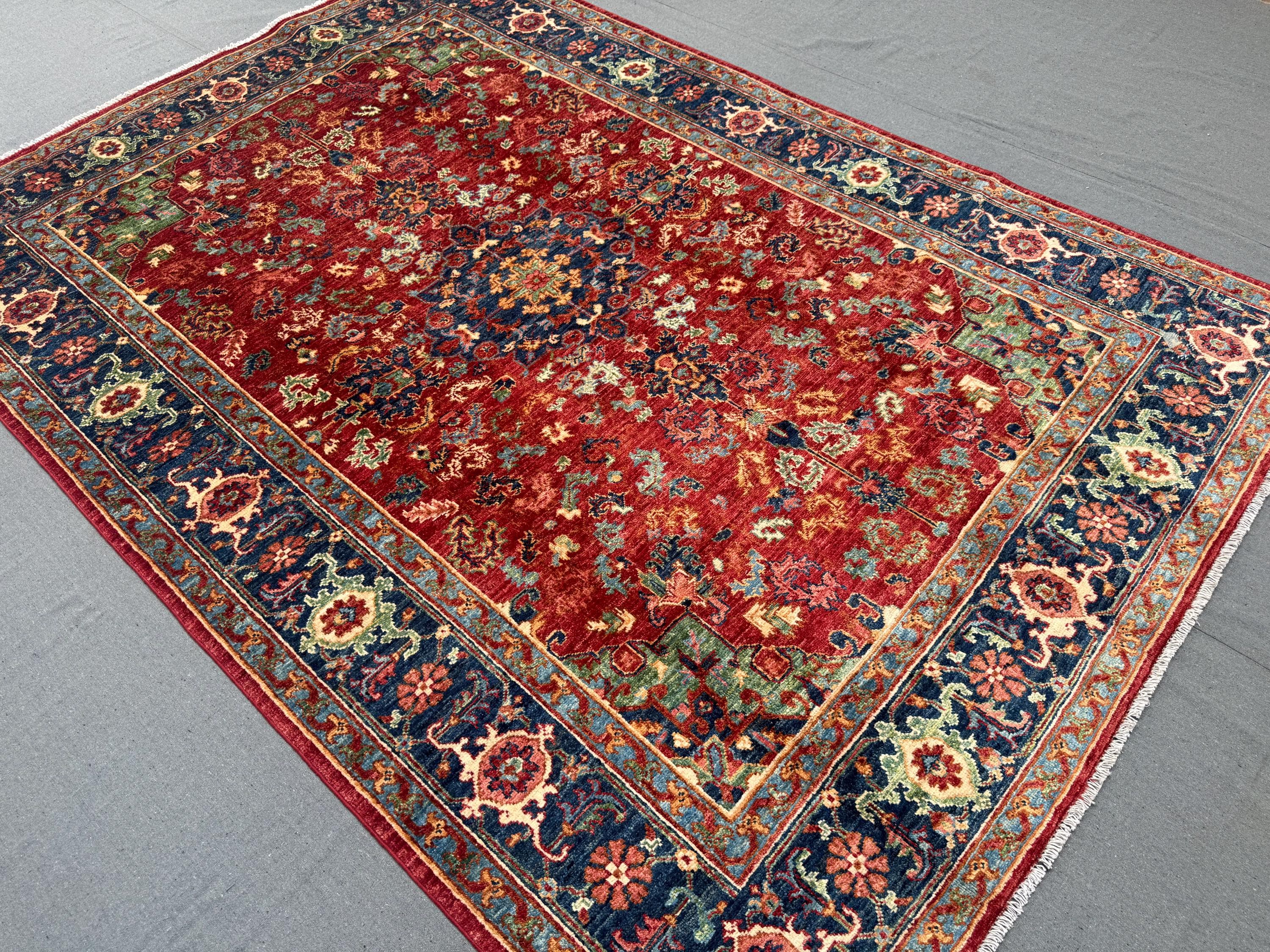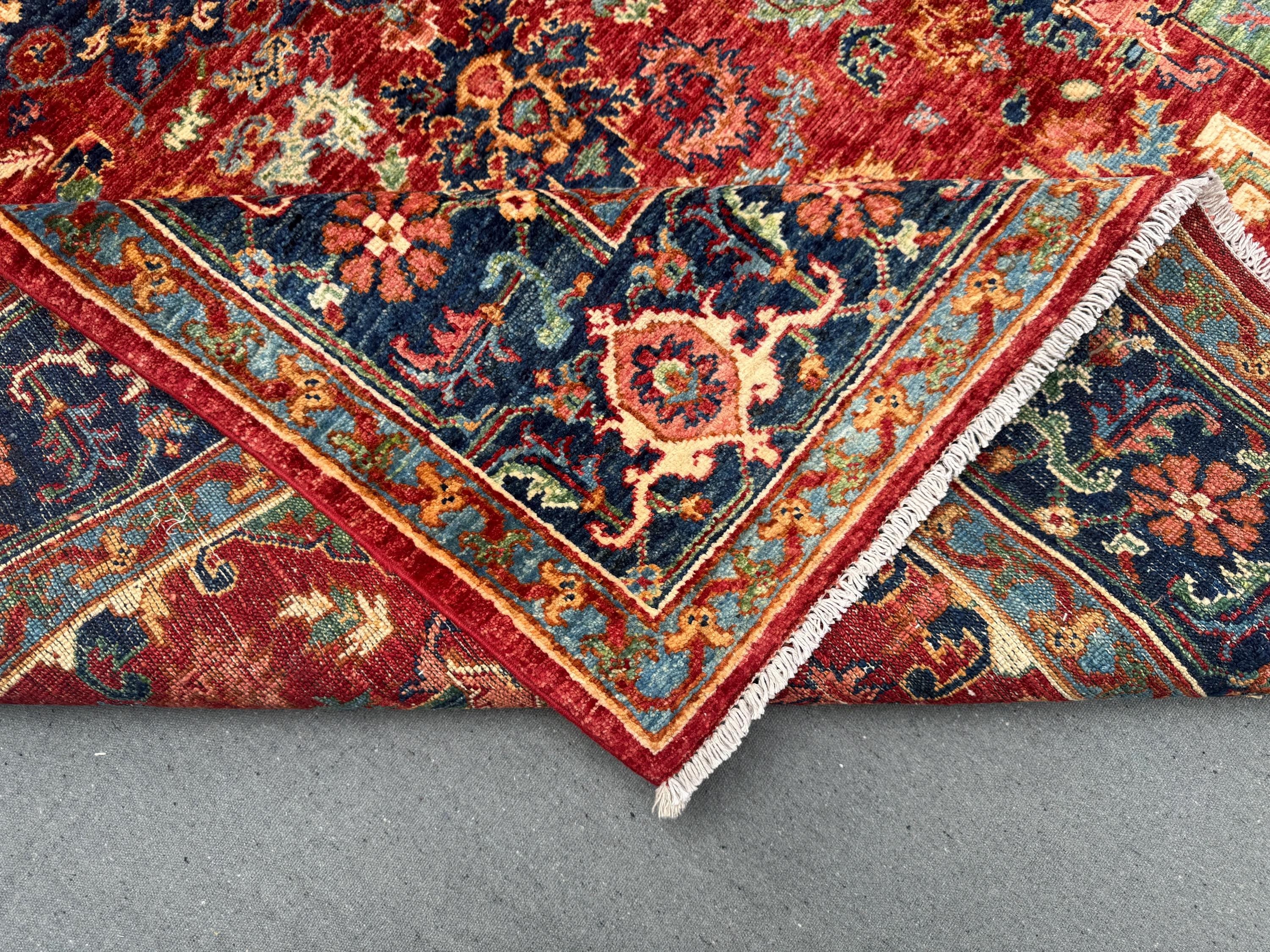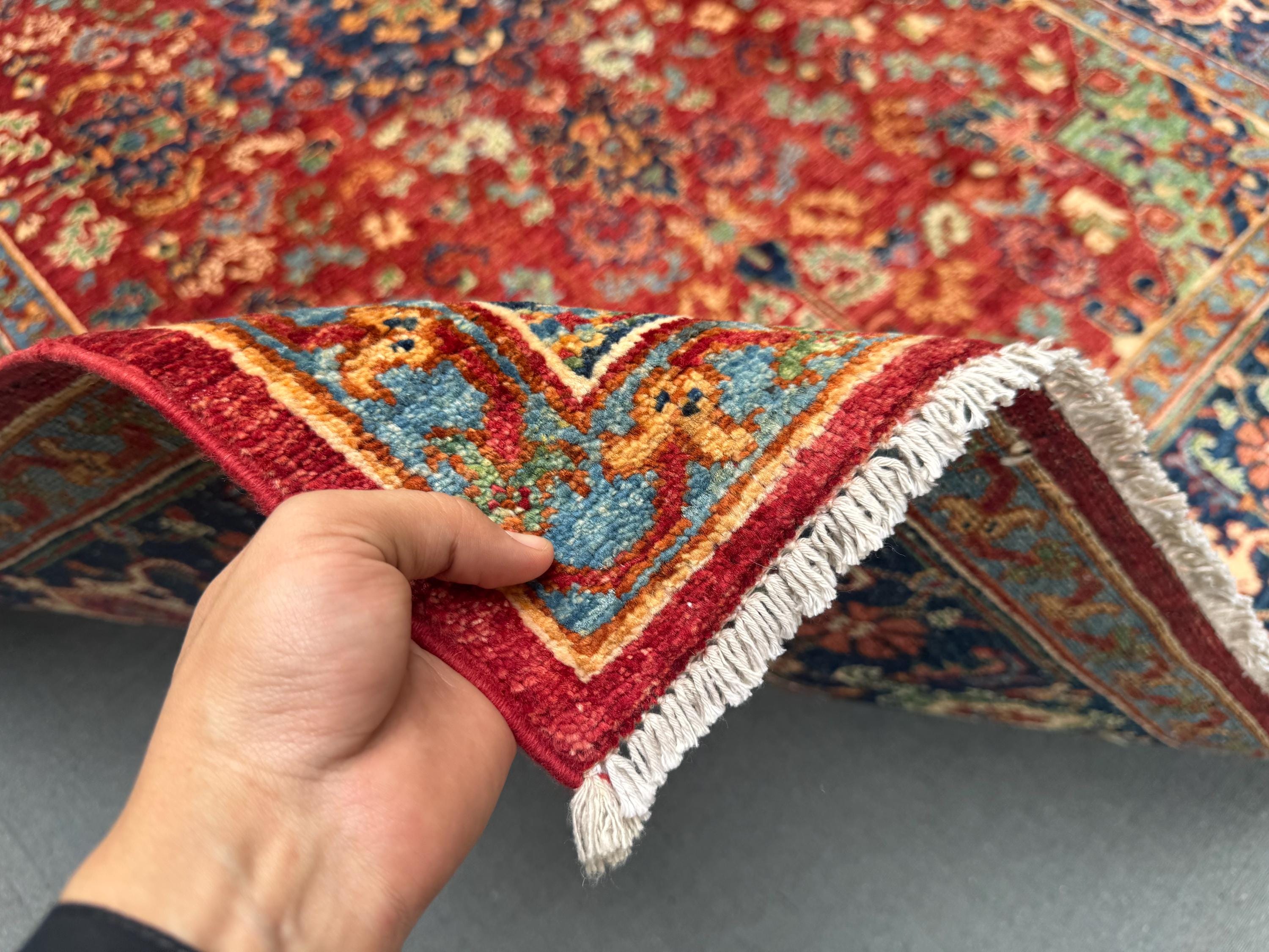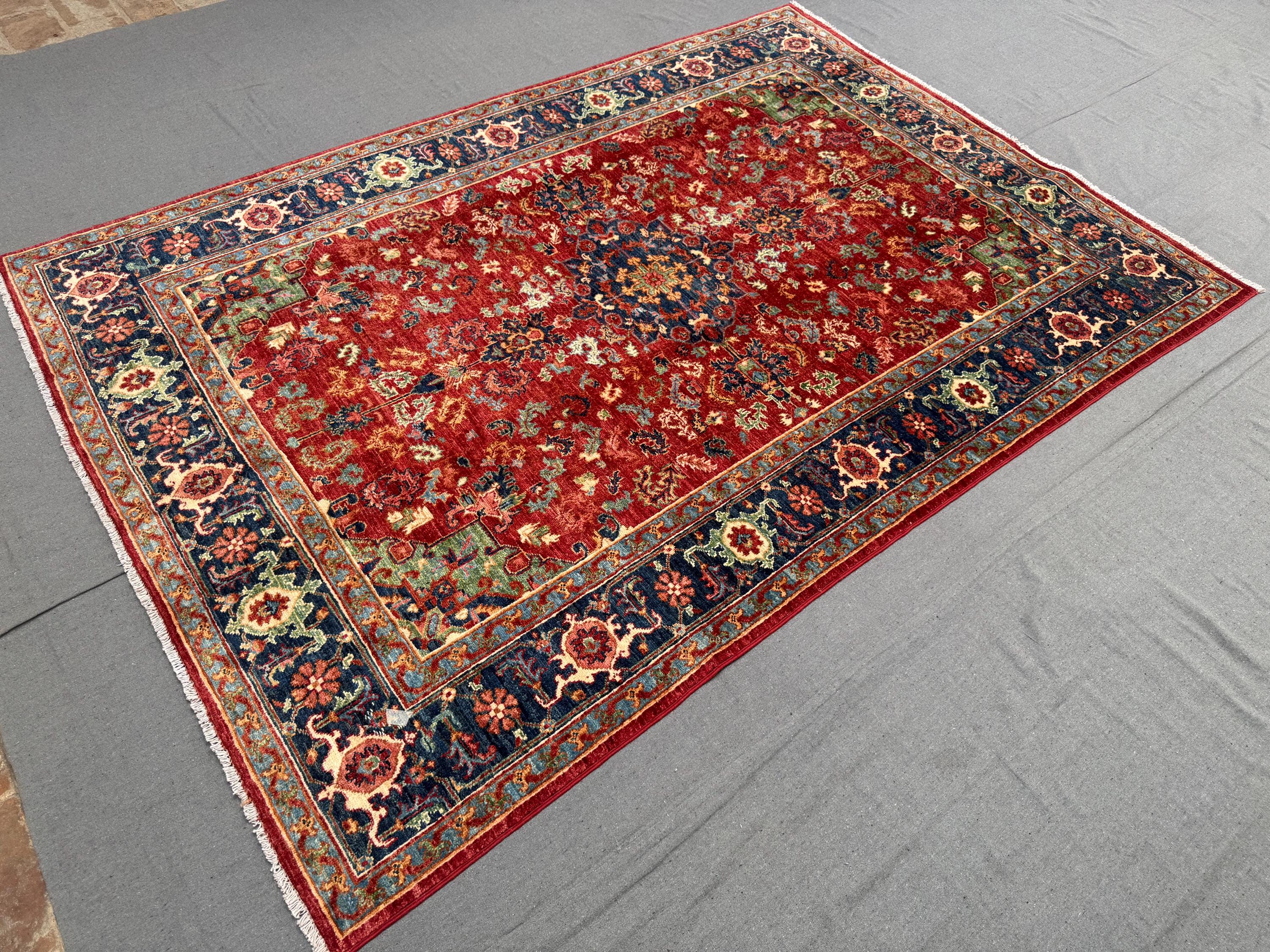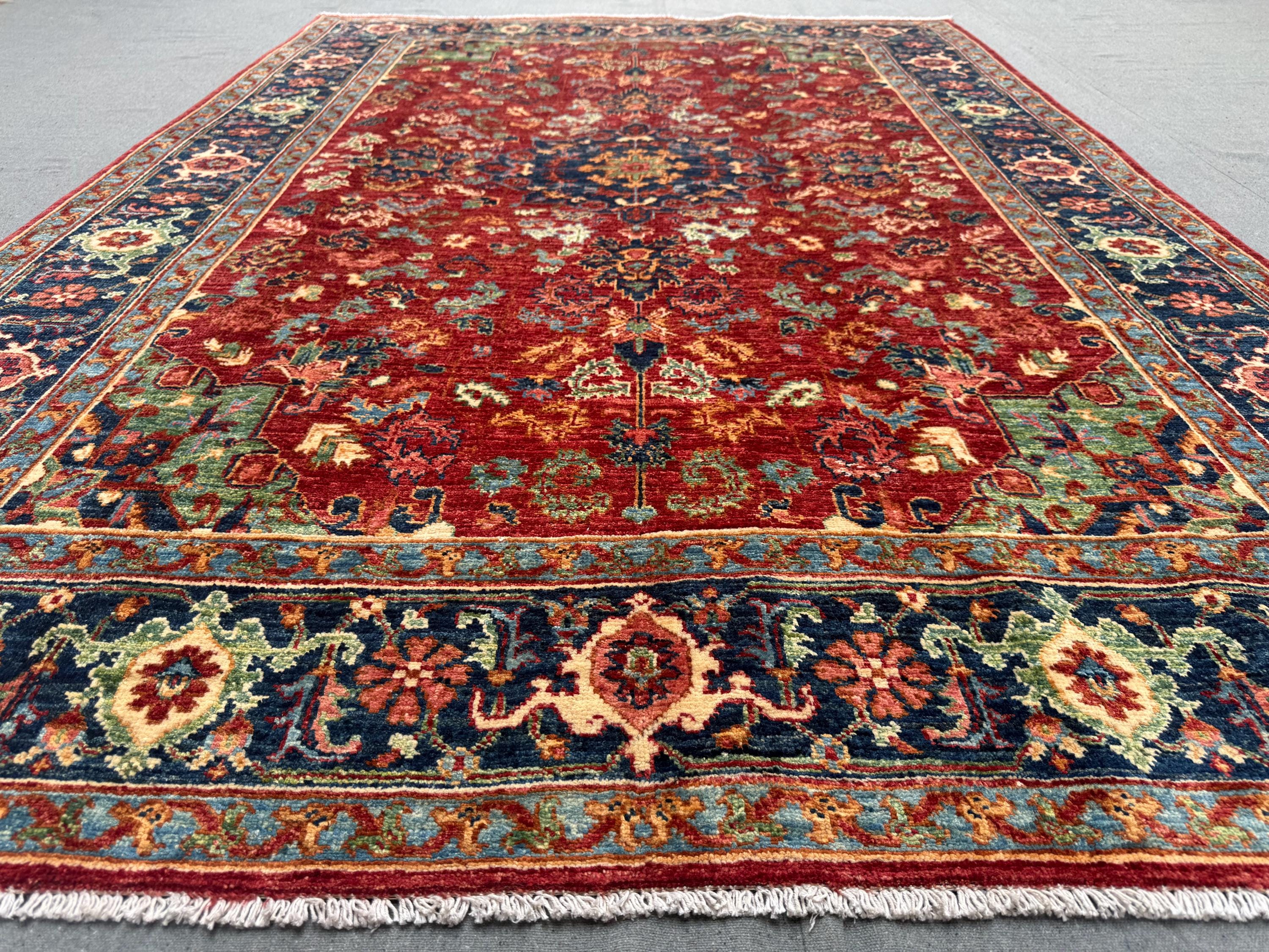 Add classic warmth and character to your space with this handmade Heriz wool rug, featuring a beautifully detailed floral medallion design set against a rich red field. The rug is framed with a striking deep blue border, accented by ivory, green, and gold tones, creating a balanced and timeless look suitable for a variety of interiors.