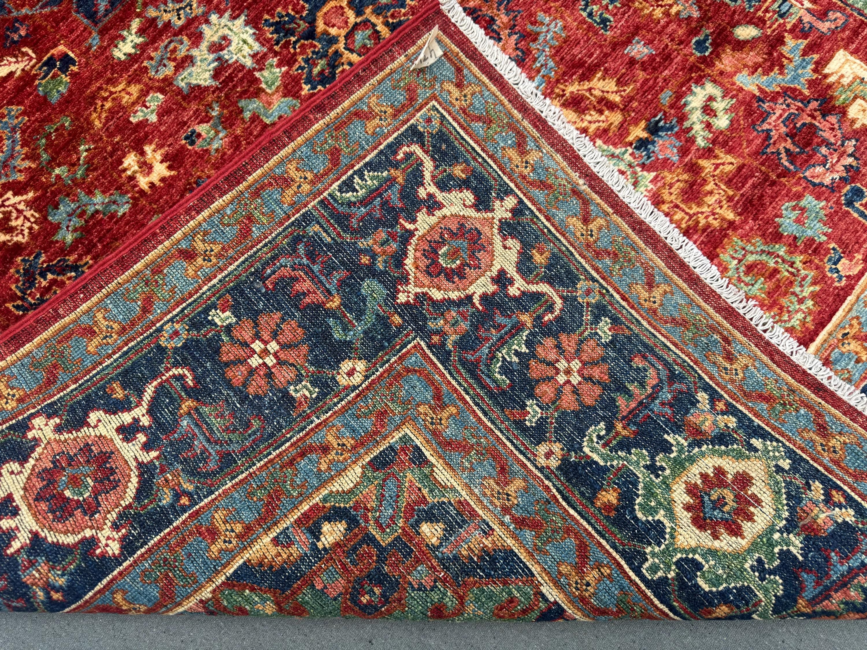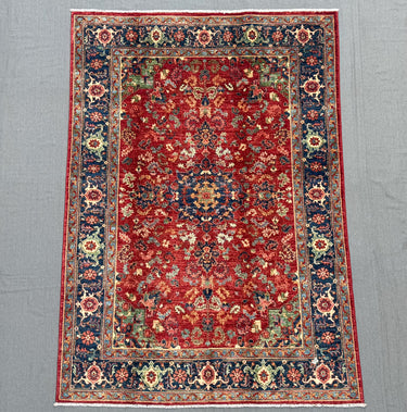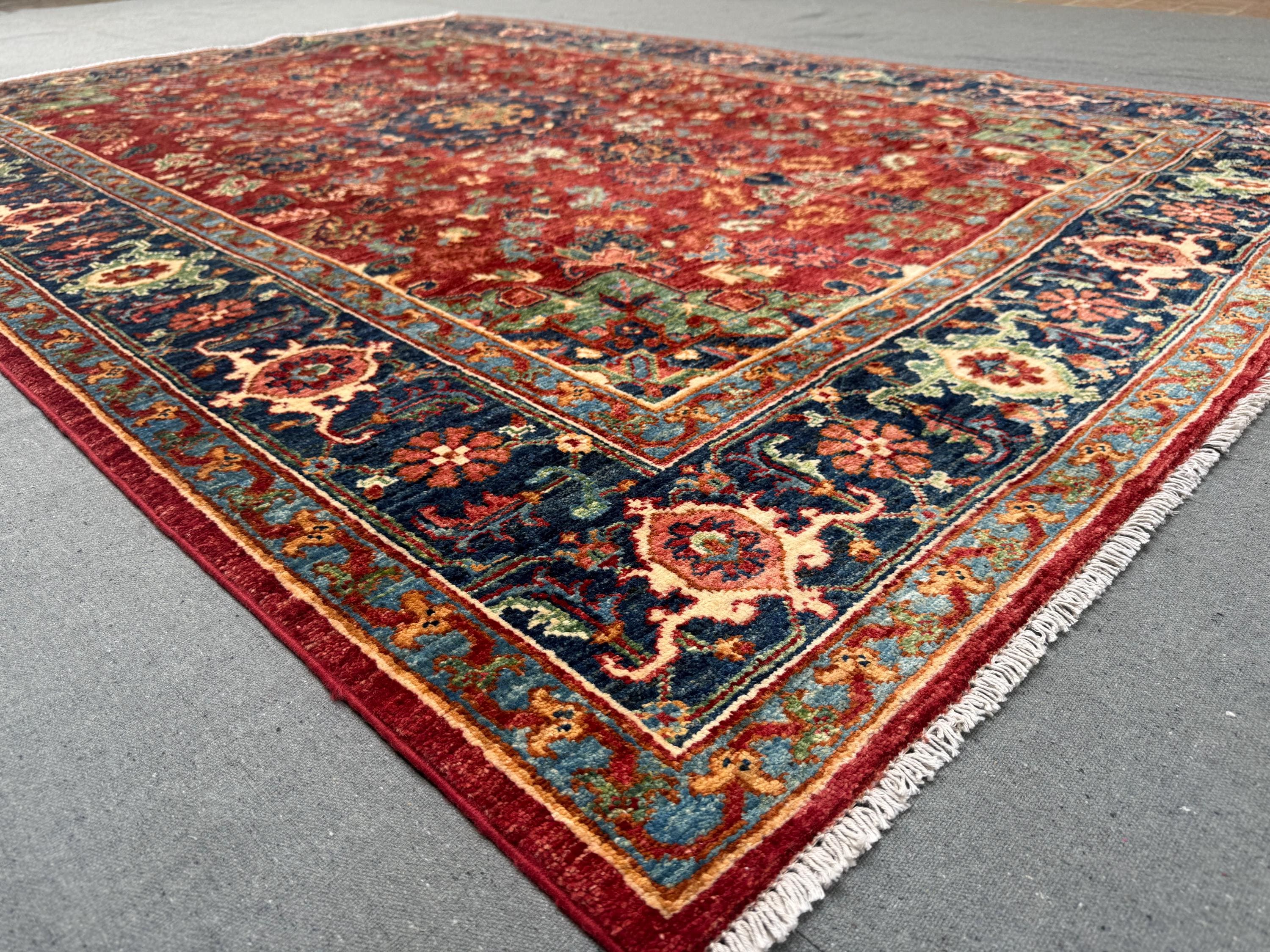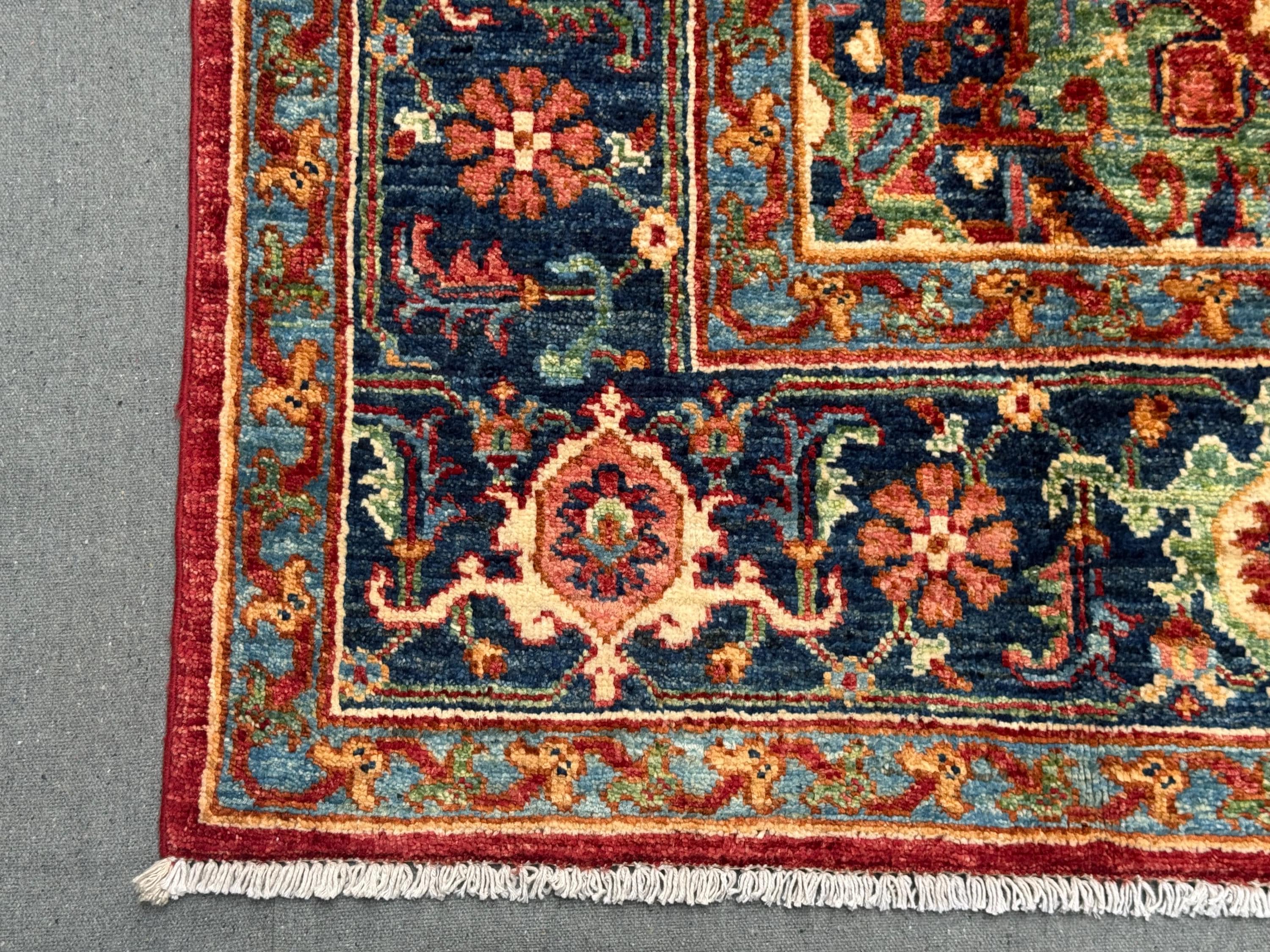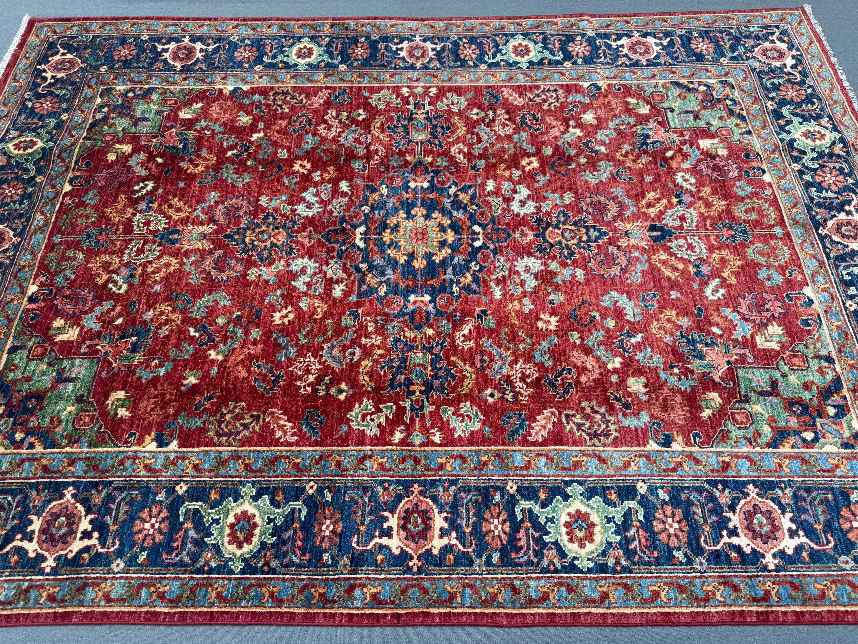 Add classic warmth and character to your space with this handmade Heriz wool rug, featuring a beautifully detailed floral medallion design set against a rich red field. The rug is framed with a striking deep blue border, accented by ivory, green, and gold tones, creating a balanced and timeless look suitable for a variety of interiors.