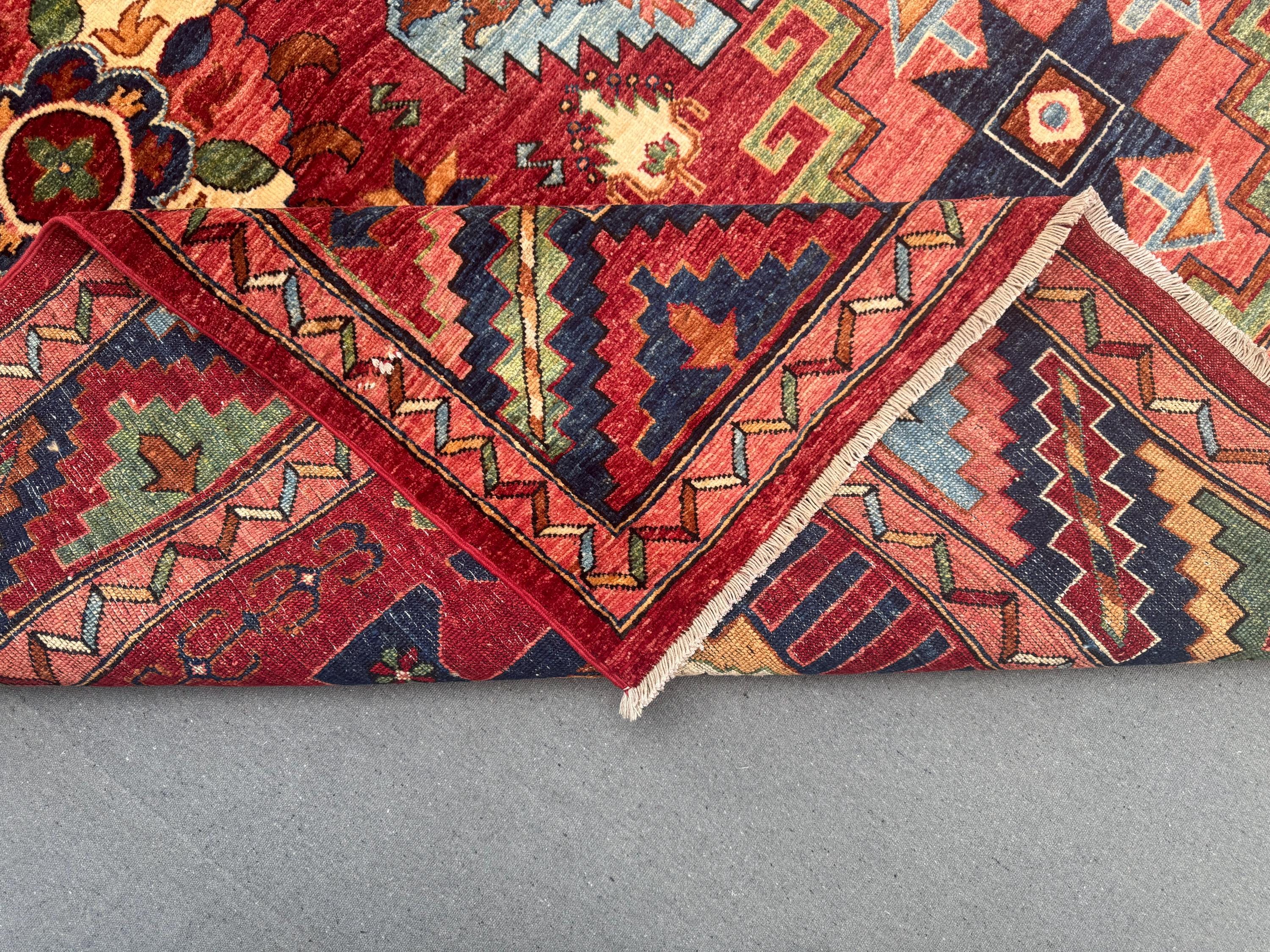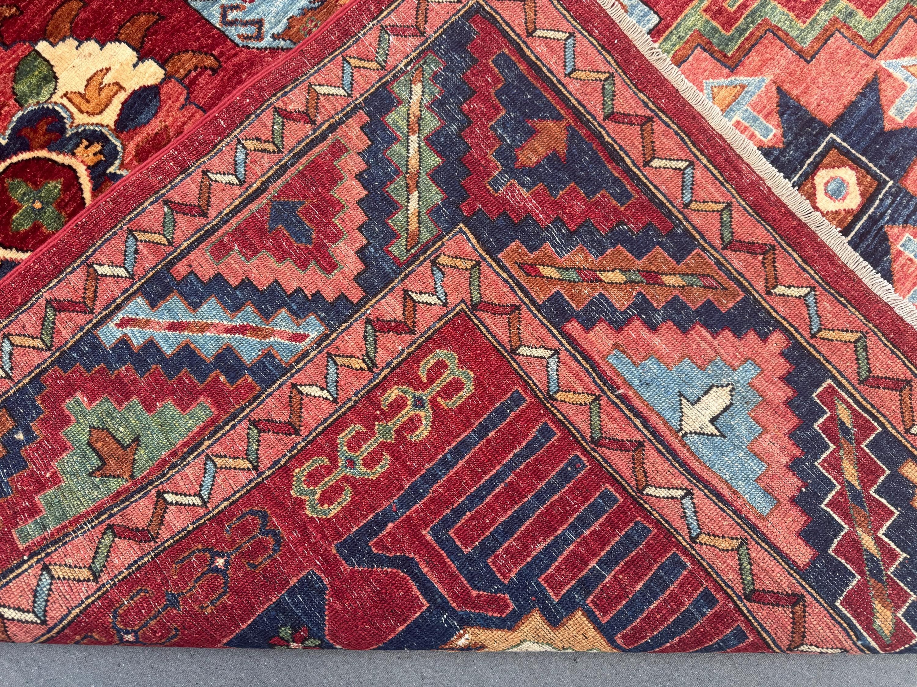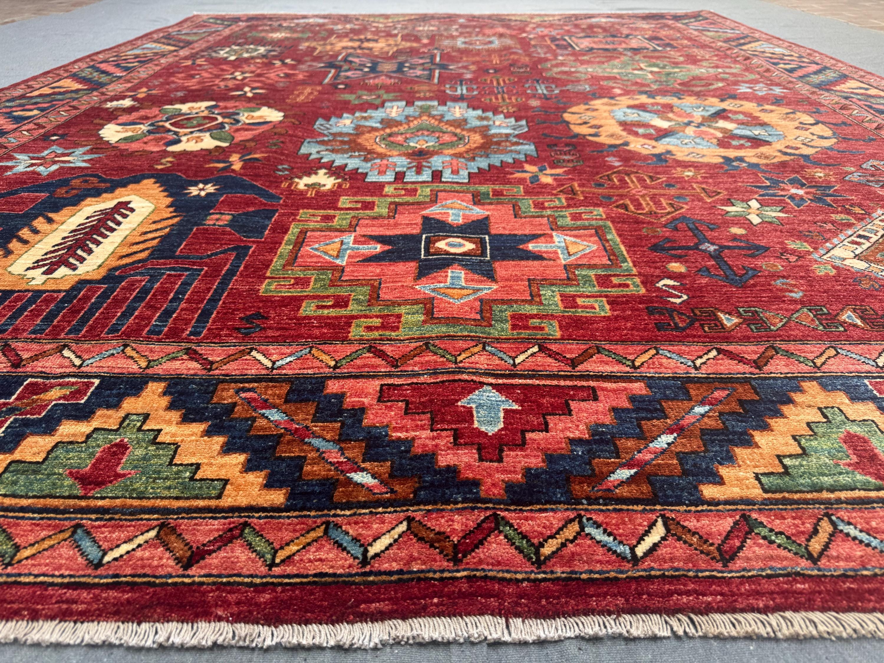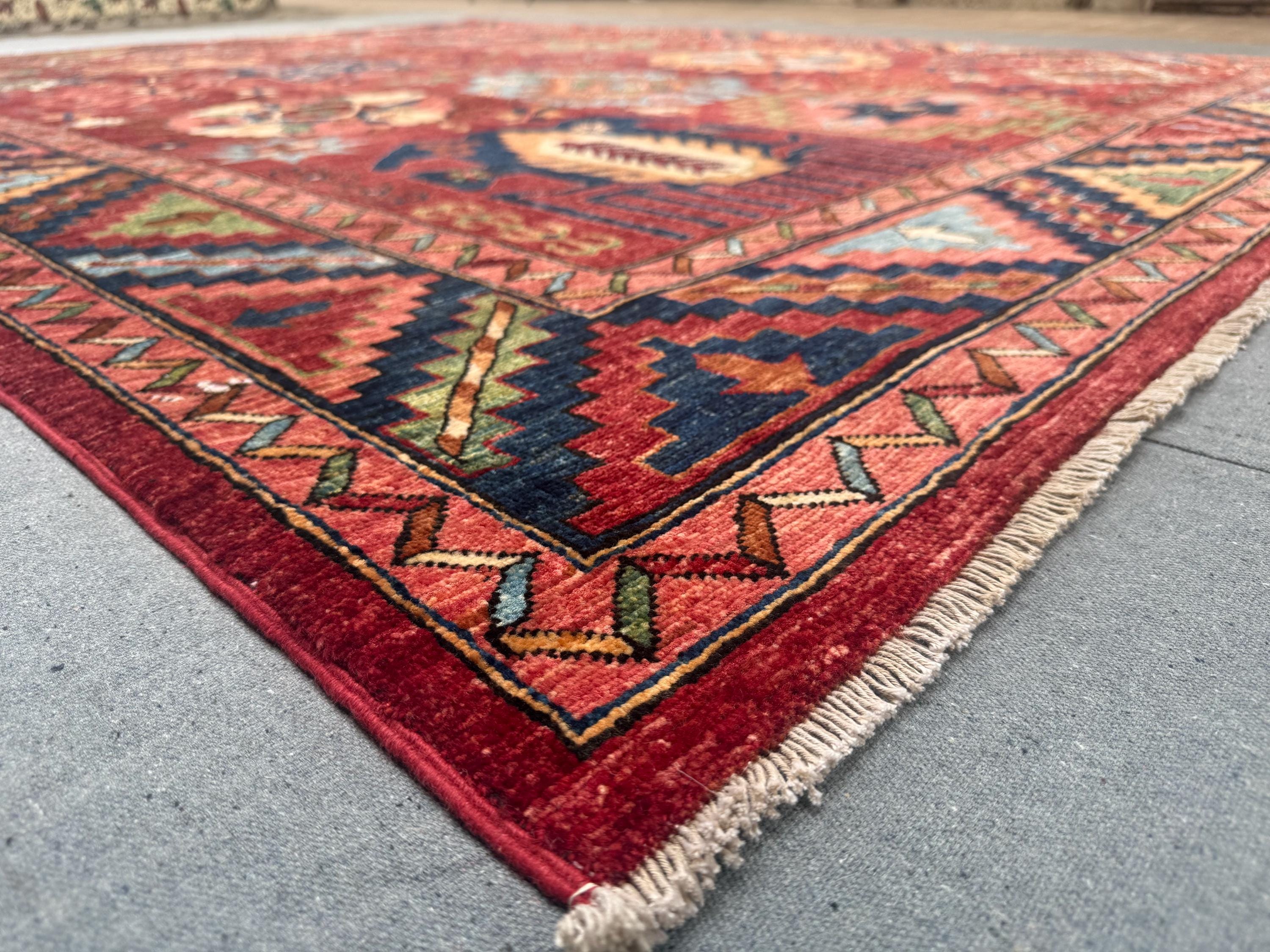 Add rich character and timeless style to your space with this handmade Fine Serapi wool rug, featuring an intricate tribal geometric layout filled with symbolic motifs and balanced symmetry. The deep red field is beautifully layered with blue, green, gold, ivory, and soft turquoise accents, creating a vibrant yet harmonious centerpiece for any room.