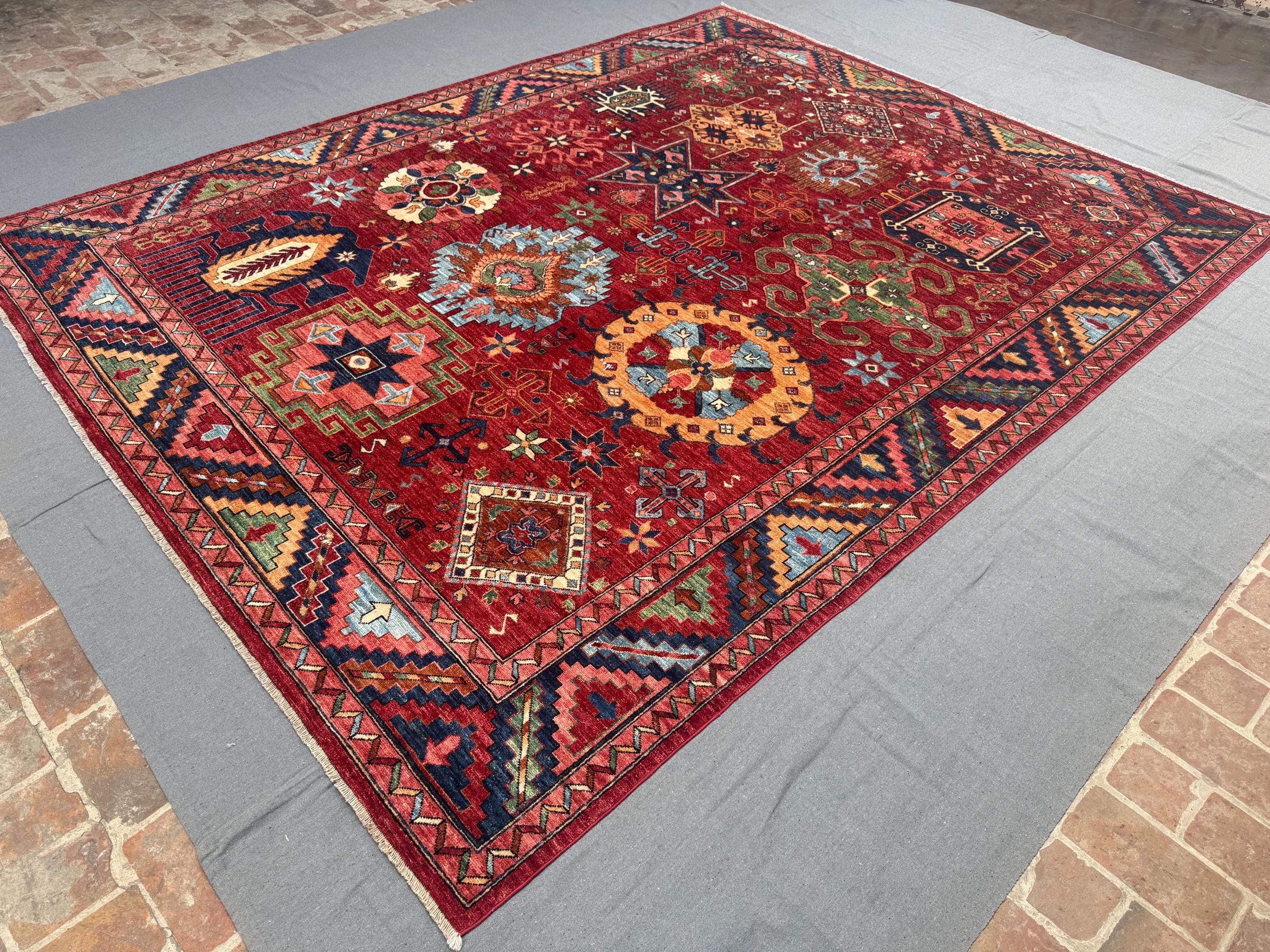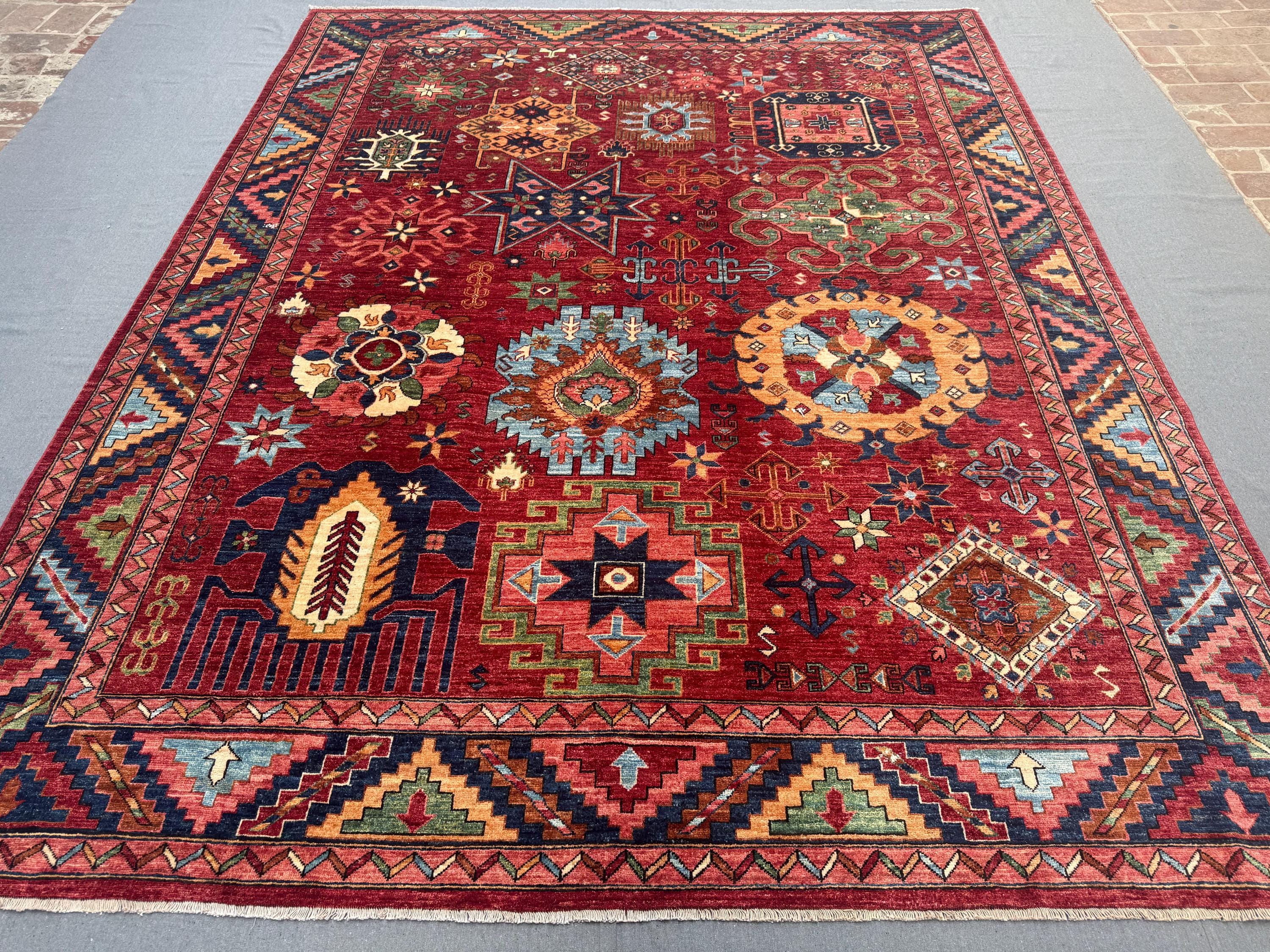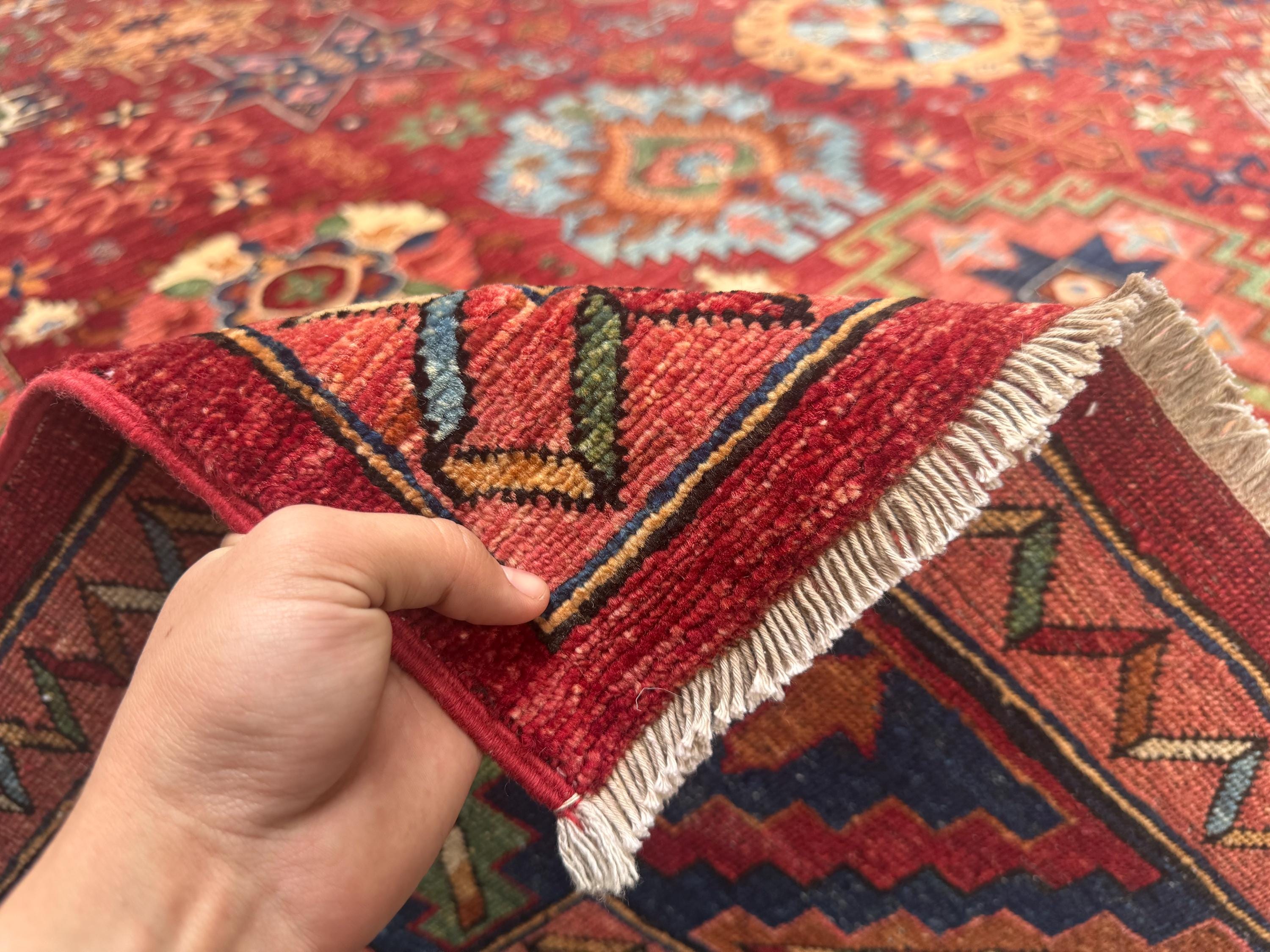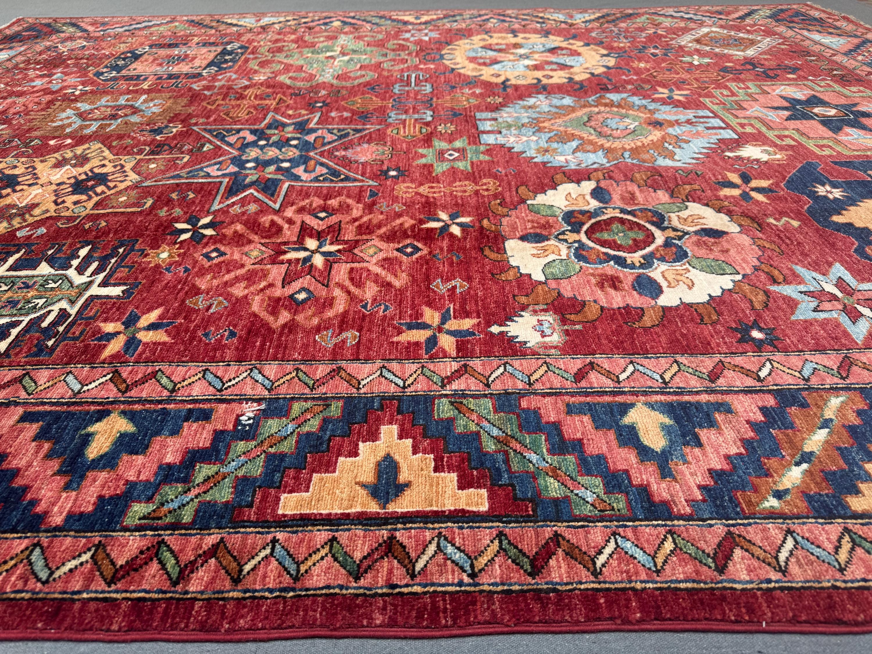 Add rich character and timeless style to your space with this handmade Fine Serapi wool rug, featuring an intricate tribal geometric layout filled with symbolic motifs and balanced symmetry. The deep red field is beautifully layered with blue, green, gold, ivory, and soft turquoise accents, creating a vibrant yet harmonious centerpiece for any room.
