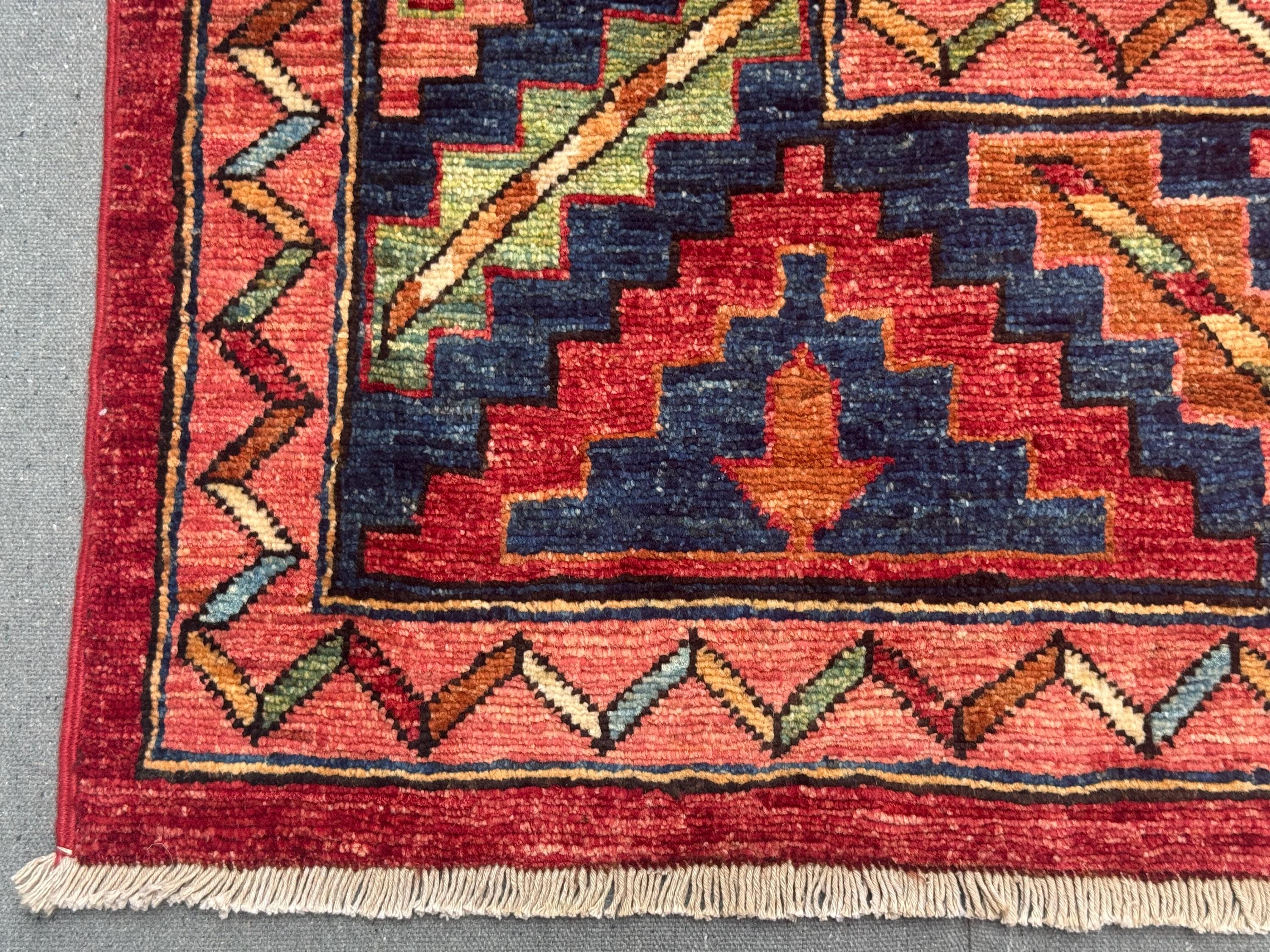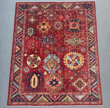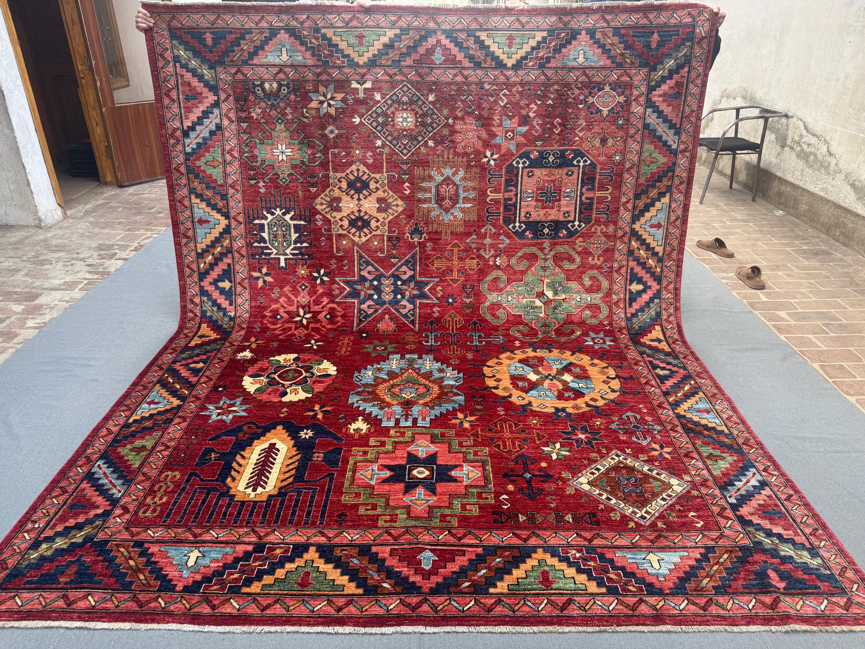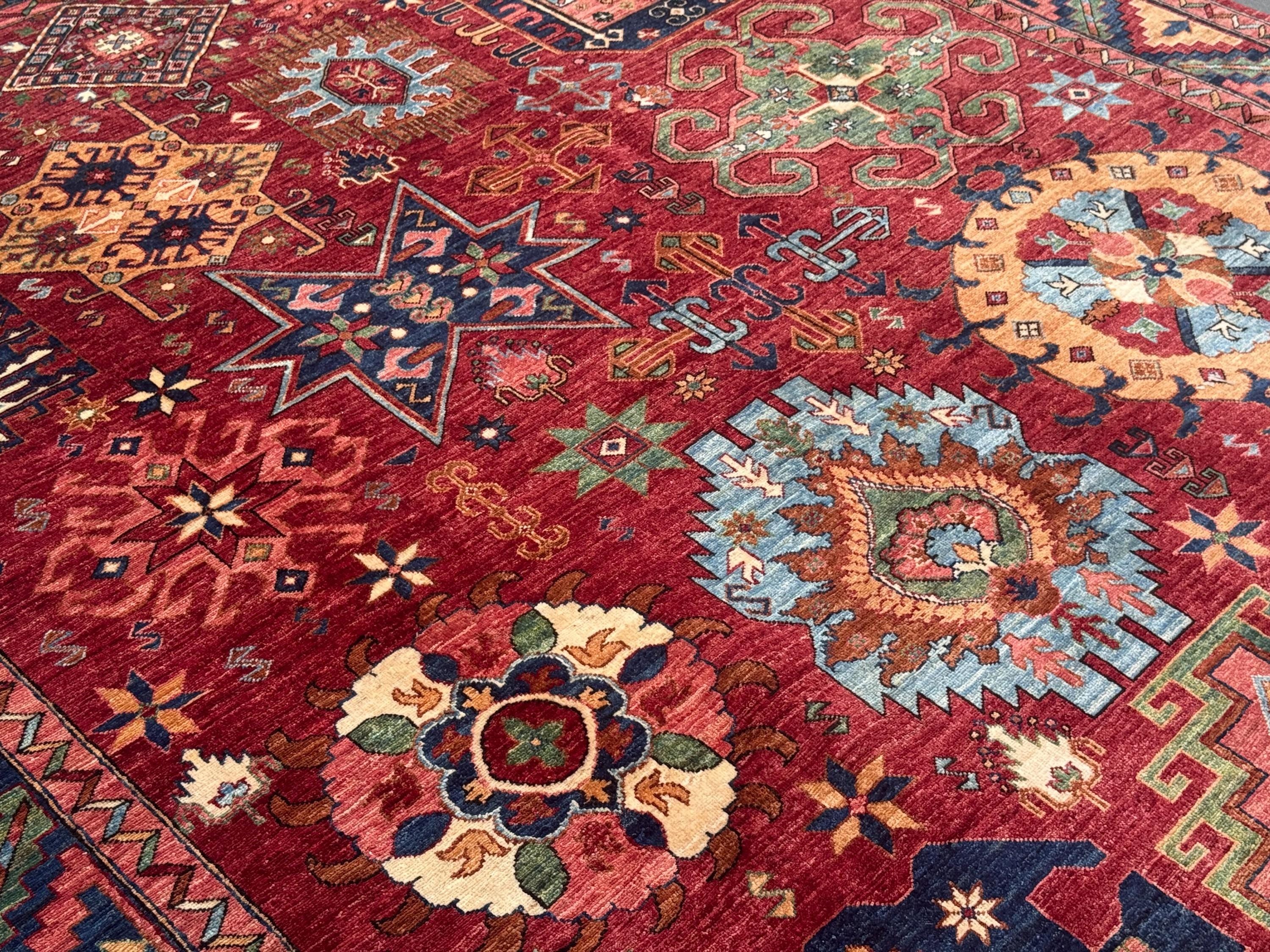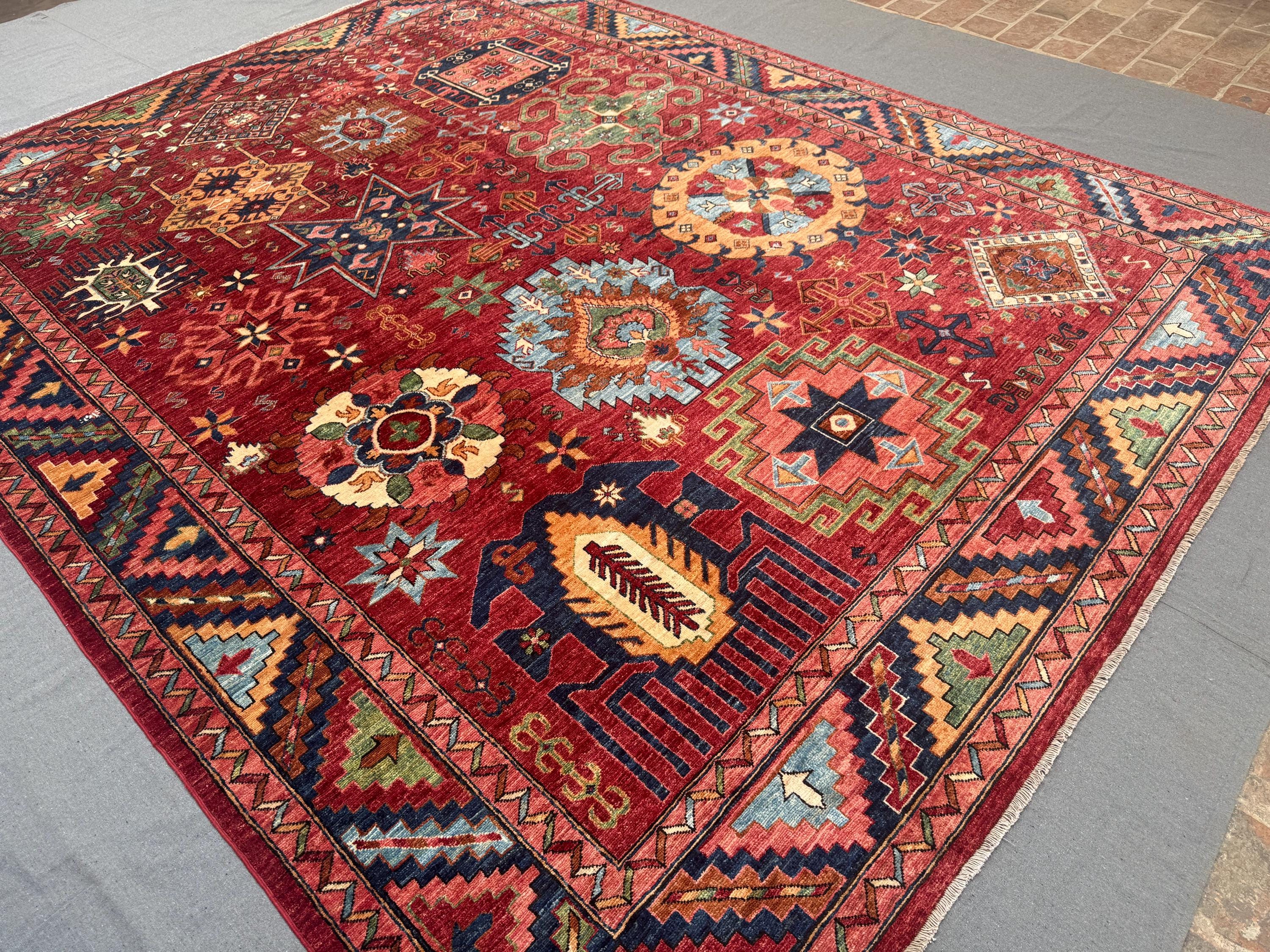 Add rich character and timeless style to your space with this handmade Fine Serapi wool rug, featuring an intricate tribal geometric layout filled with symbolic motifs and balanced symmetry. The deep red field is beautifully layered with blue, green, gold, ivory, and soft turquoise accents, creating a vibrant yet harmonious centerpiece for any room.