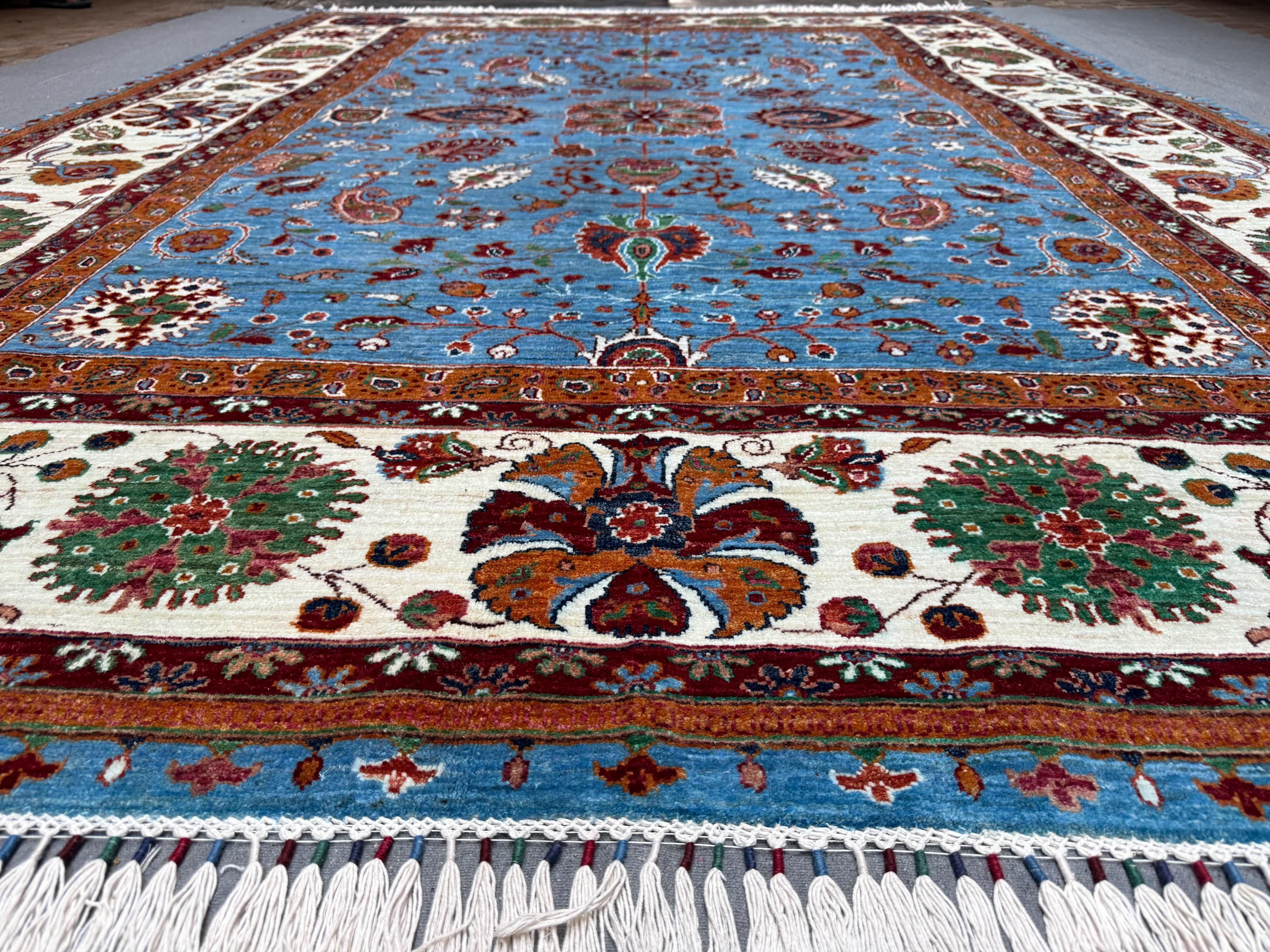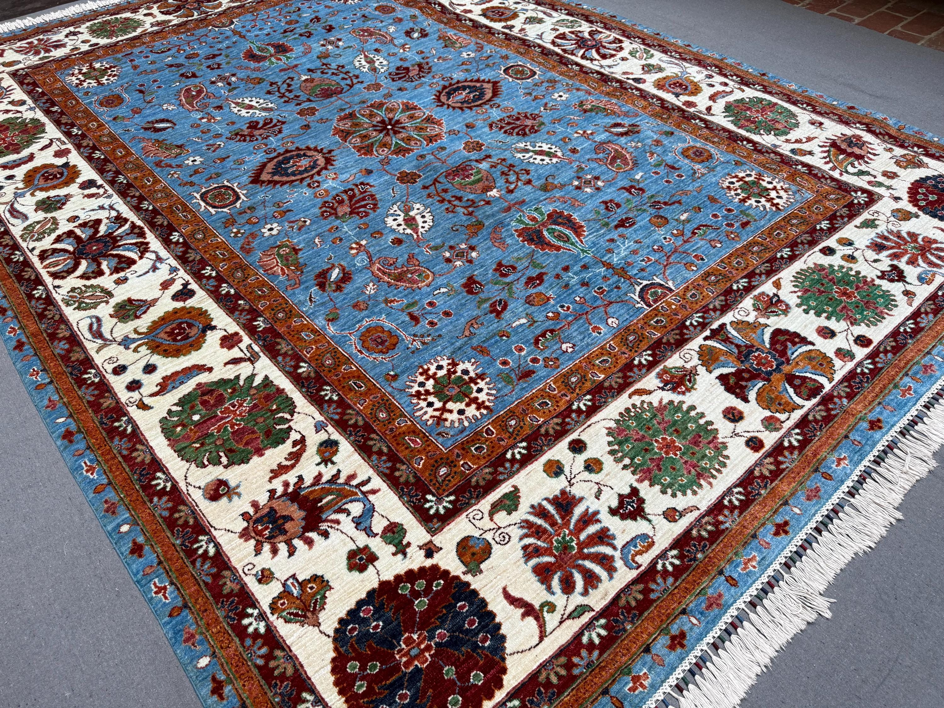 9x12 Suzani Oriental Handmade Wool Rug Blue Afghan Floral Carpet with Ivory Border, Traditional Hand-Knotted Wool Area Rug