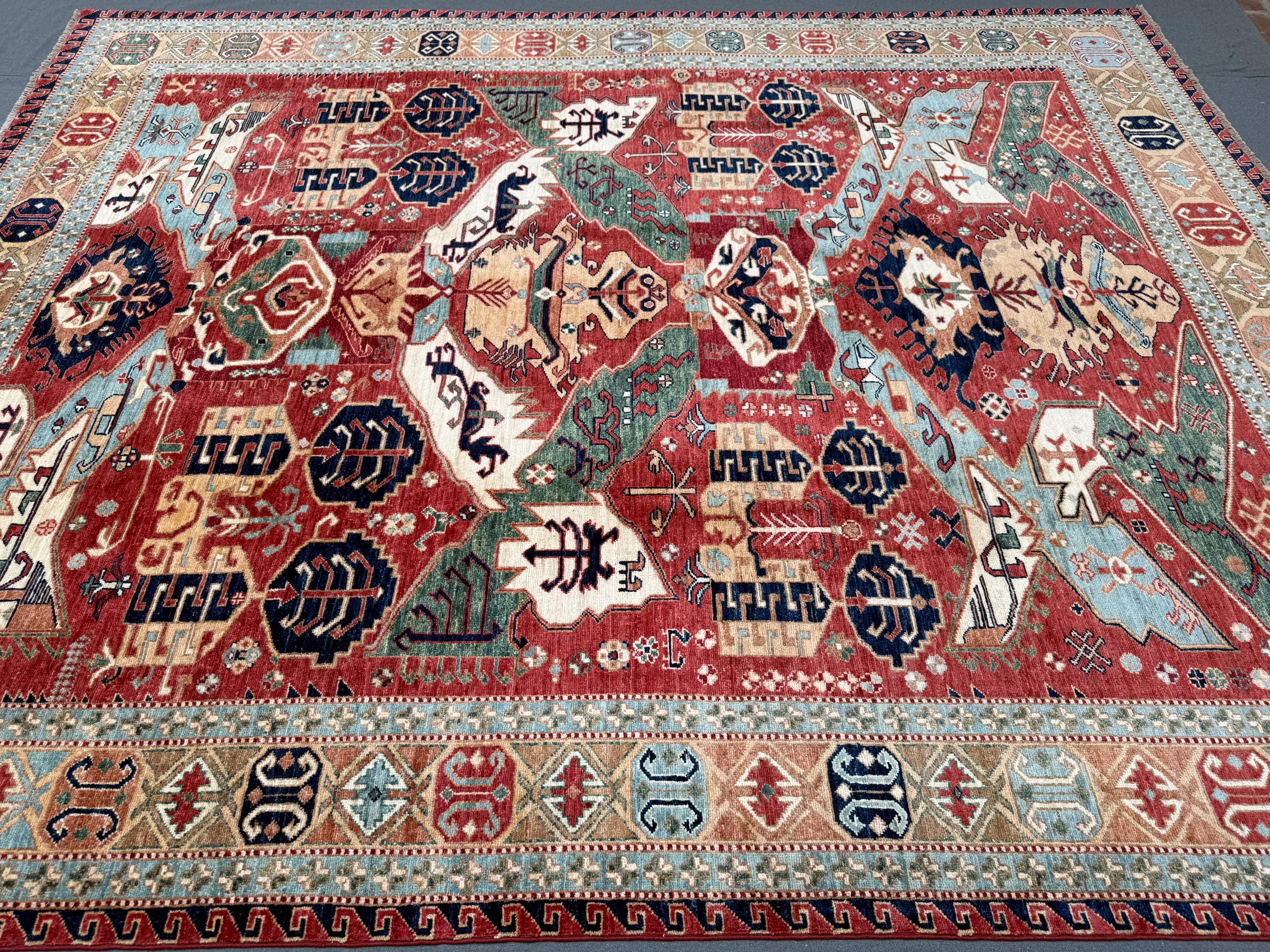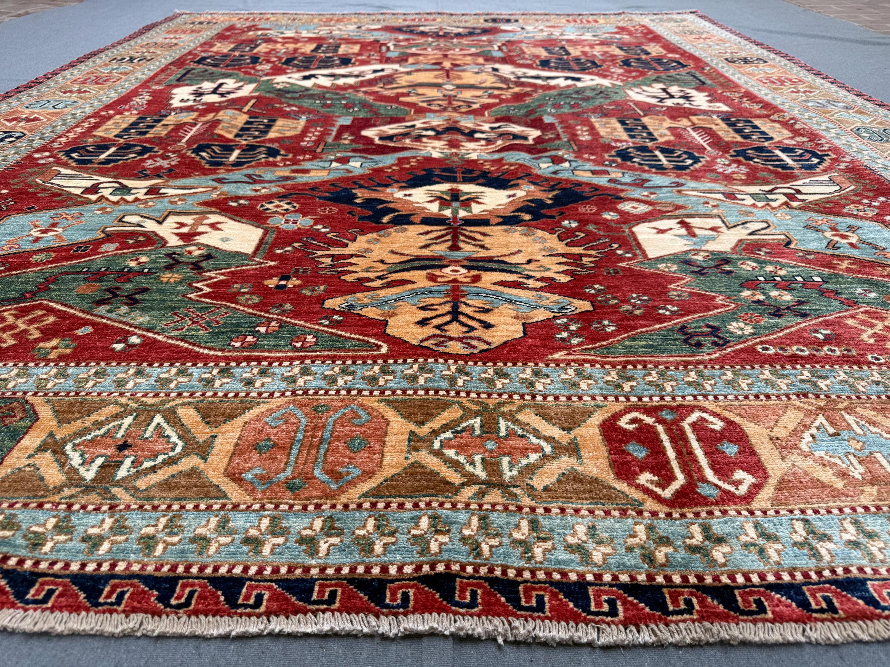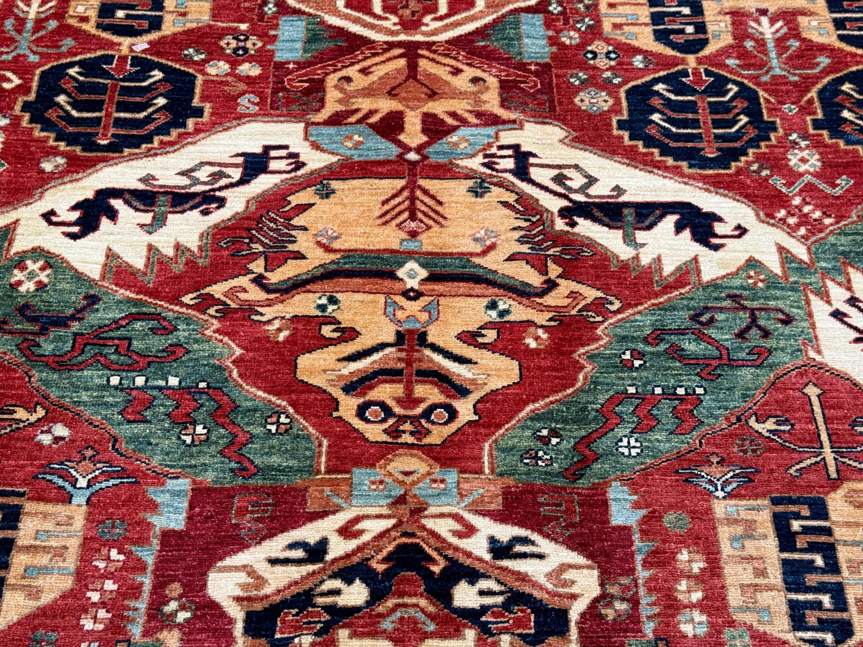 Make a bold and elegant statement with this handmade Fine Serapi wool rug, featuring a powerful tribal geometric composition filled with layered motifs and strong symmetry. The deep red field is beautifully enriched with blue, ivory, beige, green, and soft turquoise accents, creating a vibrant yet balanced centerpiece ideal for large interiors.