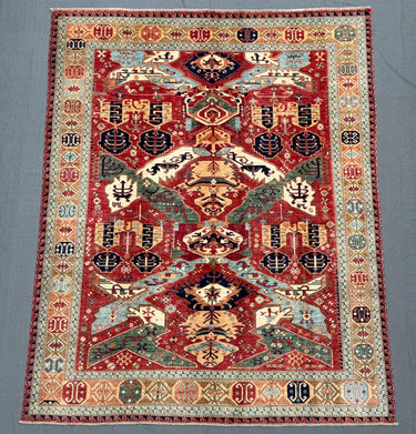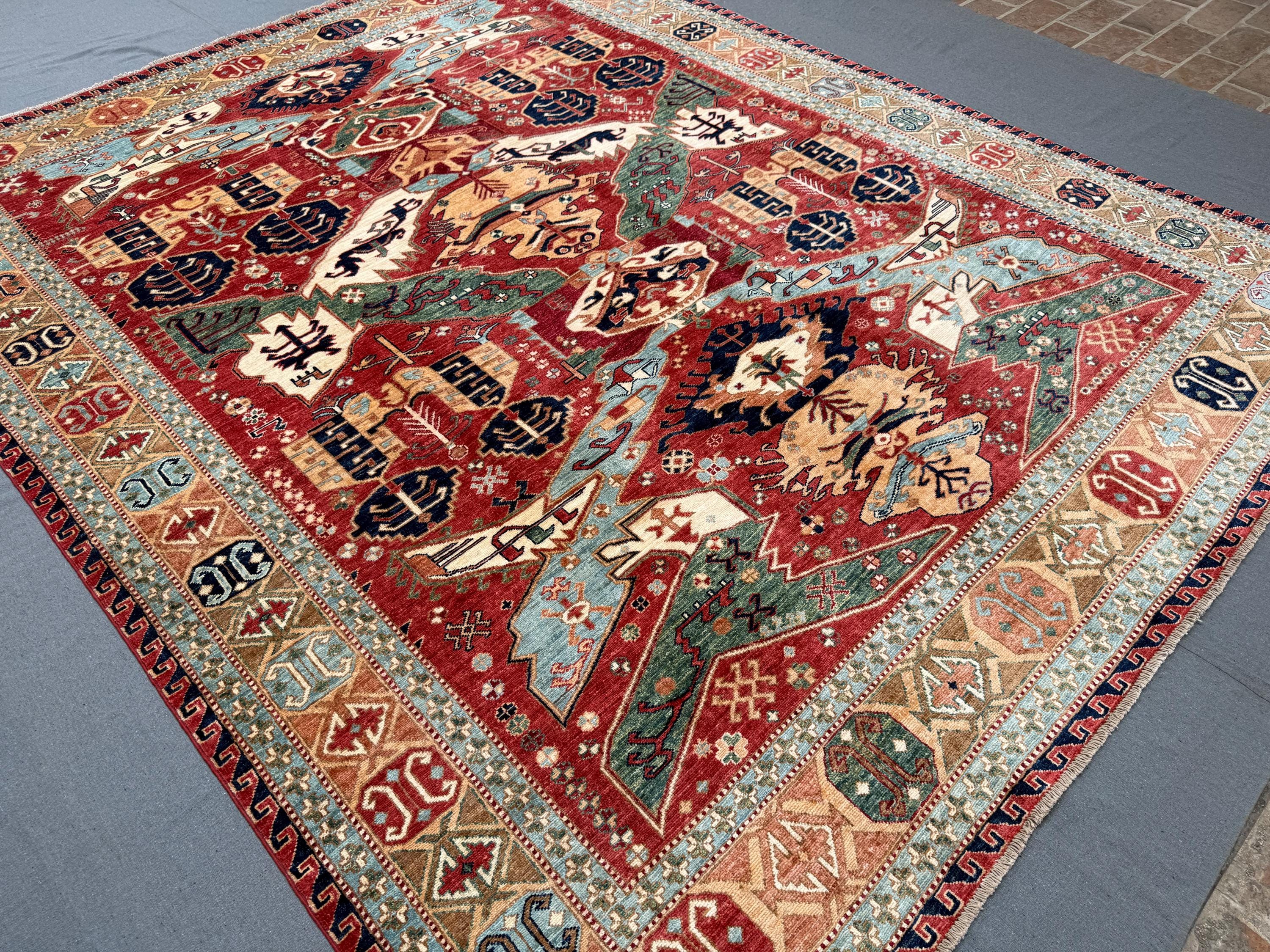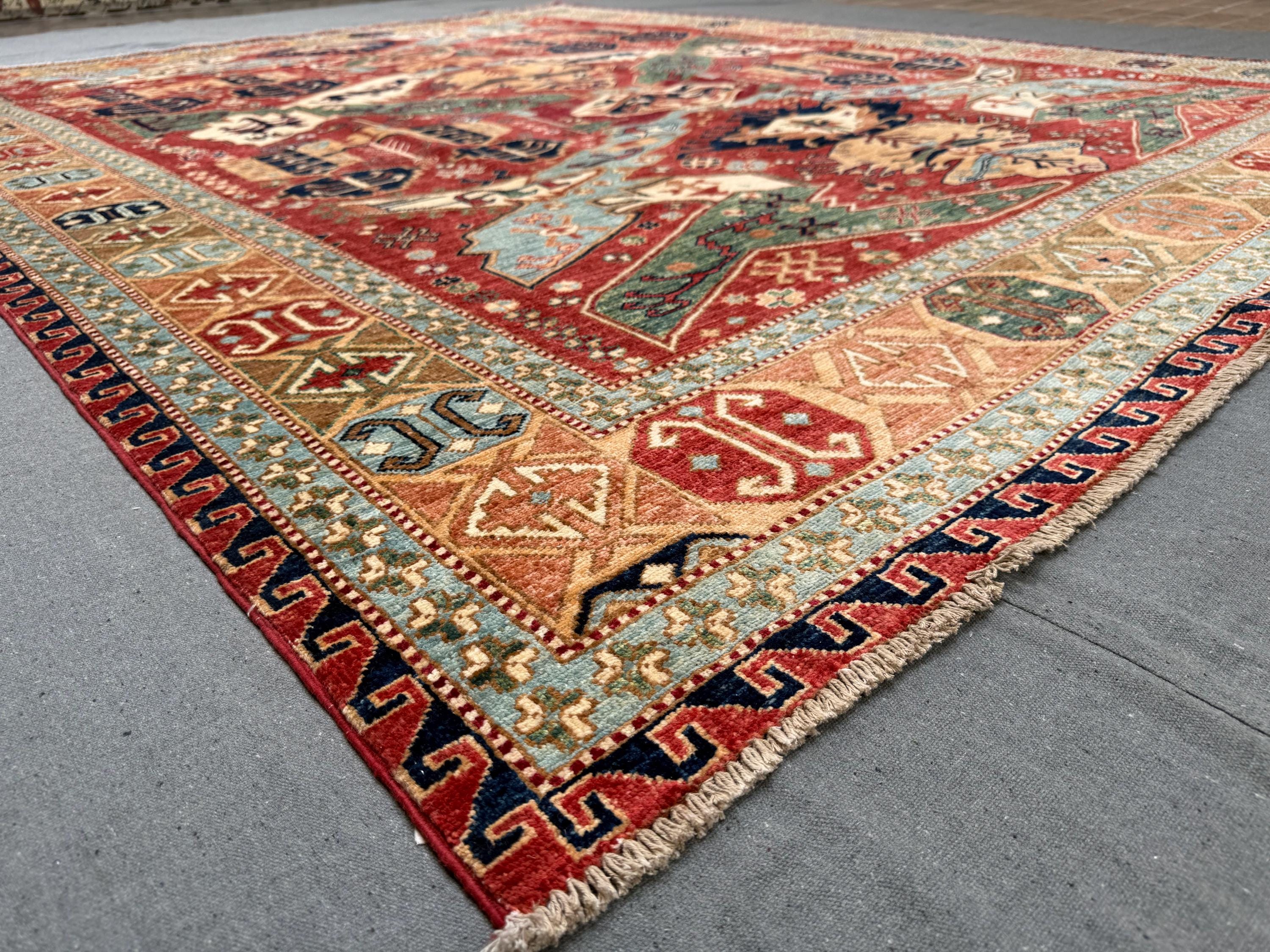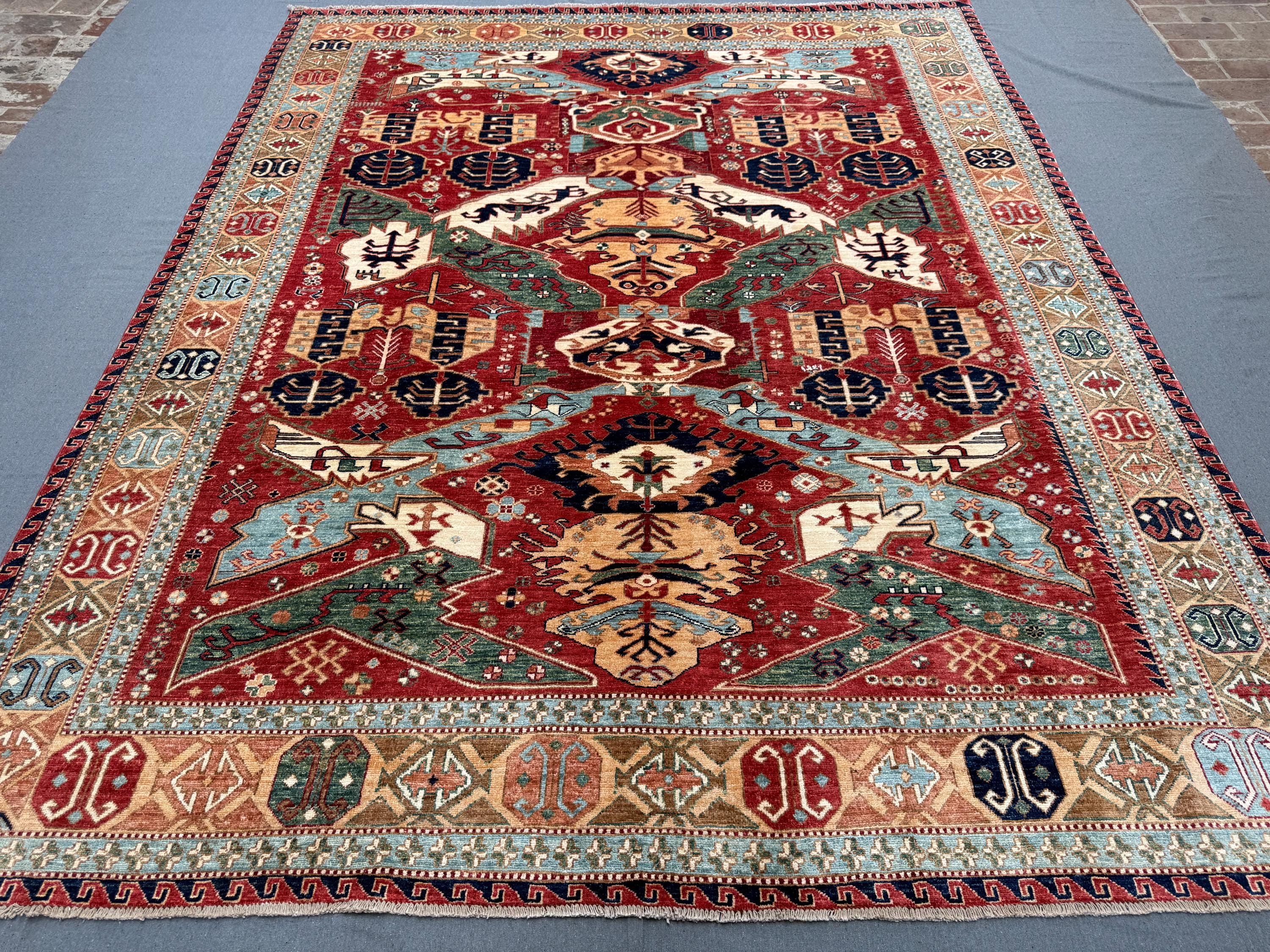 Make a bold and elegant statement with this handmade Fine Serapi wool rug, featuring a powerful tribal geometric composition filled with layered motifs and strong symmetry. The deep red field is beautifully enriched with blue, ivory, beige, green, and soft turquoise accents, creating a vibrant yet balanced centerpiece ideal for large interiors.