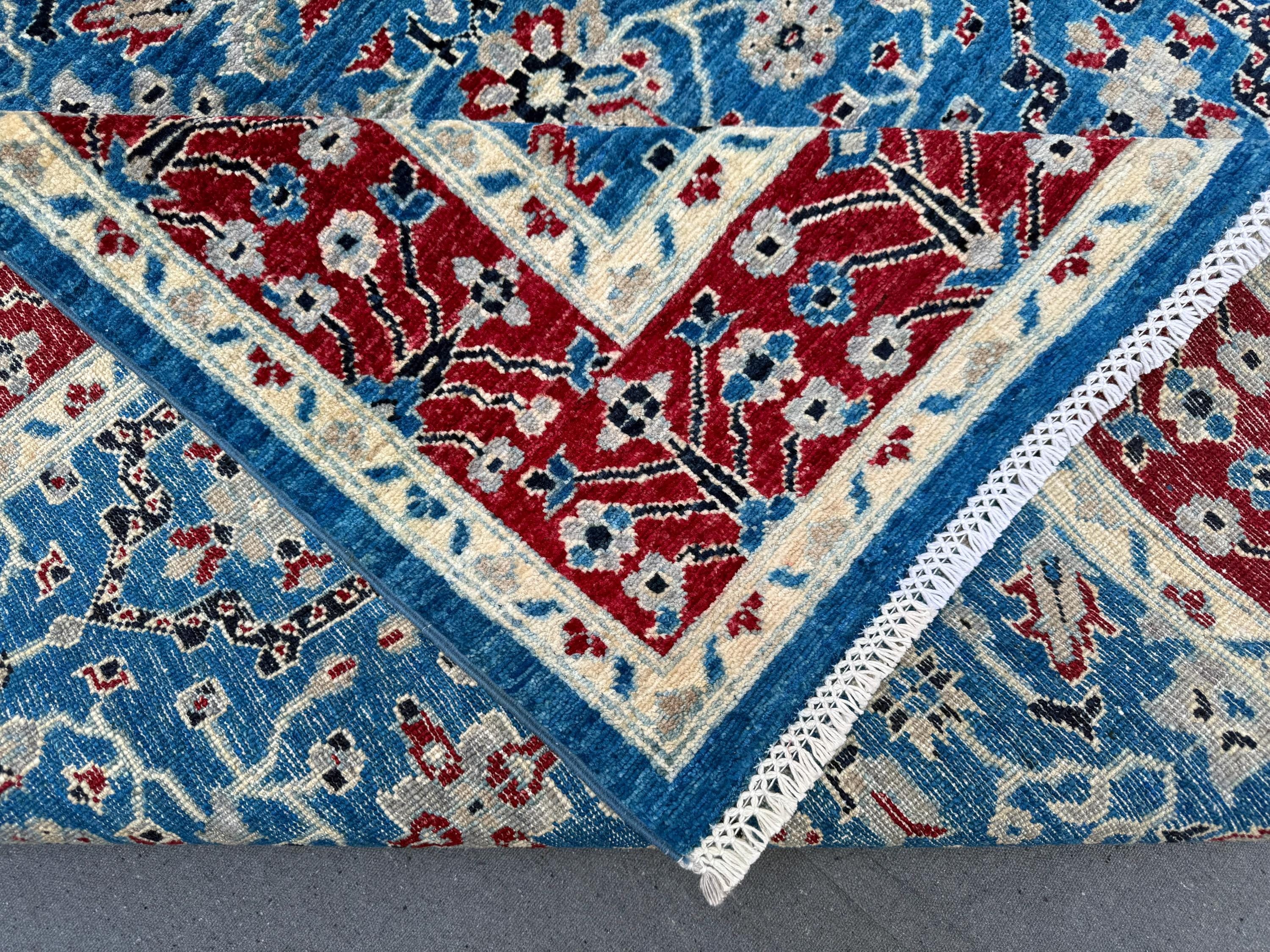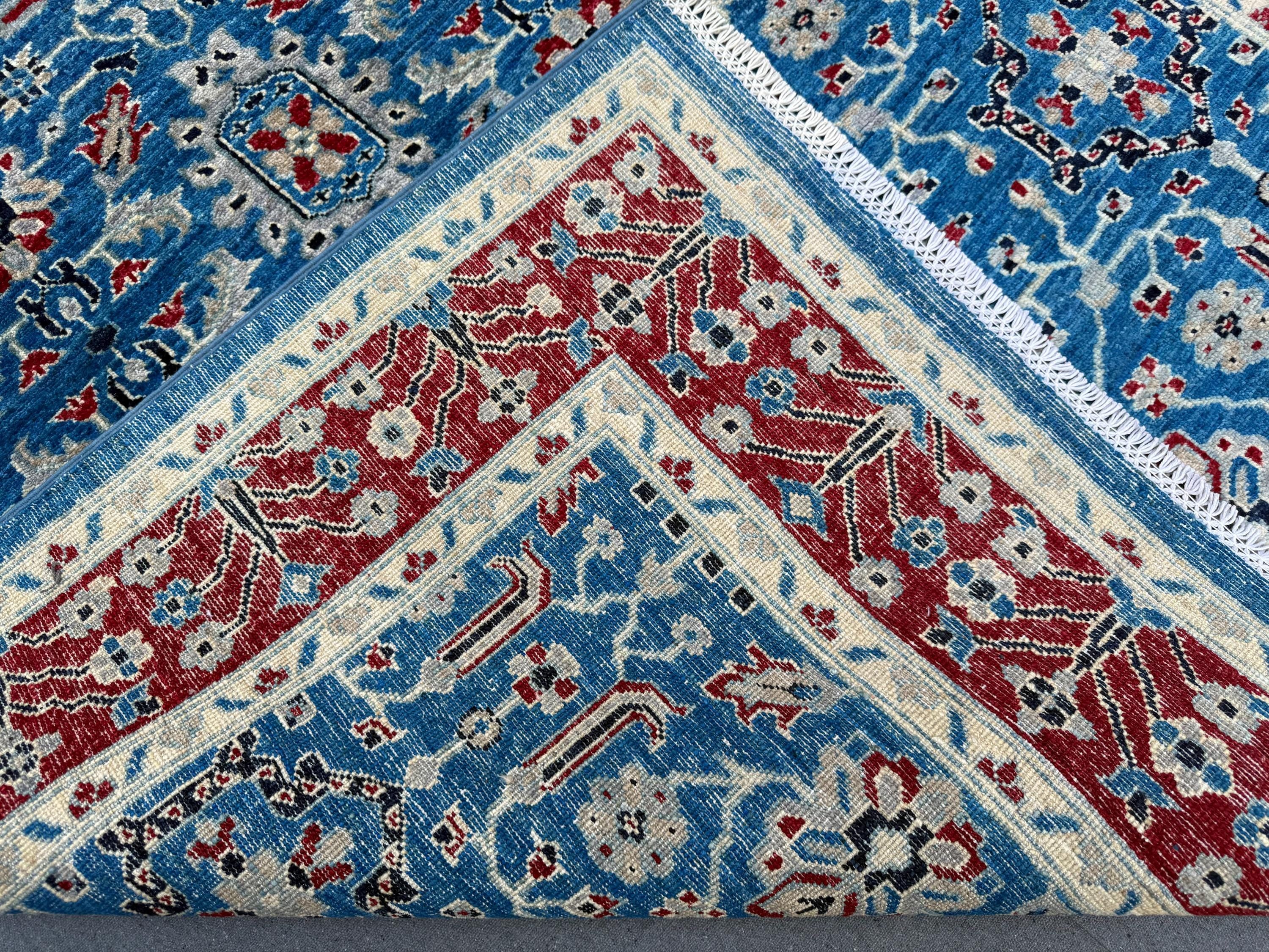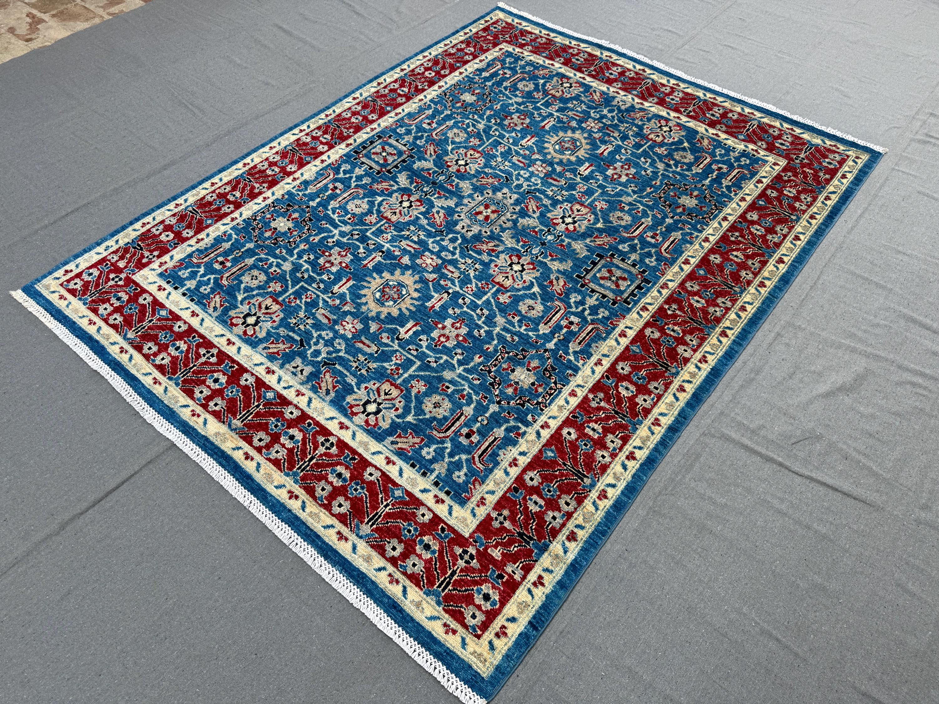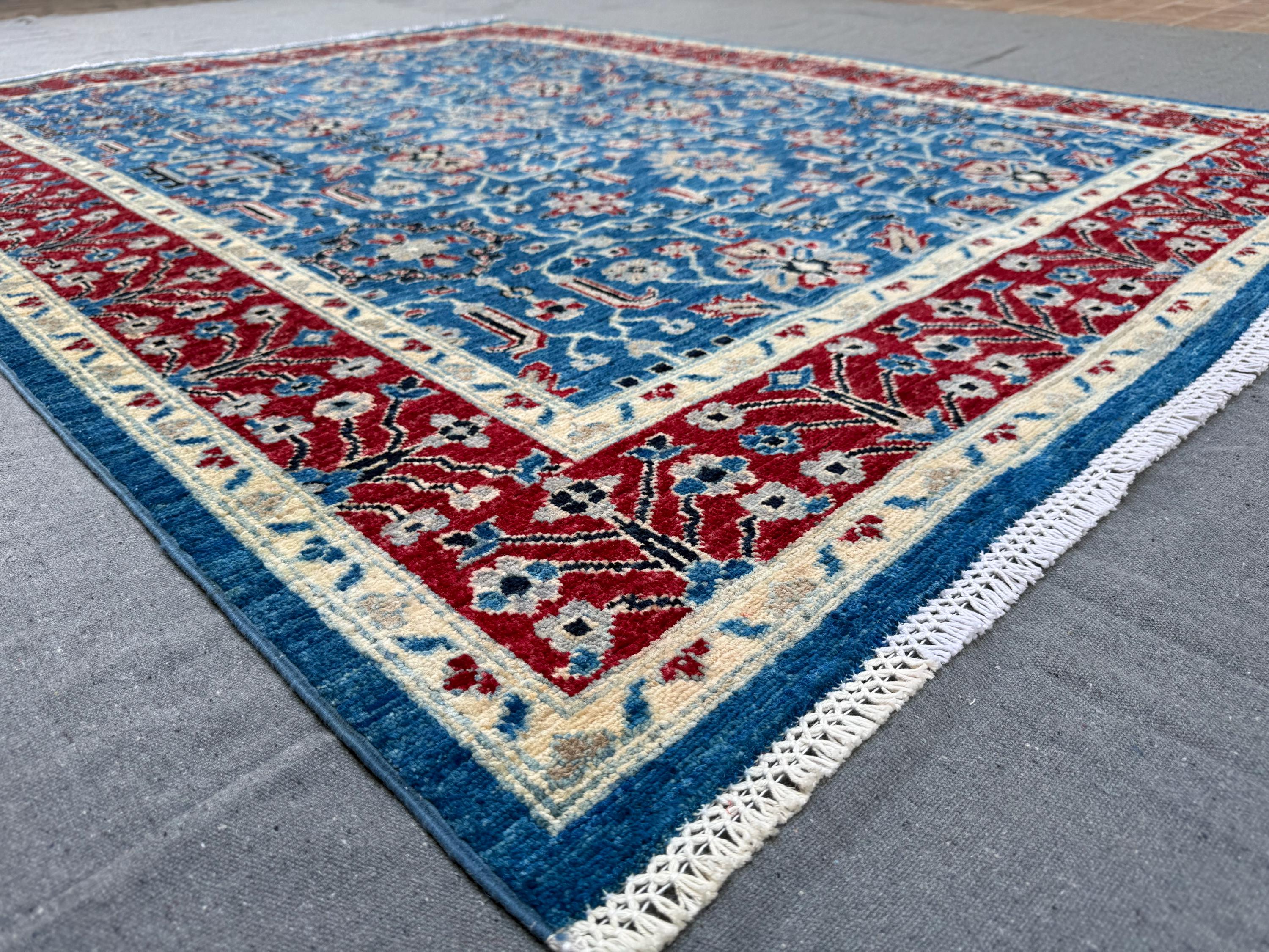 This gorgeous handmade Afghan Oriental rug features a vibrant blue field filled with intricate floral and tribal motifs. The rich deep red border, accented with ivory, navy, and subtle teal highlights, frames the design beautifully—creating a balanced and eye-catching look.