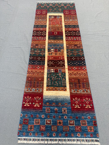 Handmade Gabbeh Runner Rug 3x8 ft Wool Hallway Runner with Colorful Stripes & Tribal Motifs Boho Decorative Long Carpet for Home
