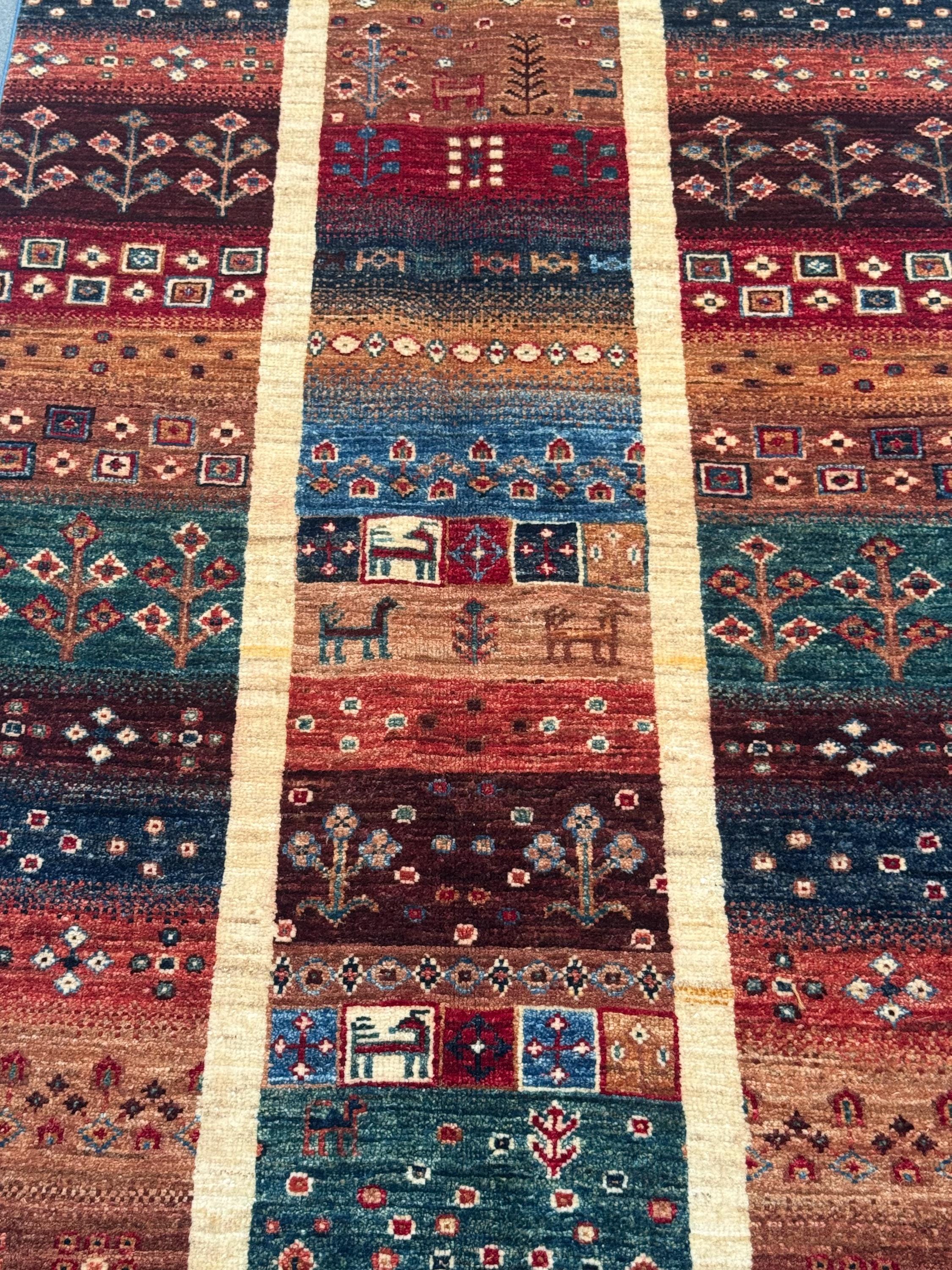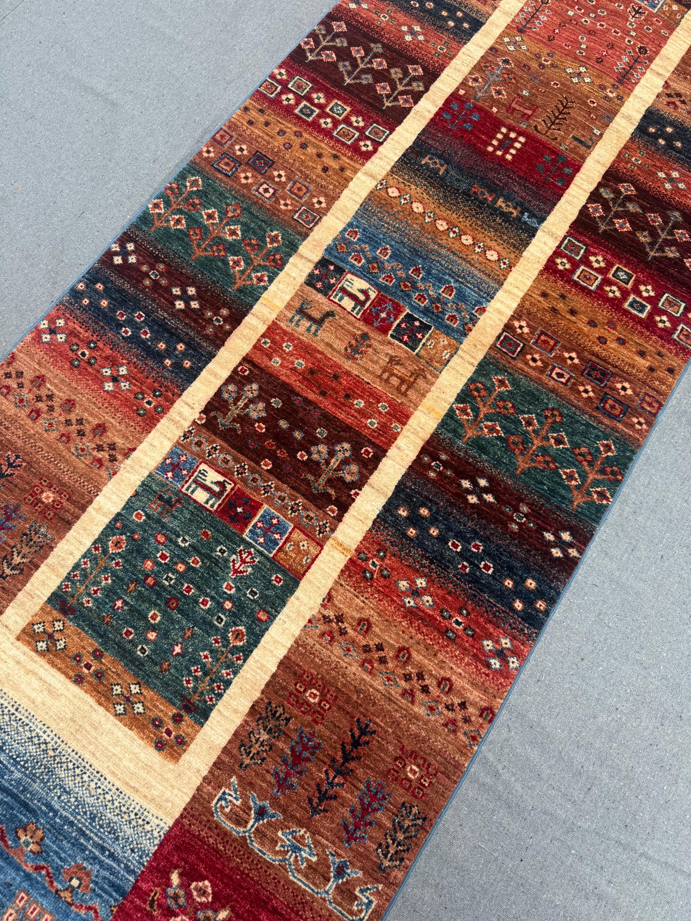 Brighten your hallway or entryway with this handmade Gabbeh runner rug, featuring a vibrant mix of colorful stripes and charming tribal-style motifs. Each section is filled with unique symbols — trees, animals, diamonds, and abstract patterns — giving the rug a playful, artistic personality.