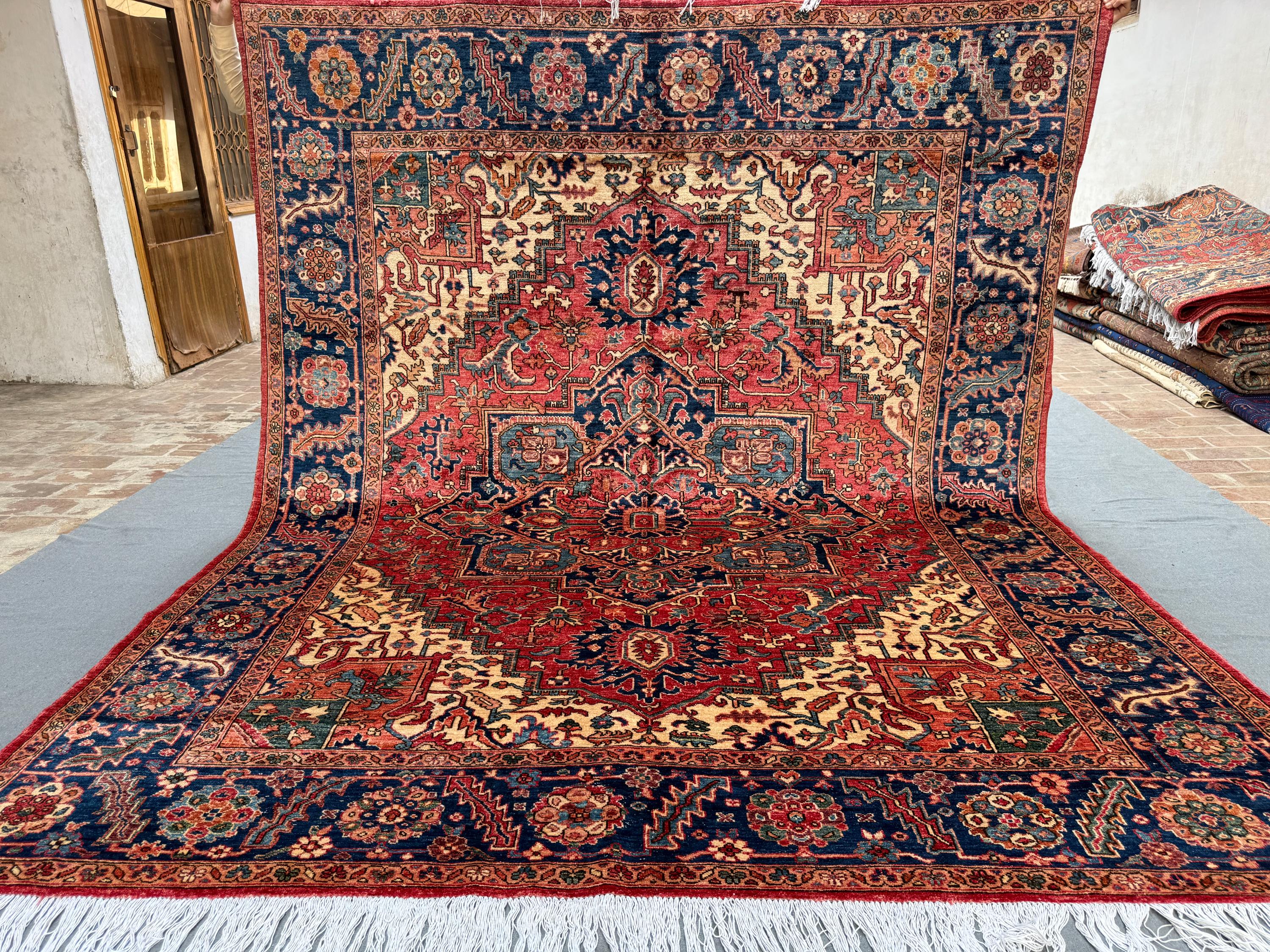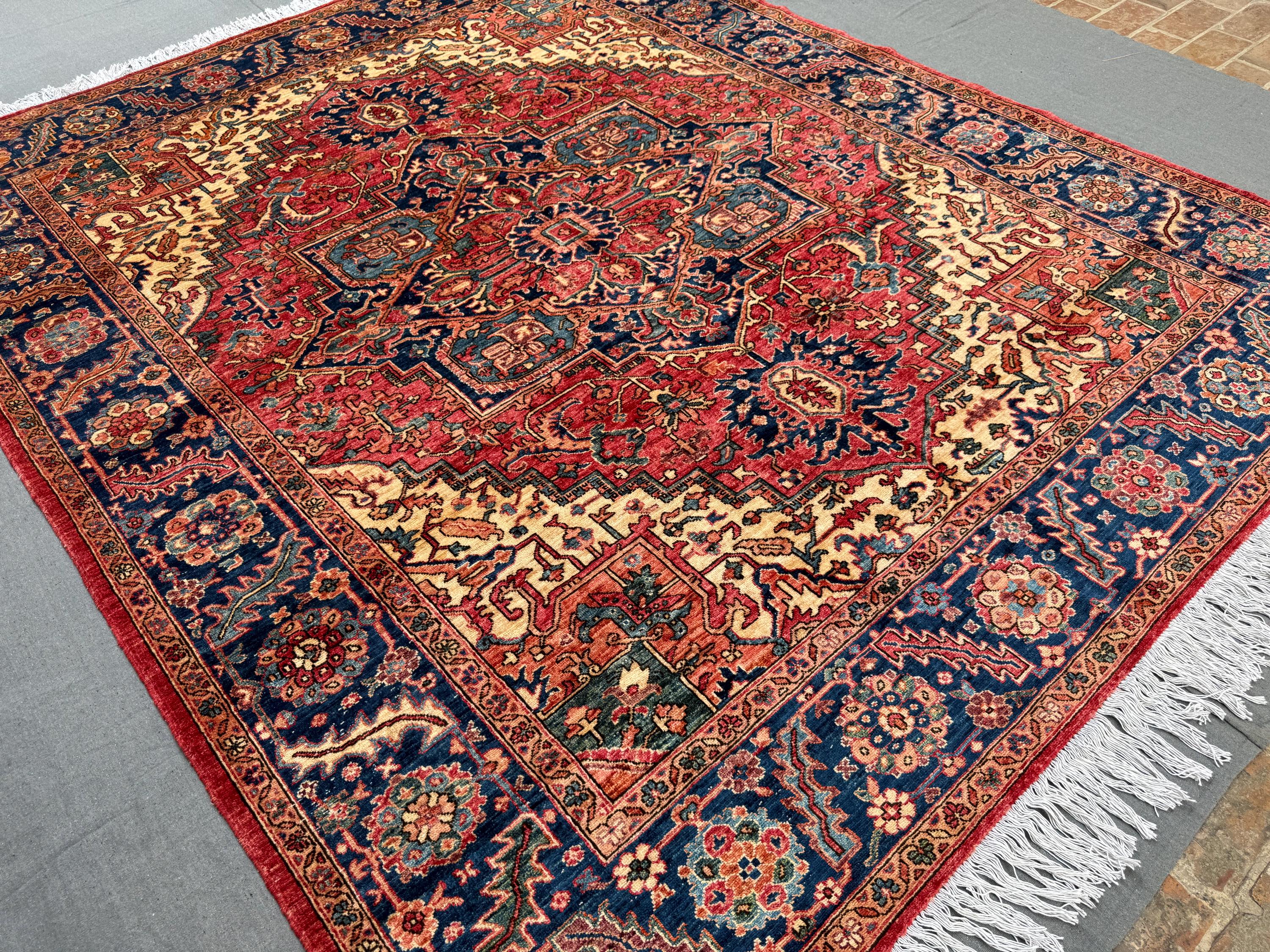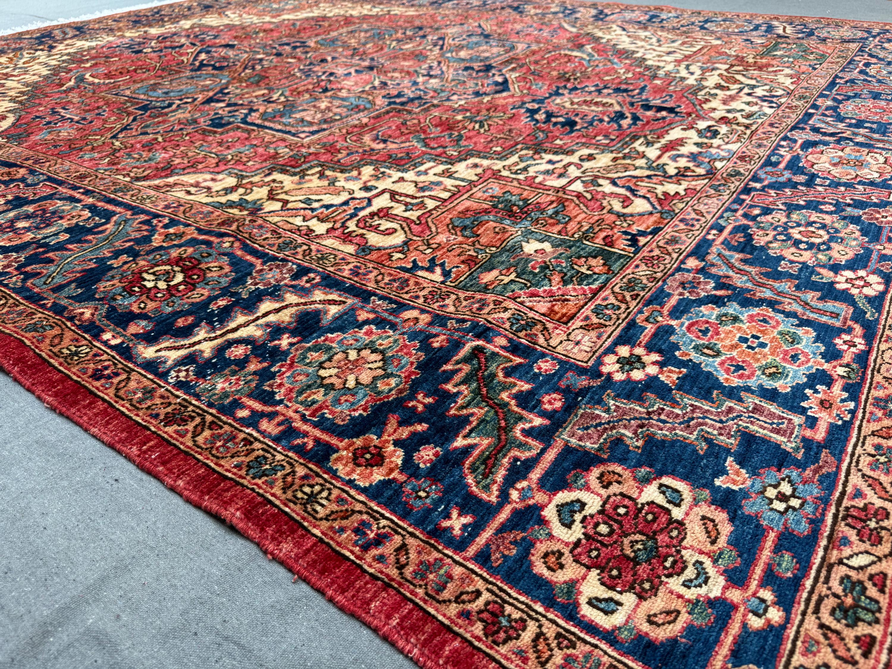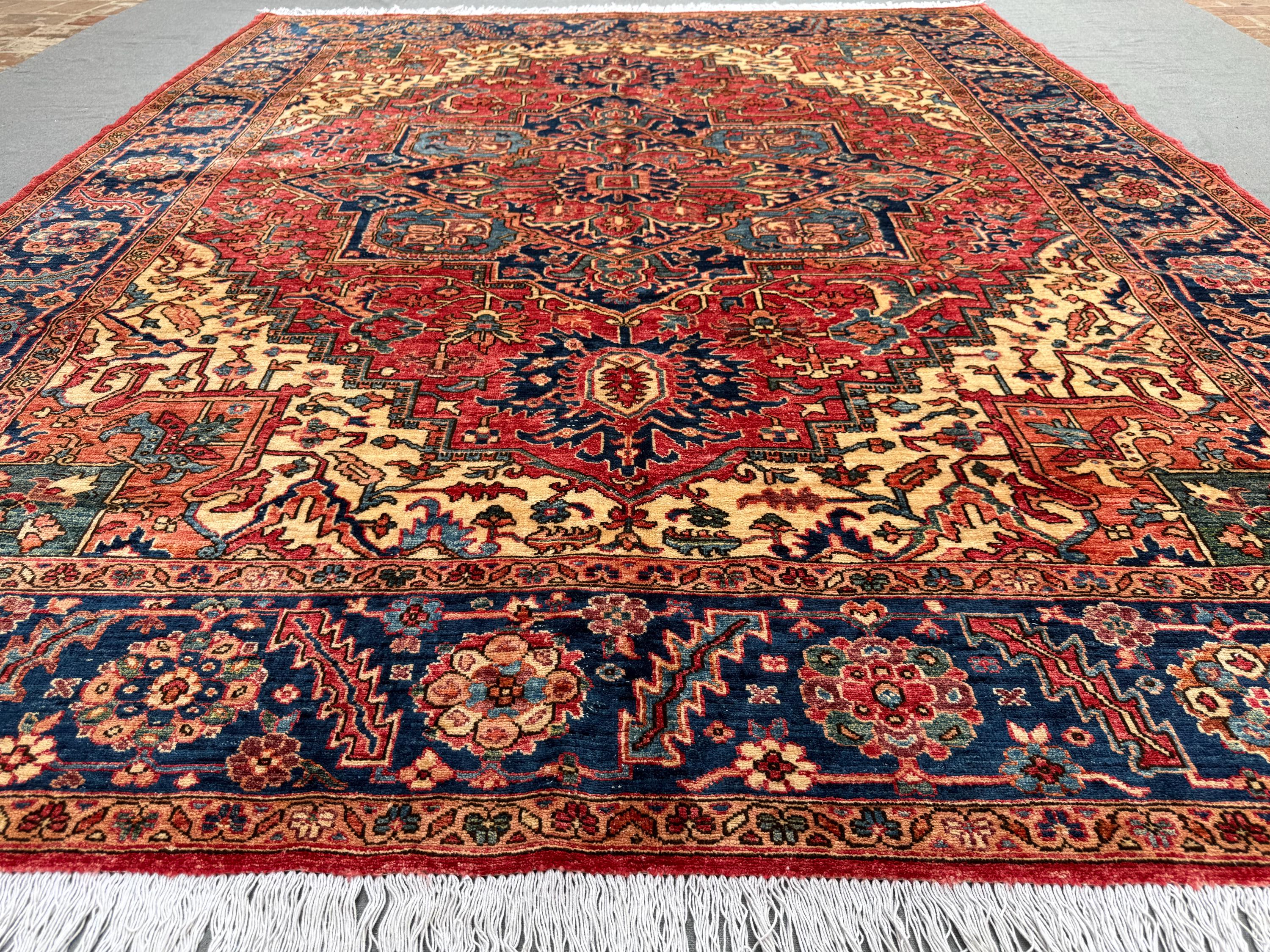 The rug showcases a striking central medallion design in deep red, ivory, and navy tones, framed by bold floral and geometric motifs along the border. Known for their durability and artistic appeal, Heriz rugs are versatile enough to enhance both classic and modern interiors.