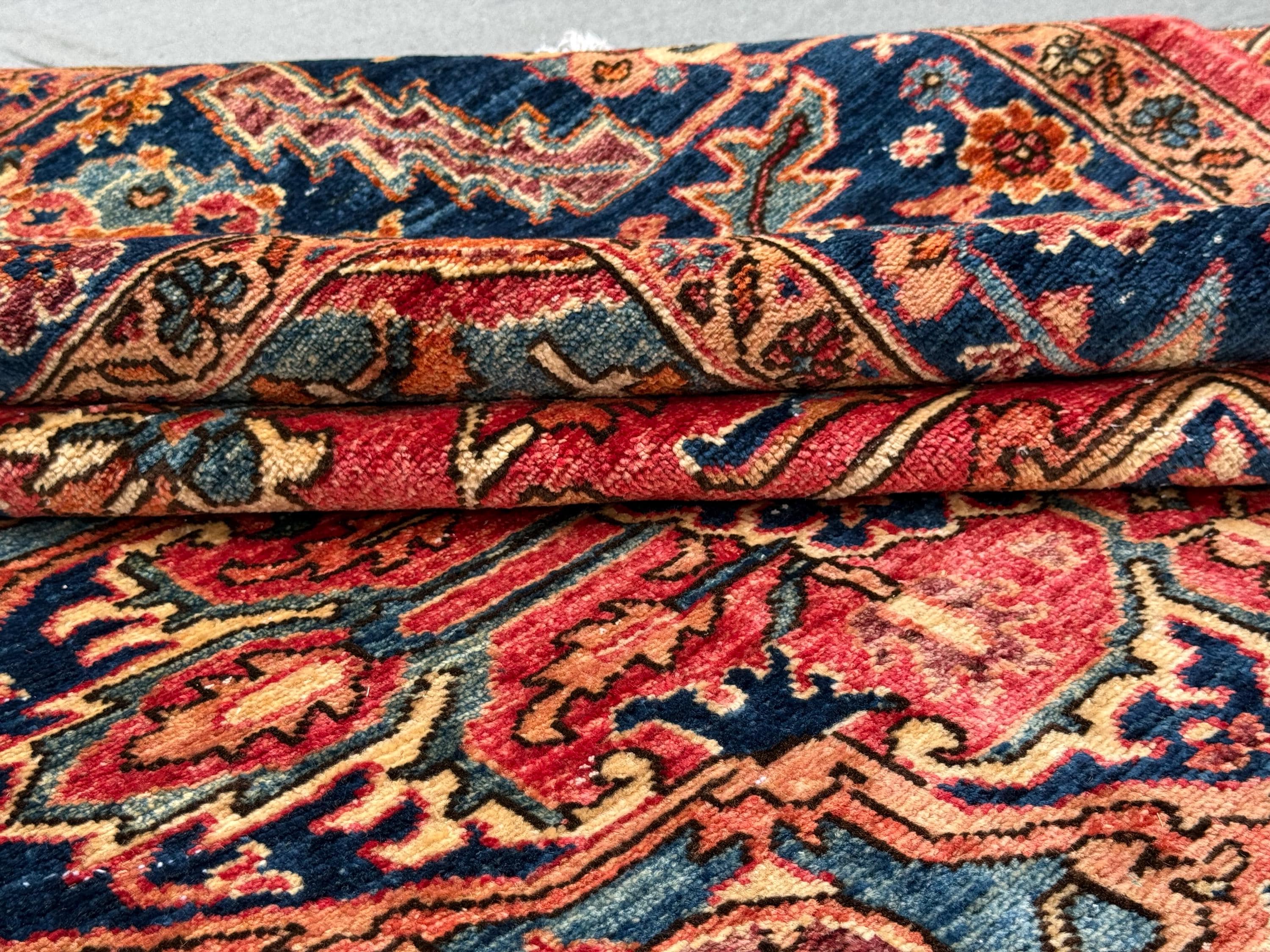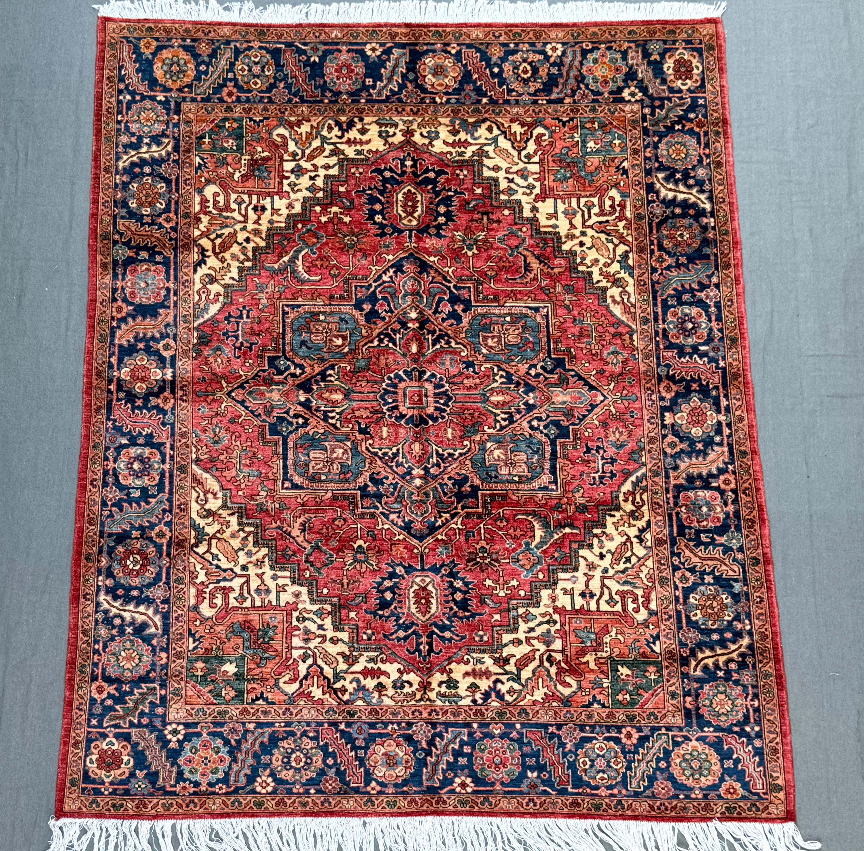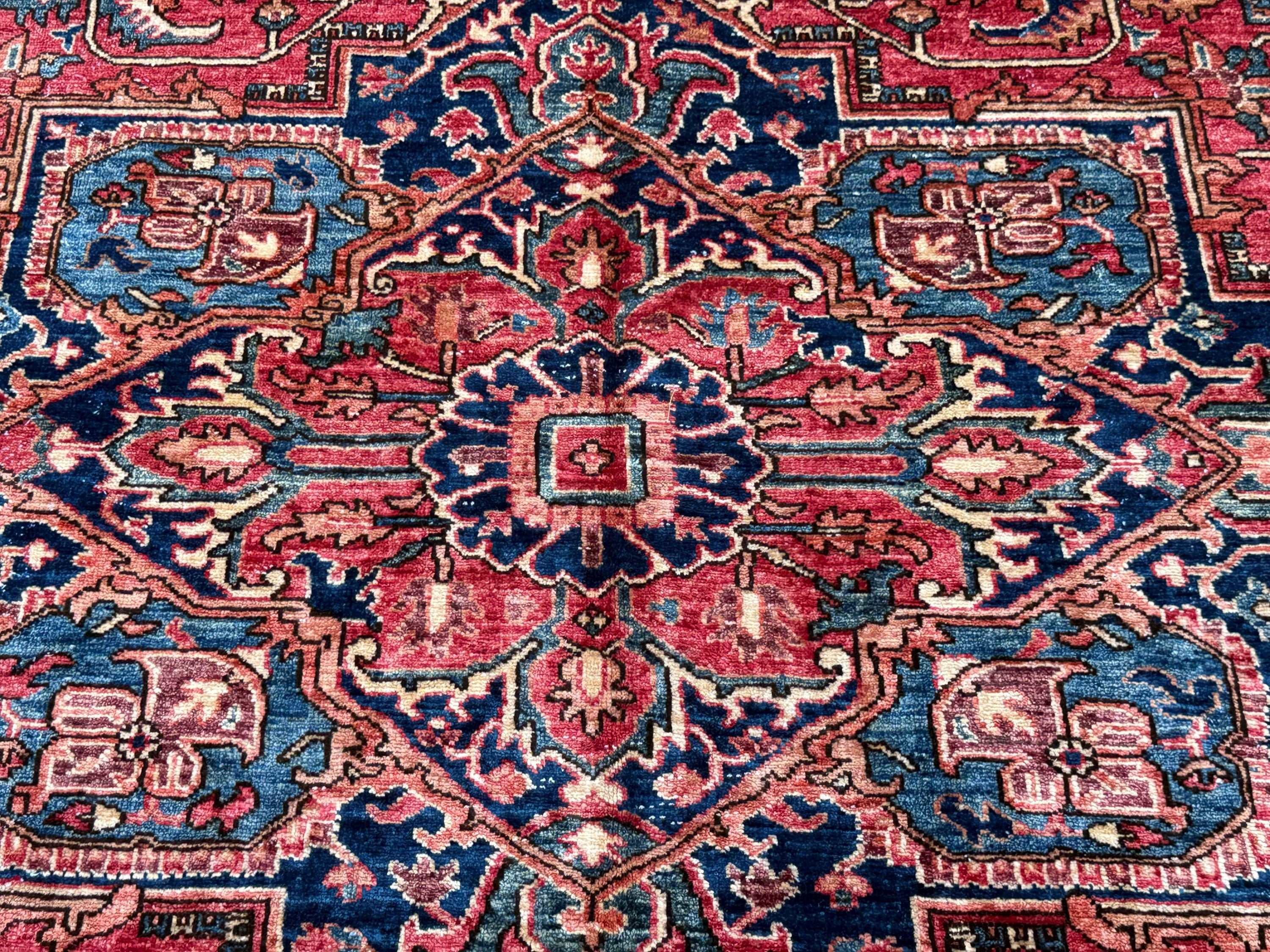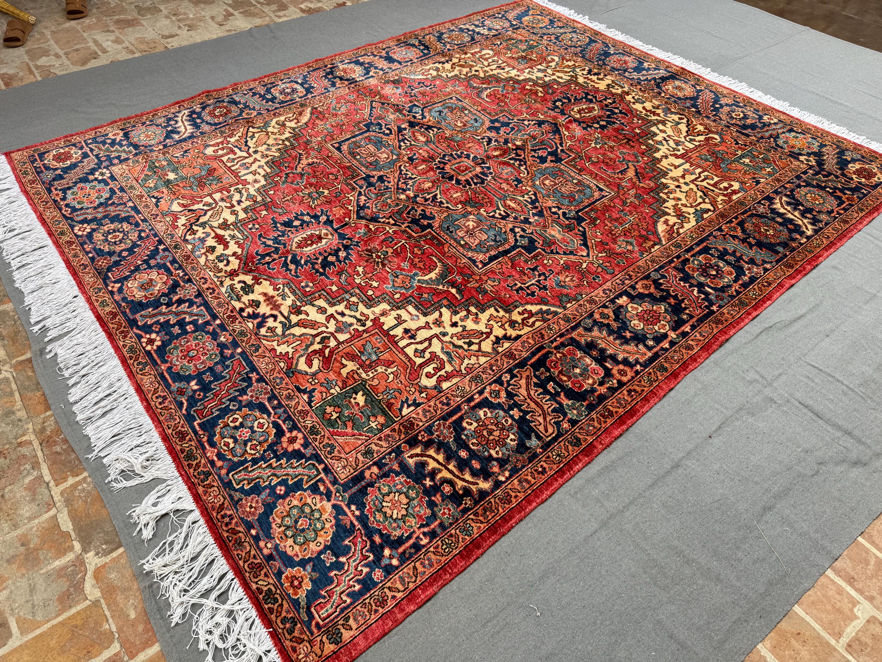 The rug showcases a striking central medallion design in deep red, ivory, and navy tones, framed by bold floral and geometric motifs along the border. Known for their durability and artistic appeal, Heriz rugs are versatile enough to enhance both classic and modern interiors.