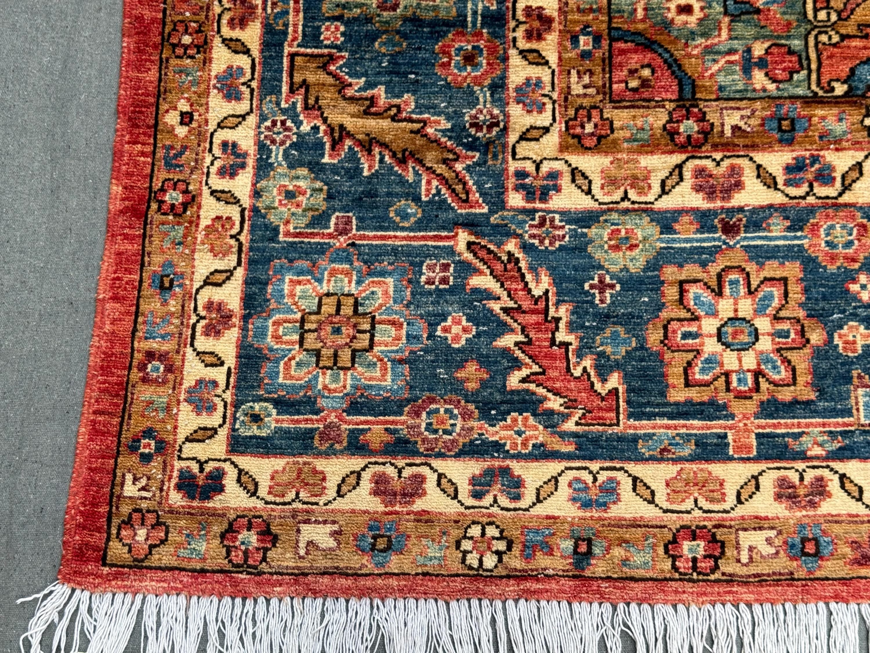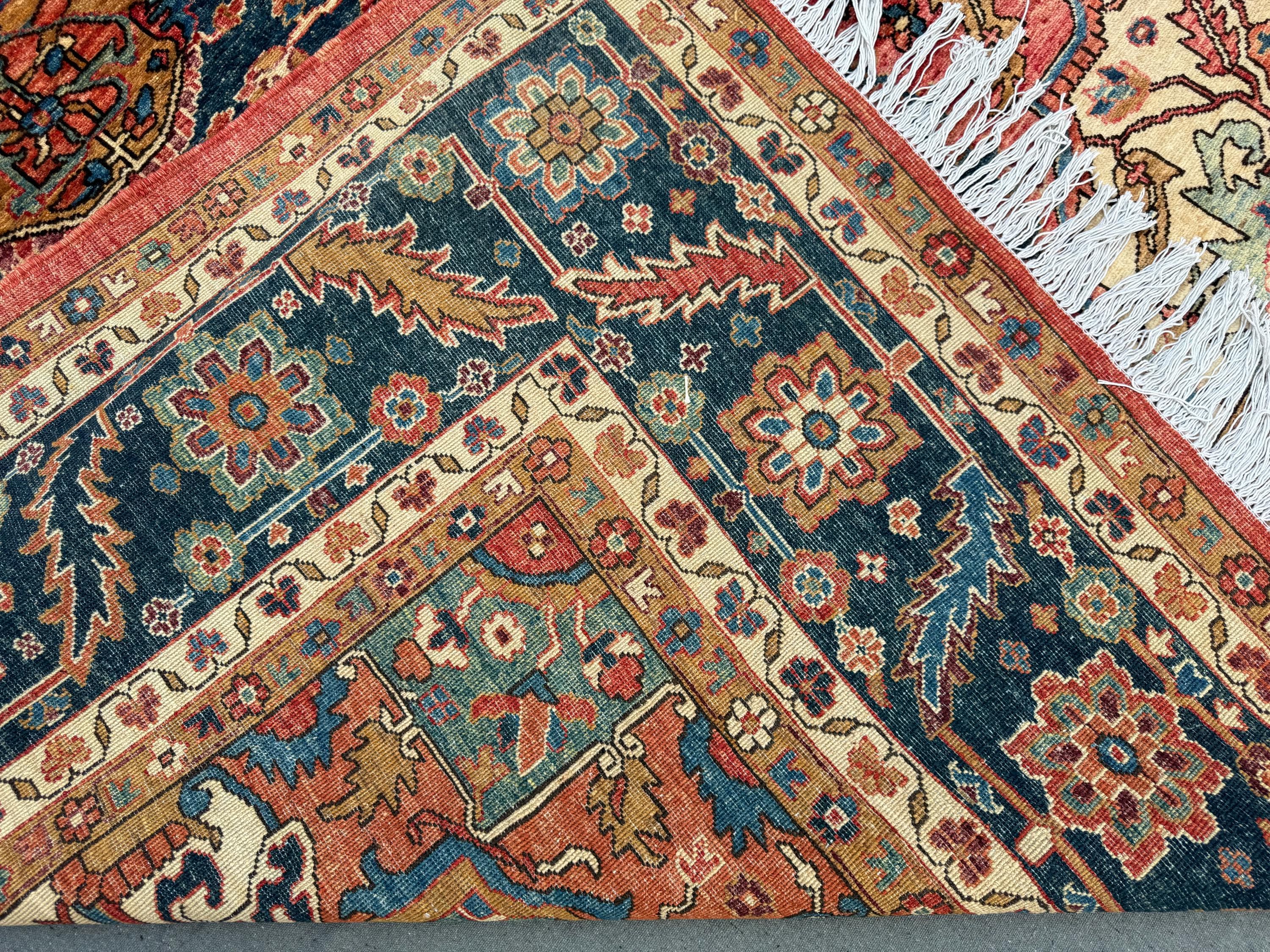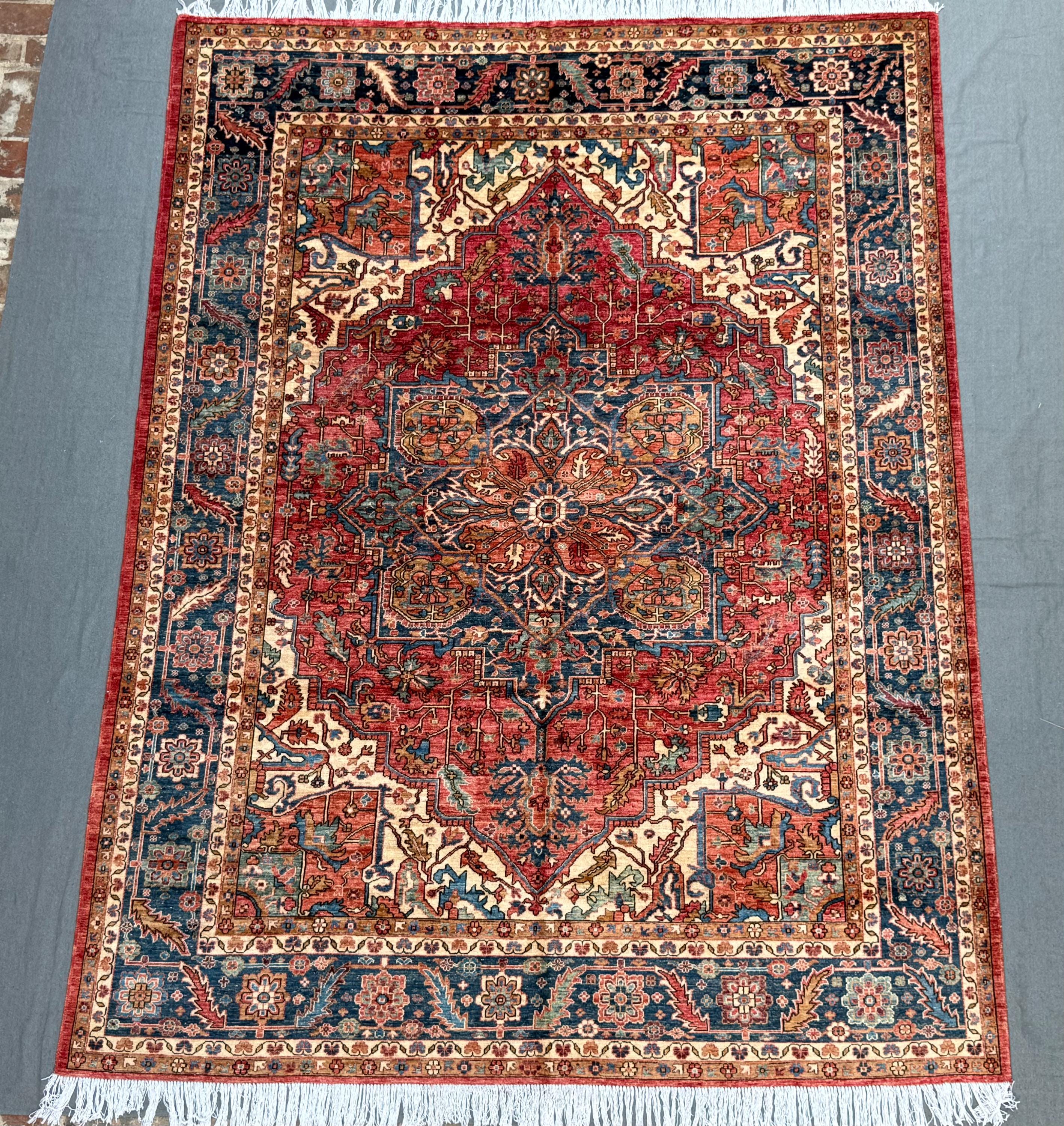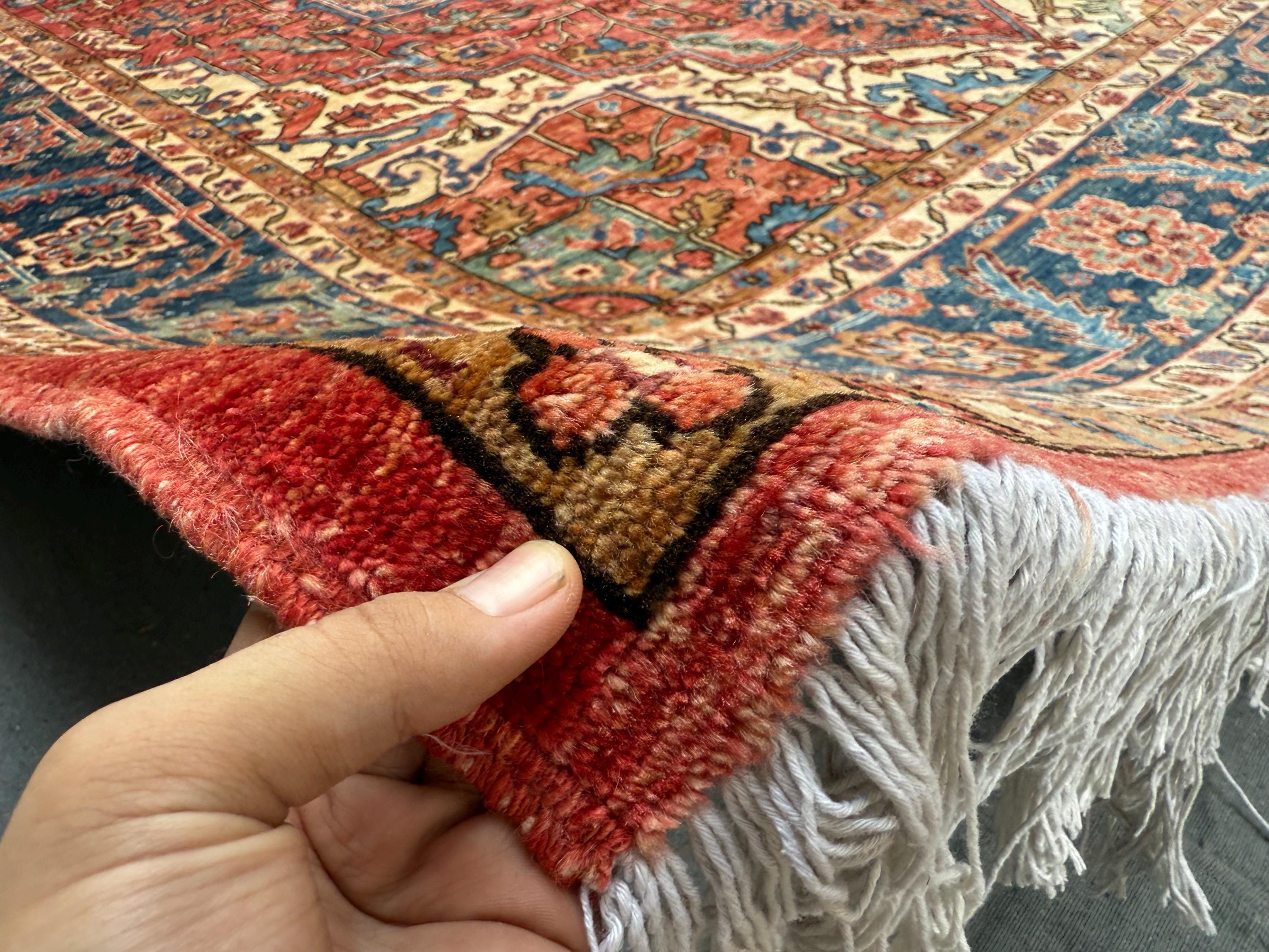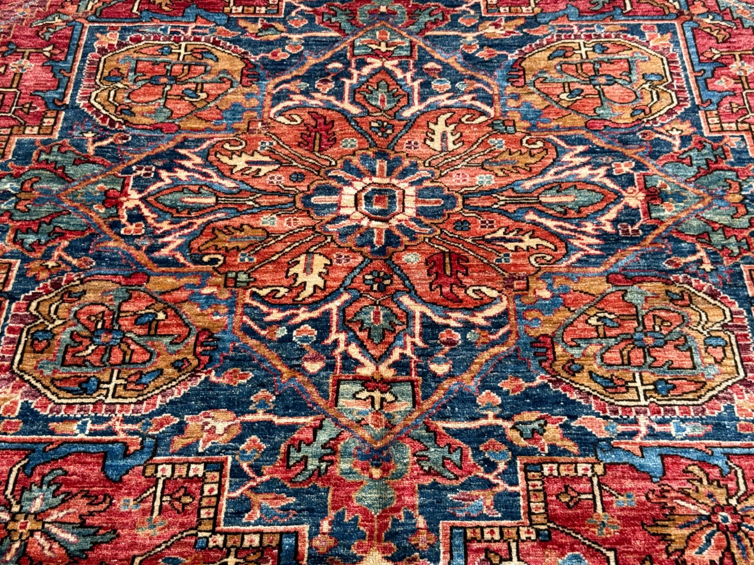 Design: Traditional Heriz Oriental medallion pattern with geometric and floral borders