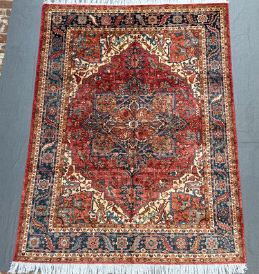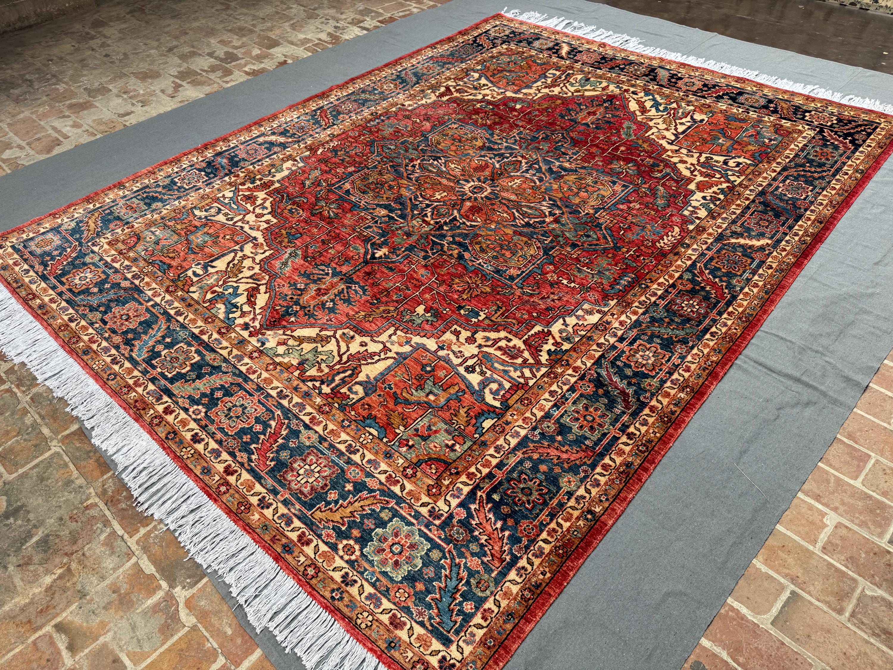 The rug’s striking central medallion design in deep red, navy blue, and ivory tones is framed by intricate geometric and floral motifs, characteristic of the timeless Heriz style. Its bold patterns and durable construction make it not only a decorative showpiece but also a long-lasting investment.