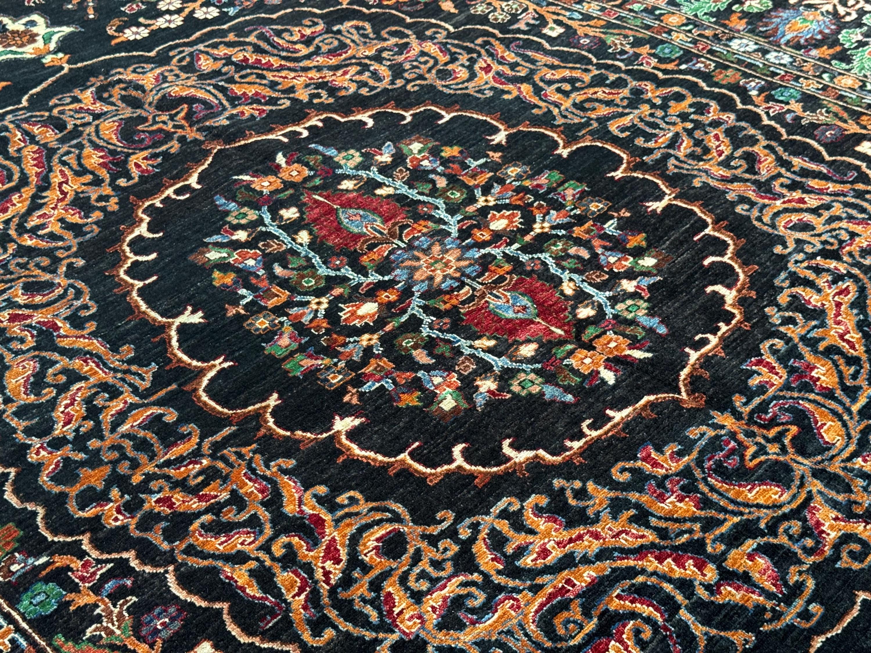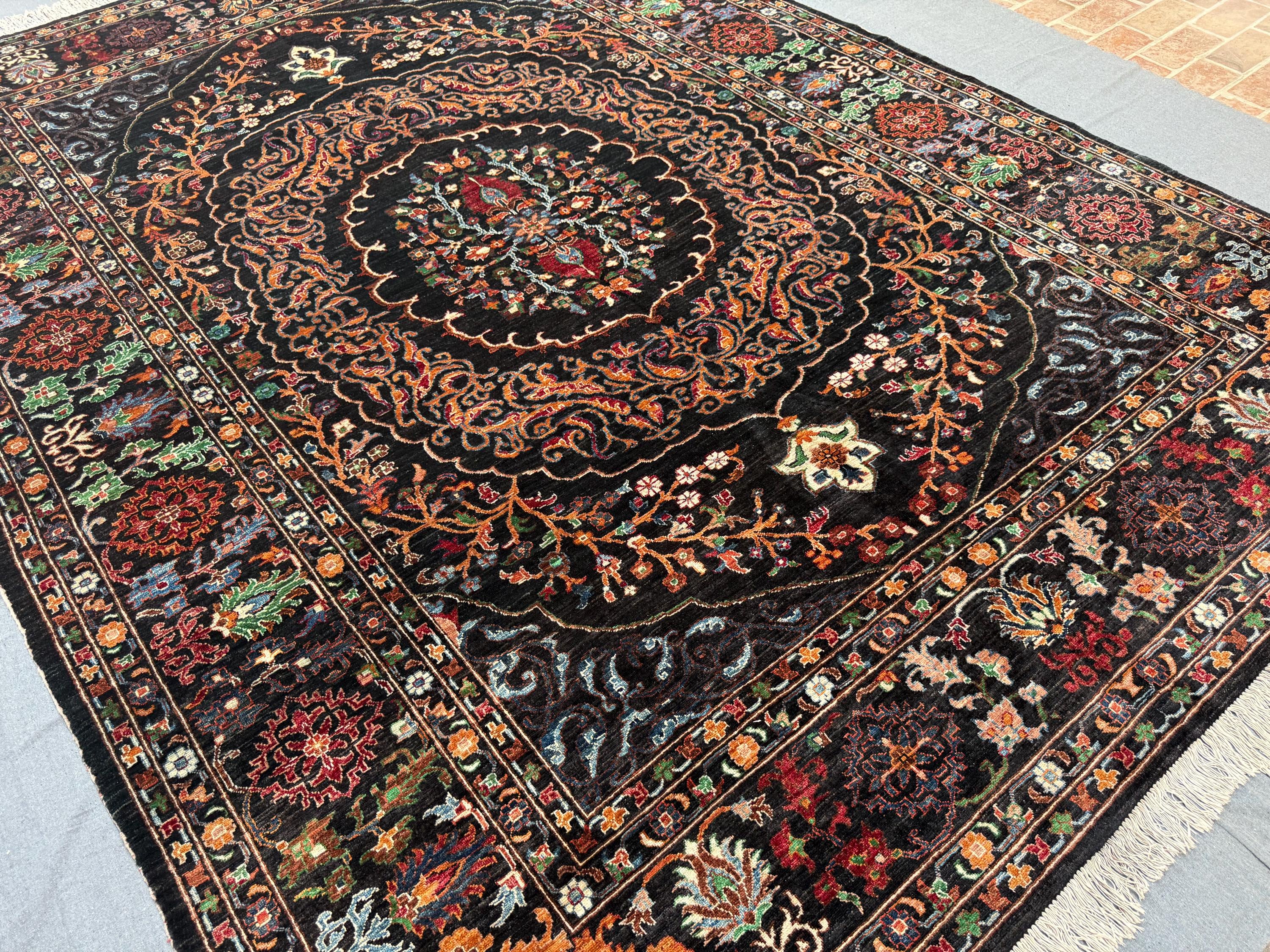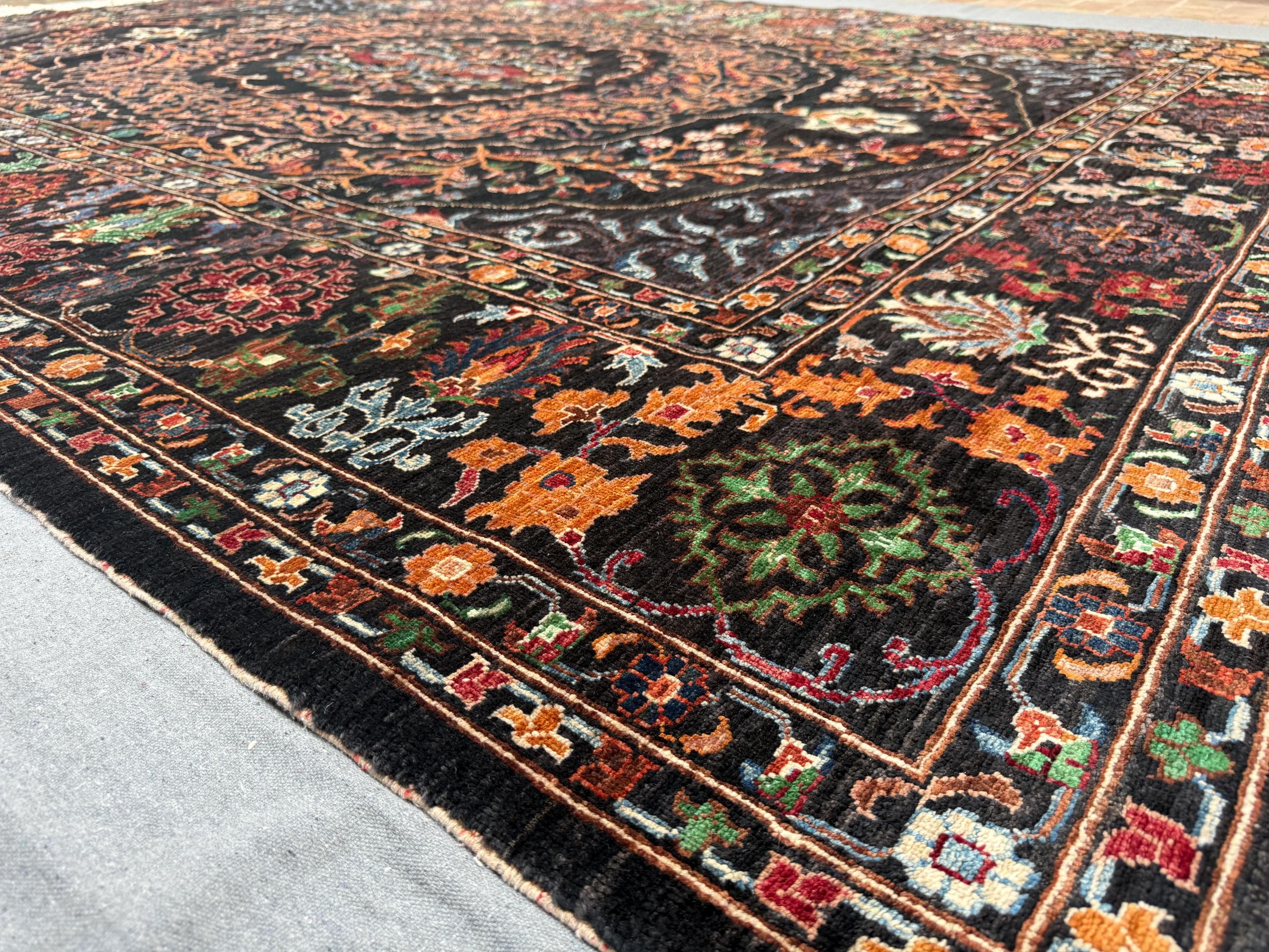 Handmade Heriz Rug 9x13 | Black Wool Medallion Area Rug | Large Traditional Carpet | Elegant Hand Knotted Floral Wool Living Room Rug