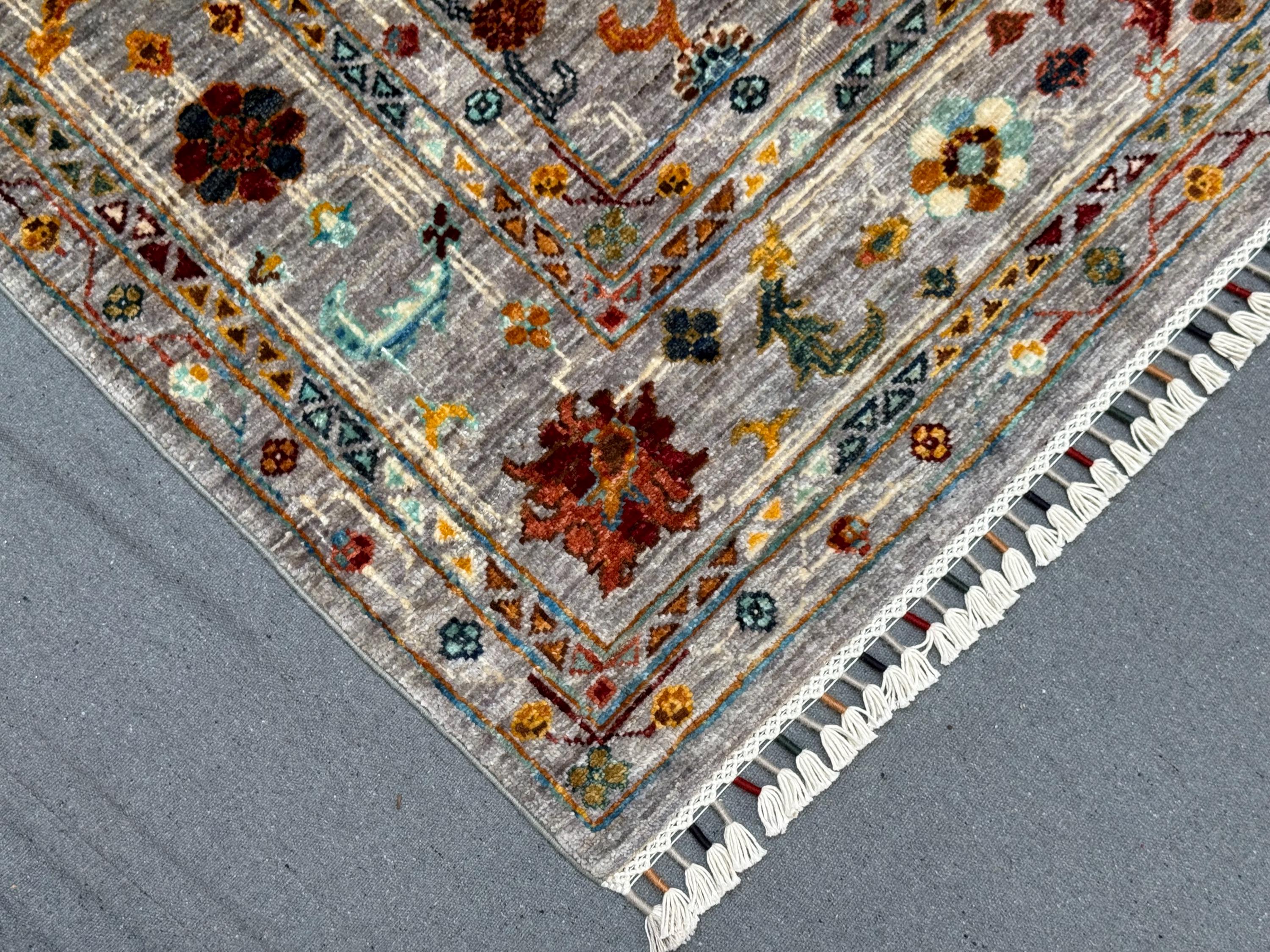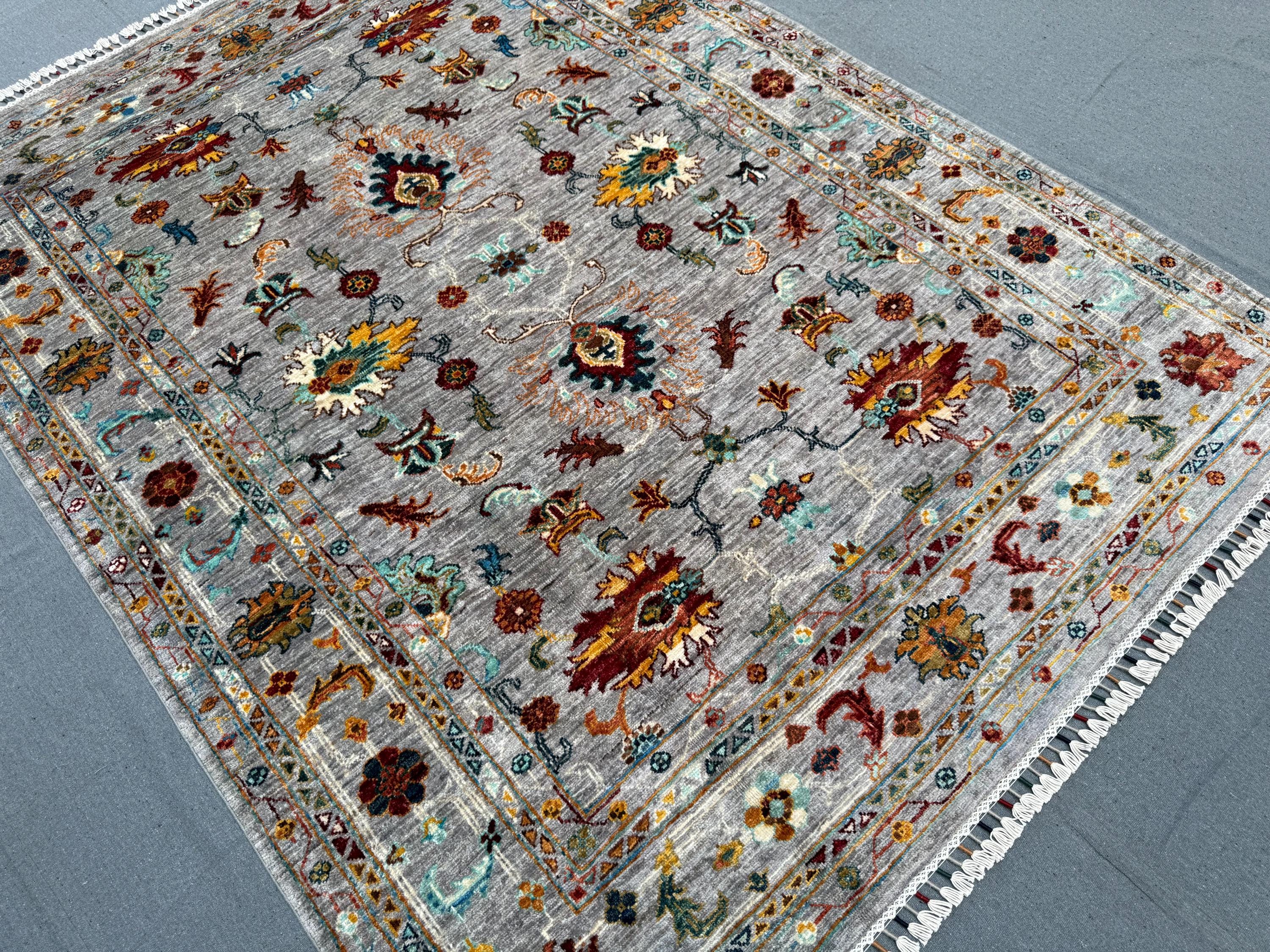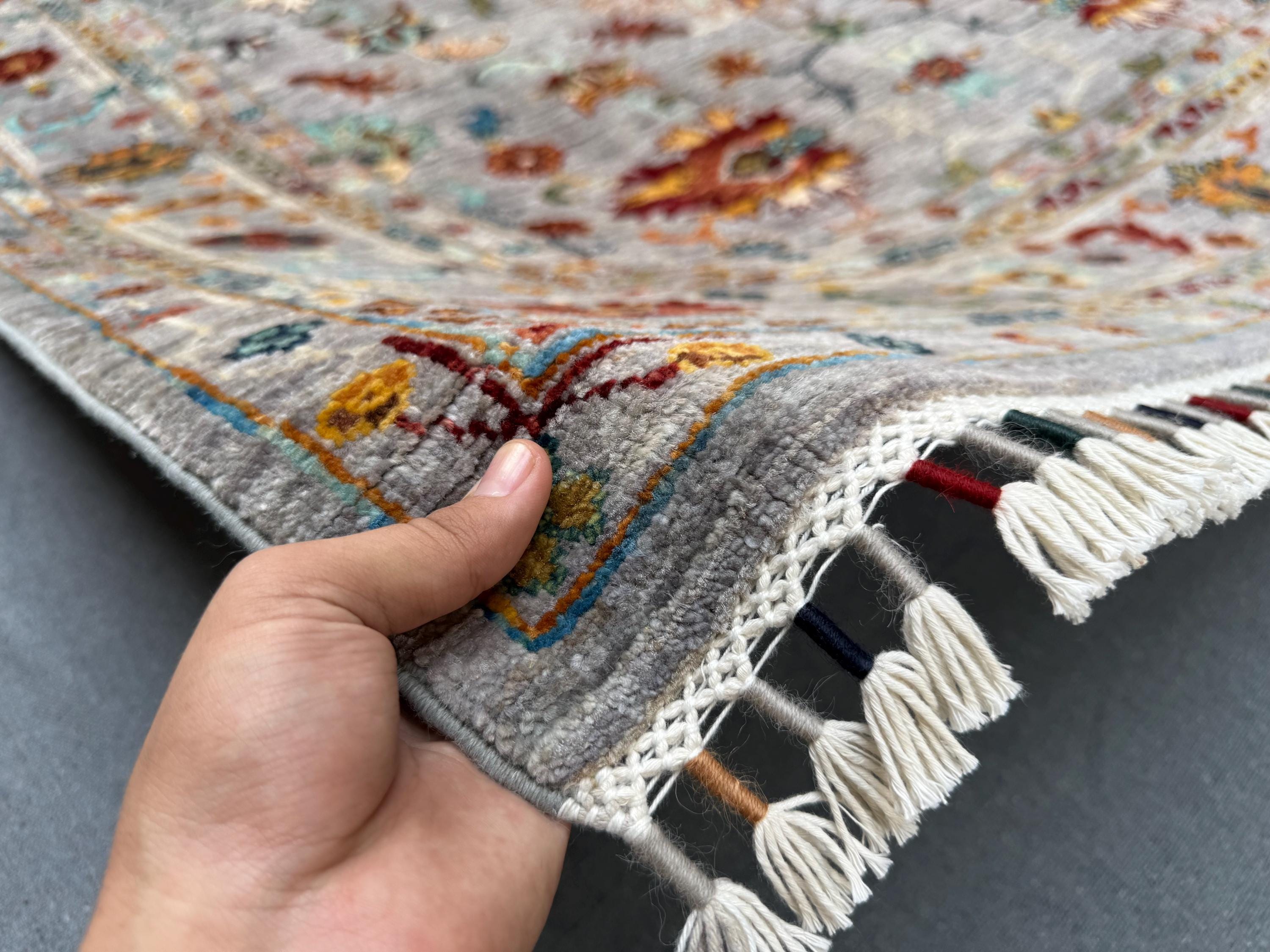 Handmade Sultani Rug 5x7 | Gray Wool Floral Area Rug | Hand Knotted Traditional Carpet | Boho Wool Living Room Rug with Colorful Design