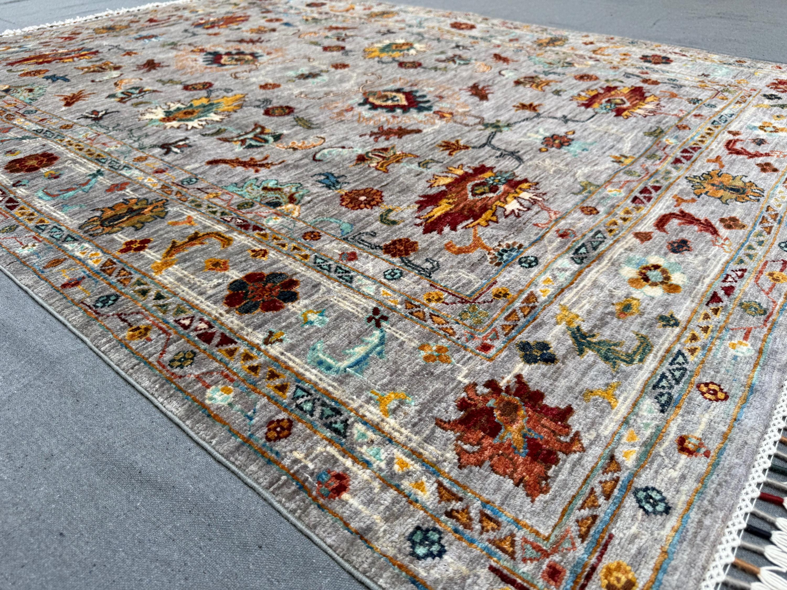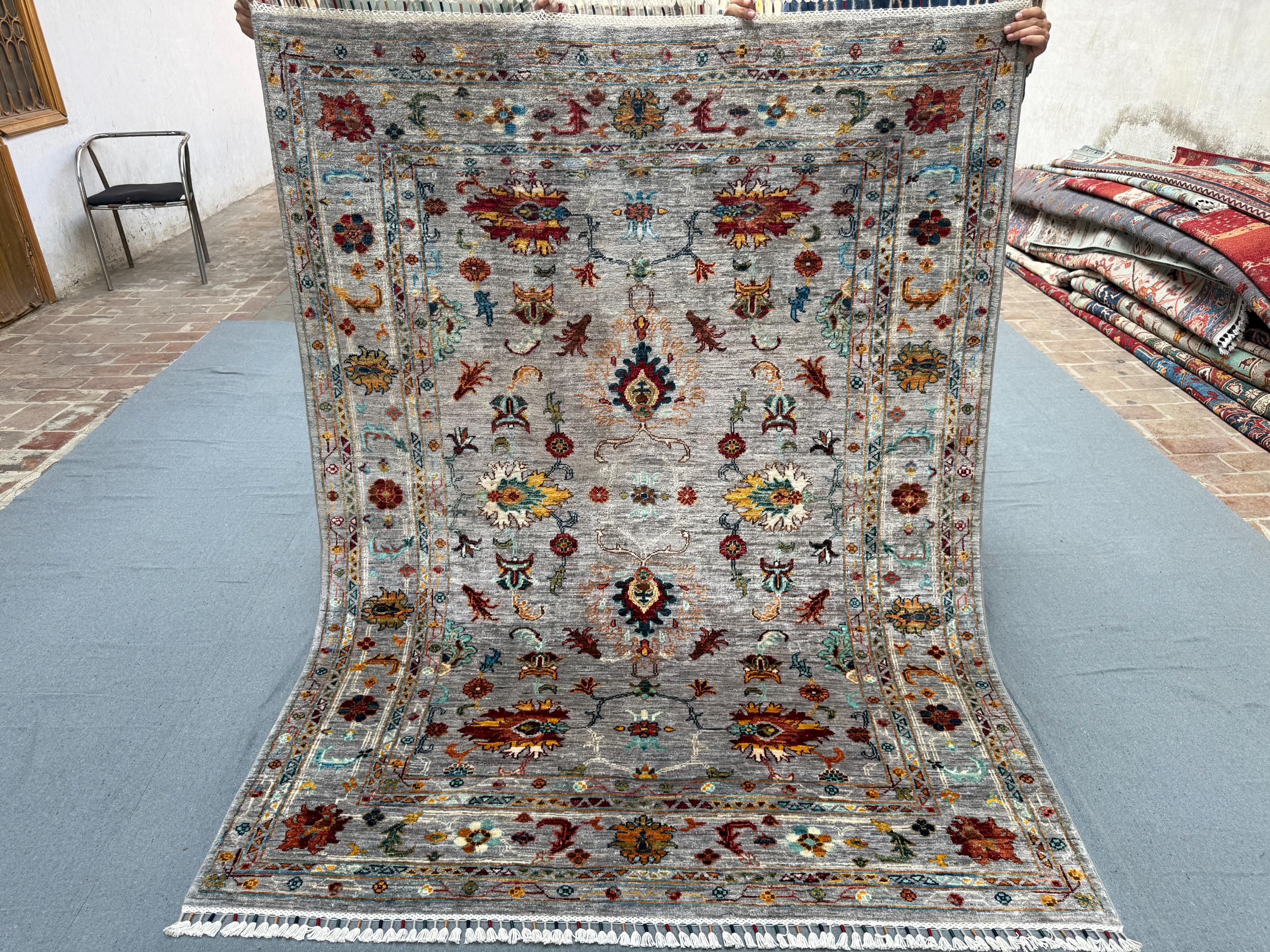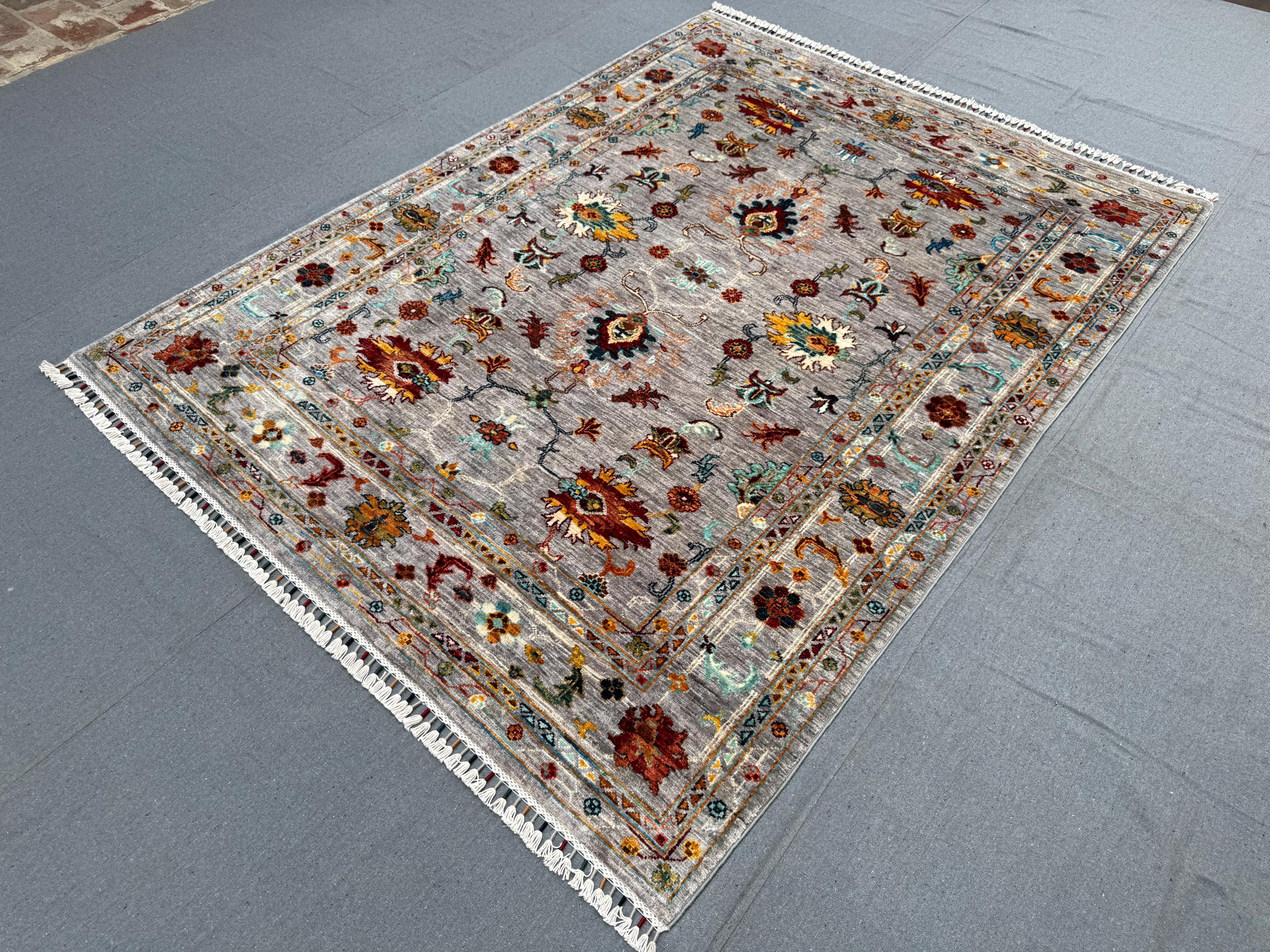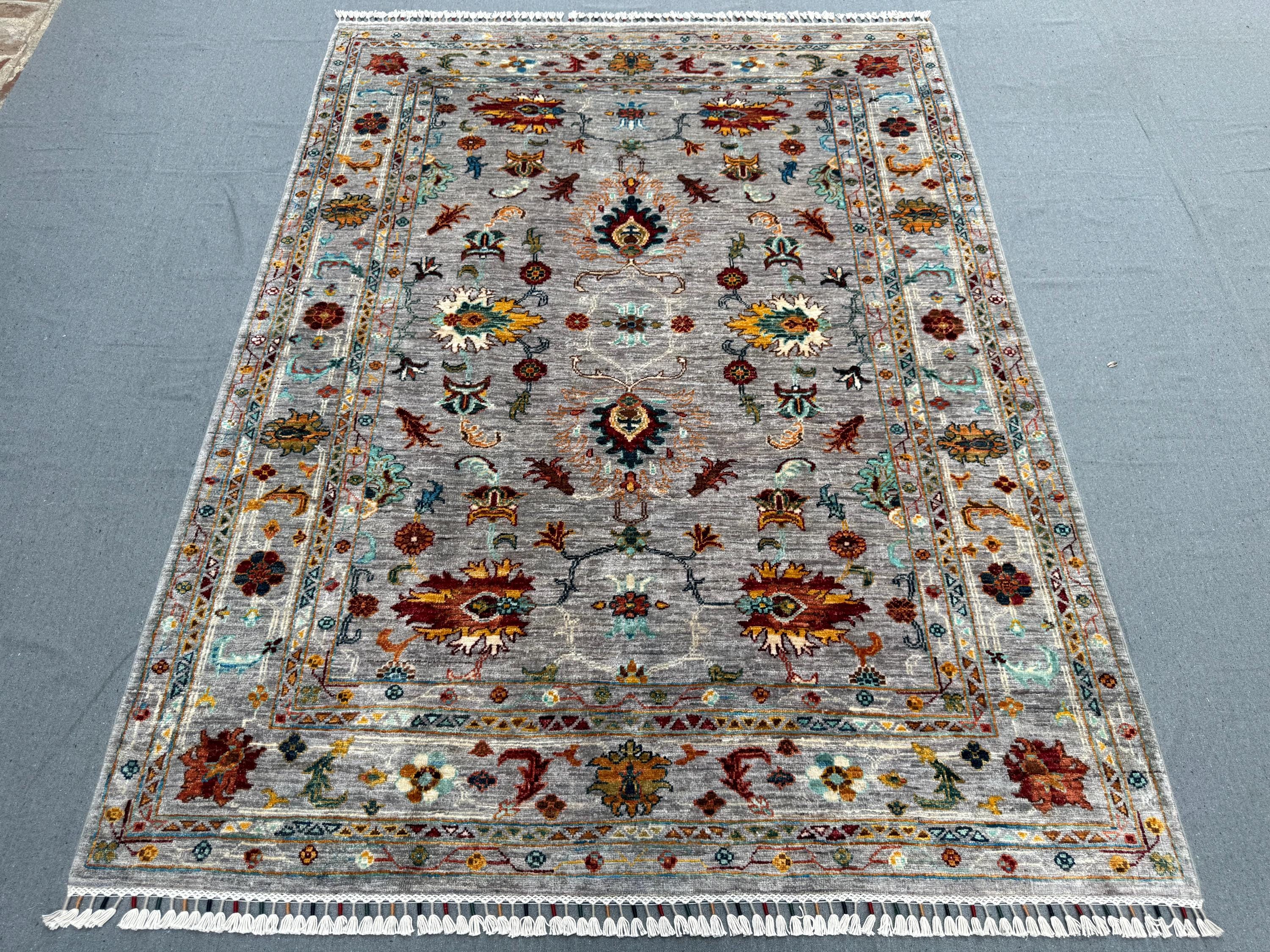 Handmade Sultani Rug 5x7 | Gray Wool Floral Area Rug | Hand Knotted Traditional Carpet | Boho Wool Living Room Rug with Colorful Design