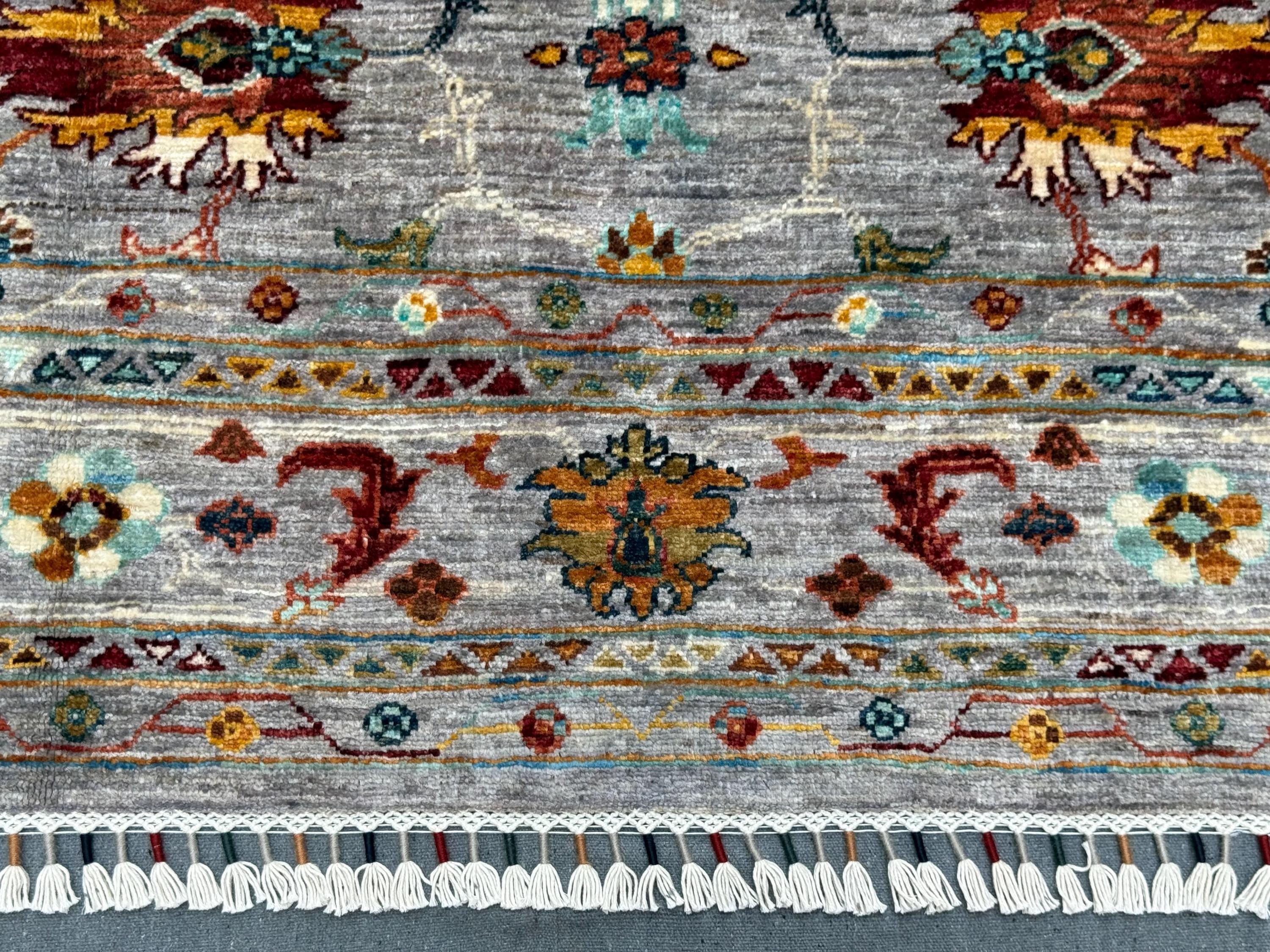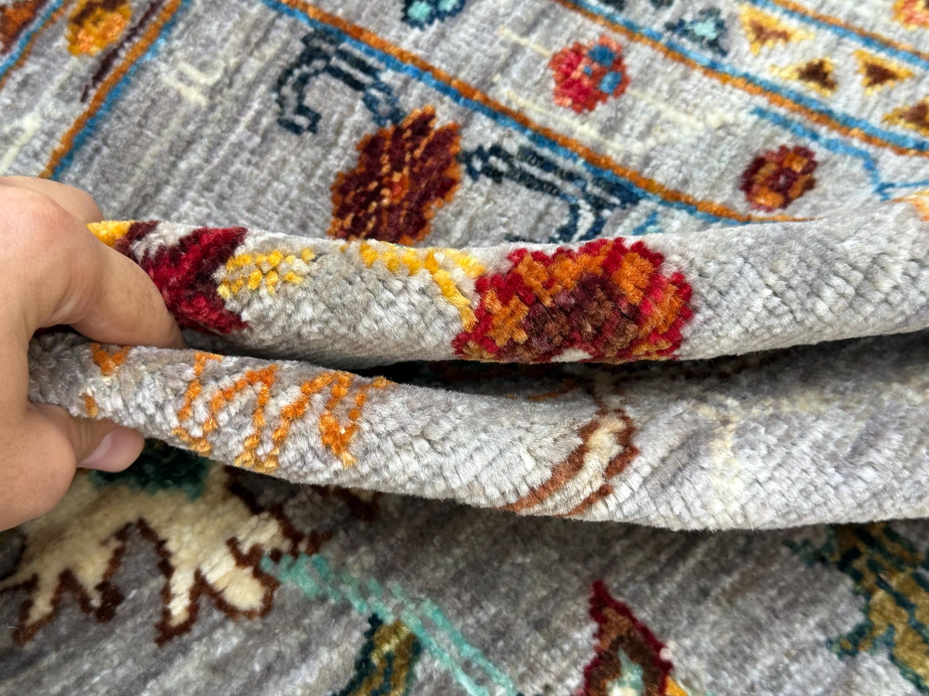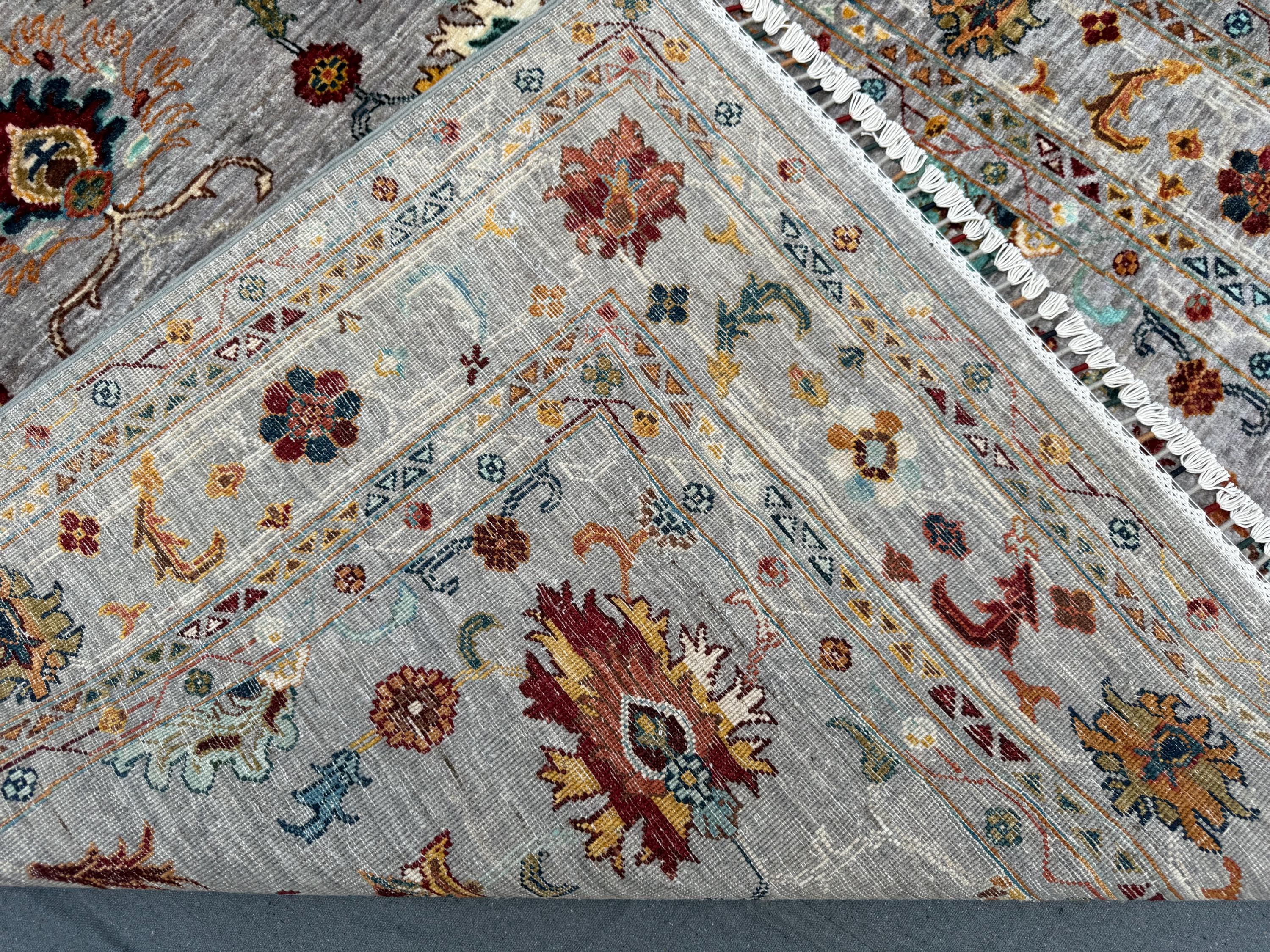 Add a touch of luxury and timeless beauty to your home with this handmade Sultani rug, featuring a soft gray background adorned with colorful floral and botanical motifs.