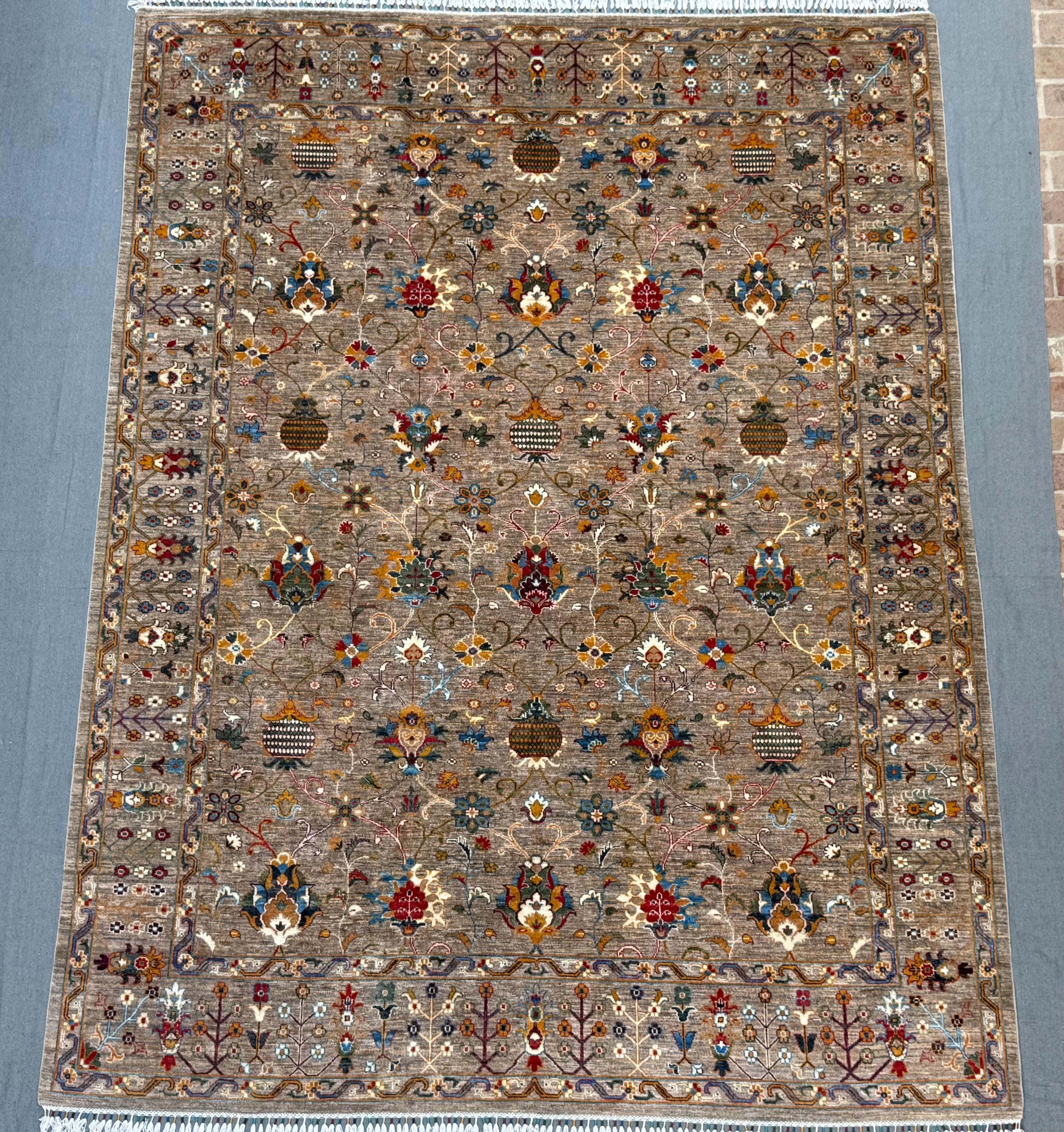 Featuring an earthy brown background highlighted with tones of red, gold, blue, and green, this rug adds both elegance and coziness to your interior.