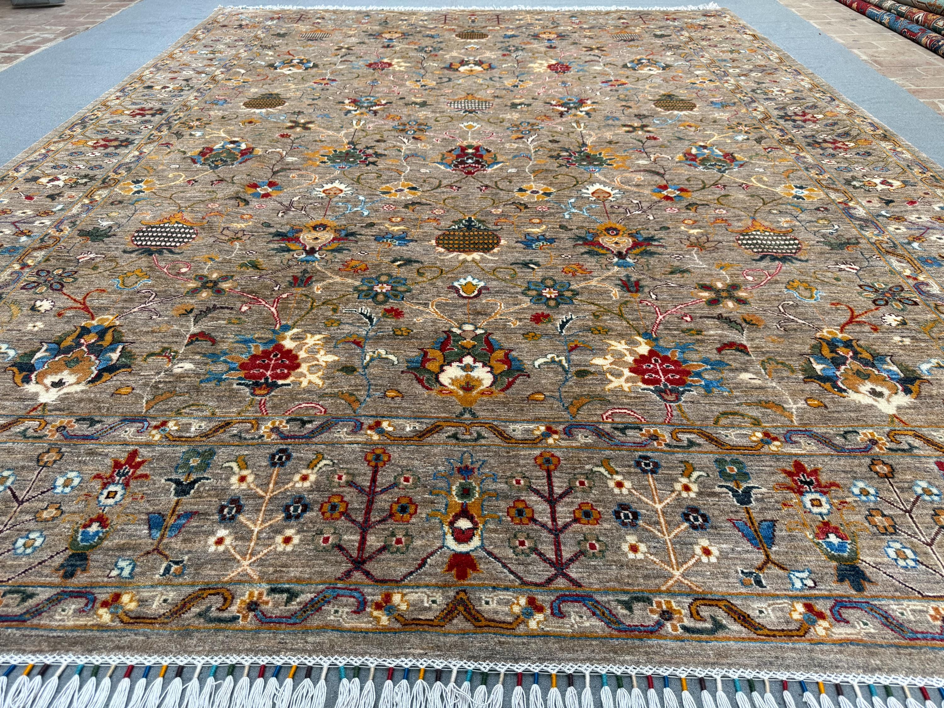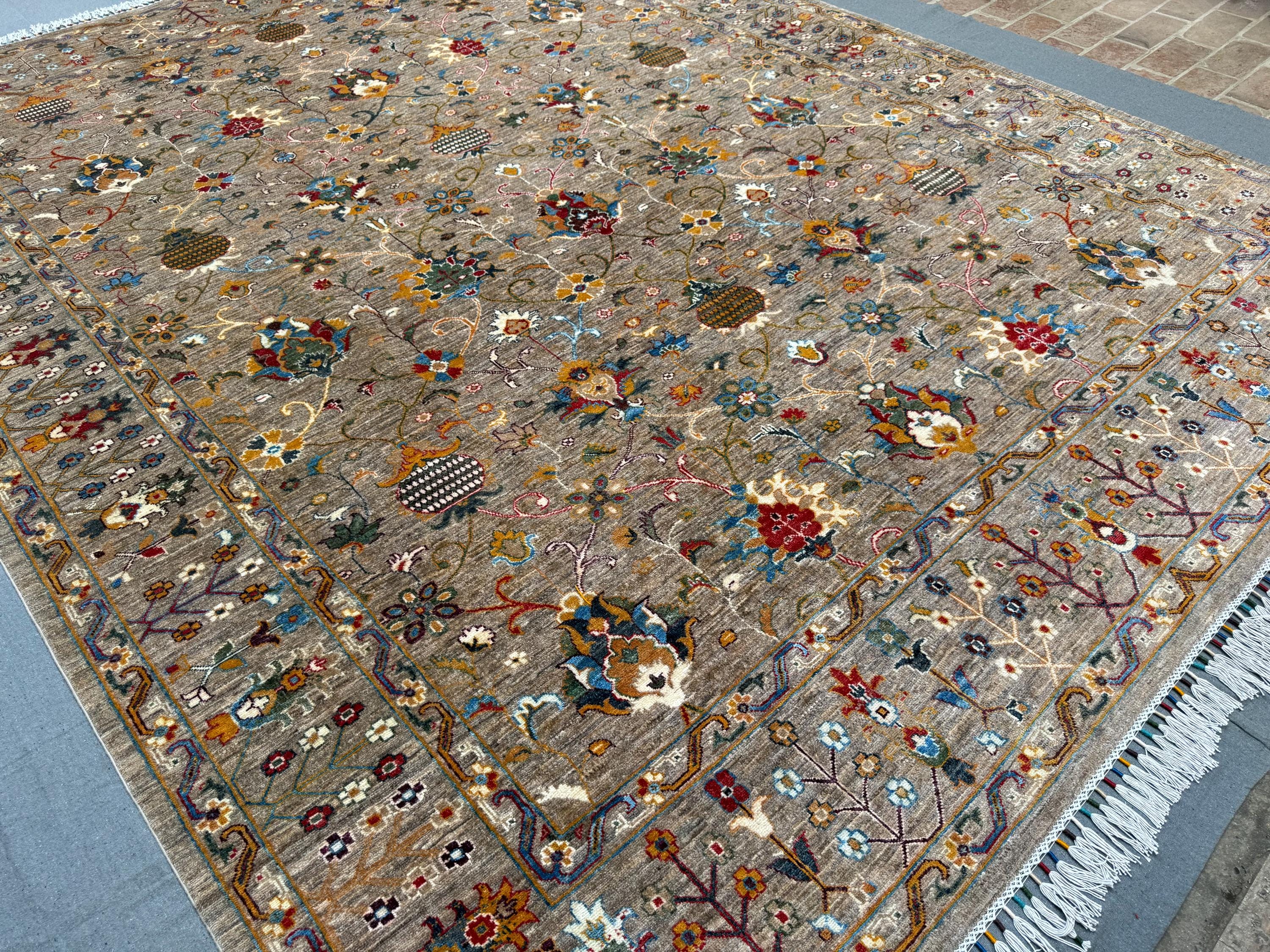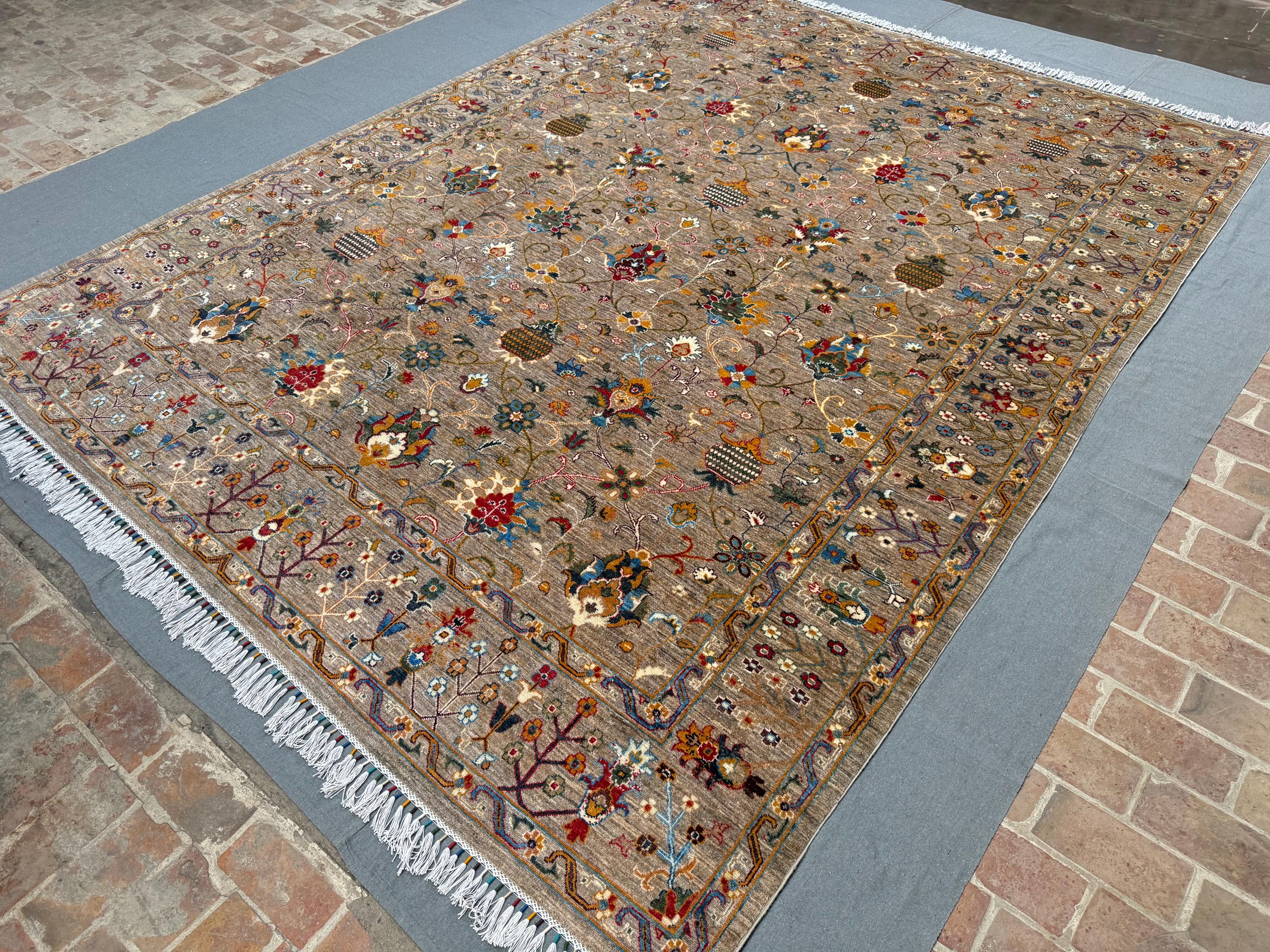Handmade Sultani Rug 9x12 | Brown Wool Floral Area Rug | Large Traditional Carpet | Elegant Living Room Boho Wool Handmade Rug