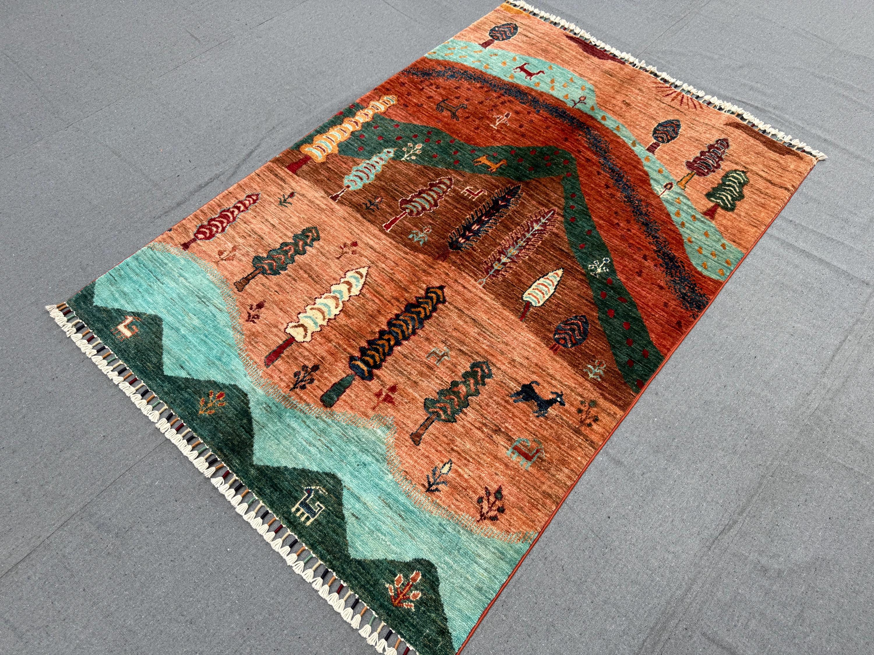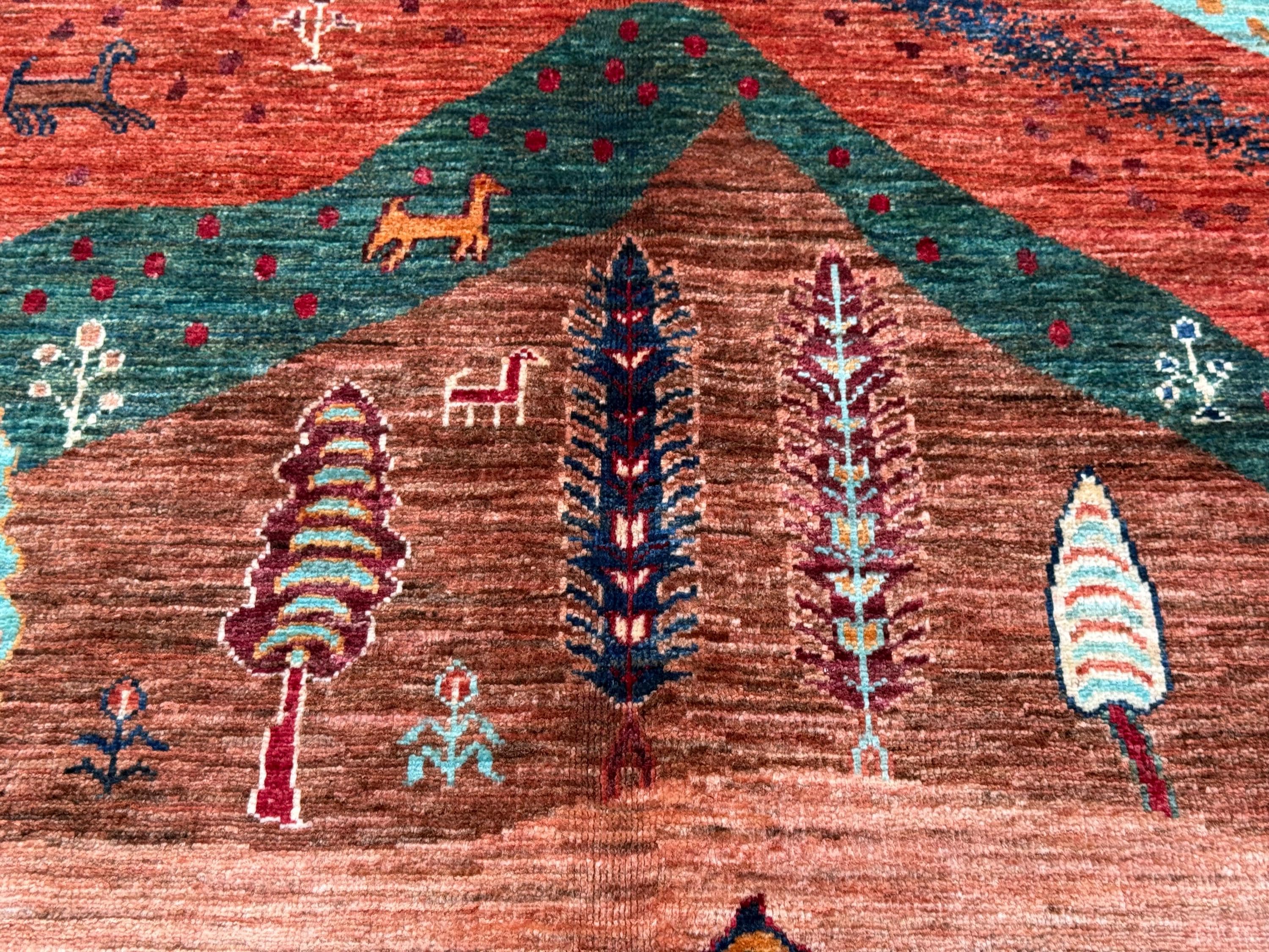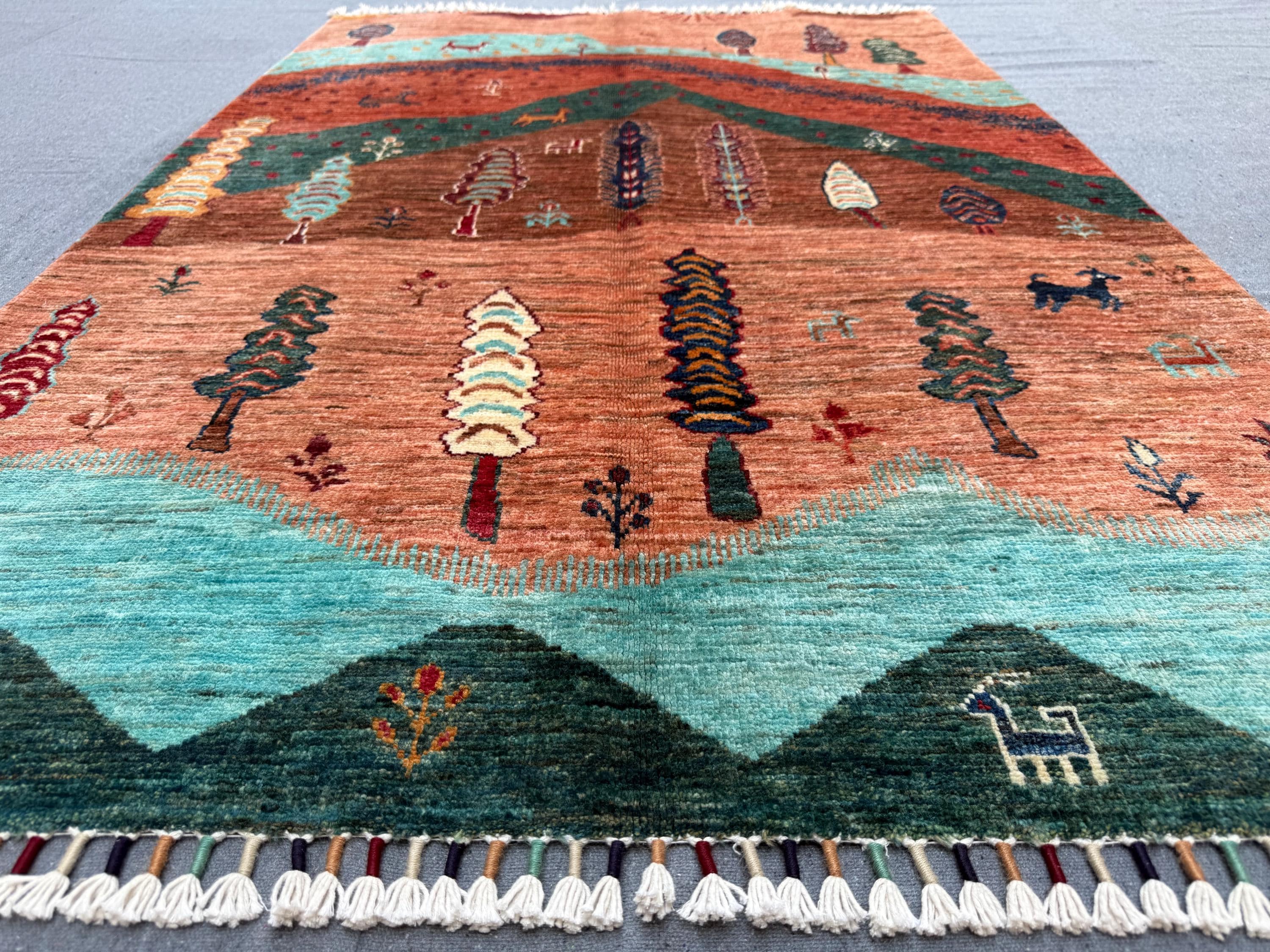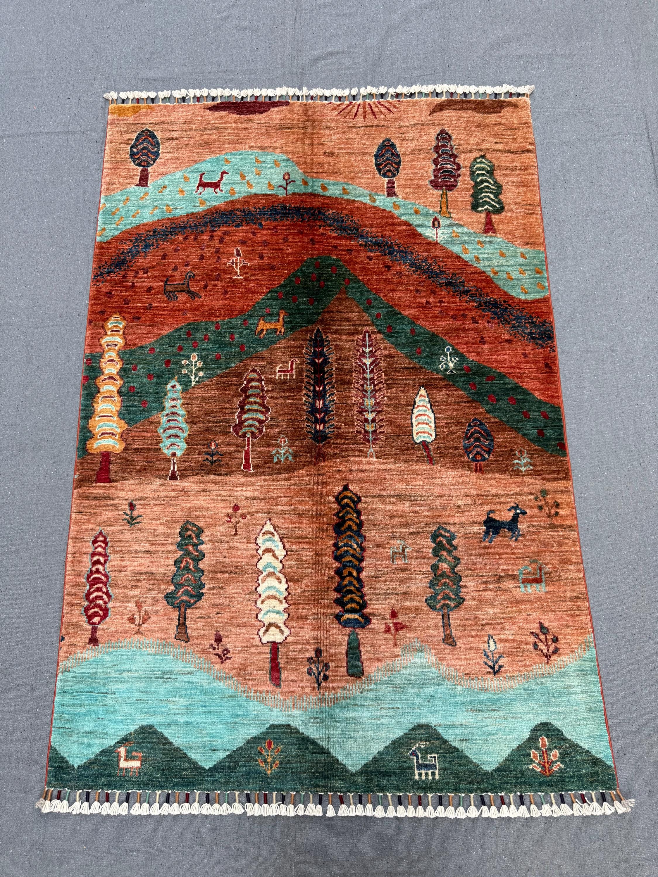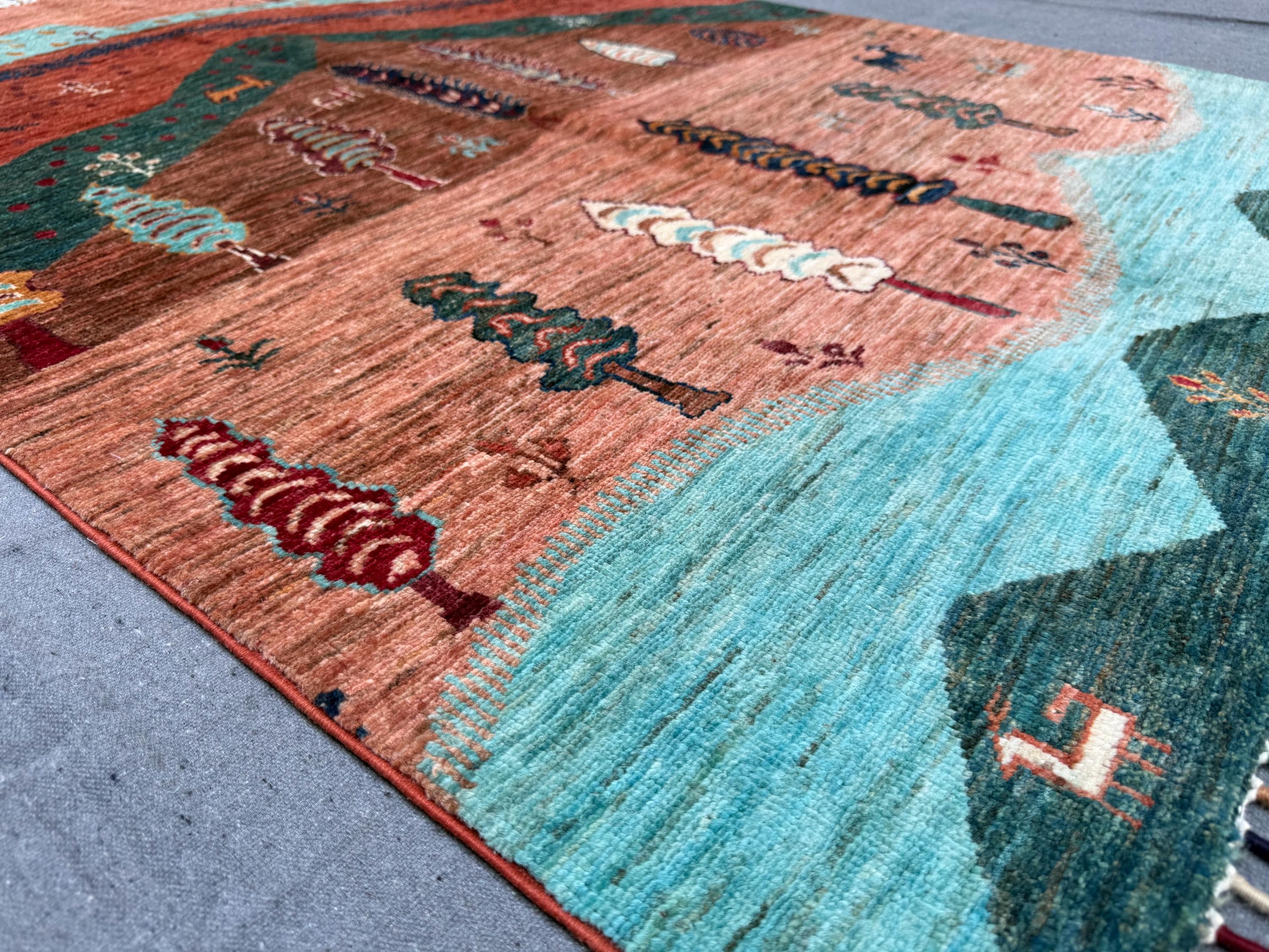 Bring warmth, storytelling, and artistry to your space with this handmade Tree of Life rug, featuring a vibrant mountain and forest landscape woven with animal and tree motifs.