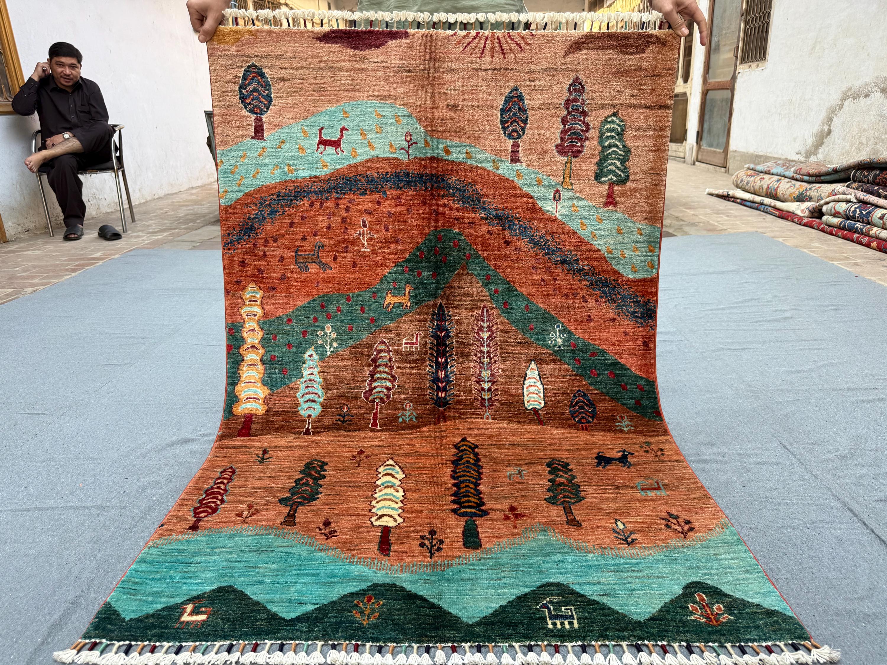 Crafted from 100% high-quality wool, this rug is soft, durable, and naturally resilient. Each piece is hand-knotted by skilled artisans, ensuring that every detail — from the grazing animals to the rising sun — reflects true craftsmanship and cultural heritage.