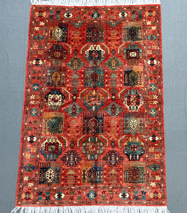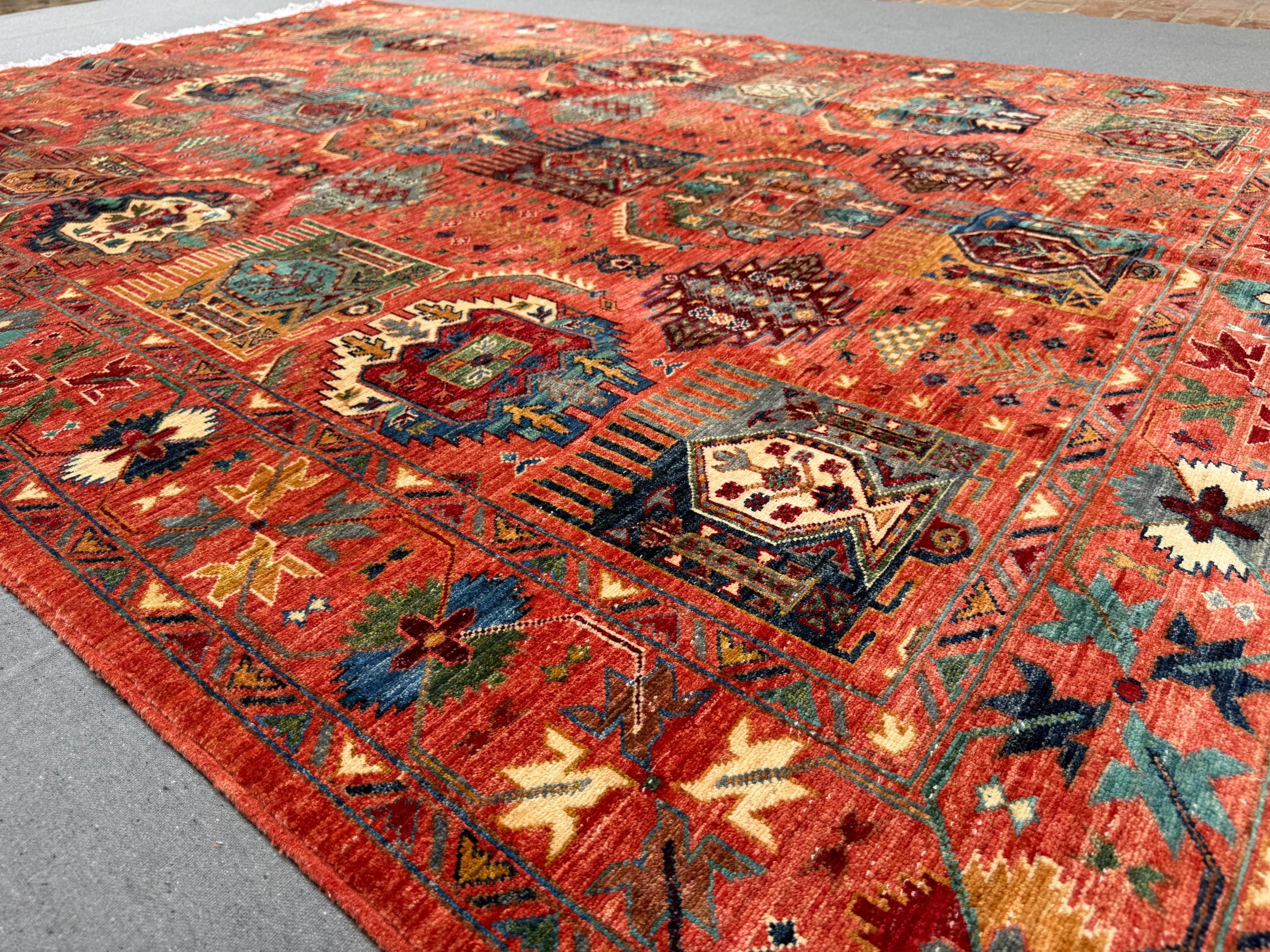 The rug showcases bold tribal and geometric motifs arranged in repeating patterns, highlighted by a rich red background with accents of blue, ivory, green, and gold. Its intricate border and detailed motifs reflect the artistry of Waziri craftsmanship, making it a piece that balances cultural heritage with decorative beauty.