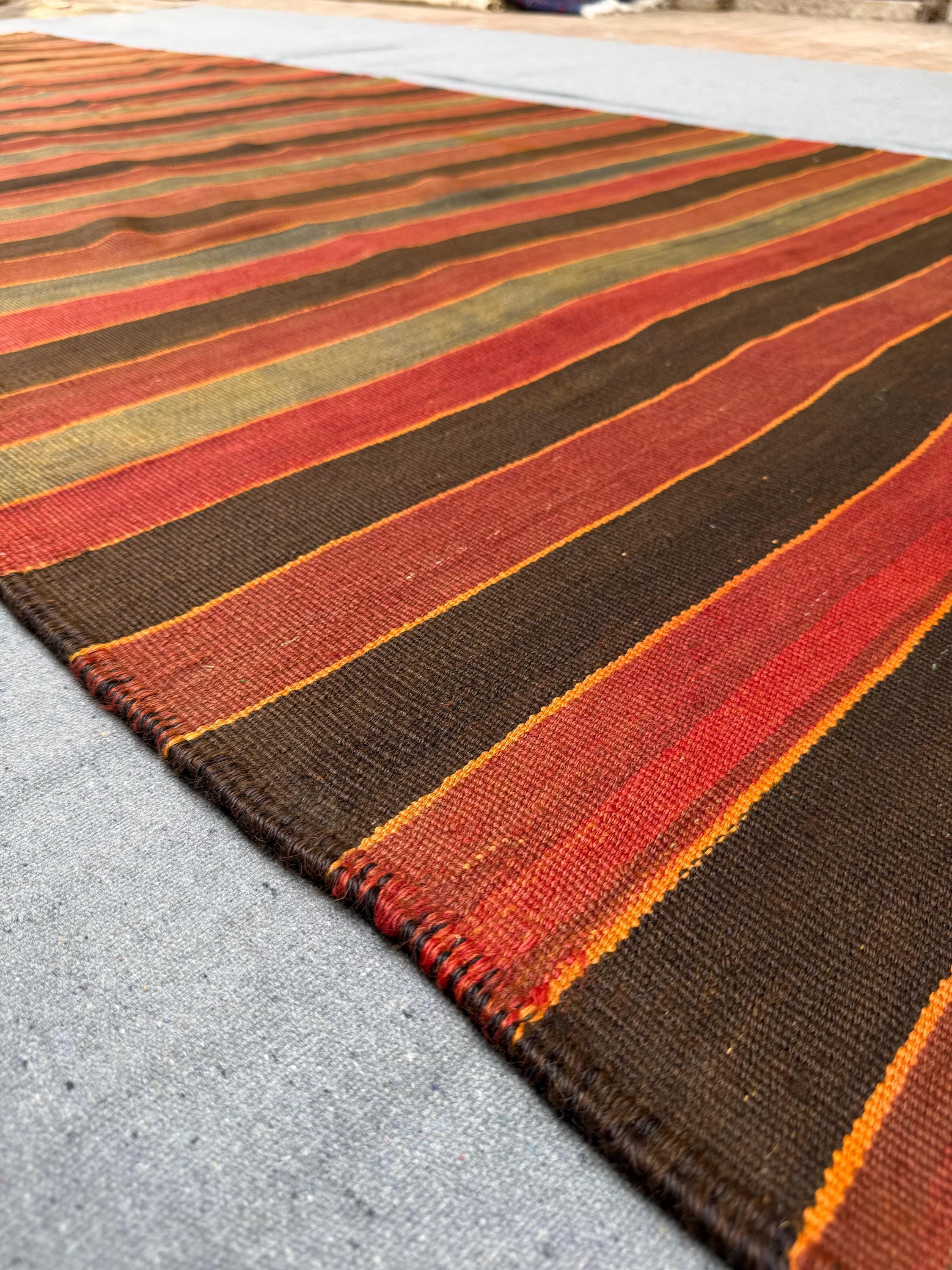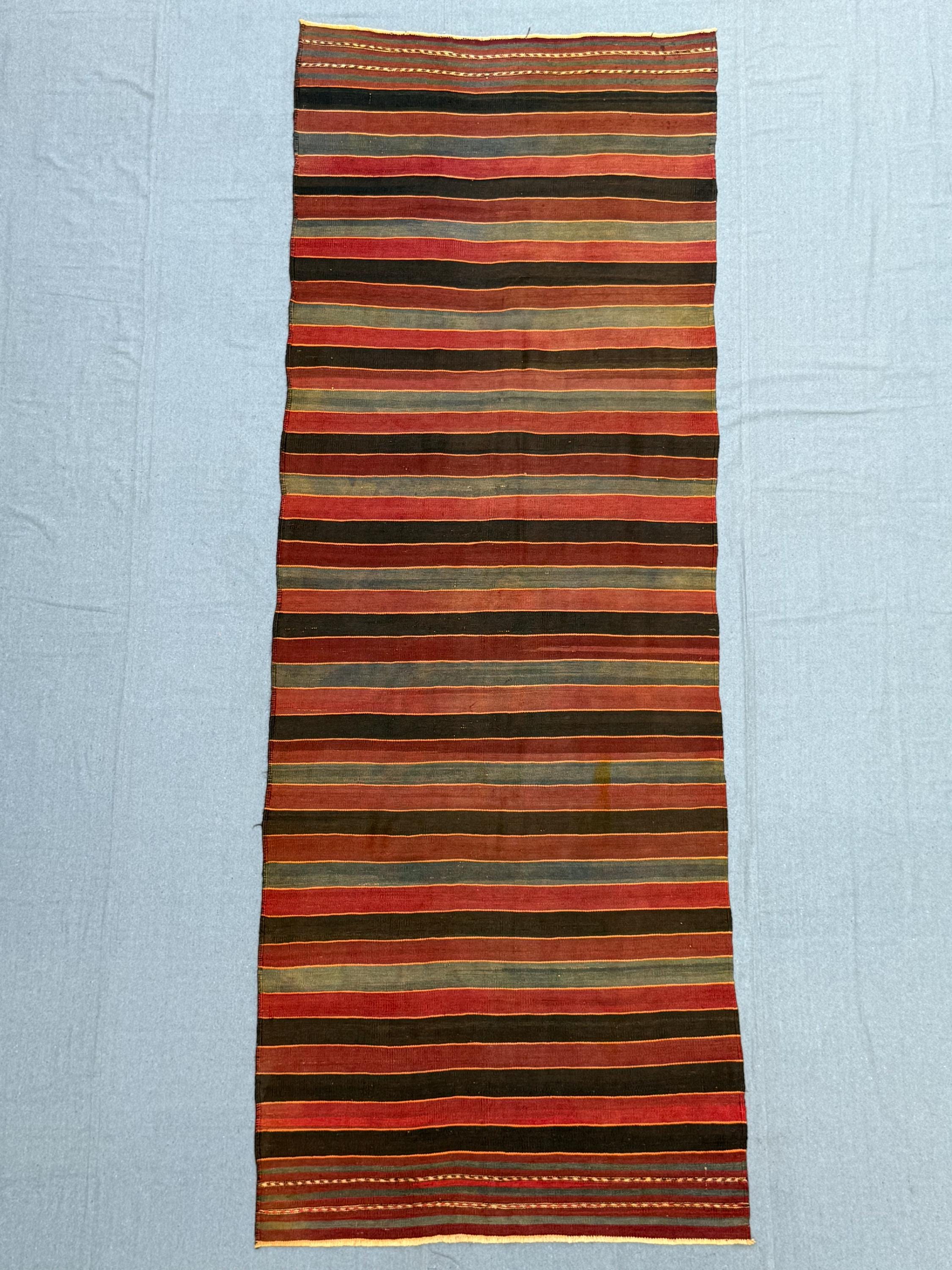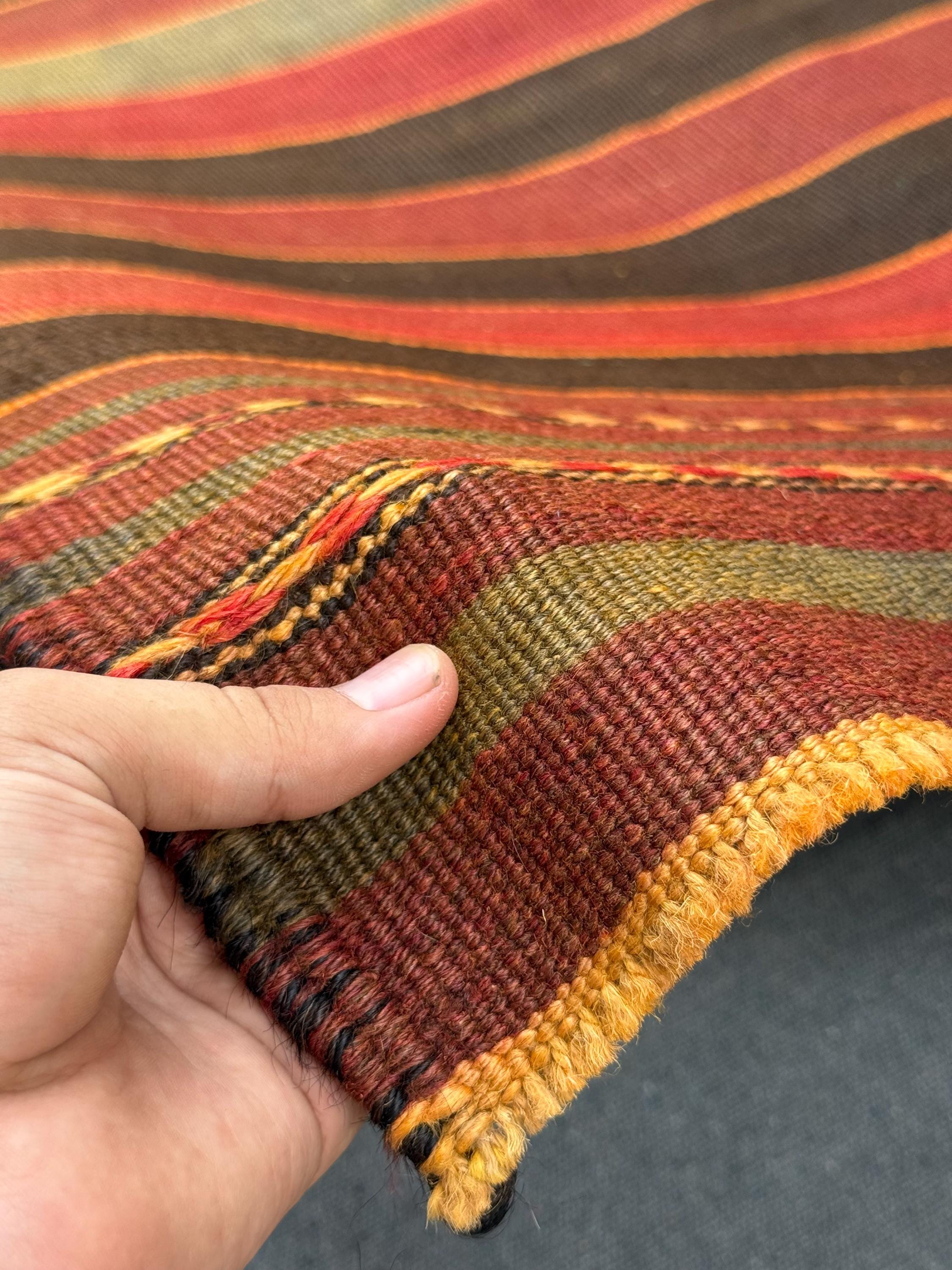 The rug features traditional horizontal stripe patterns in earthy tones of red, brown, orange, and green, creating a warm and rustic look that complements bohemian, farmhouse, and modern interiors alike. Its long size makes it an ideal hallway runner, entryway rug, or accent piece in living areas.
