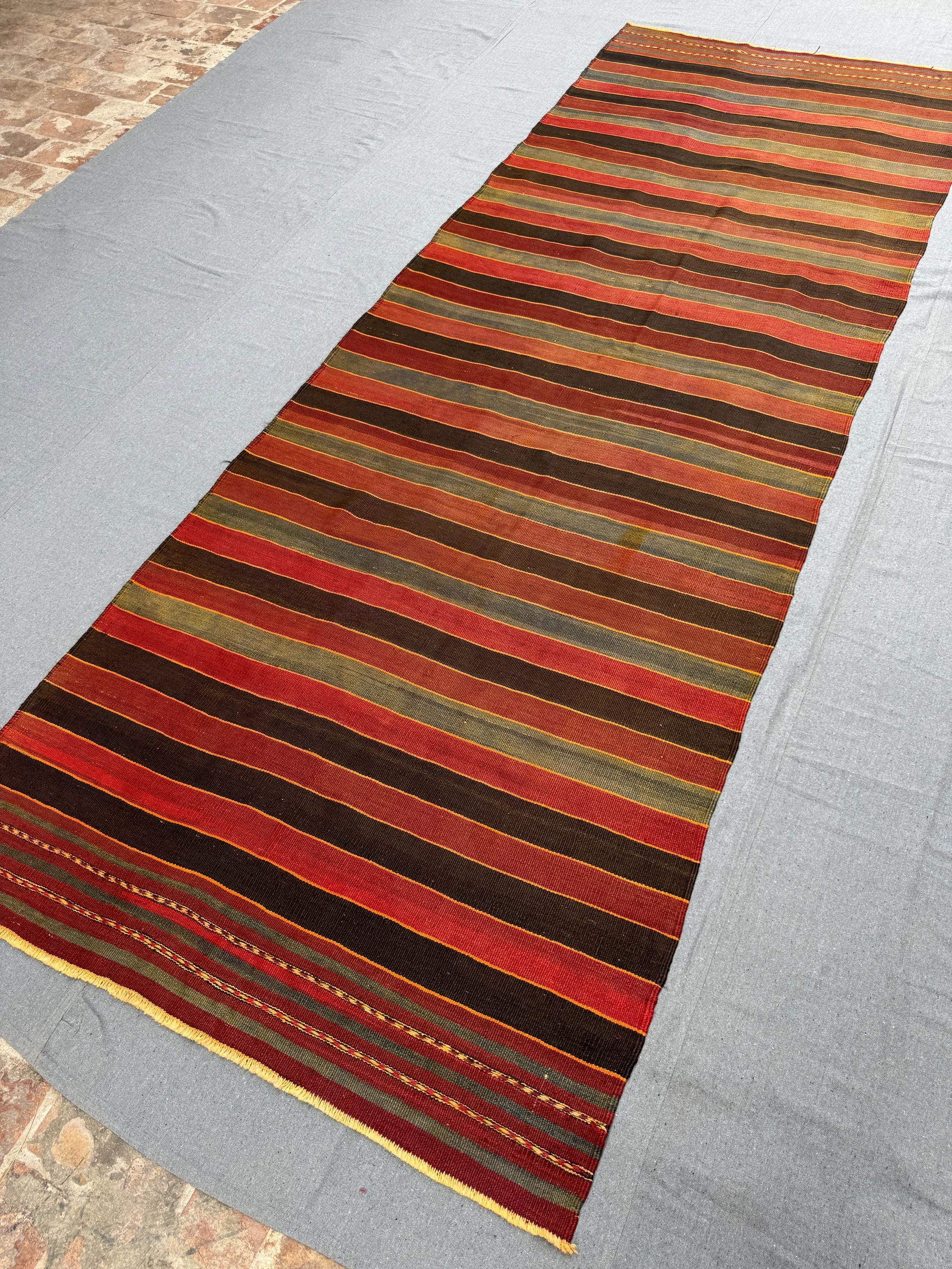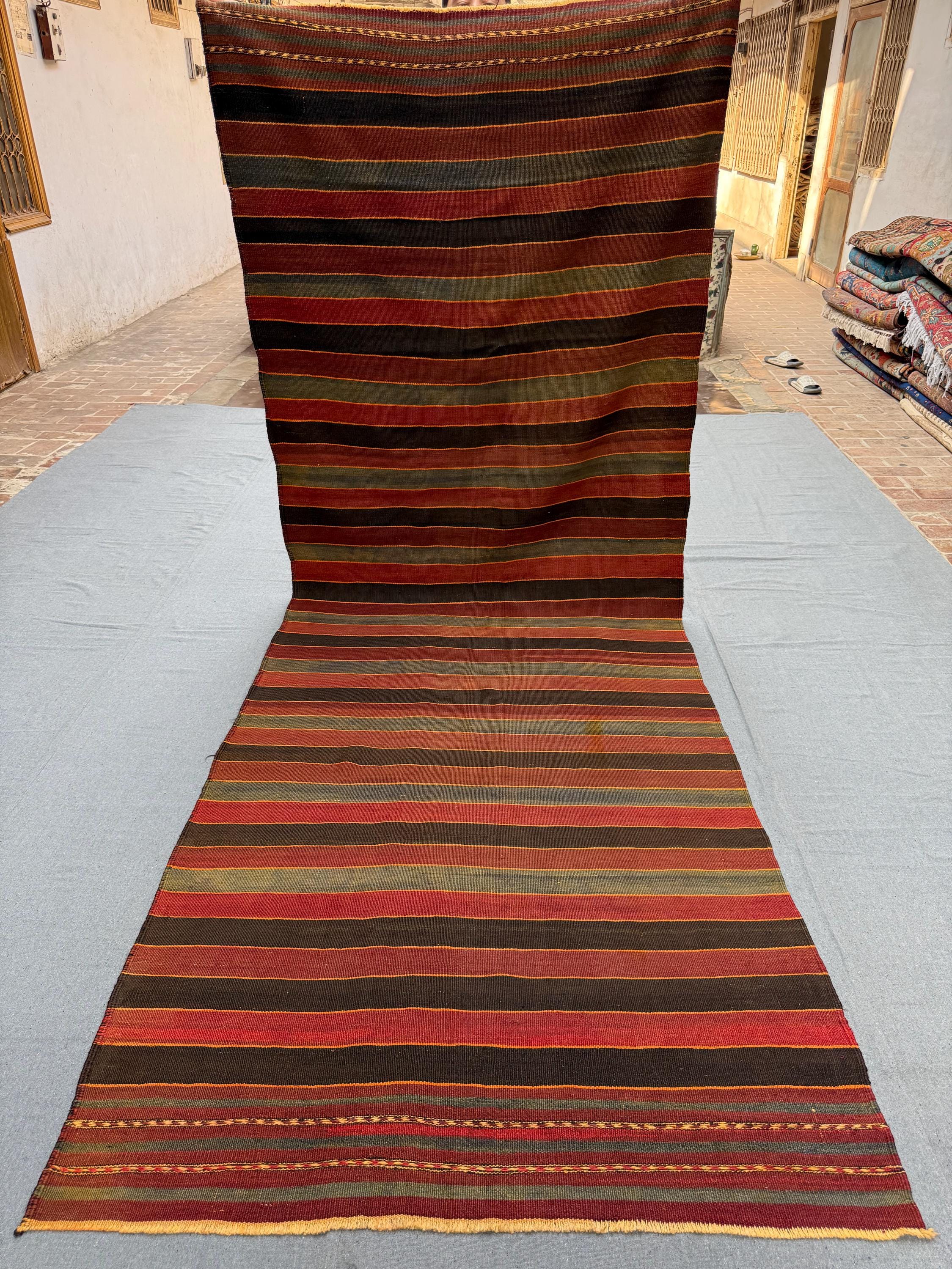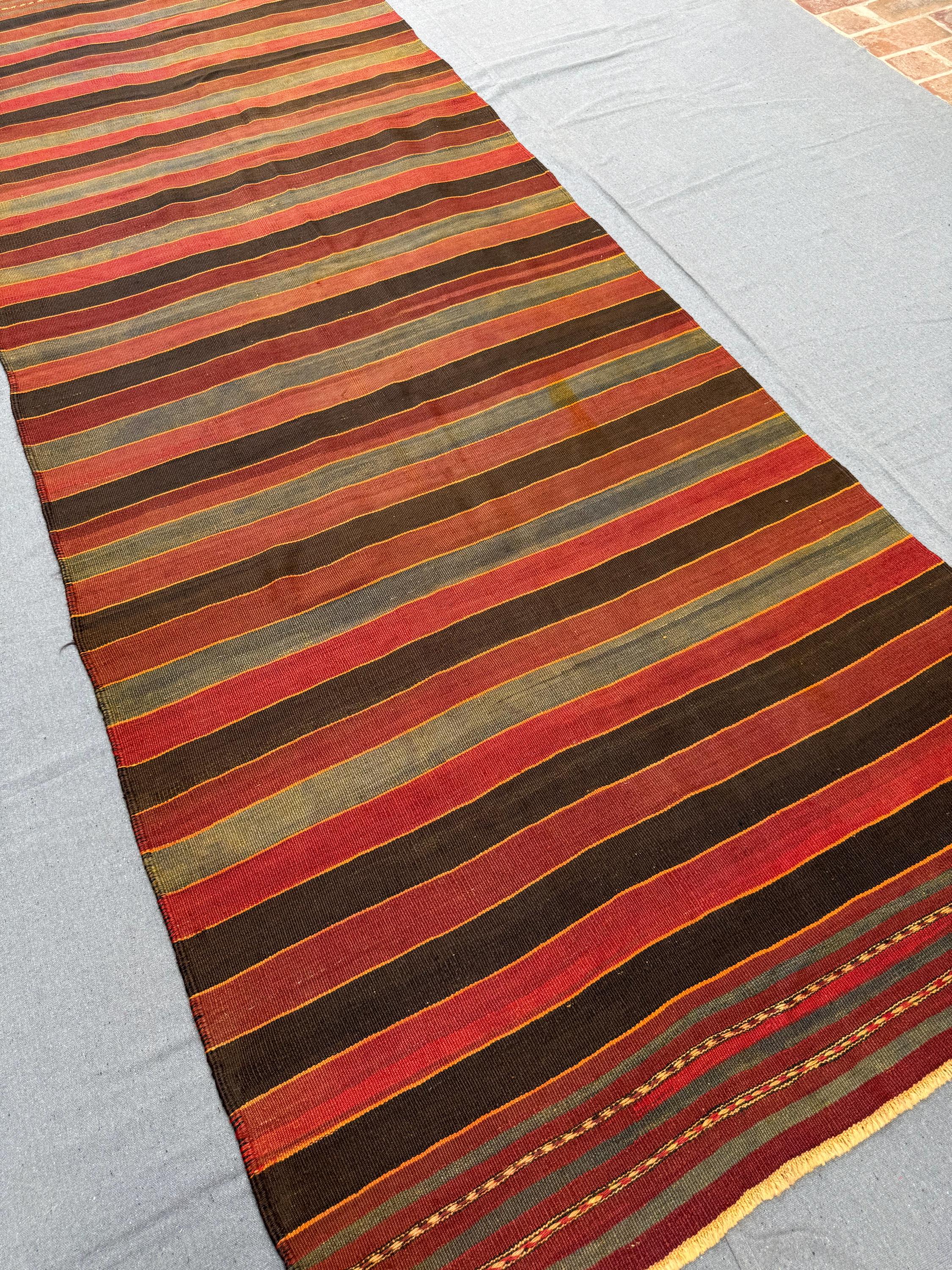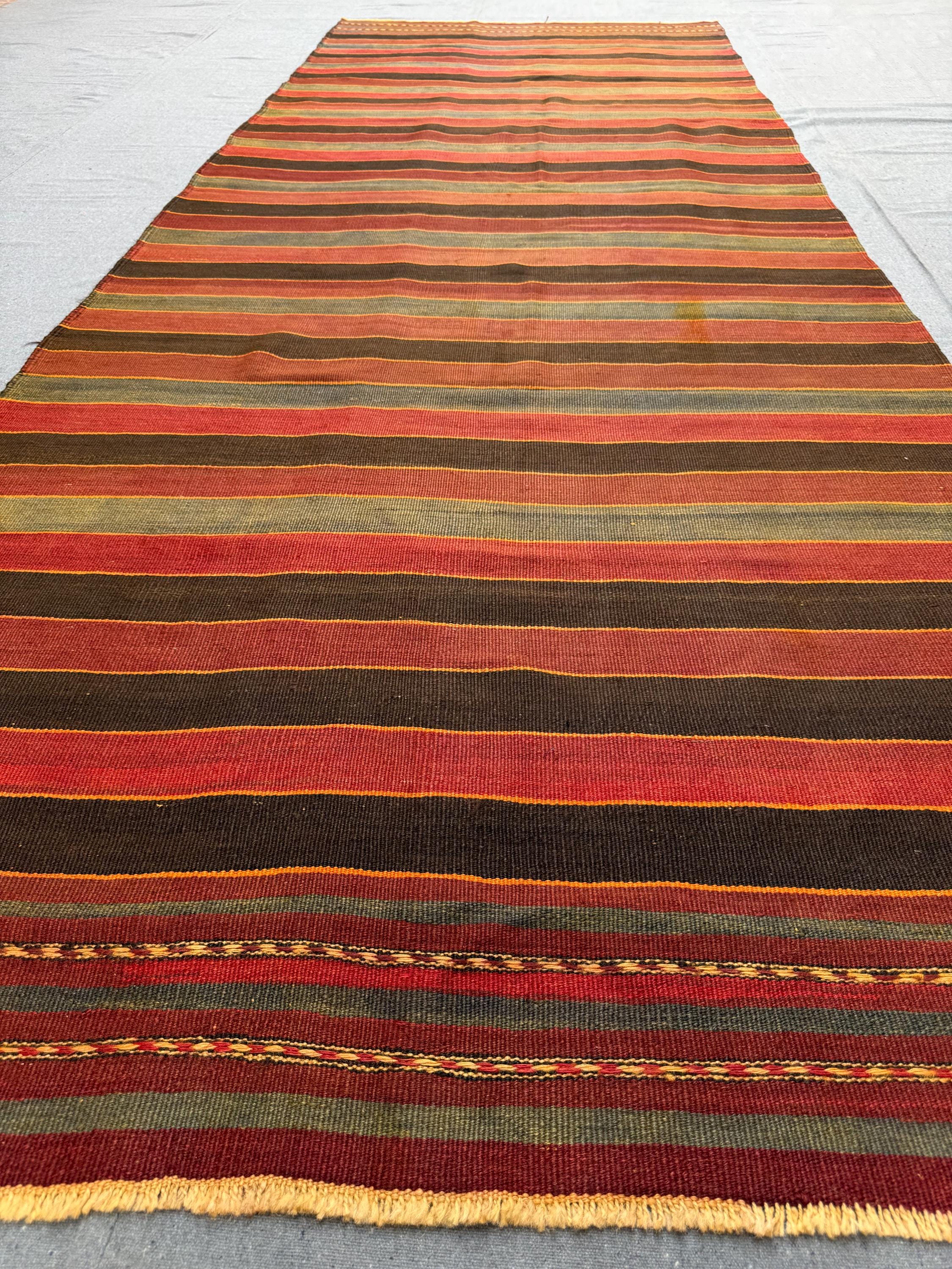 Handwoven Afghan Kilim Rug Runner: 4.2x11.6 ft, Red & Brown Wool Flatweave