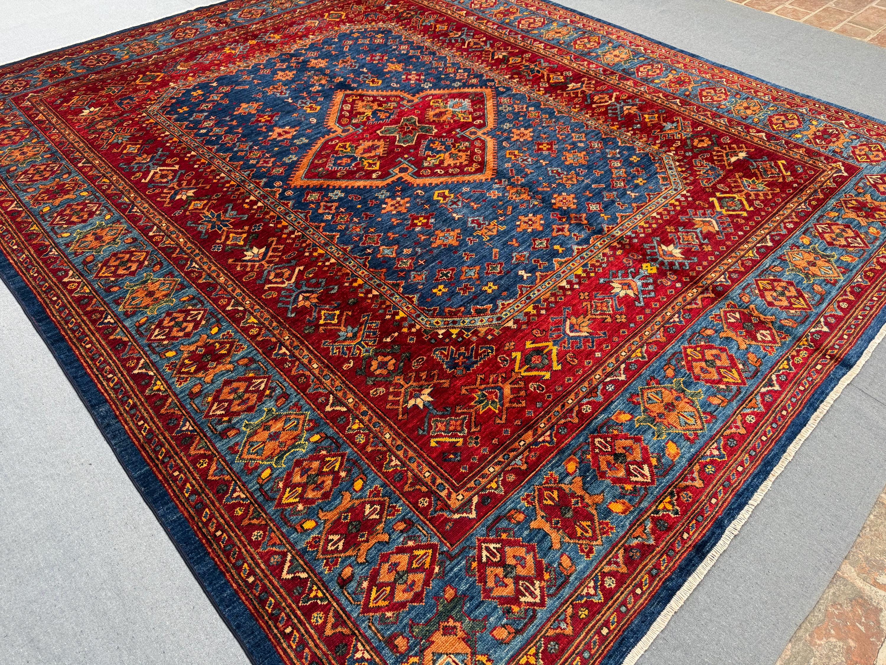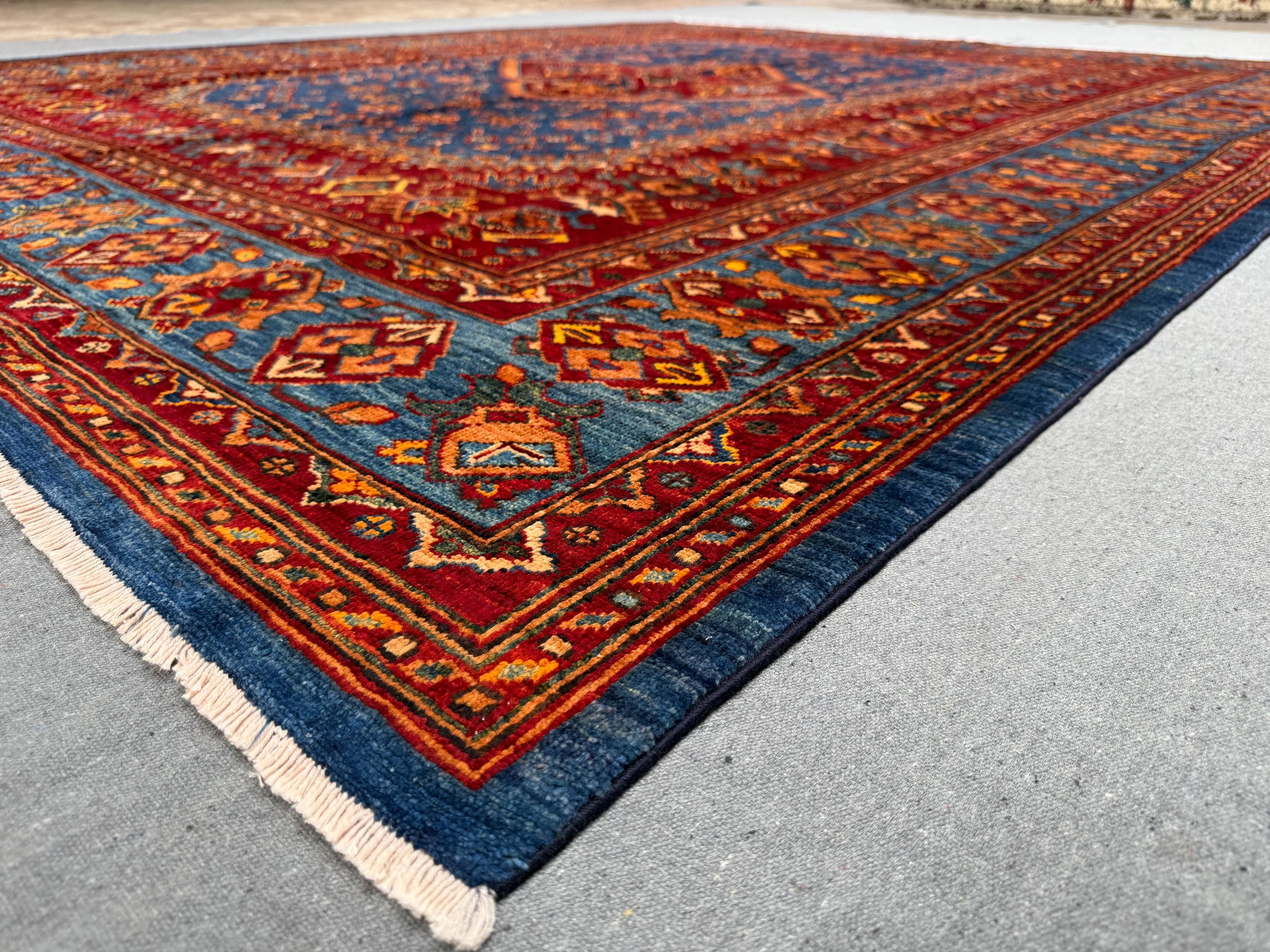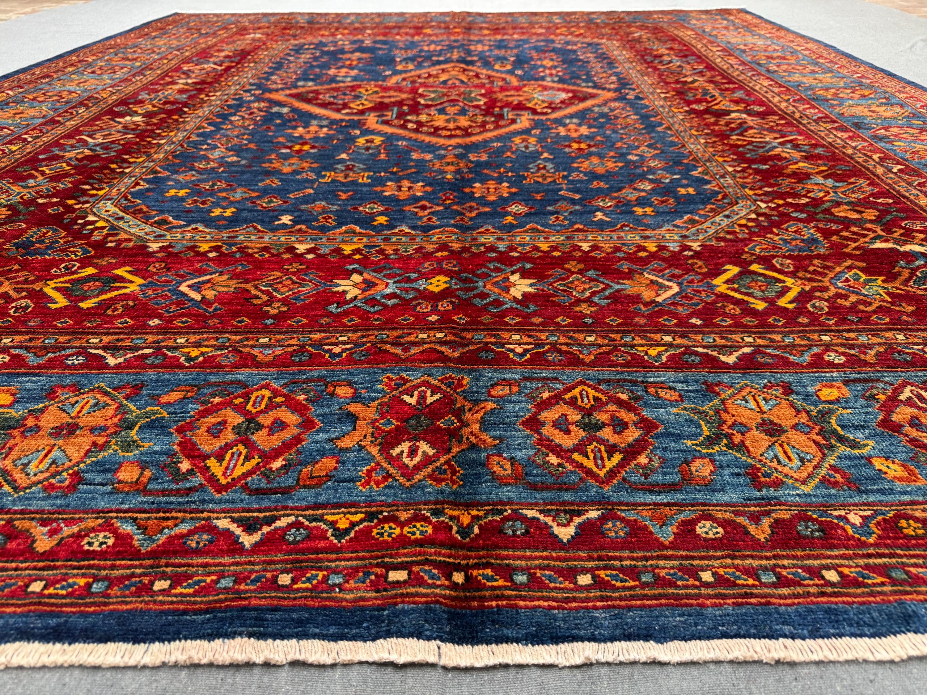 Handmade Heriz Wool Rug 8x10 ft Blue Red Geometric Oriental Area Rug Traditional Medallion Design Large Carpet