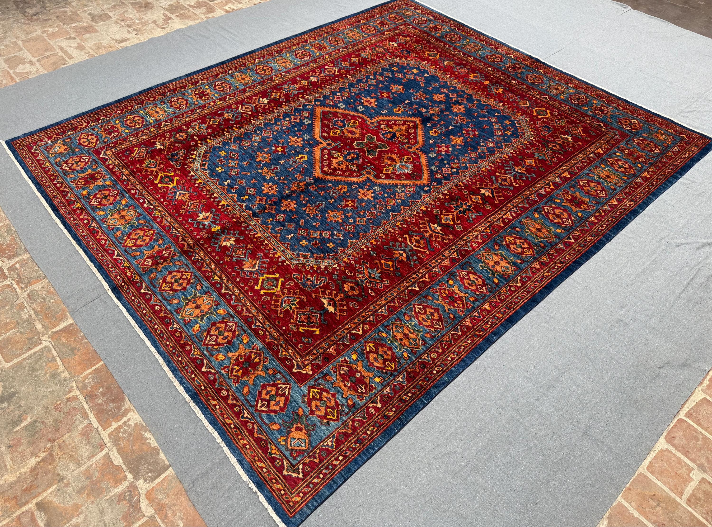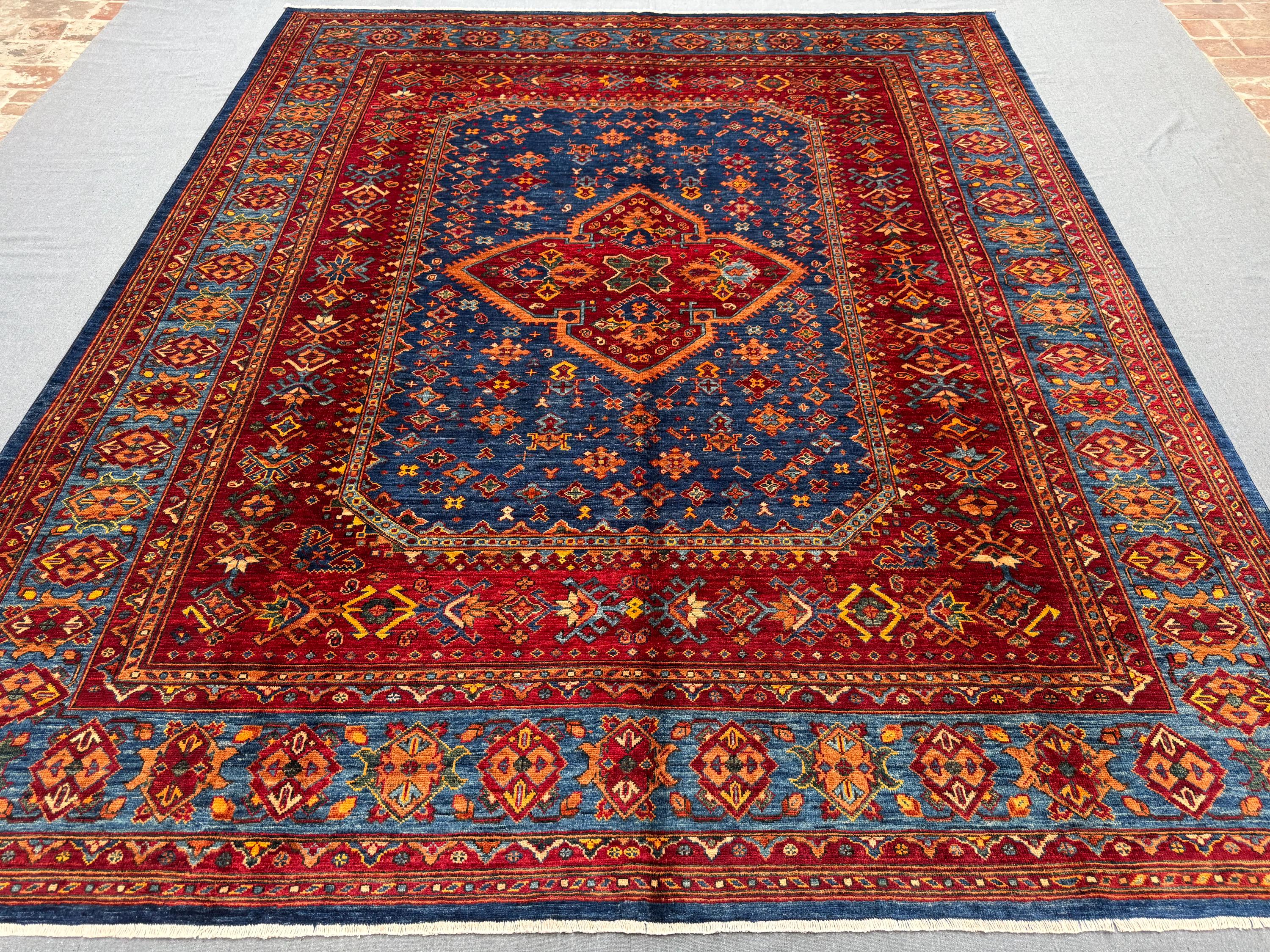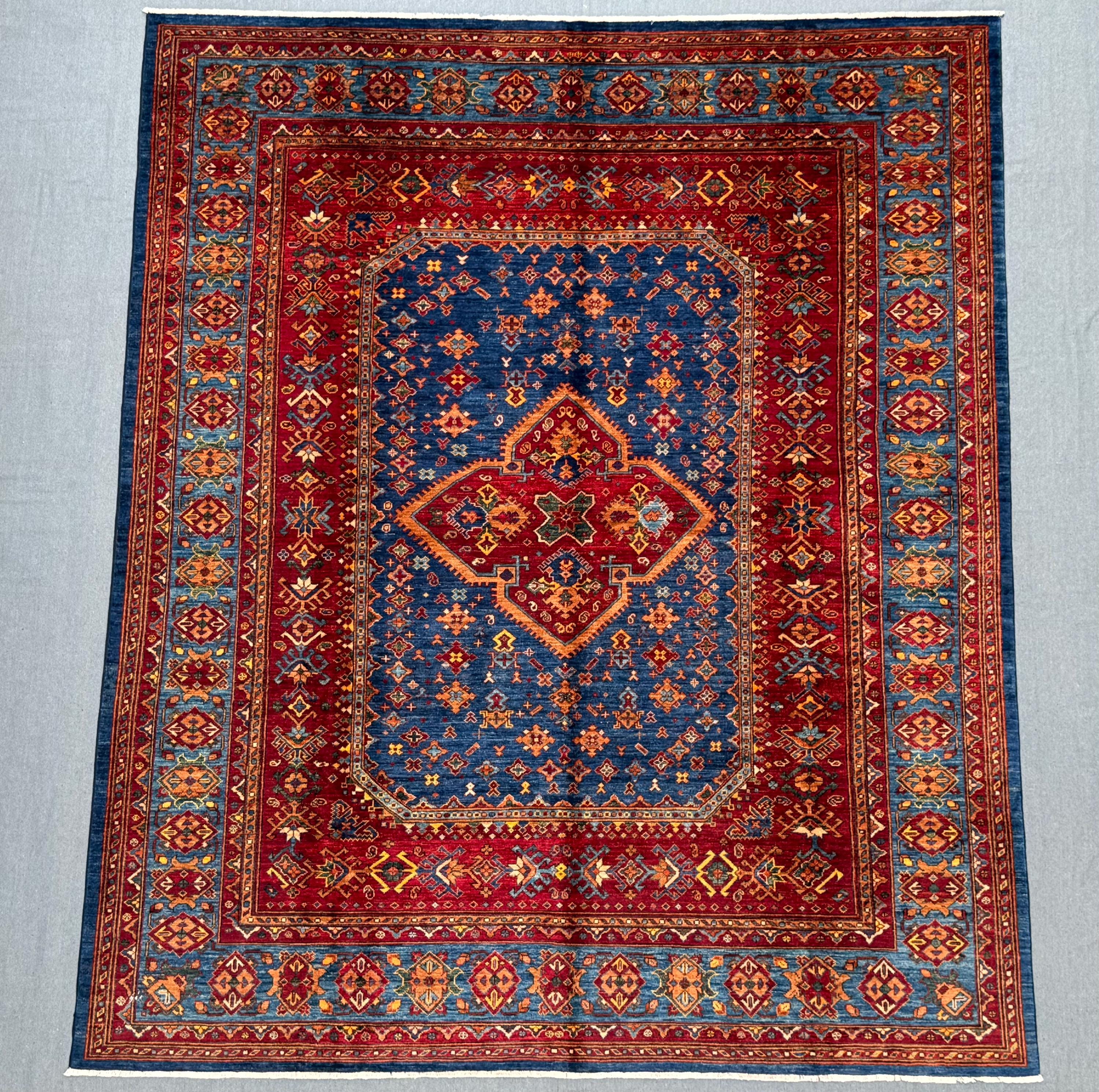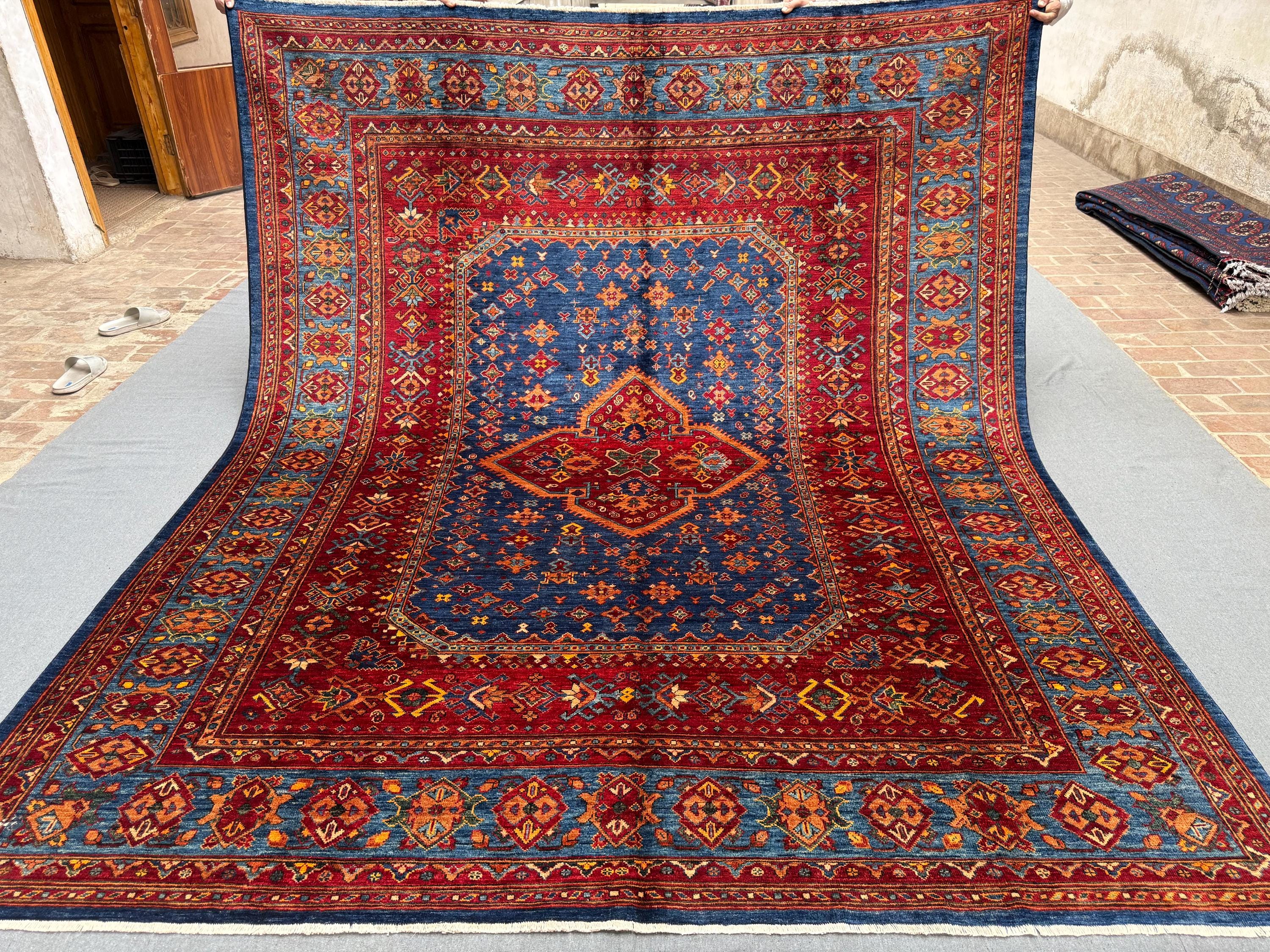 Handmade Heriz Wool Rug 8x10 ft Blue Red Geometric Oriental Area Rug Traditional Medallion Design Large Carpet