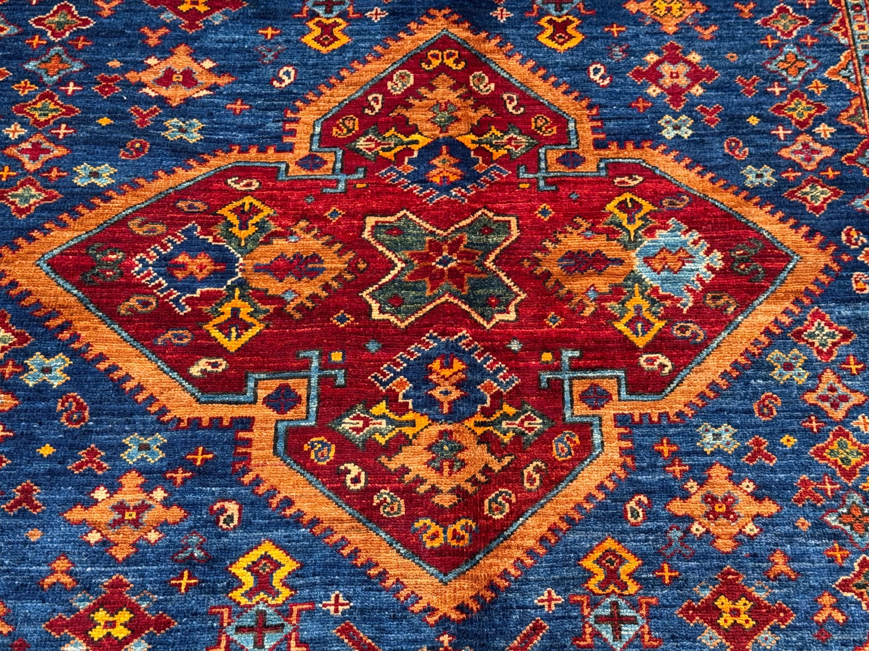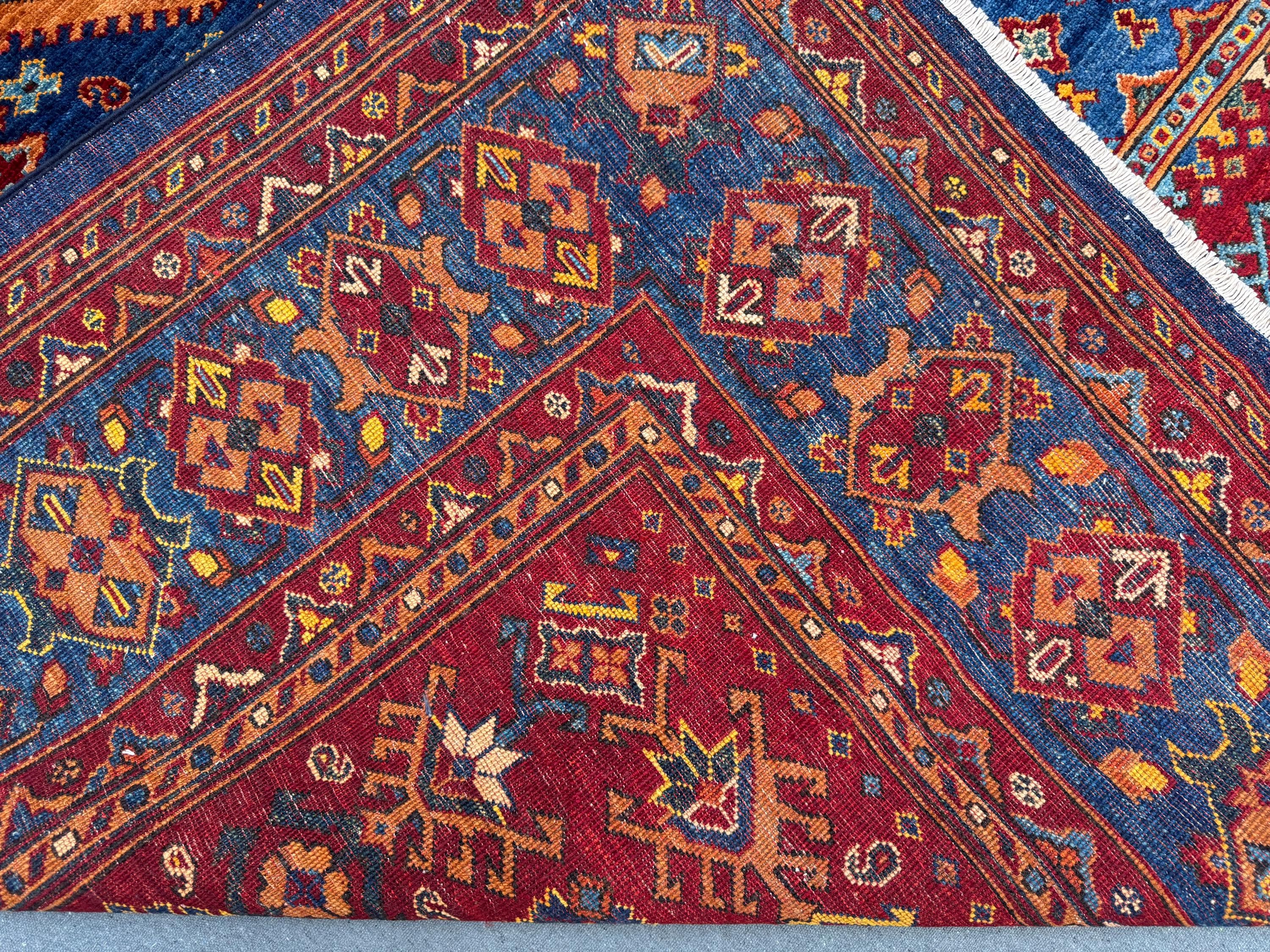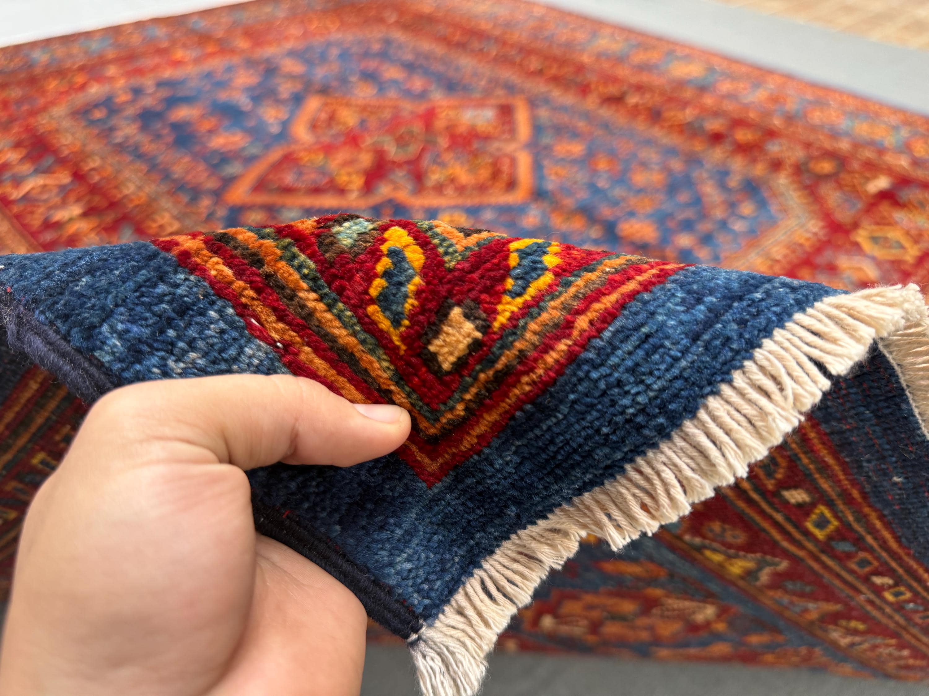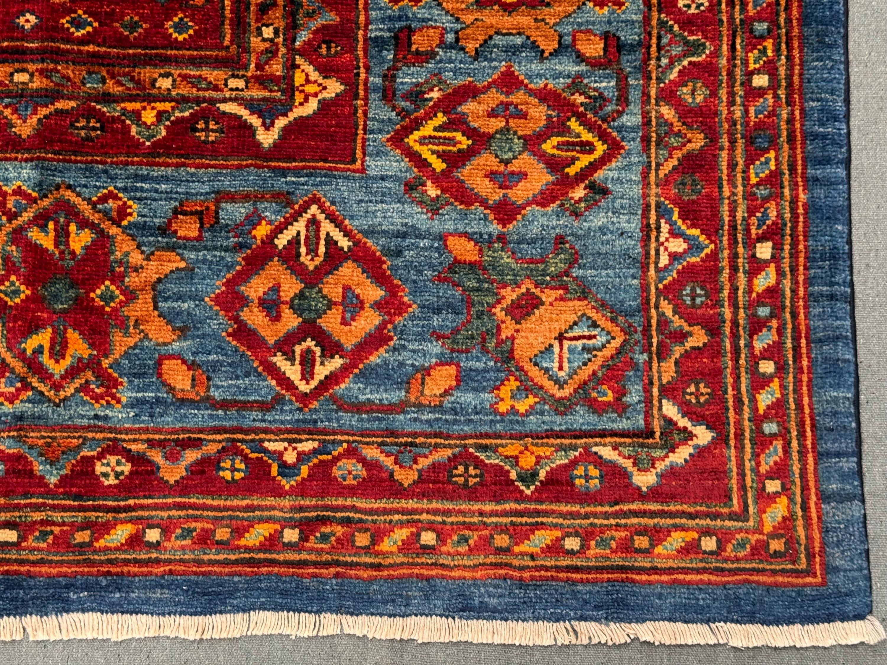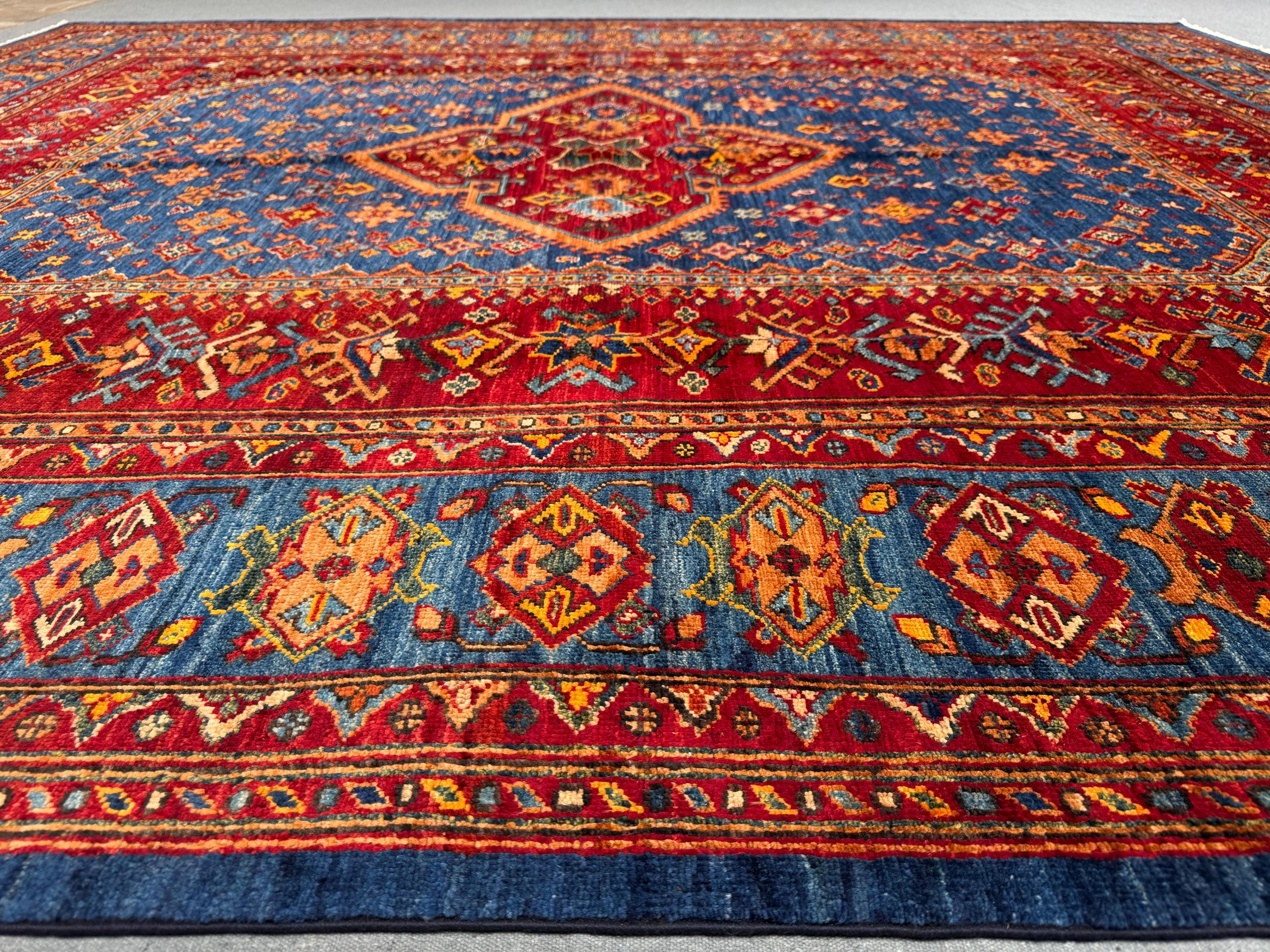 Add bold character and timeless elegance to your space with this handmade Heriz wool rug, featuring a striking deep blue field centered around a powerful geometric medallion. The design is framed by a rich red border filled with intricate tribal and geometric motifs, creating strong contrast and visual balance.