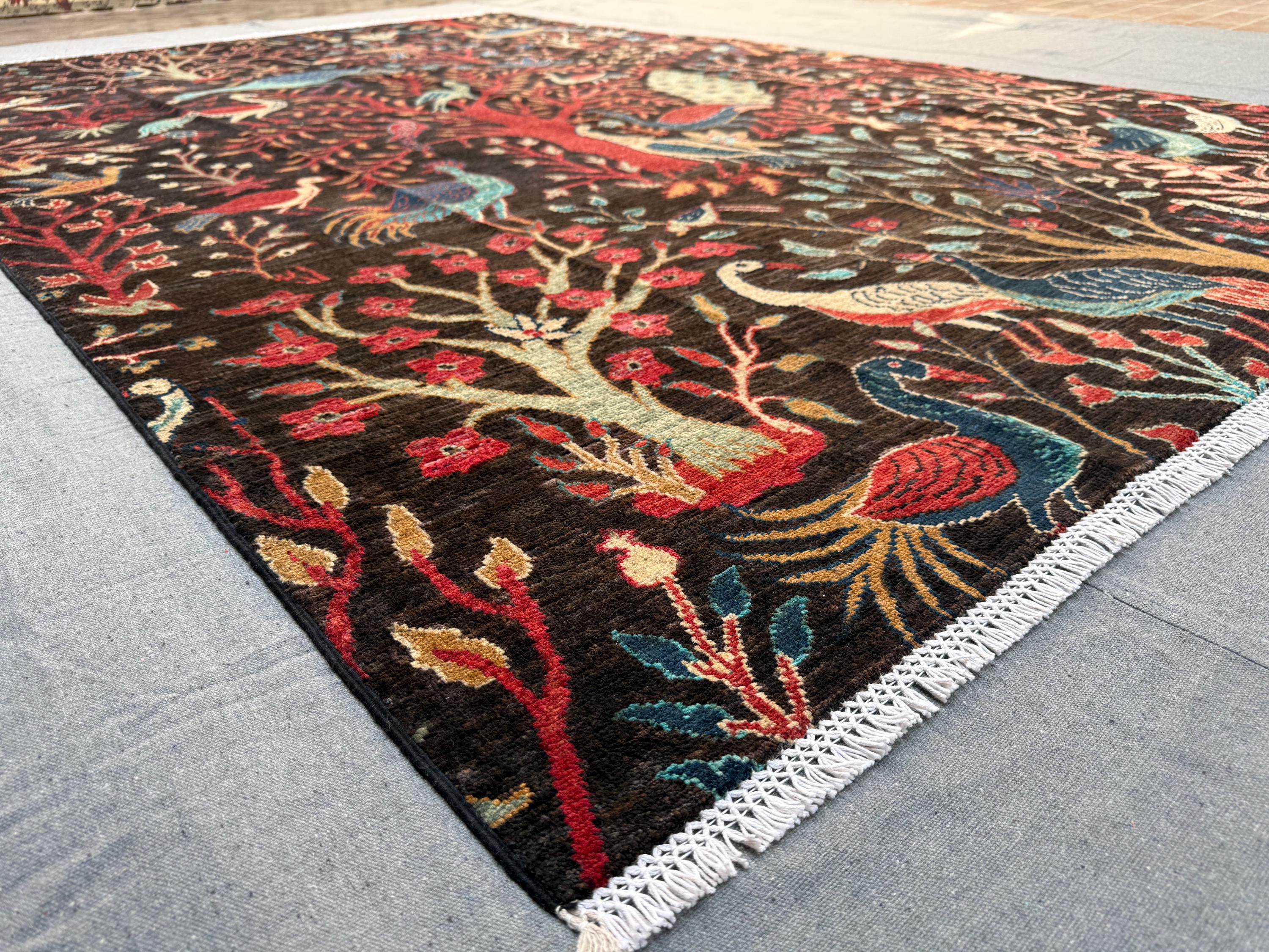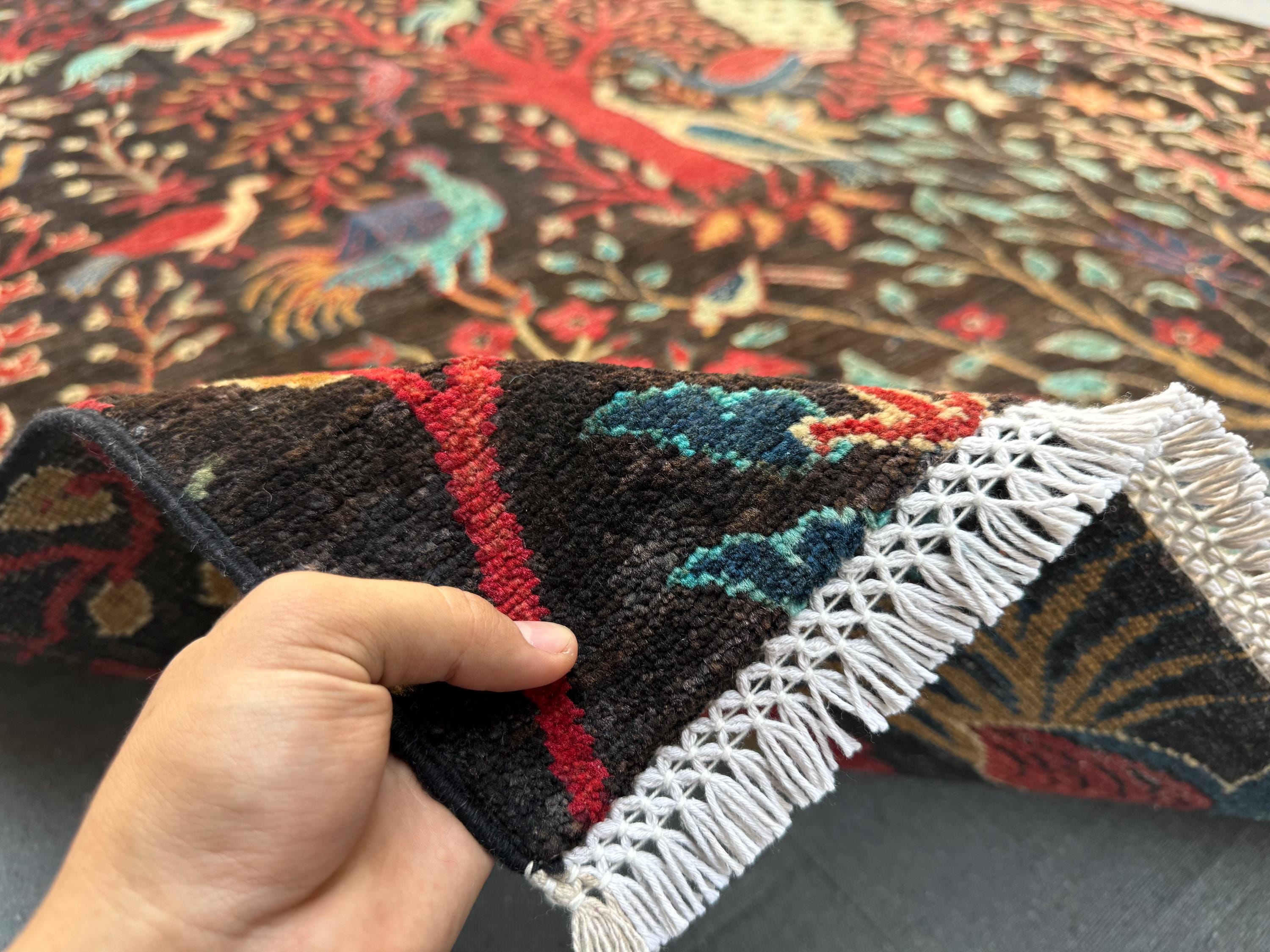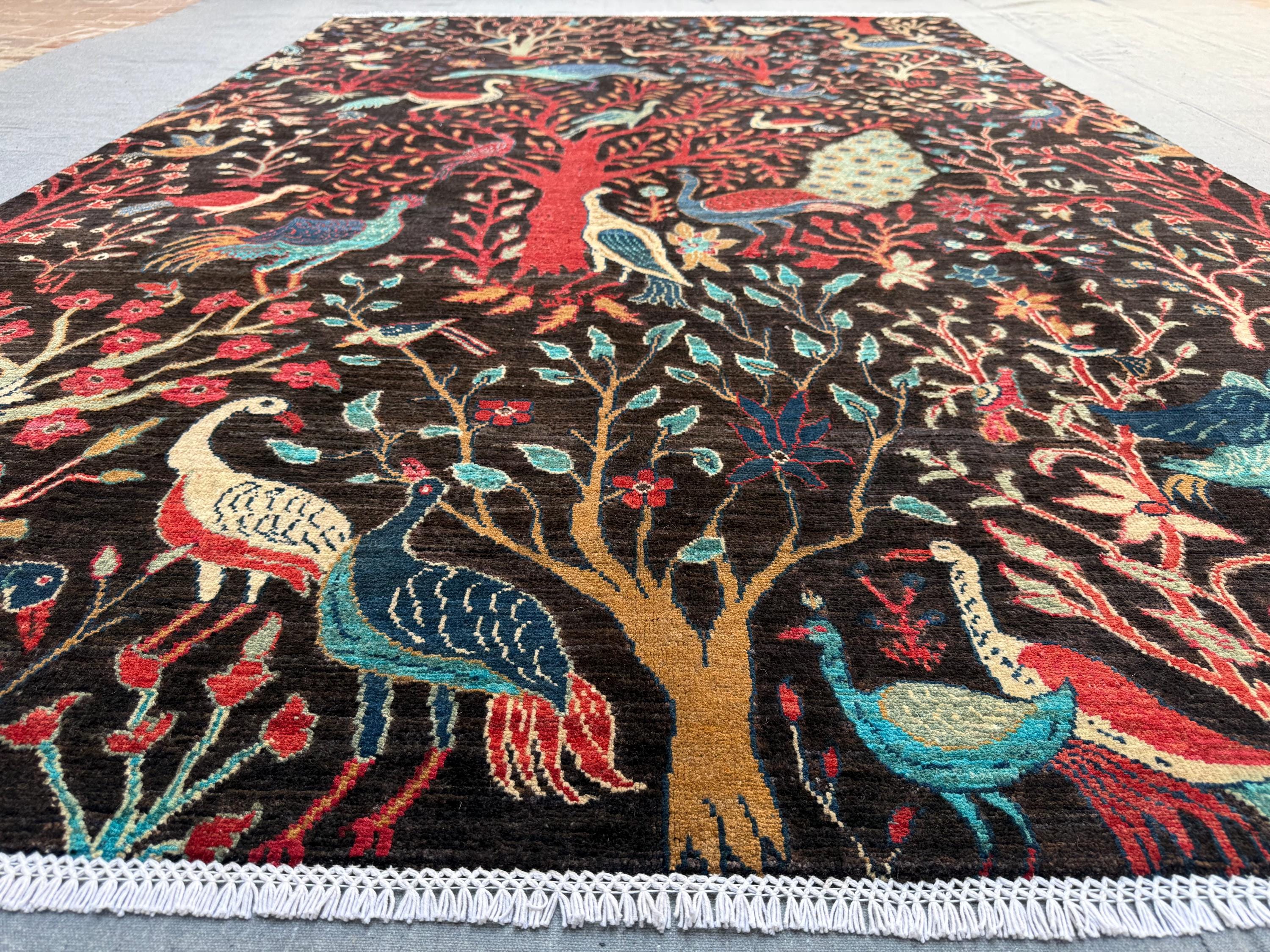 Every detail—birds in mid-flight, perched peacocks, flowering branches, and wildlife figures—is hand-knotted with exceptional precision. The wool pile is soft yet durable, making it suitable for both decorative display and everyday use. Shekargah rugs are known for their narrative patterns, making each one a unique collectible piece.