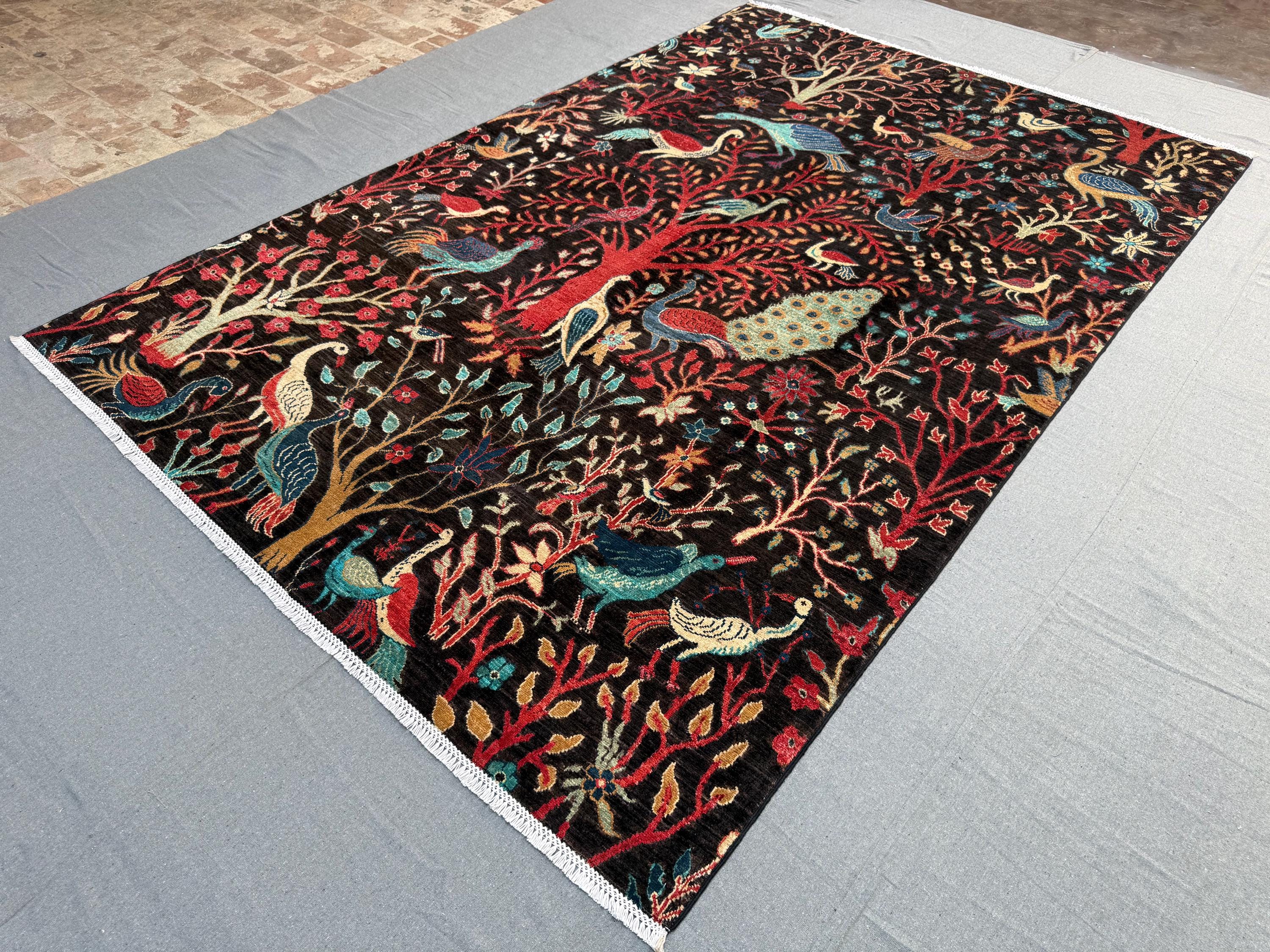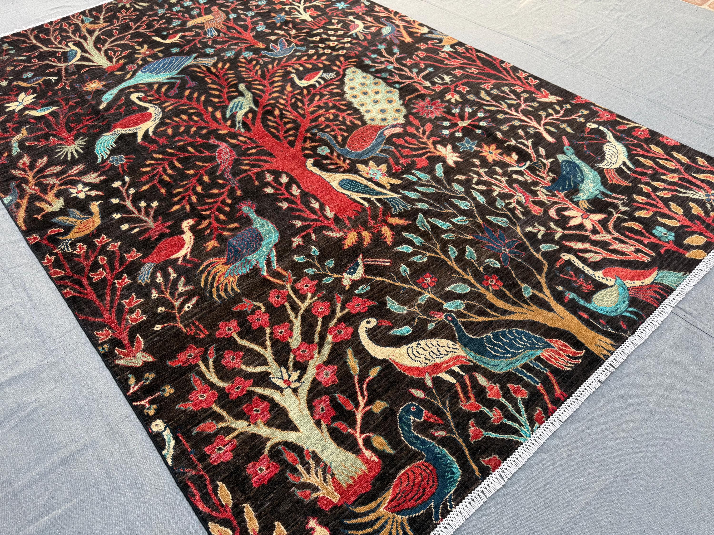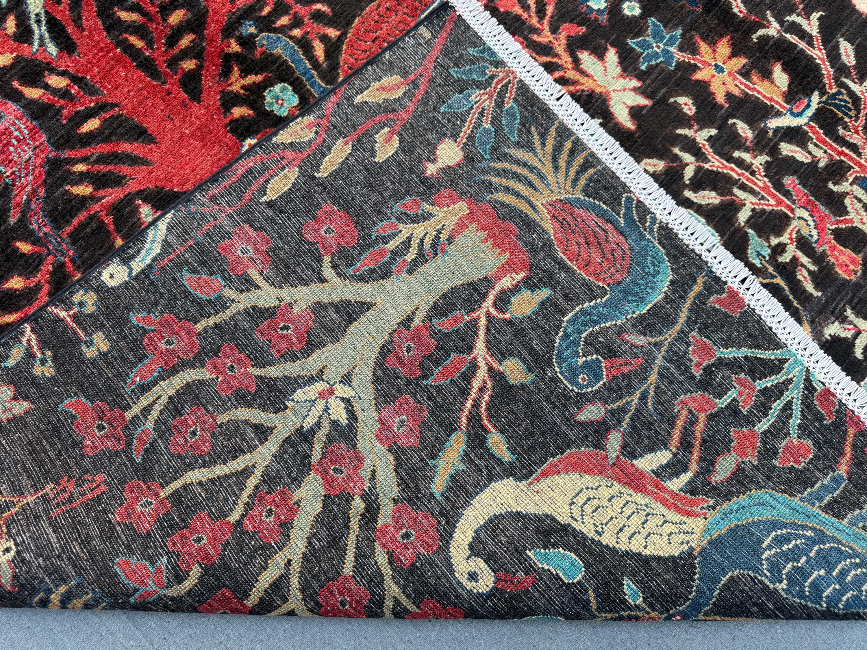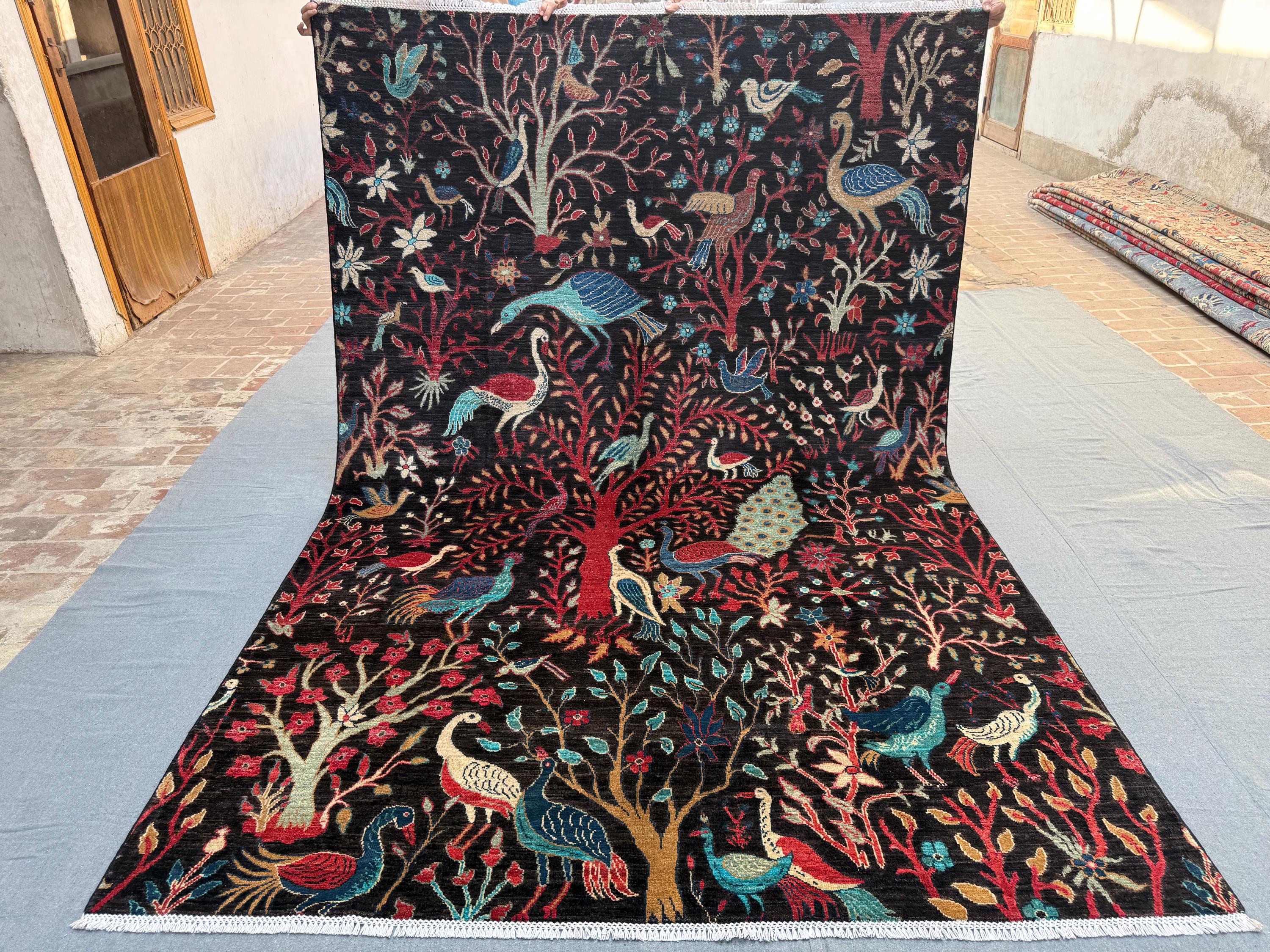 Every detail—birds in mid-flight, perched peacocks, flowering branches, and wildlife figures—is hand-knotted with exceptional precision. The wool pile is soft yet durable, making it suitable for both decorative display and everyday use. Shekargah rugs are known for their narrative patterns, making each one a unique collectible piece.