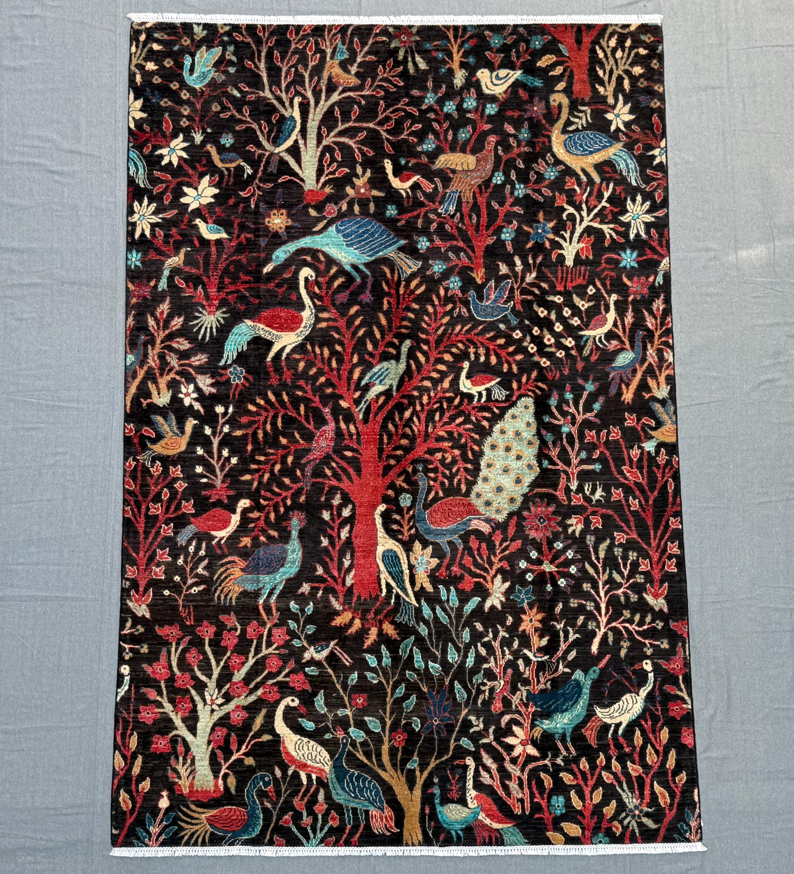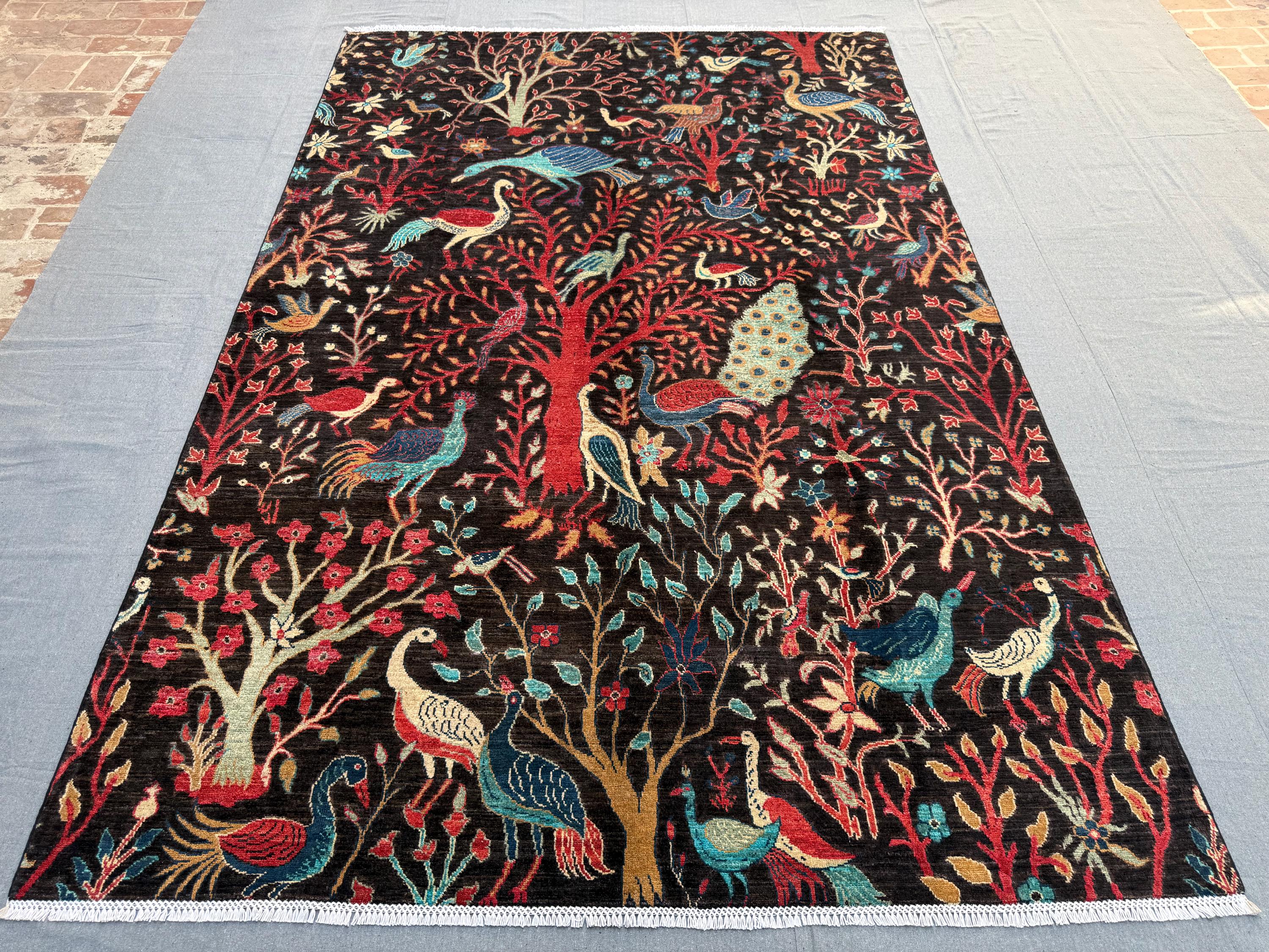Hunting Scene Shekargah Rug 6x10 ft Handmade Wool Art Carpet, Black Multicolor Animal & Nature Design Area Rug