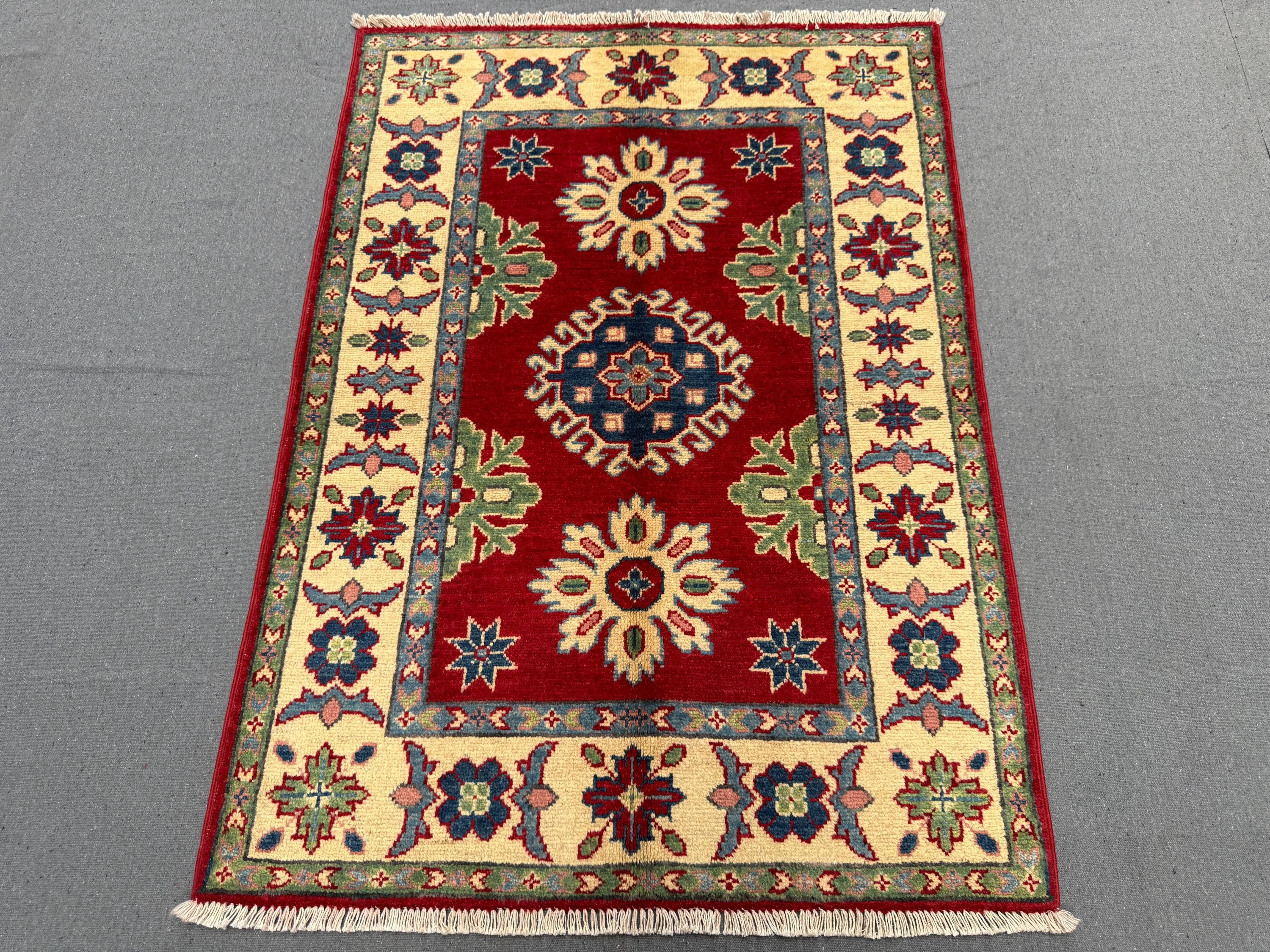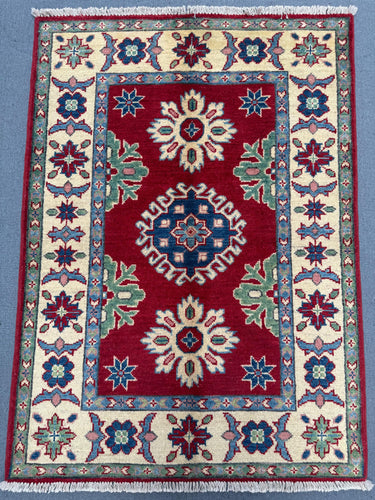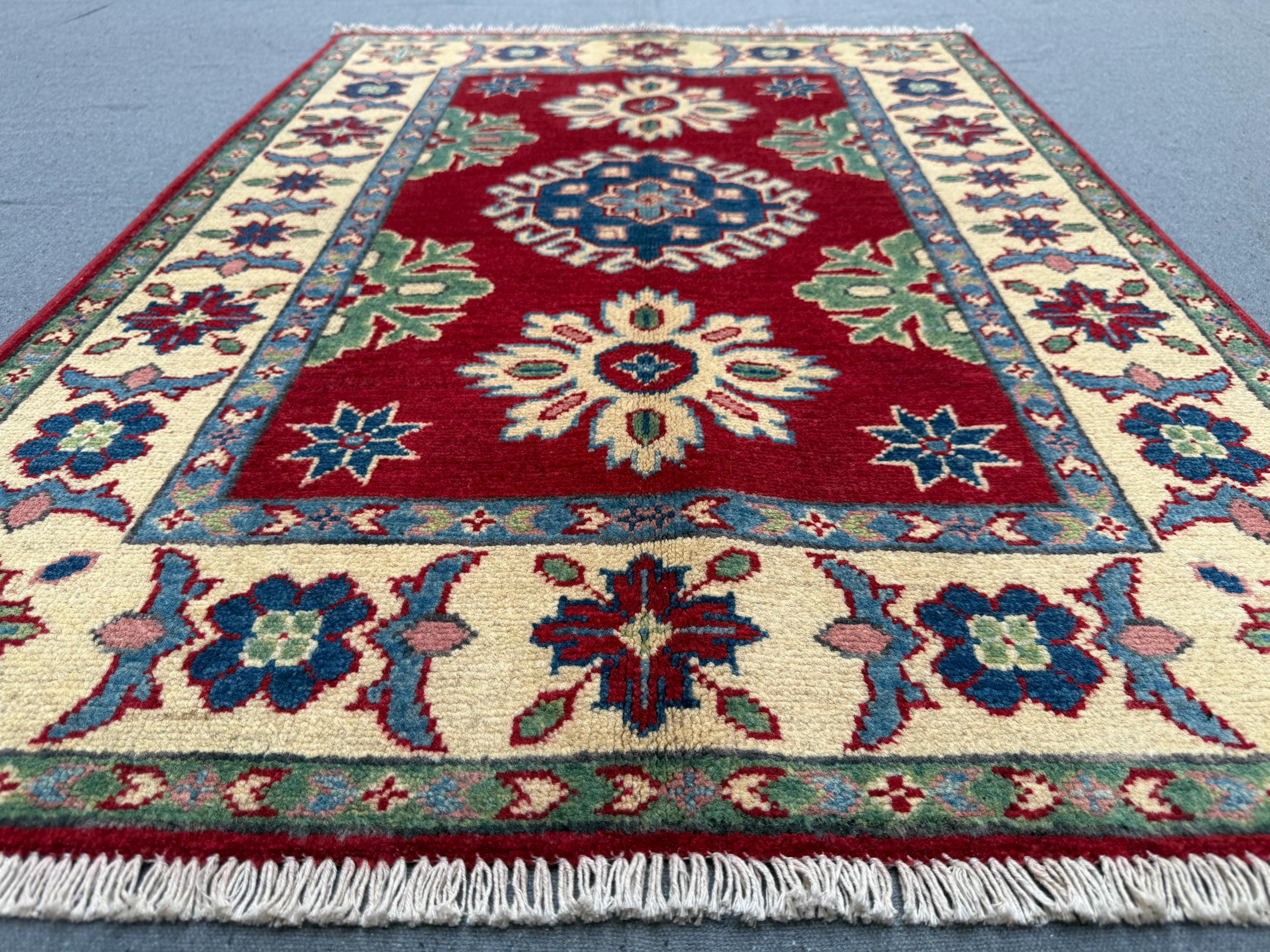 Kazak Rug 2.10x4 ft Hand-Knotted Afghan Wool Carpet, Red and Cream Tribal Wool Rug, Geometric Handmade Small Oriental Accent Decor