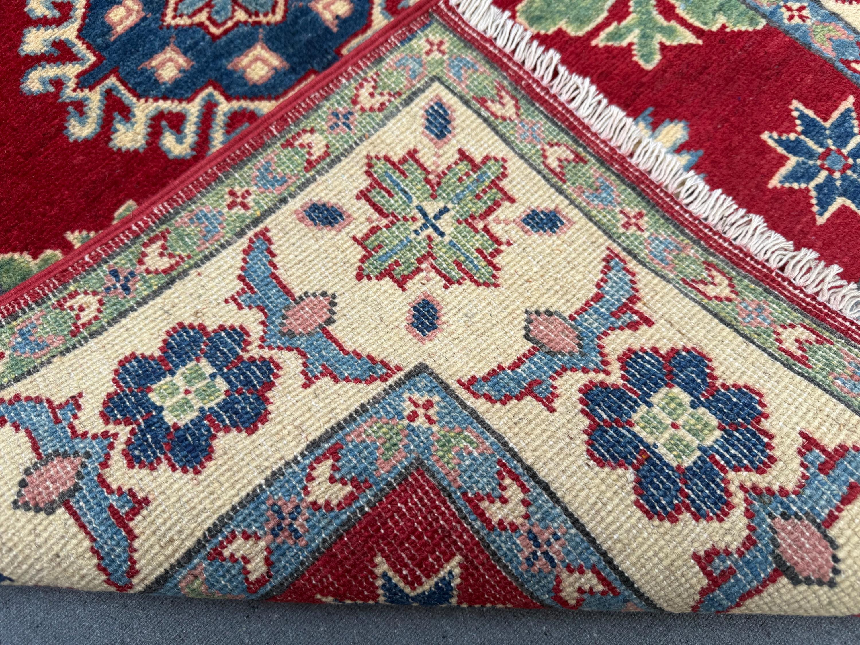 This Afghan Kazak wool rug showcases a bold red field framed with cream and green geometric borders, reflecting the artistry of traditional tribal design. Handwoven with 100% natural wool, it embodies durability, warmth, and character — ideal for homes that value both history and craftsmanship.