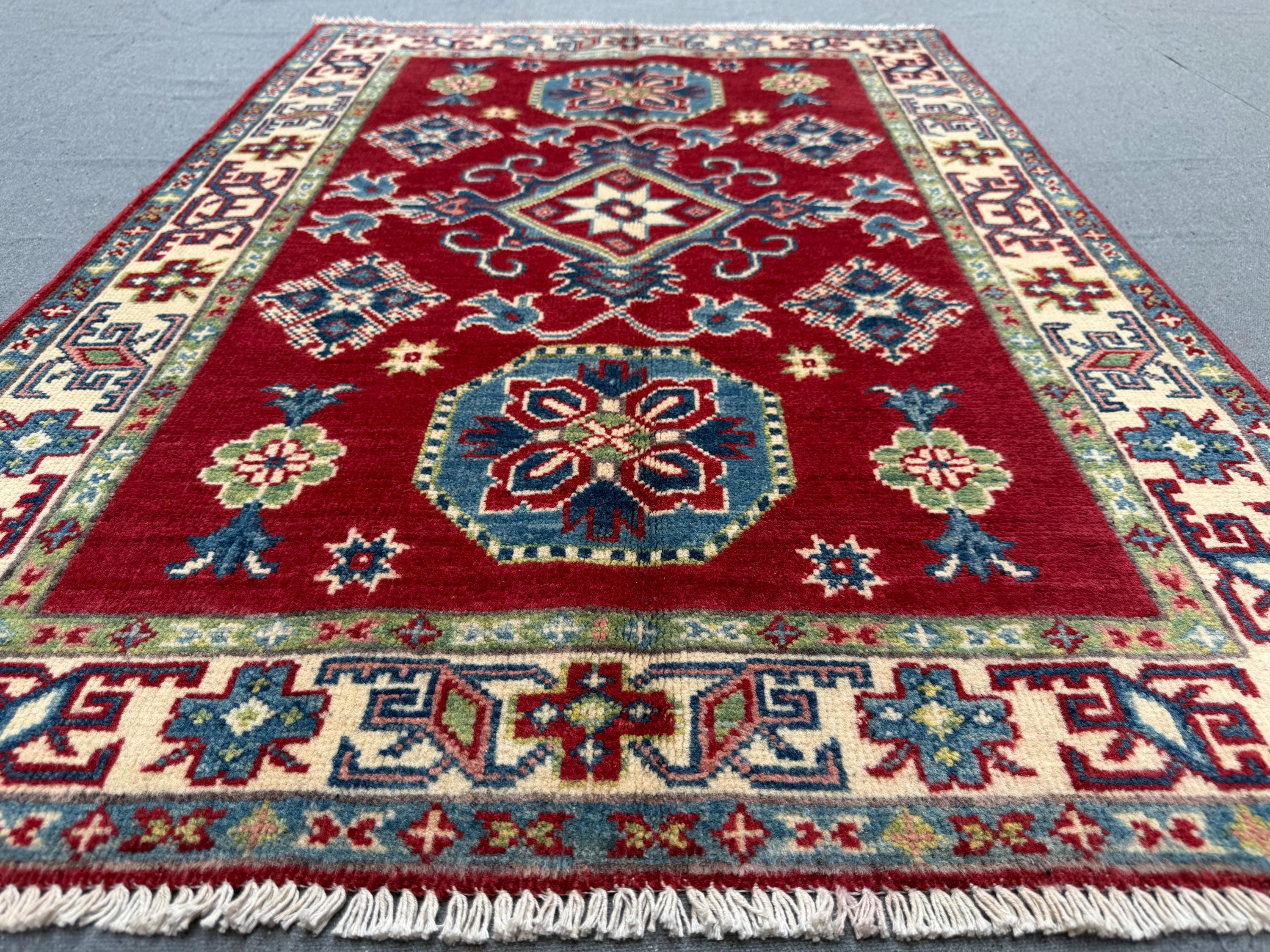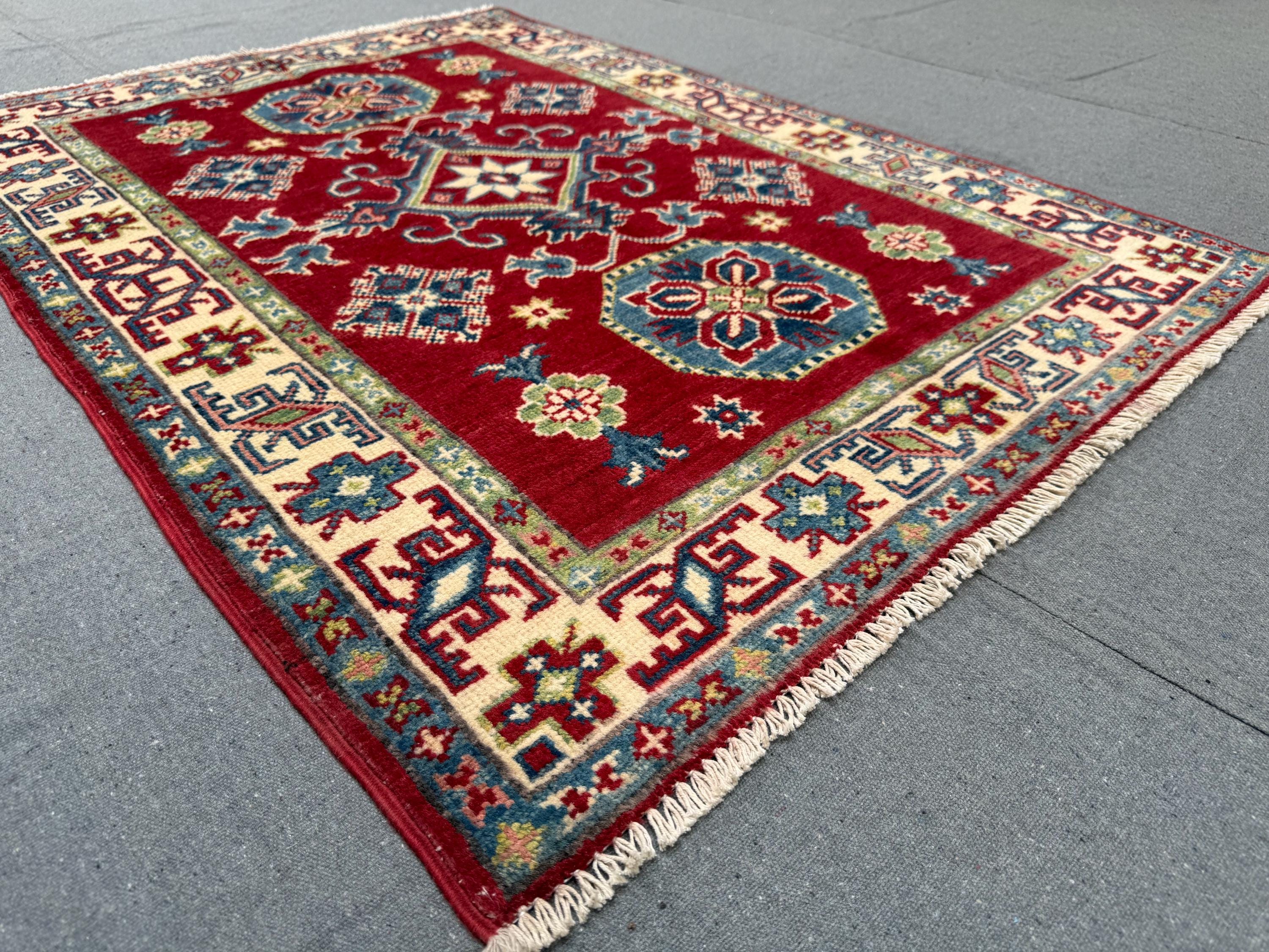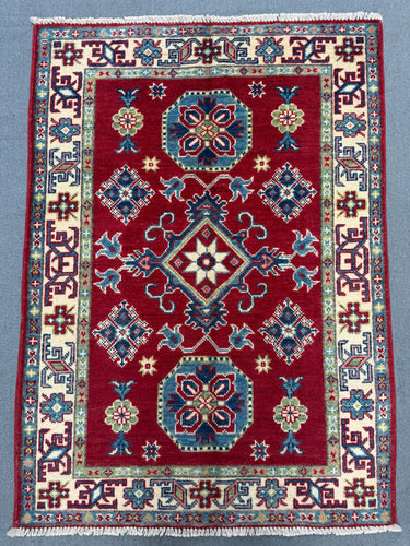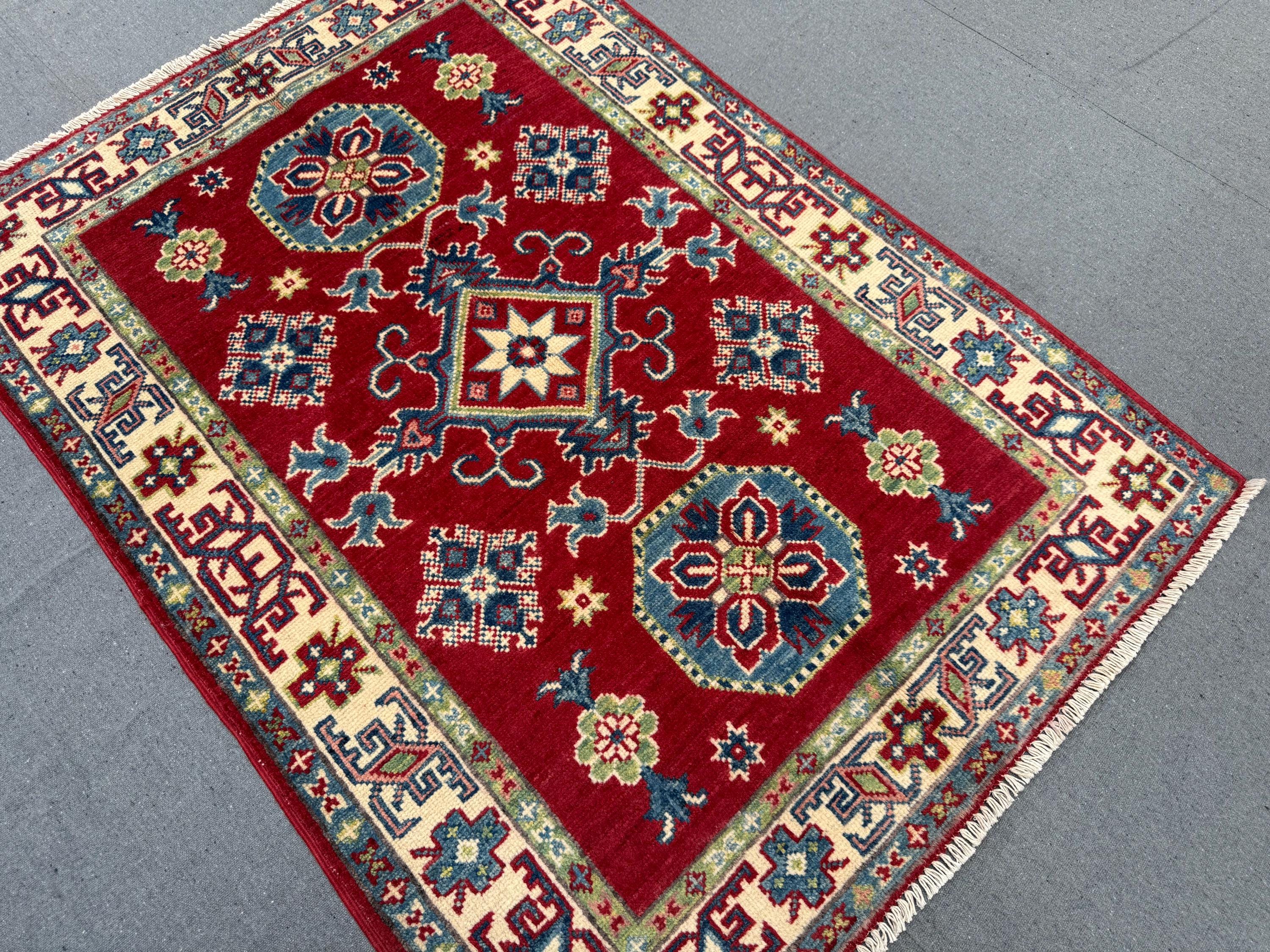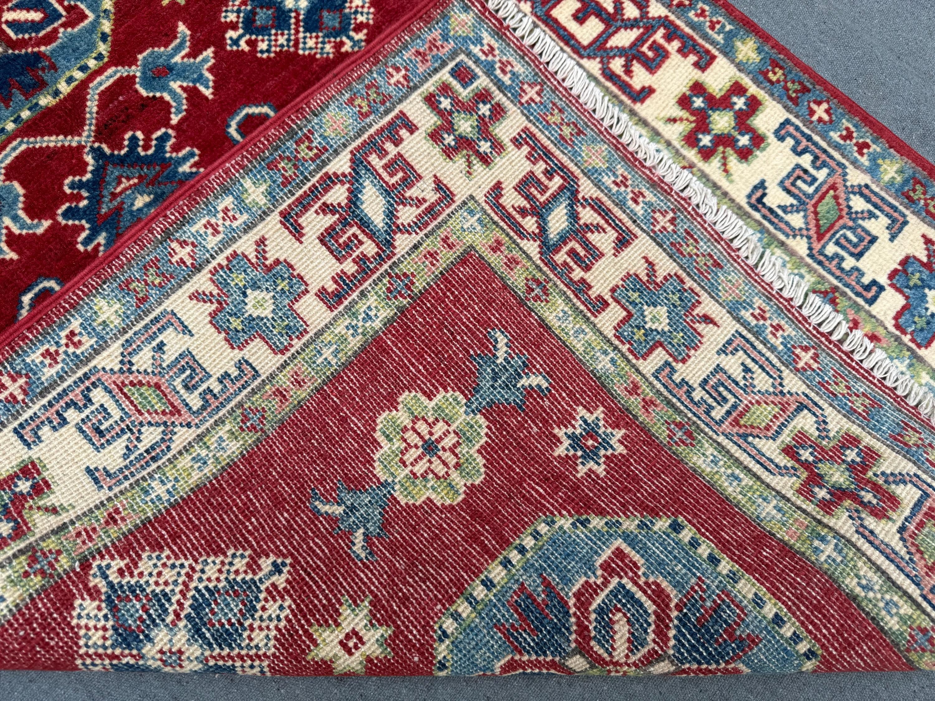 Kazak Rug 2.11x4 ft Hand-Knotted Afghan Wool Carpet, Red and Blue Geometric Wool Area Rug, Small Tribal Handmade Oriental Accent Decor