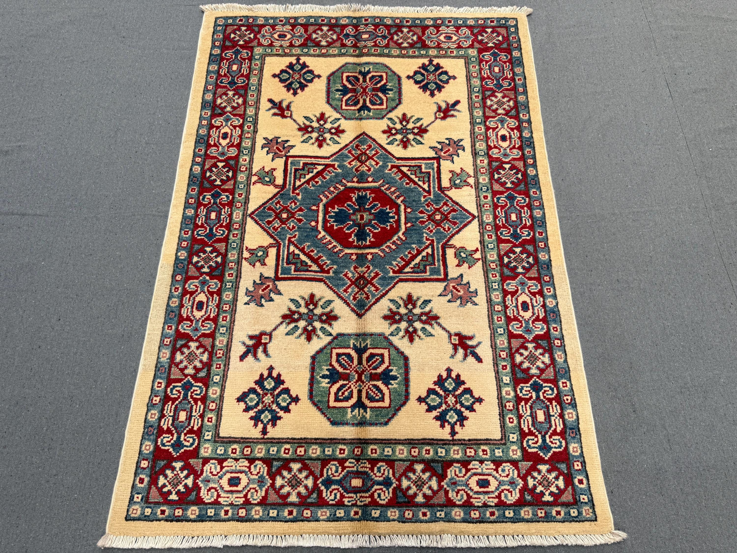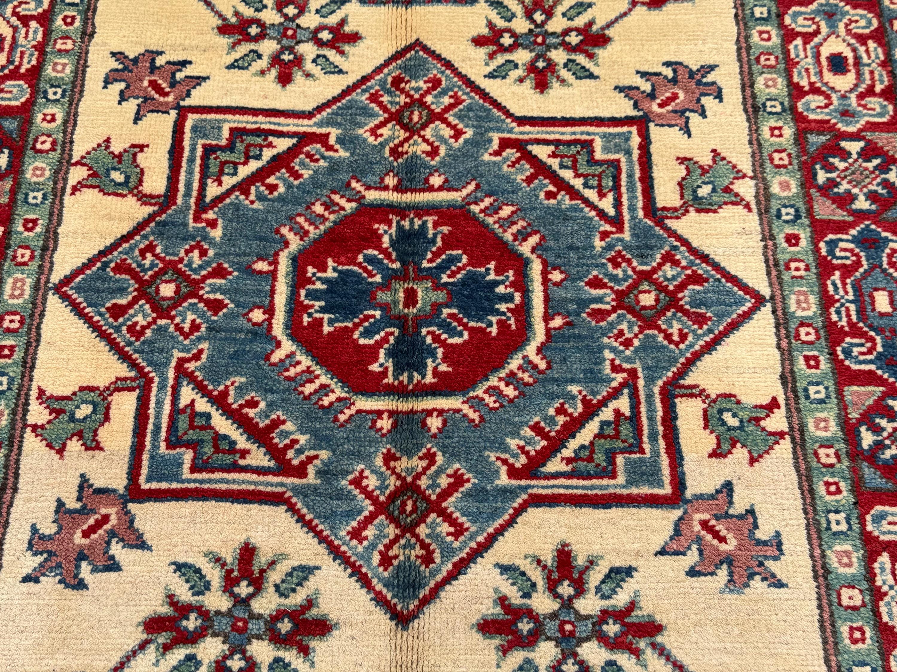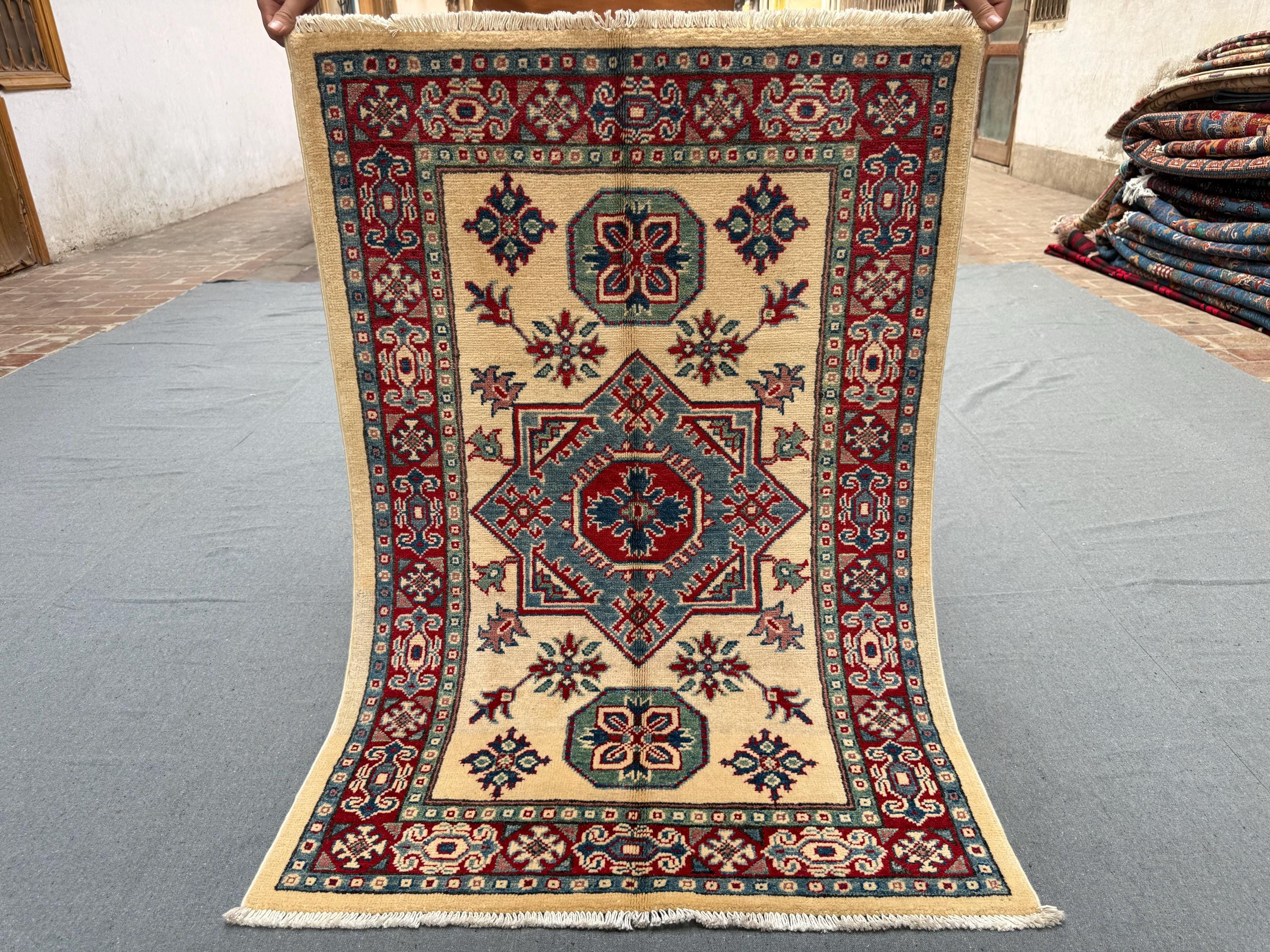 Kazak Rug 2.9x4.1 ft Hand-Knotted Afghan Wool Carpet, Cream and Red Geometric Rug, Small Handmade Wool Area Rug, Tribal Oriental Decor