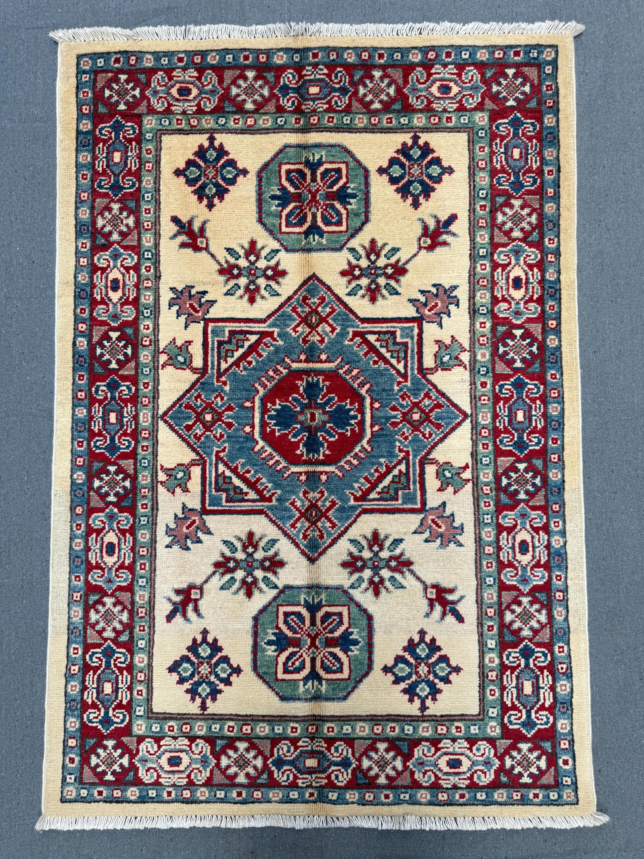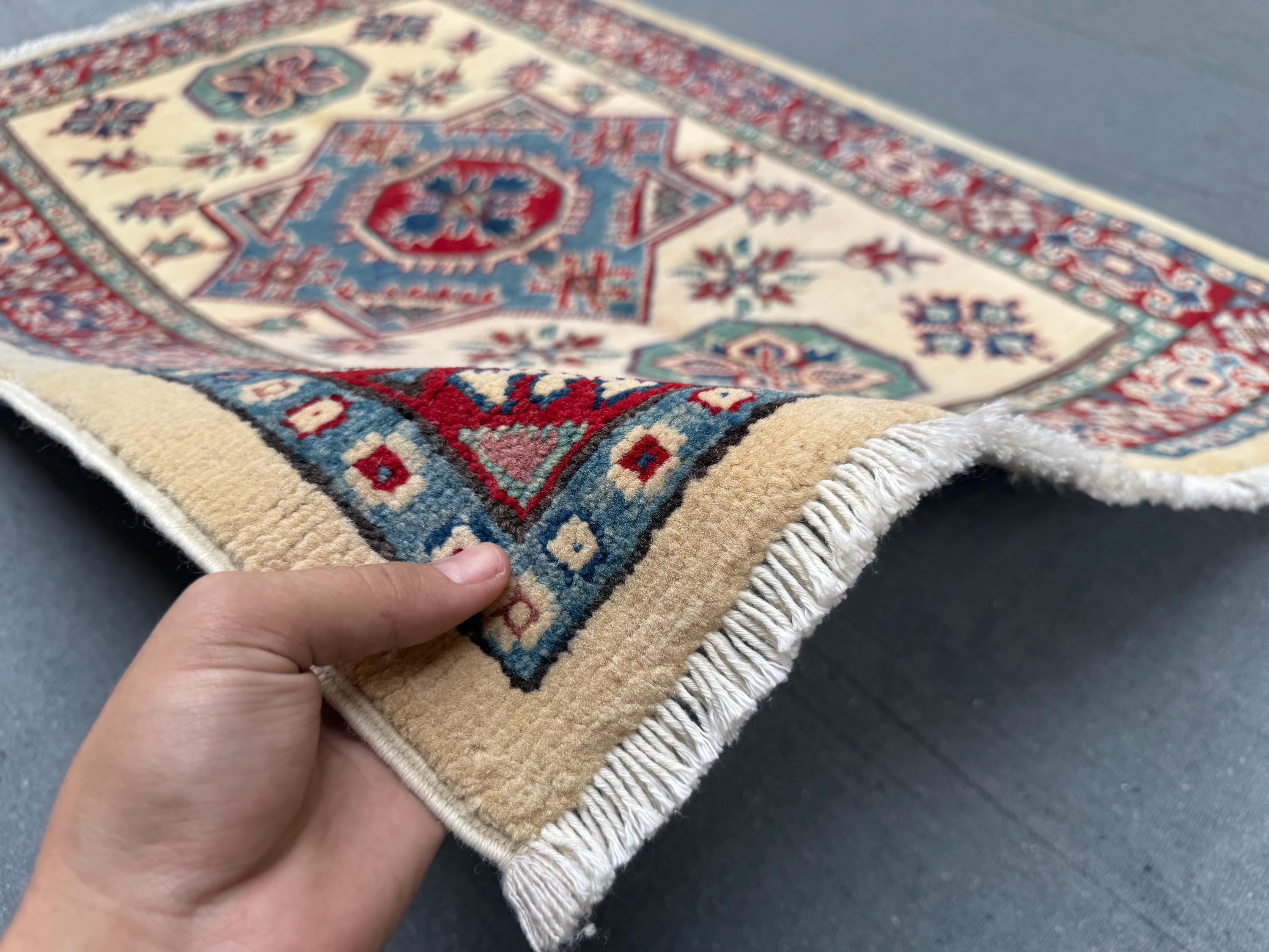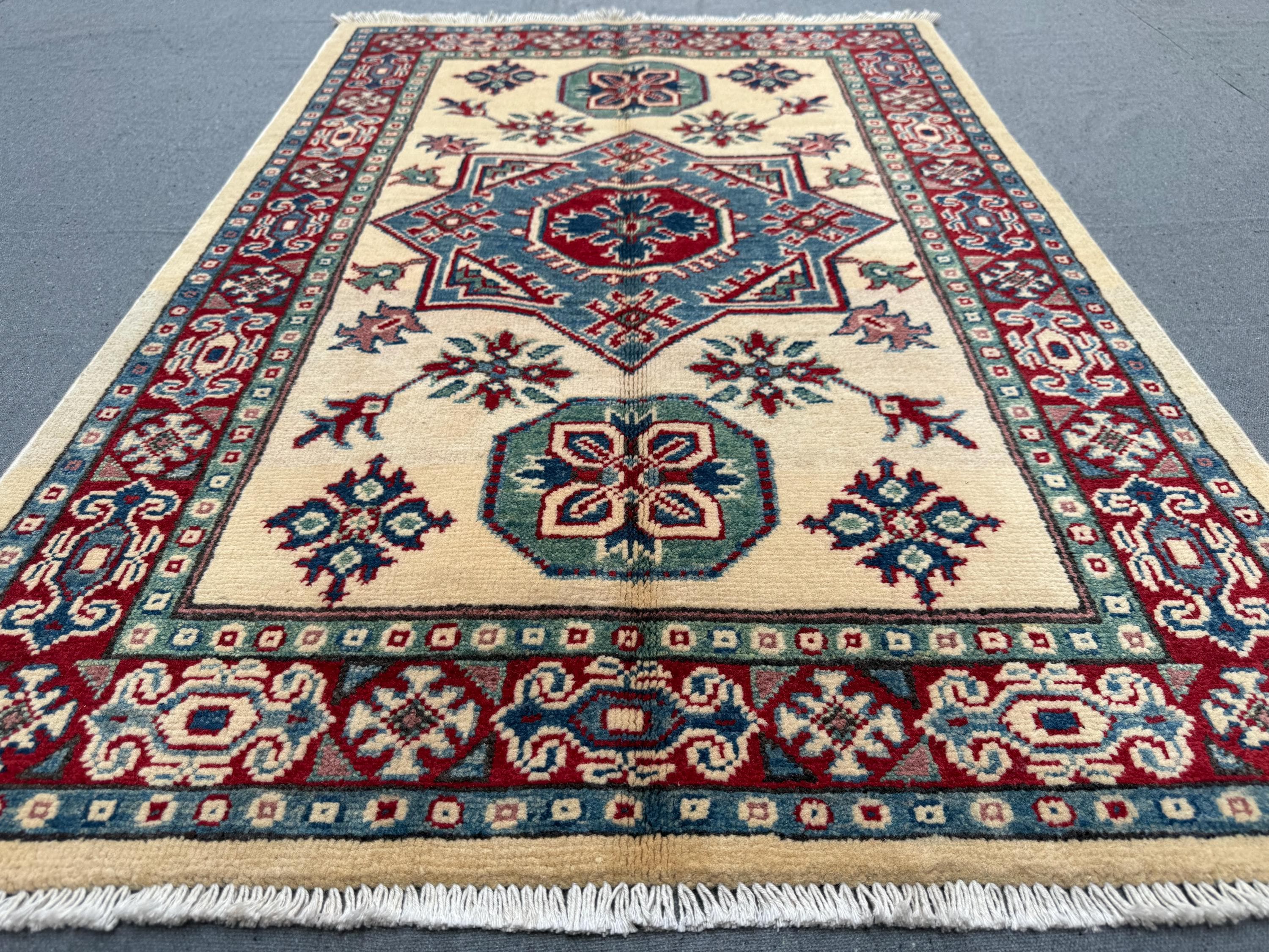 Kazak Rug 2.9x4.1 ft Hand-Knotted Afghan Wool Carpet, Cream and Red Geometric Rug, Small Handmade Wool Area Rug, Tribal Oriental Decor