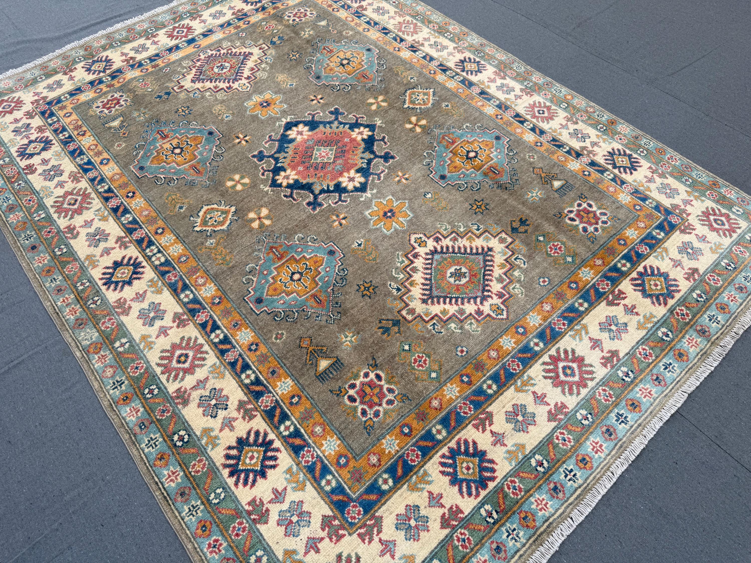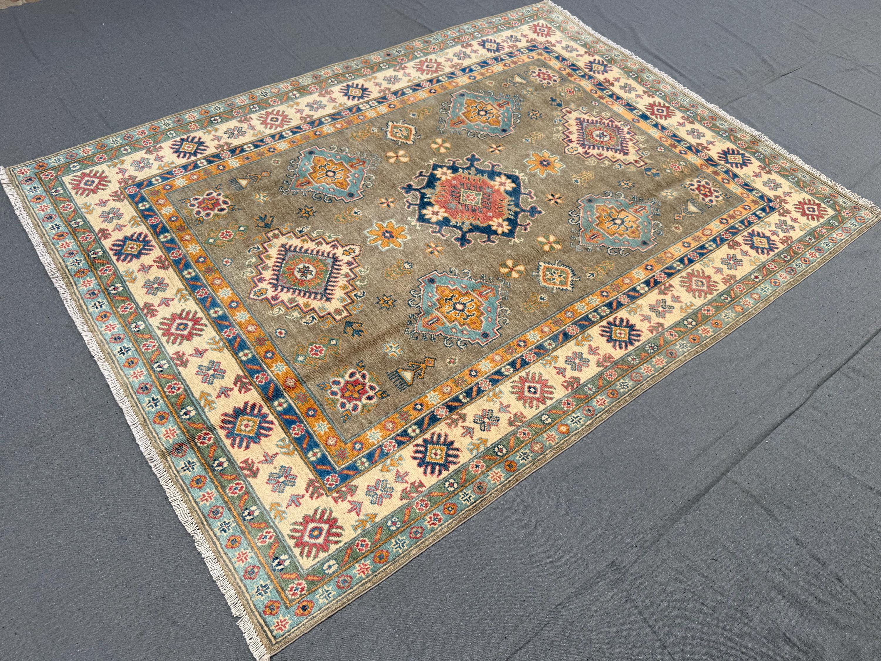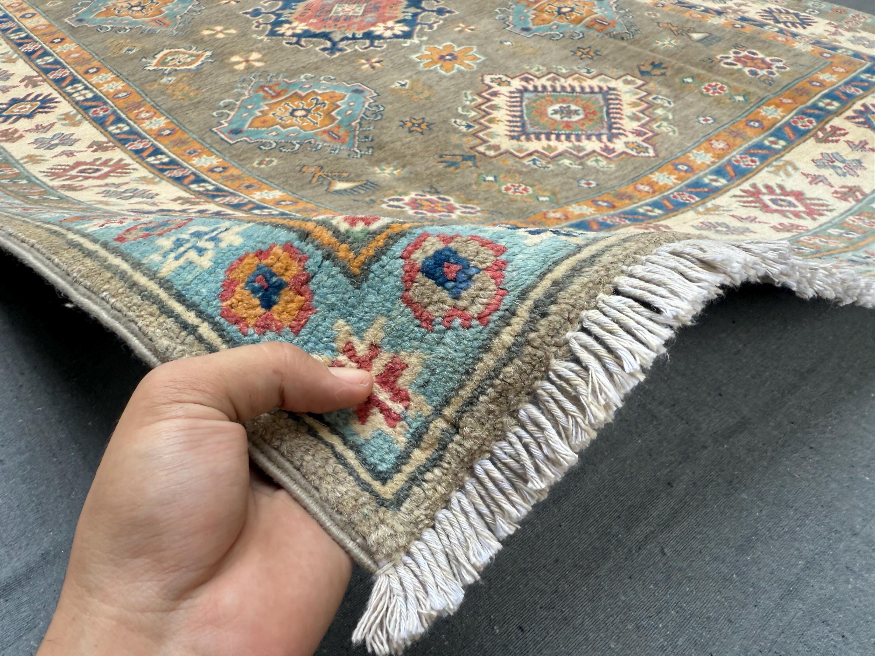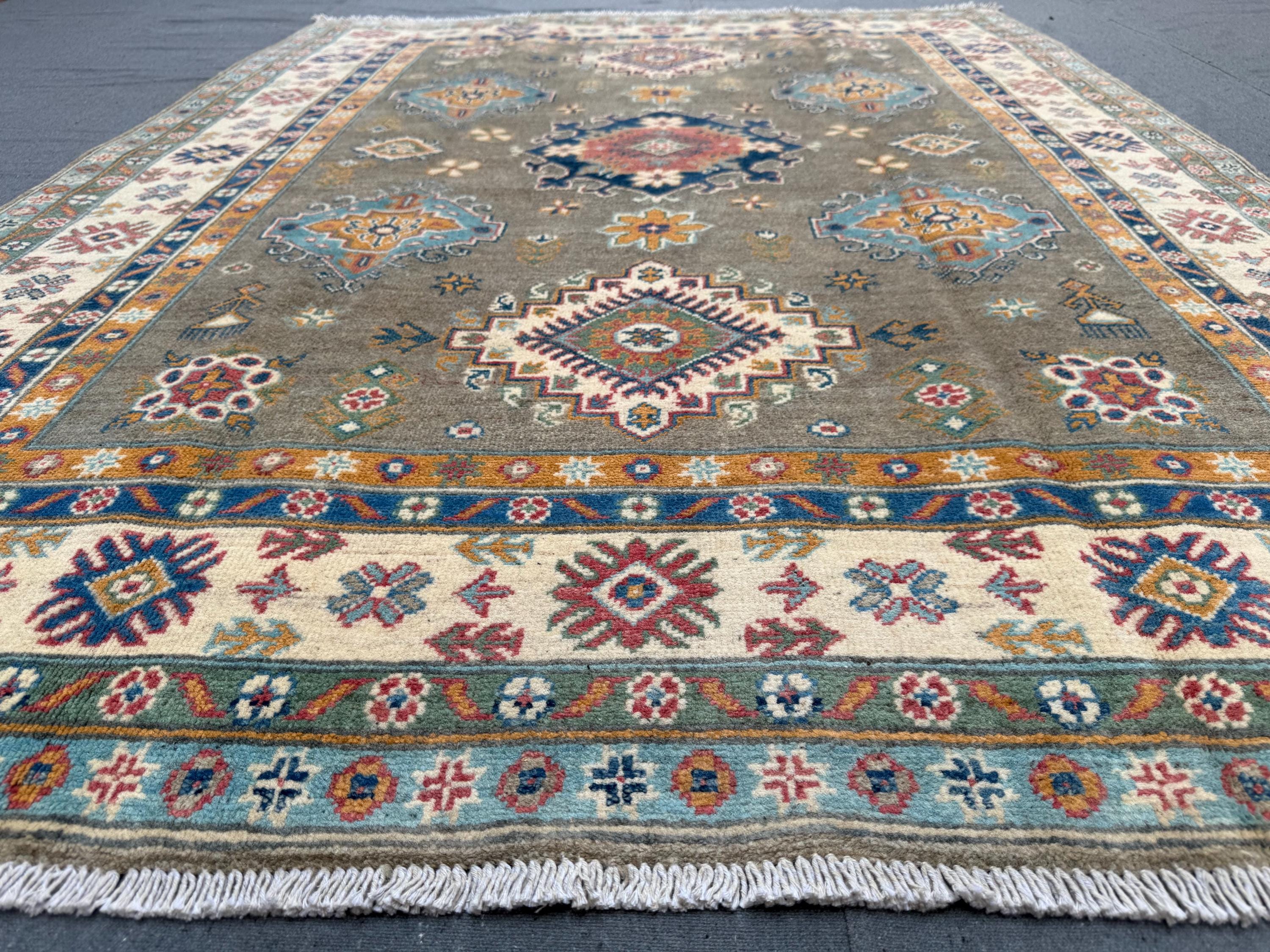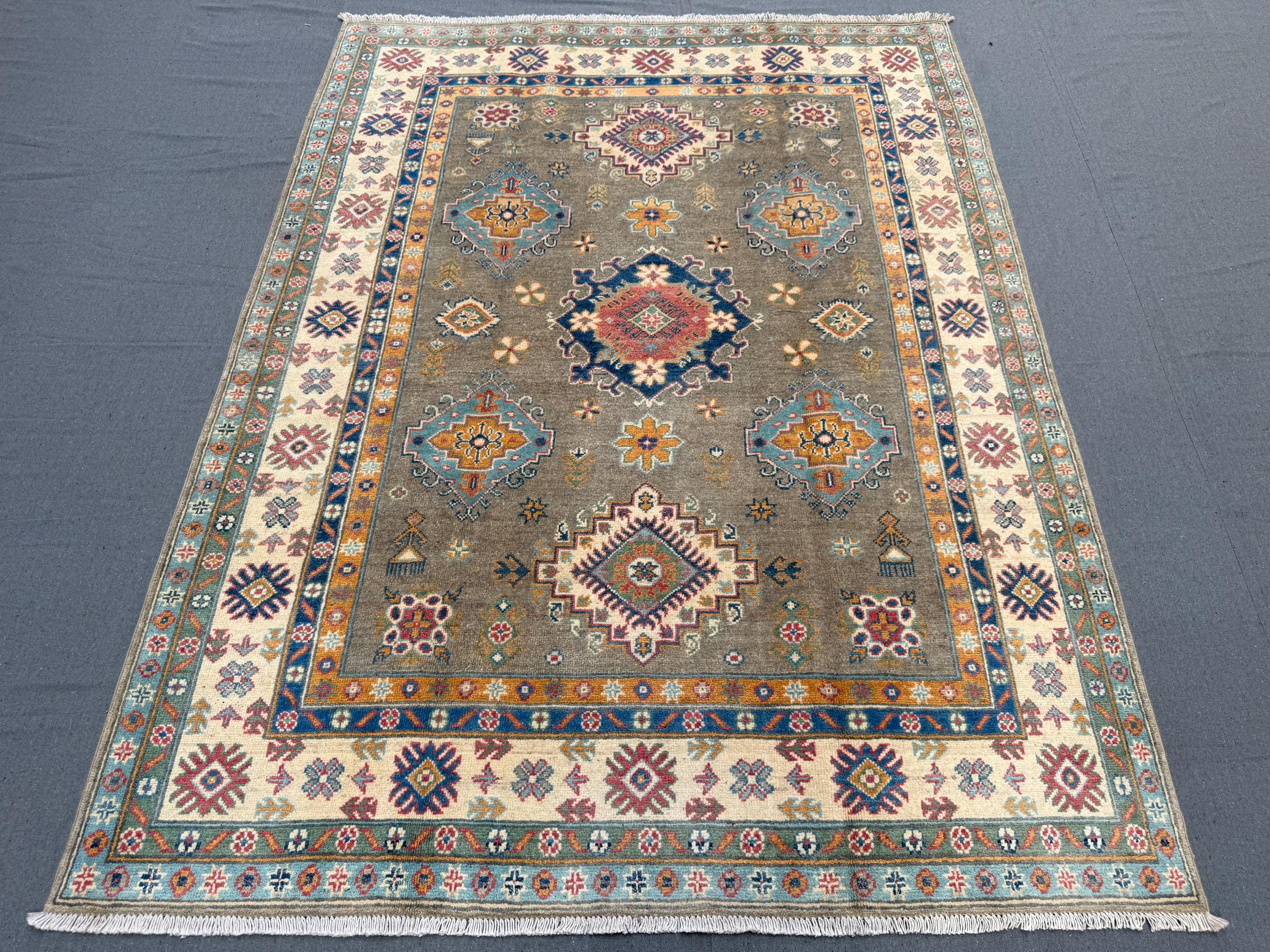 Kazak Rug 5.1x6.11 ft Hand-Knotted Afghan Wool Carpet, Beige and Blue Tribal Geometric Area Rug, Oriental Handmade Wool Living Room Decor