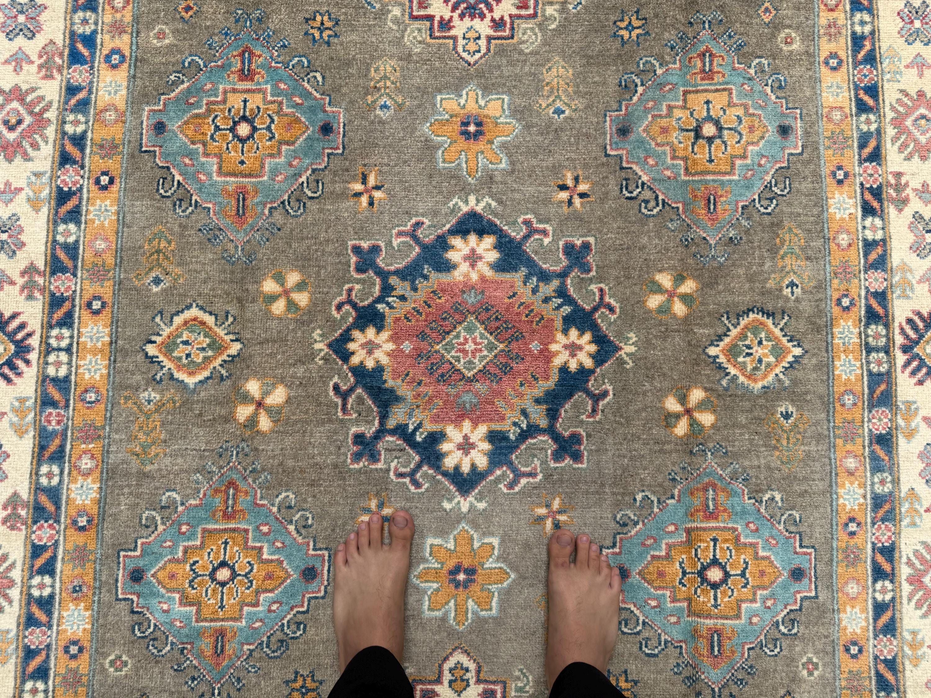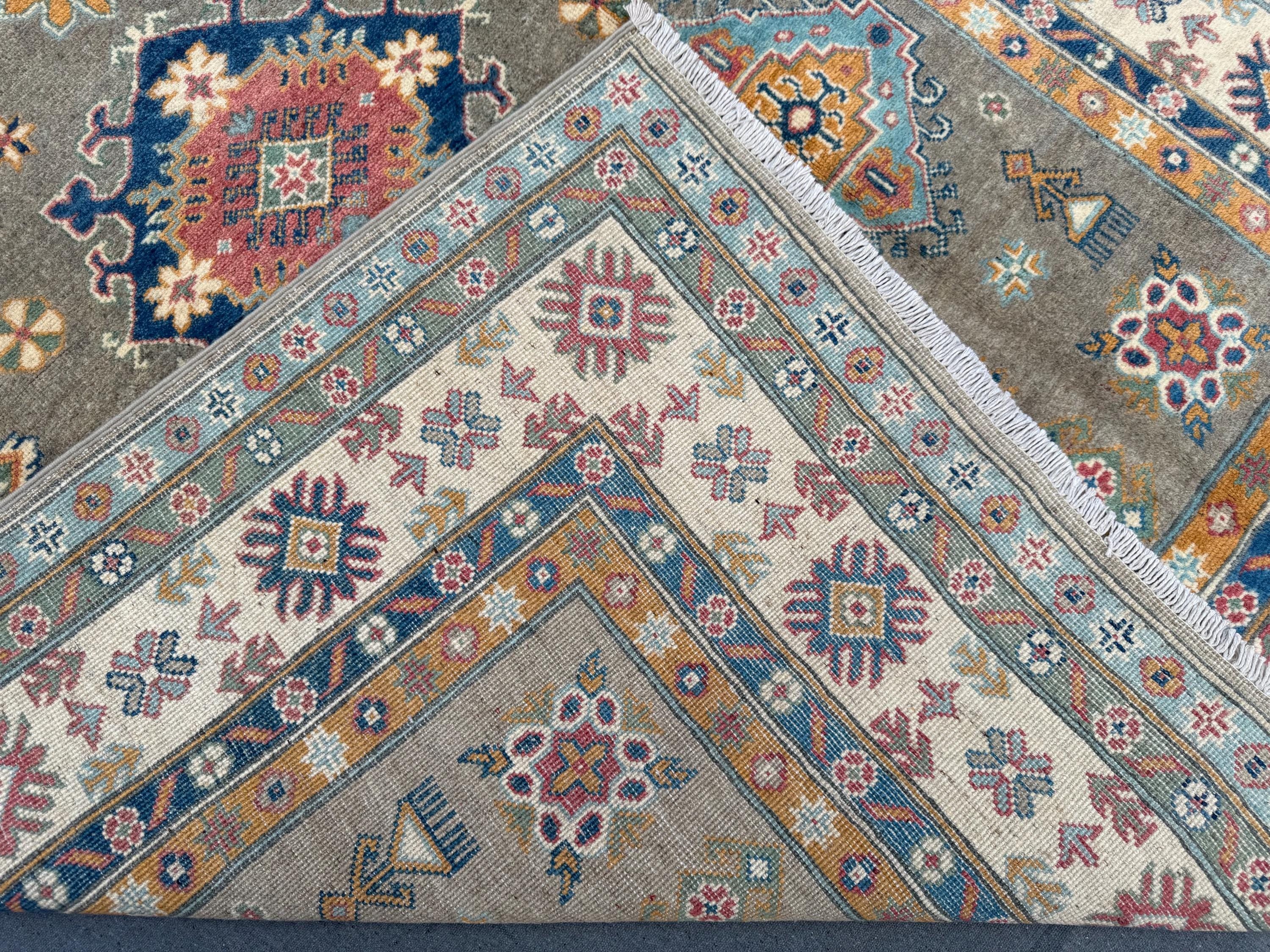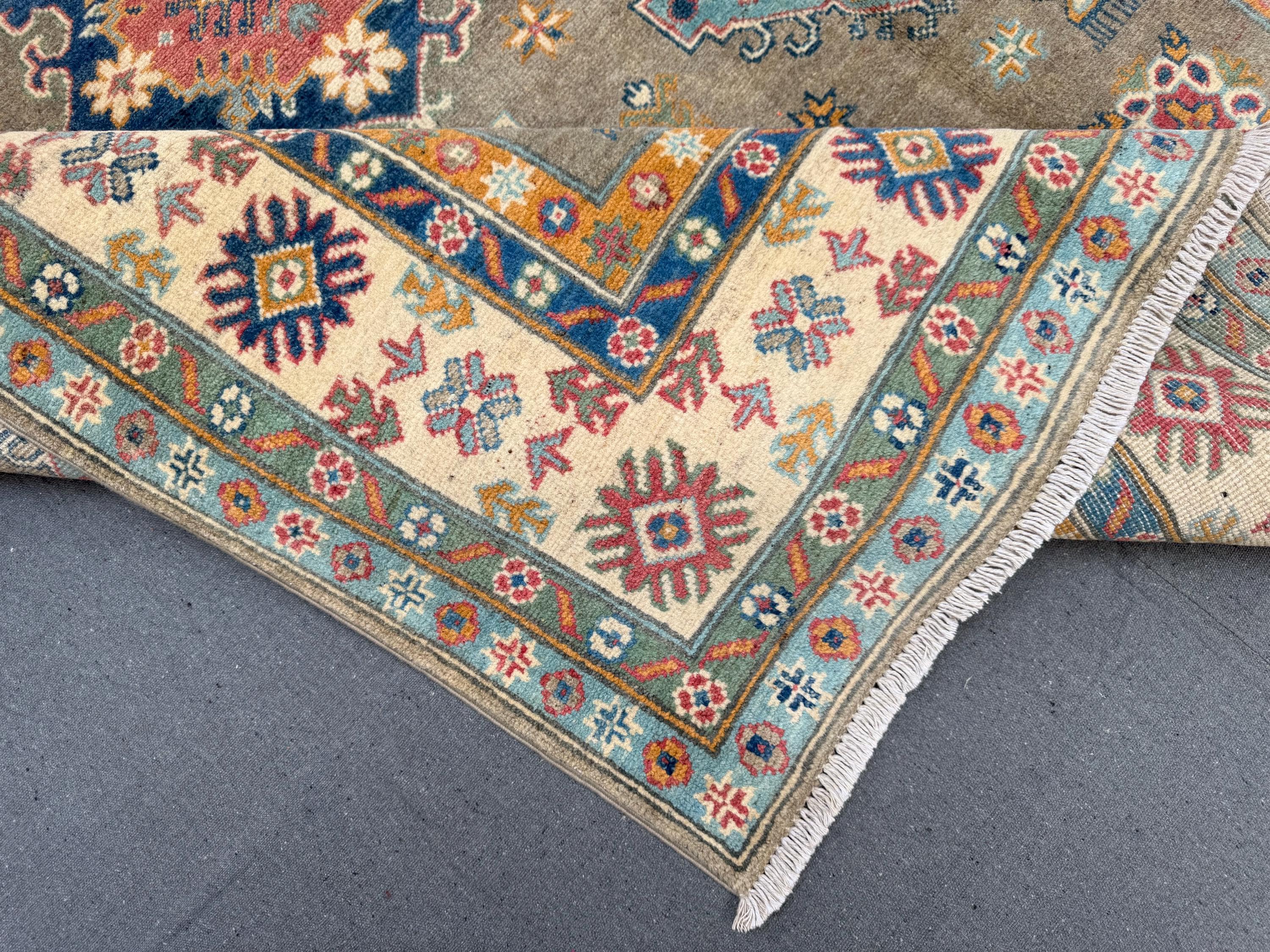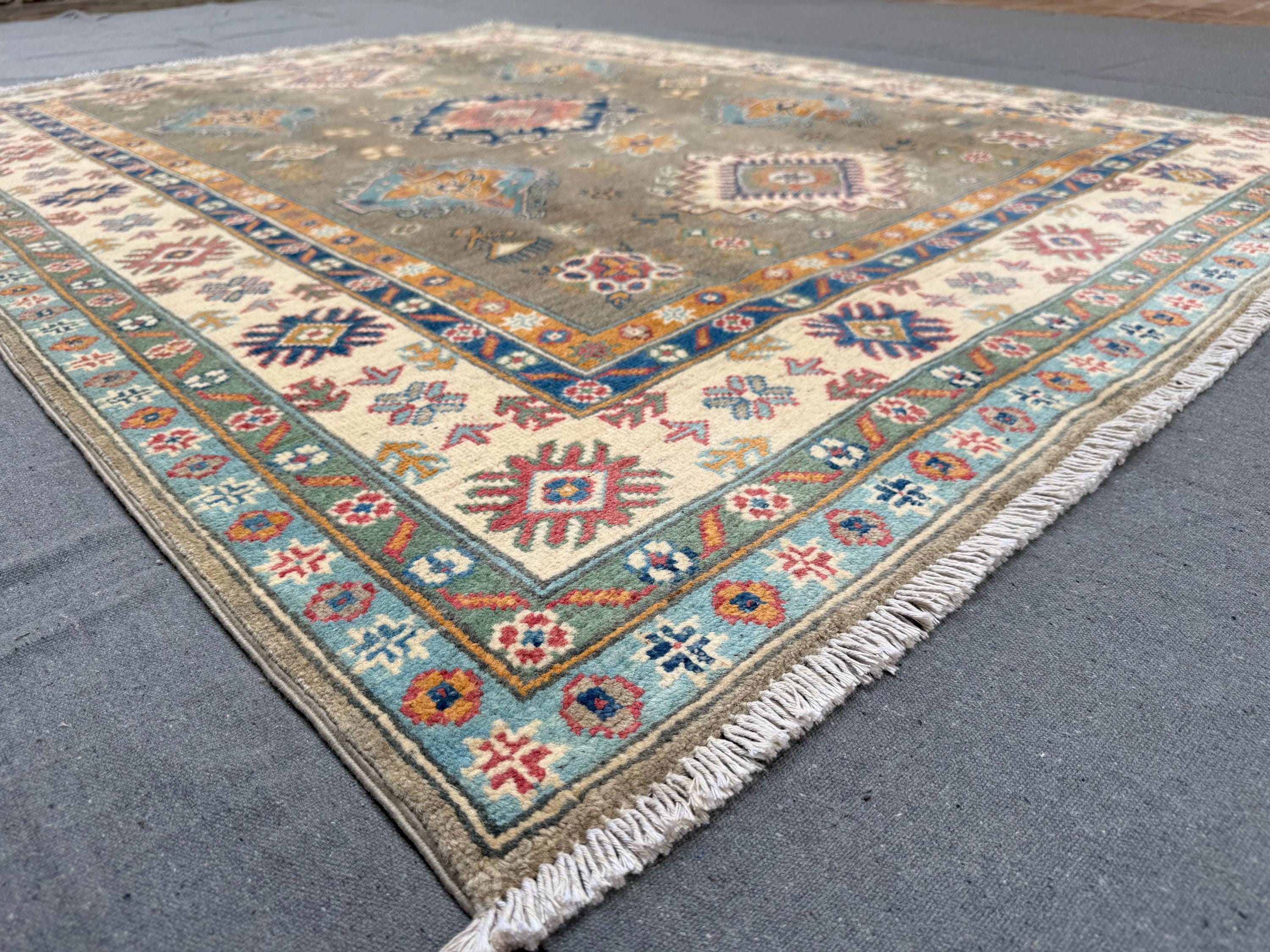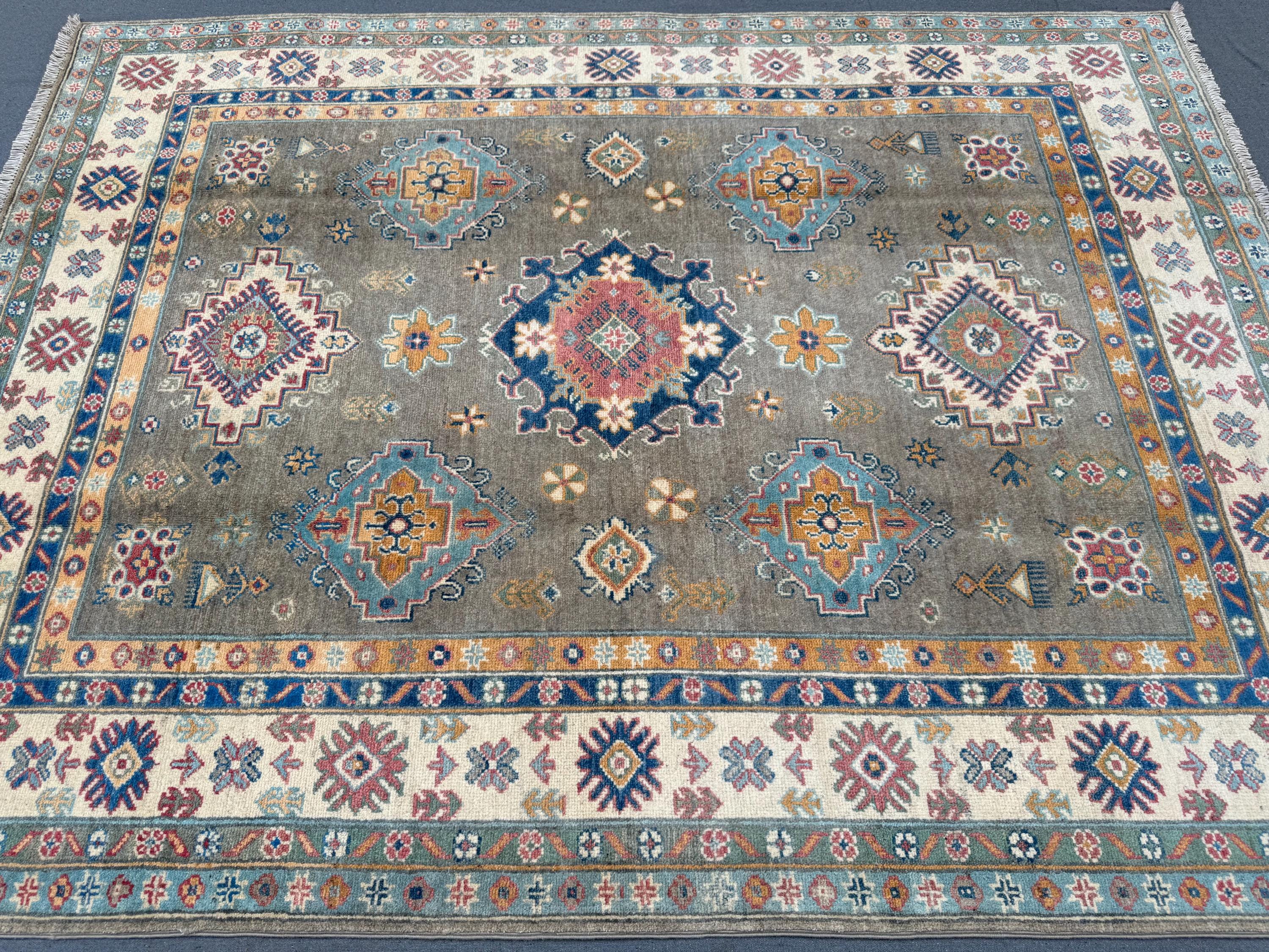 Kazak Rug 5.1x6.11 ft Hand-Knotted Afghan Wool Carpet, Beige and Blue Tribal Geometric Area Rug, Oriental Handmade Wool Living Room Decor