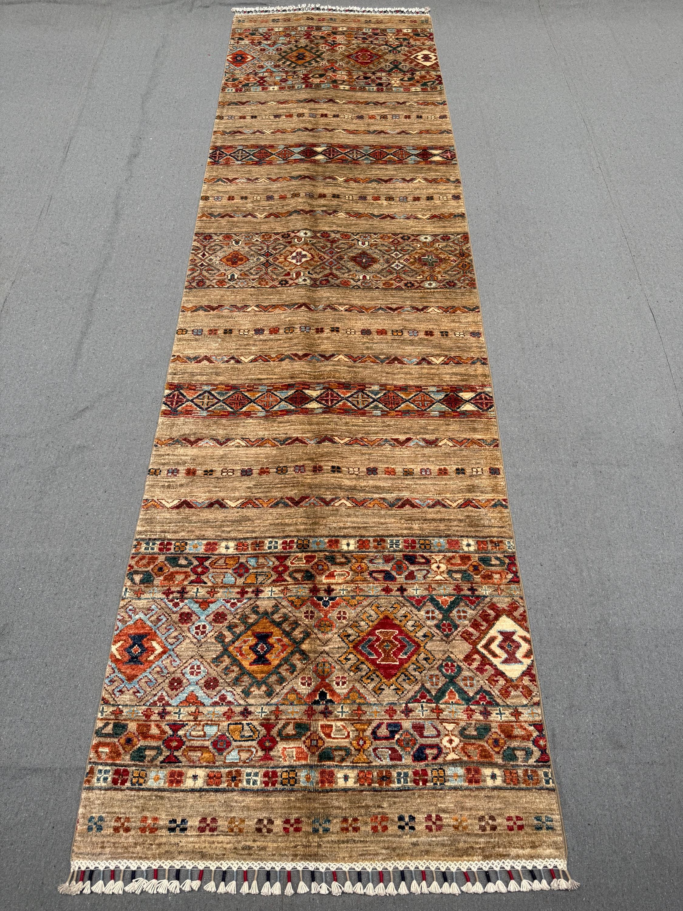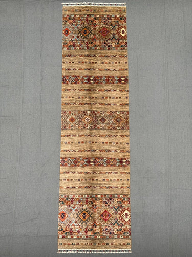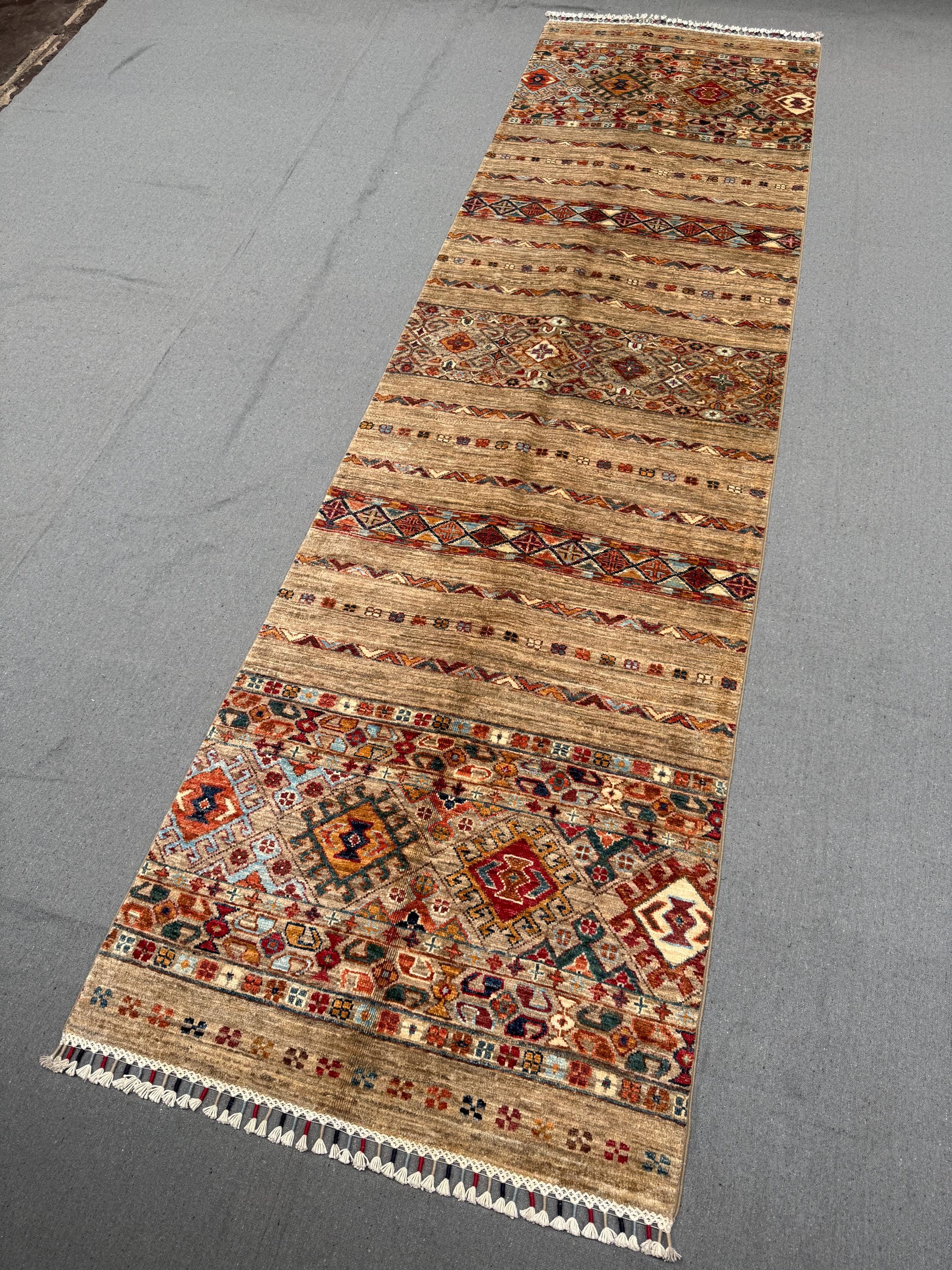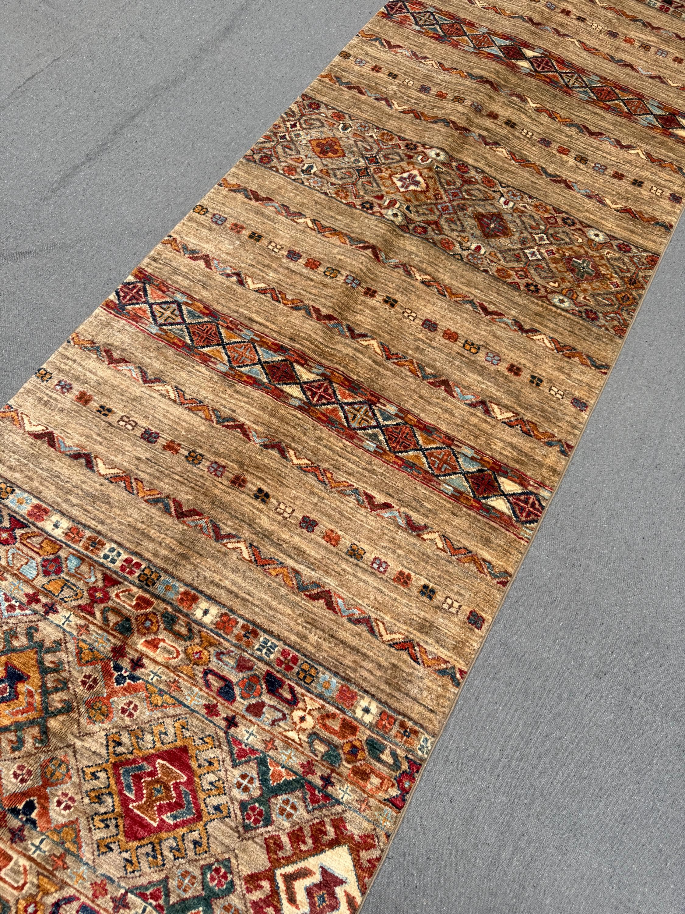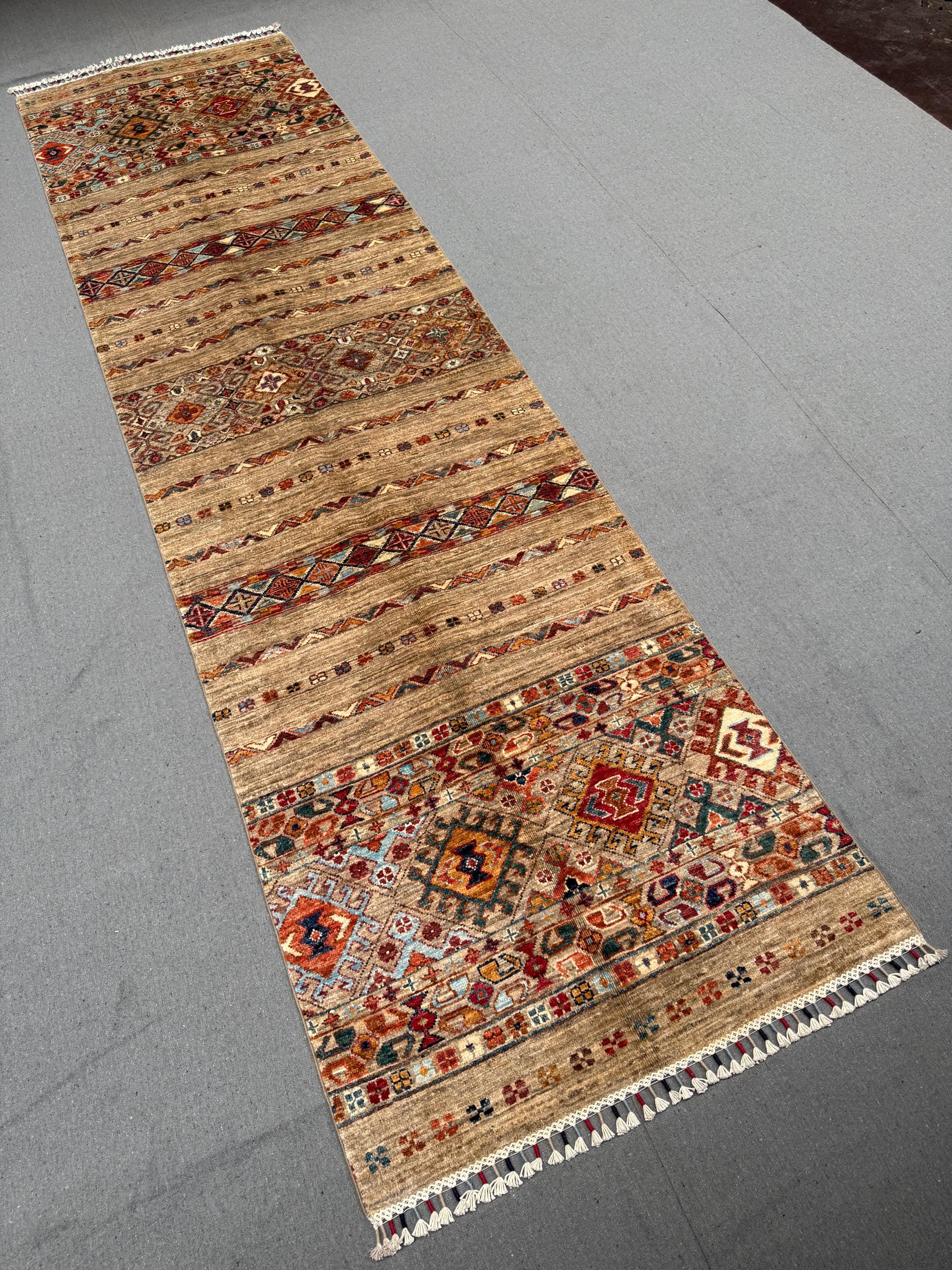 Handmade Khorjin Runner Rug 3x10 ft Tribal Wool Hallway Runner Brown Geometric Carpet Colorful Boho Long Rug for Entryway & Kitchen
