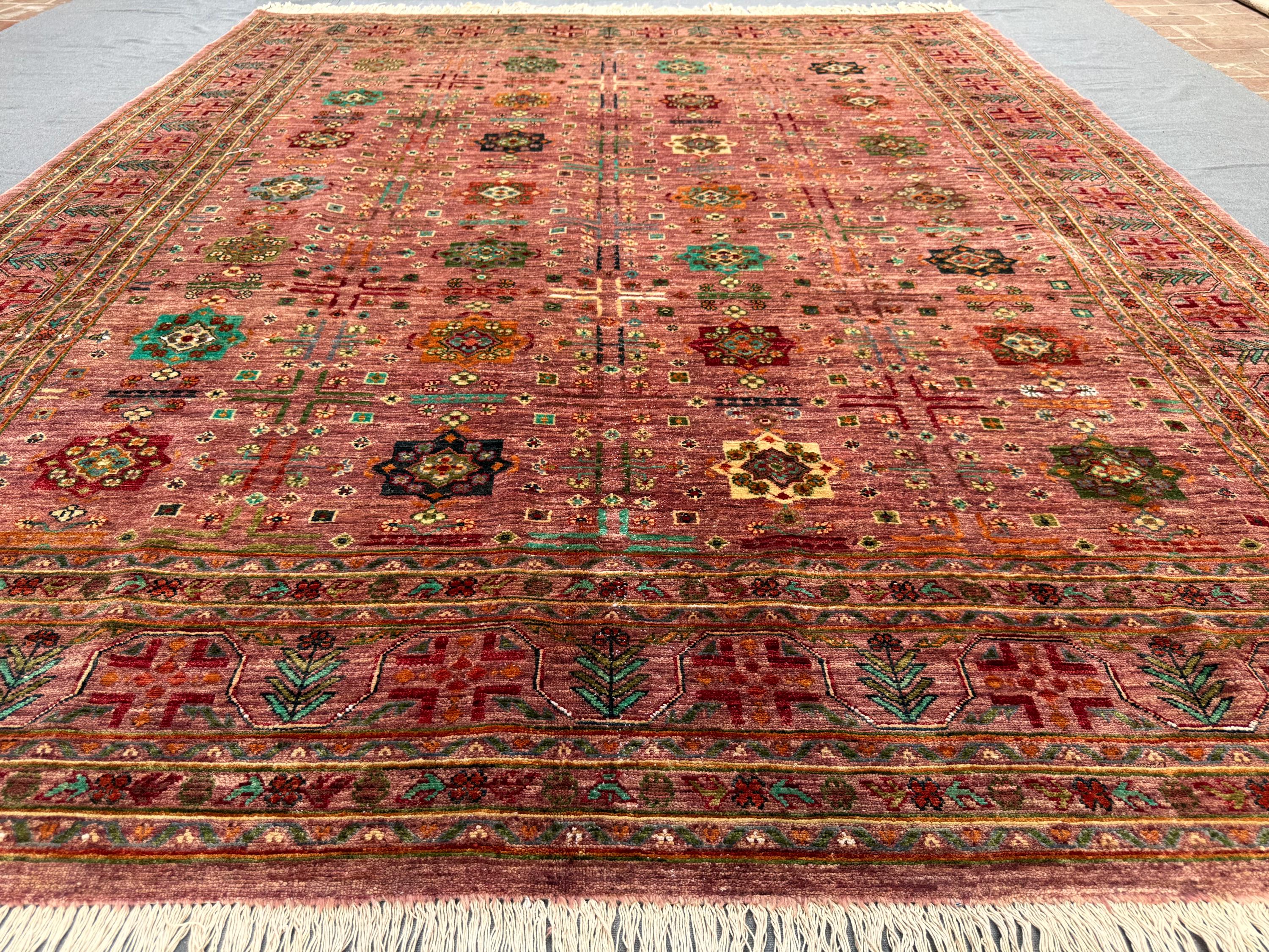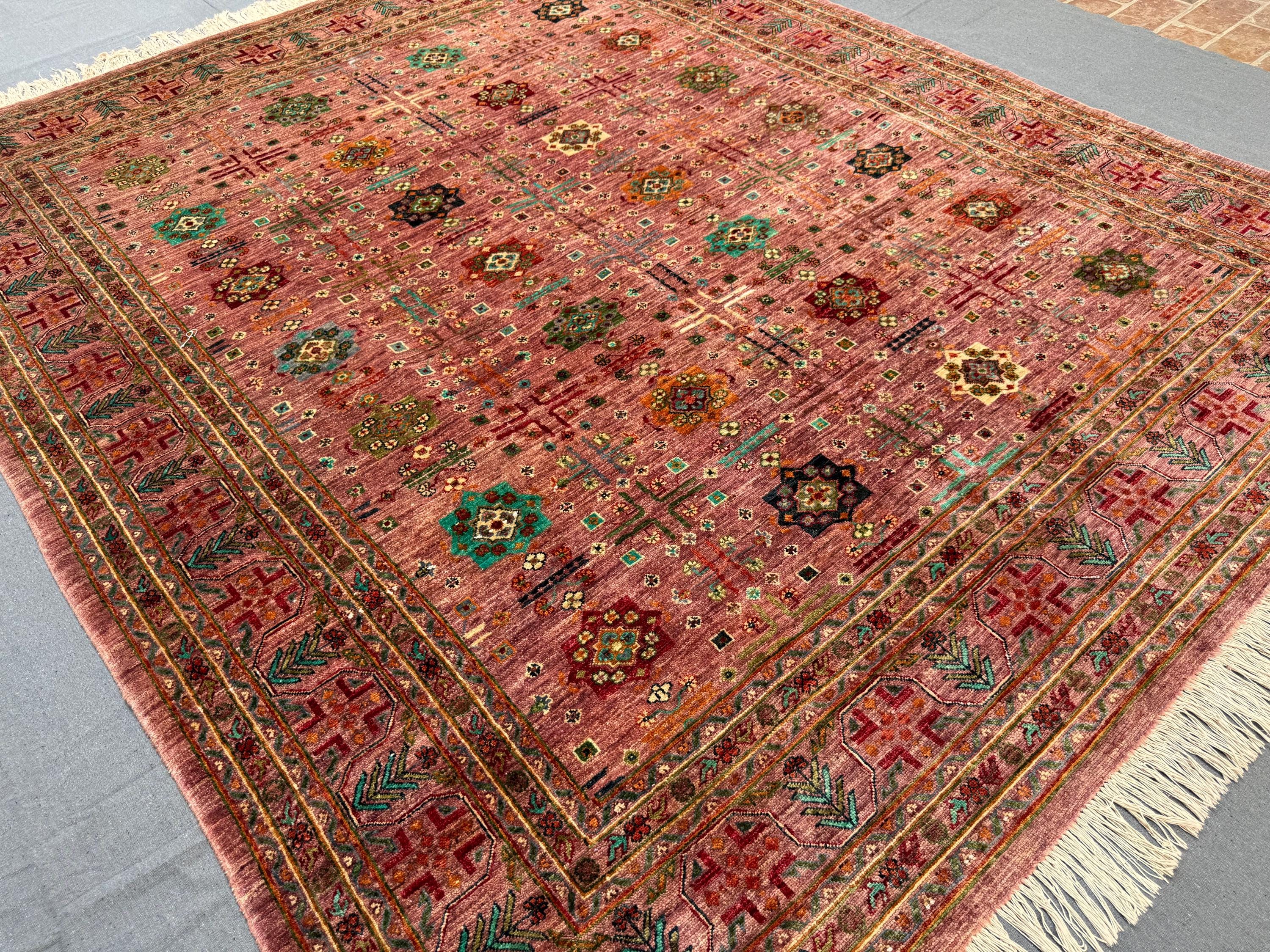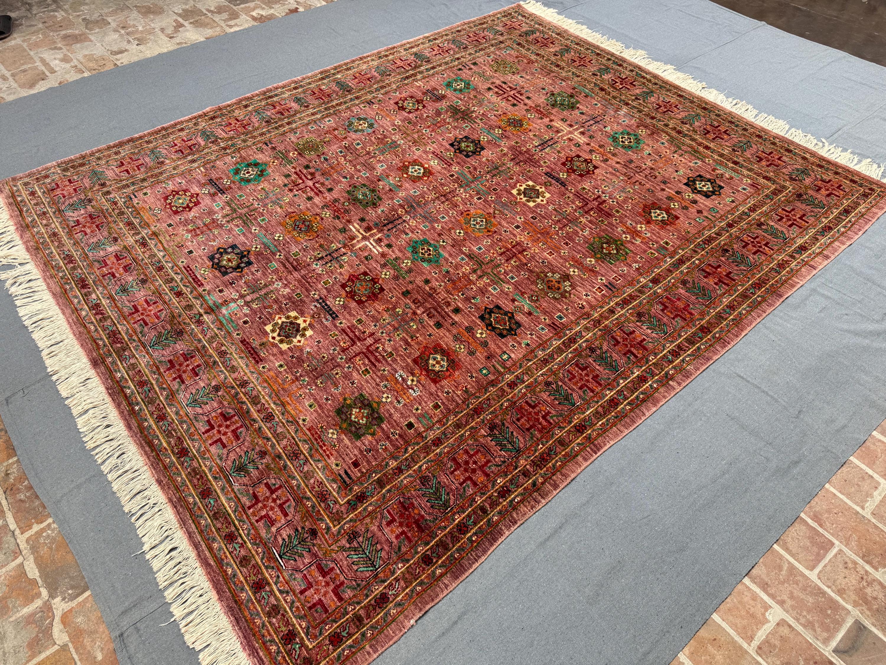 This Afghan Bukhara rug is a stunning statement piece, woven entirely by hand with 100% handspun wool and dyed using natural vegetable colors. The rug measures a generous 8x10 ft, making it the perfect size for larger living spaces or dining areas.