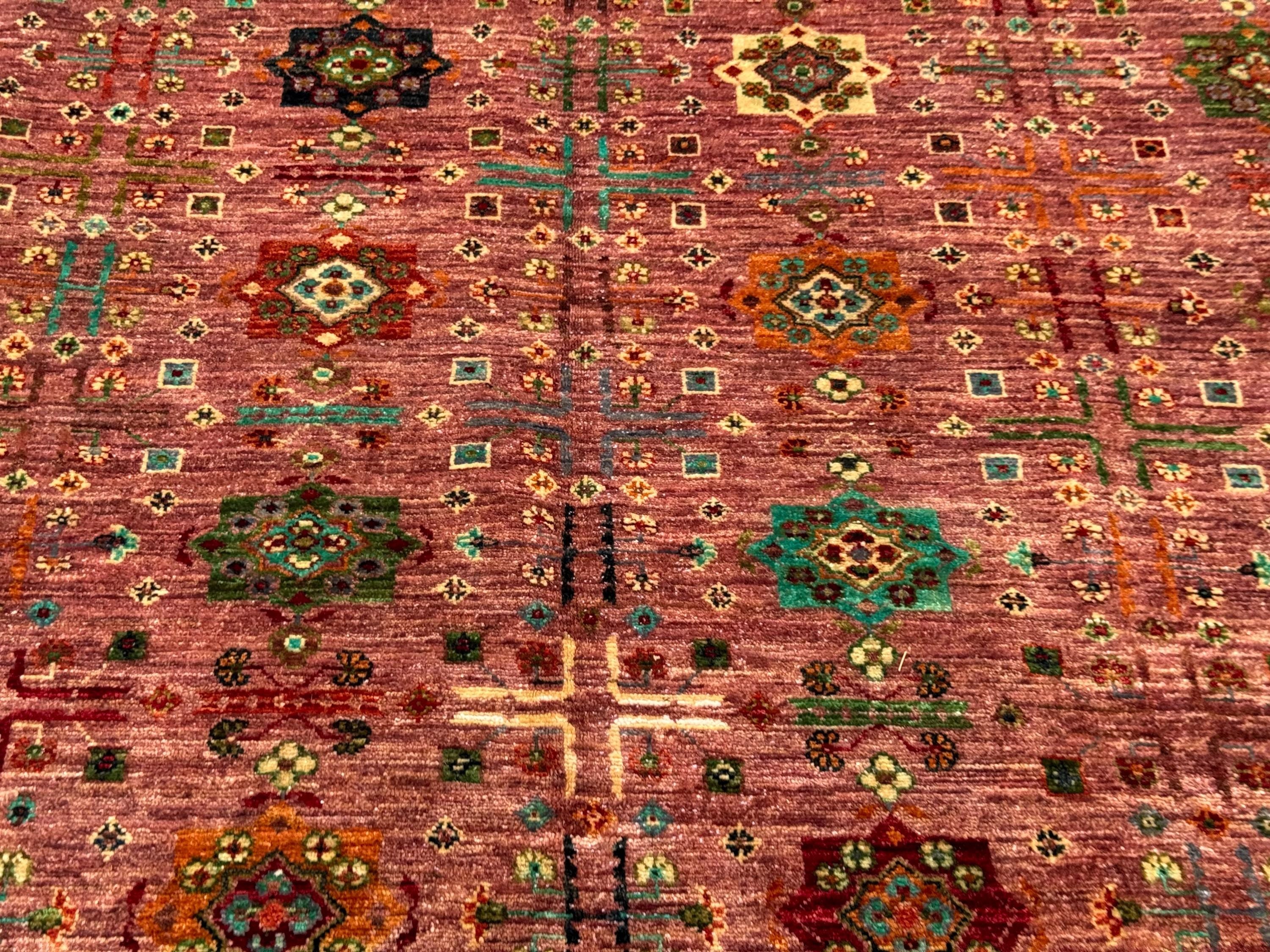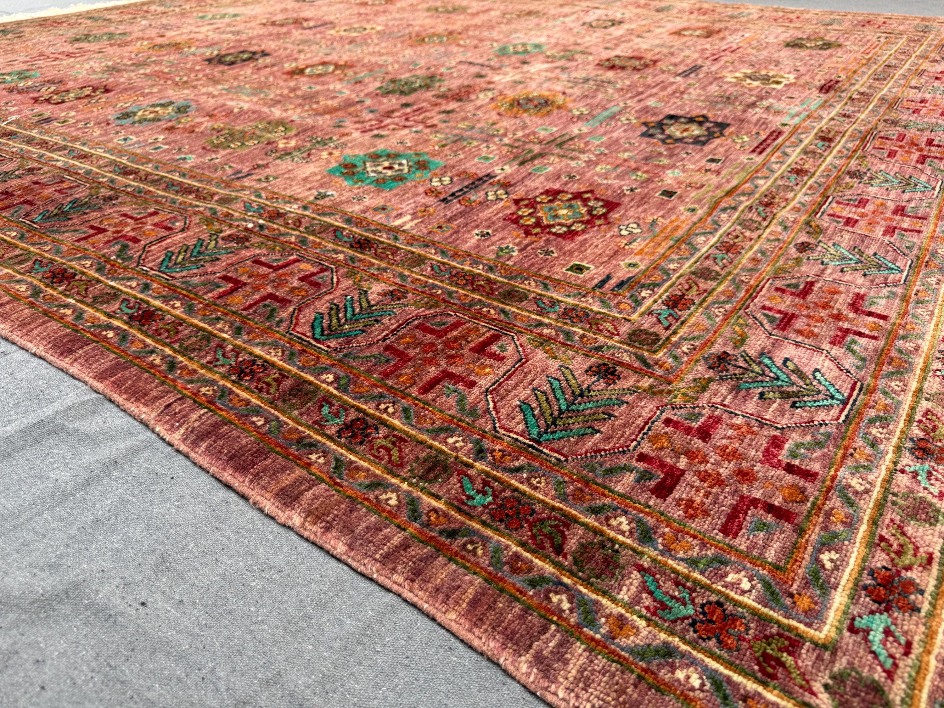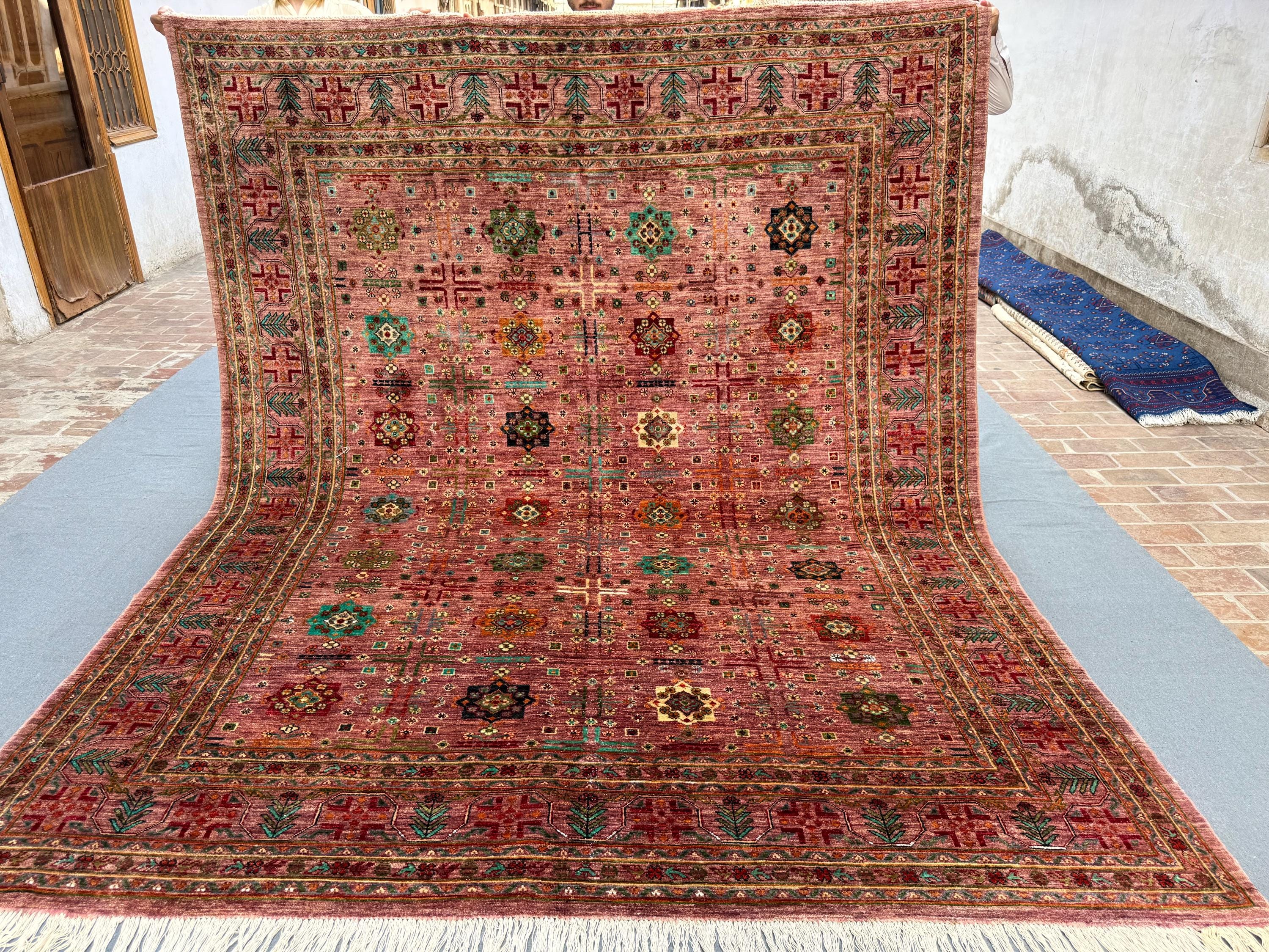 This Afghan Bukhara rug is a stunning statement piece, woven entirely by hand with 100% handspun wool and dyed using natural vegetable colors. The rug measures a generous 8x10 ft, making it the perfect size for larger living spaces or dining areas.