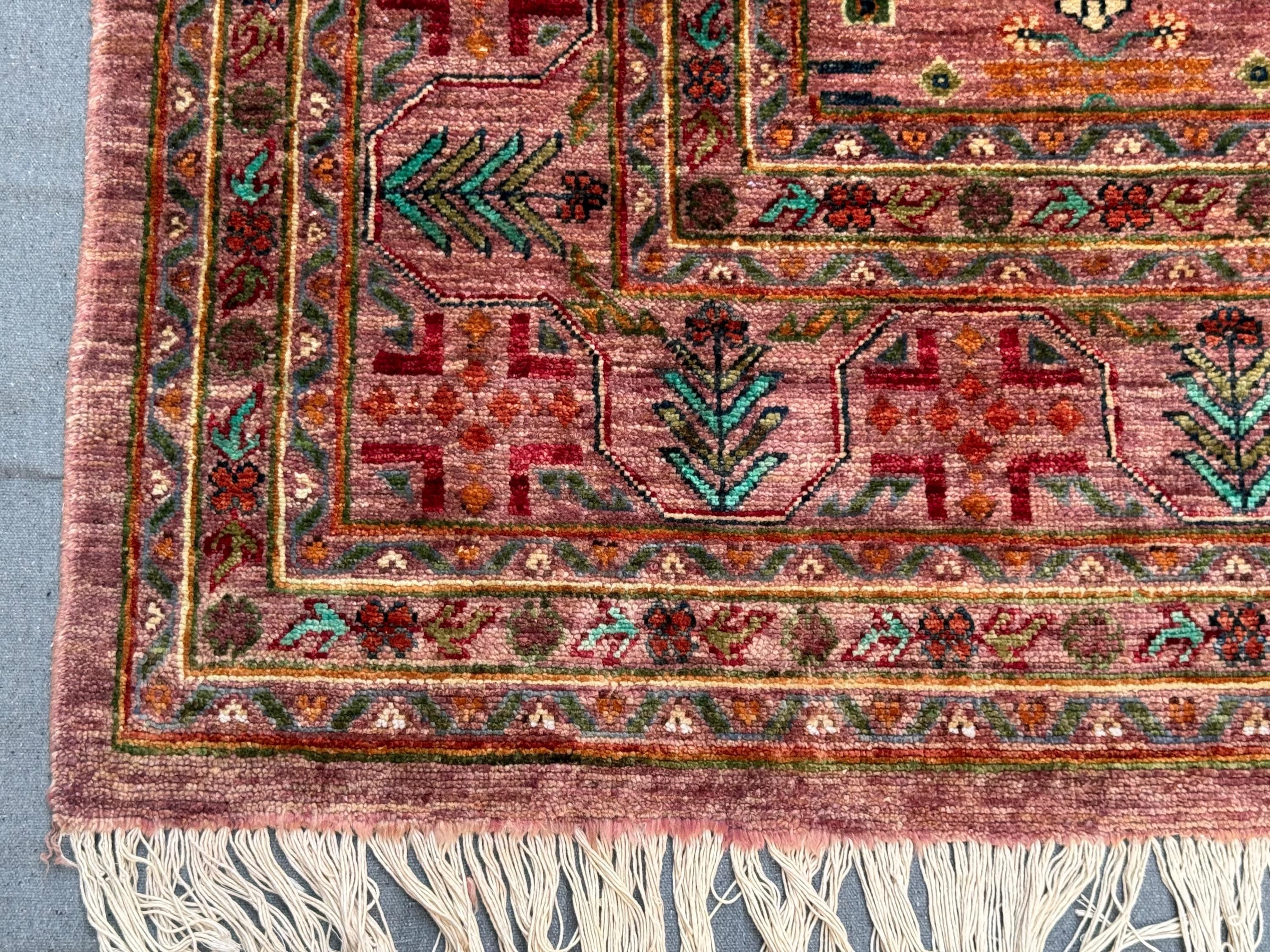 The rug features a soft rose-red field adorned with traditional Bukhara gul medallions, highlighted with shades of green, ivory, and gold. The intricate border frames the central design beautifully, reflecting the timeless artistry of Afghan weaving traditions.