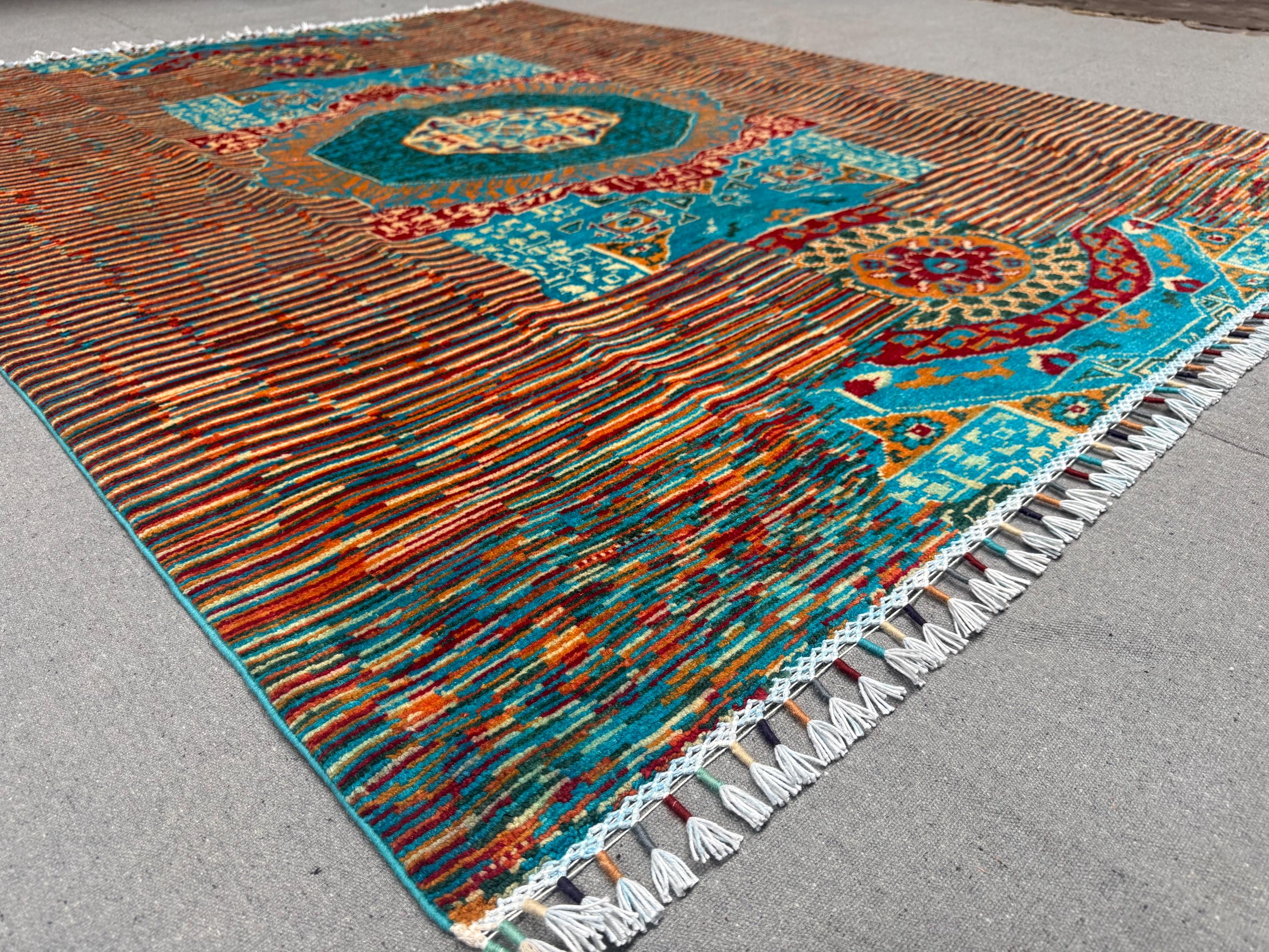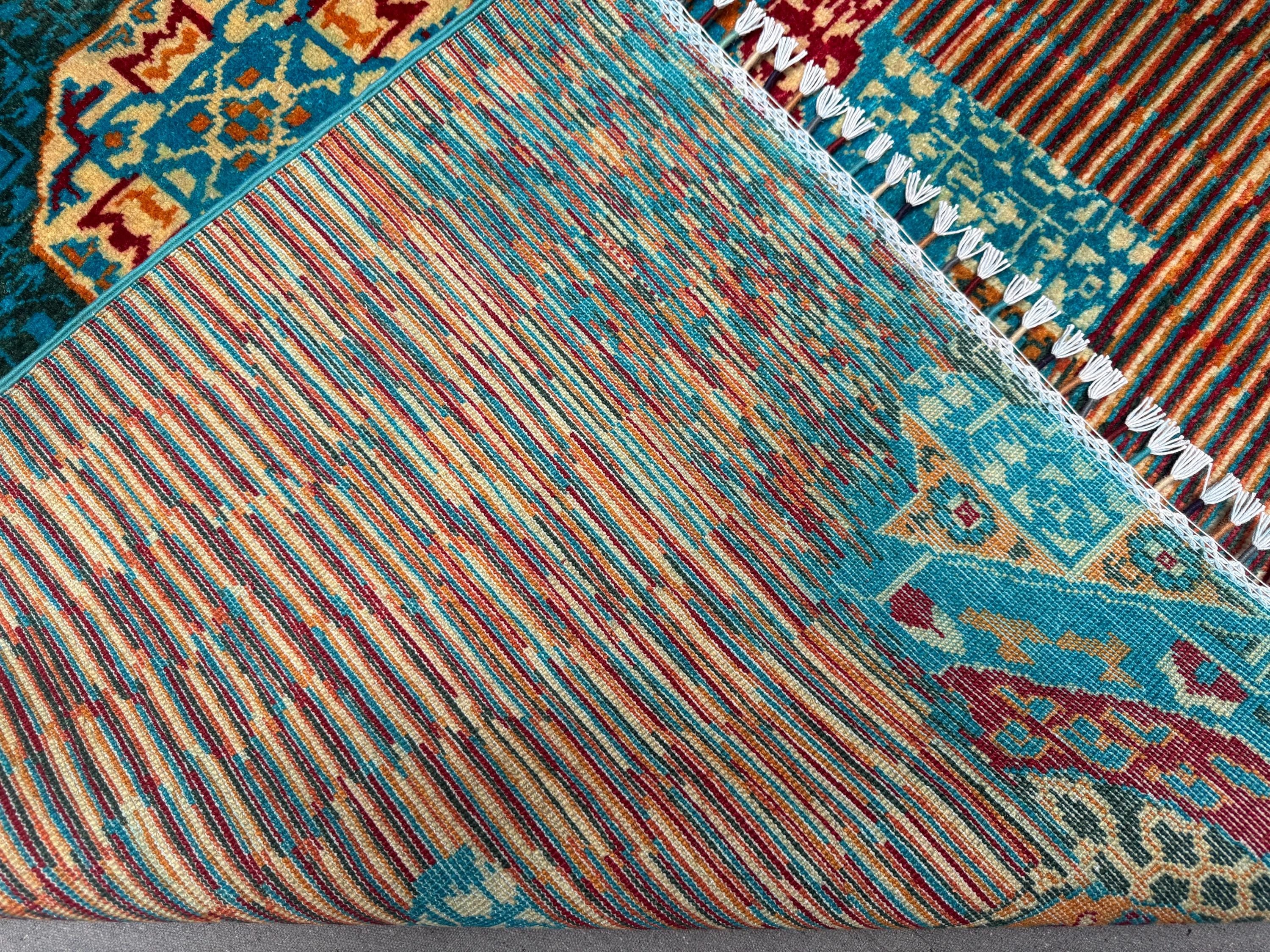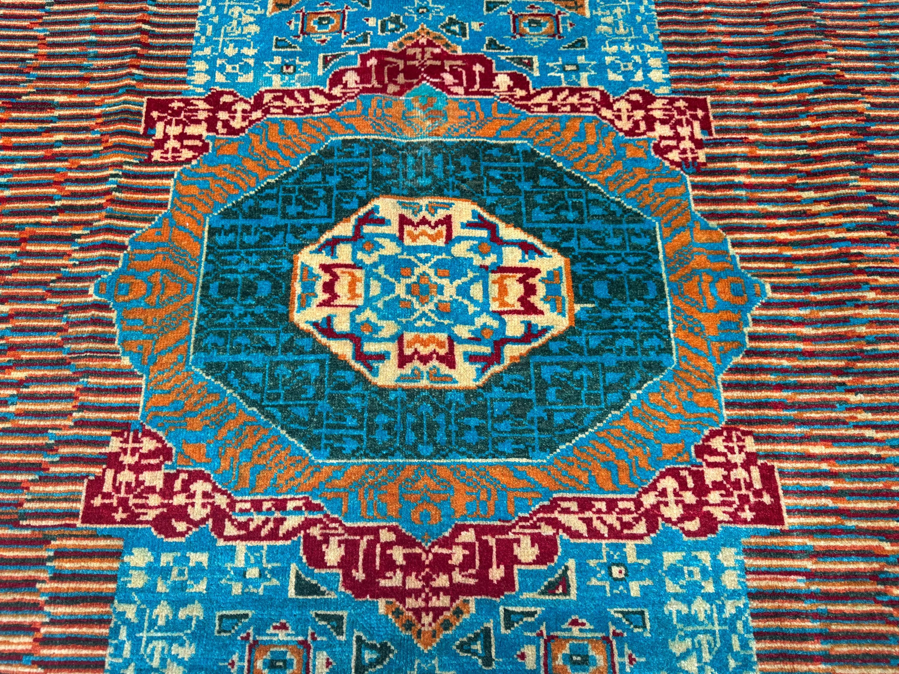 This brand new Mamluk Geometric rug is a striking fusion of traditional artistry and modern design. Hand-knotted from 100% fine wool, it features a mesmerizing geometric medallion pattern inspired by Mamluk architecture, enhanced with vibrant splashes of turquoise, red, rust, and green for a bold contemporary twist.