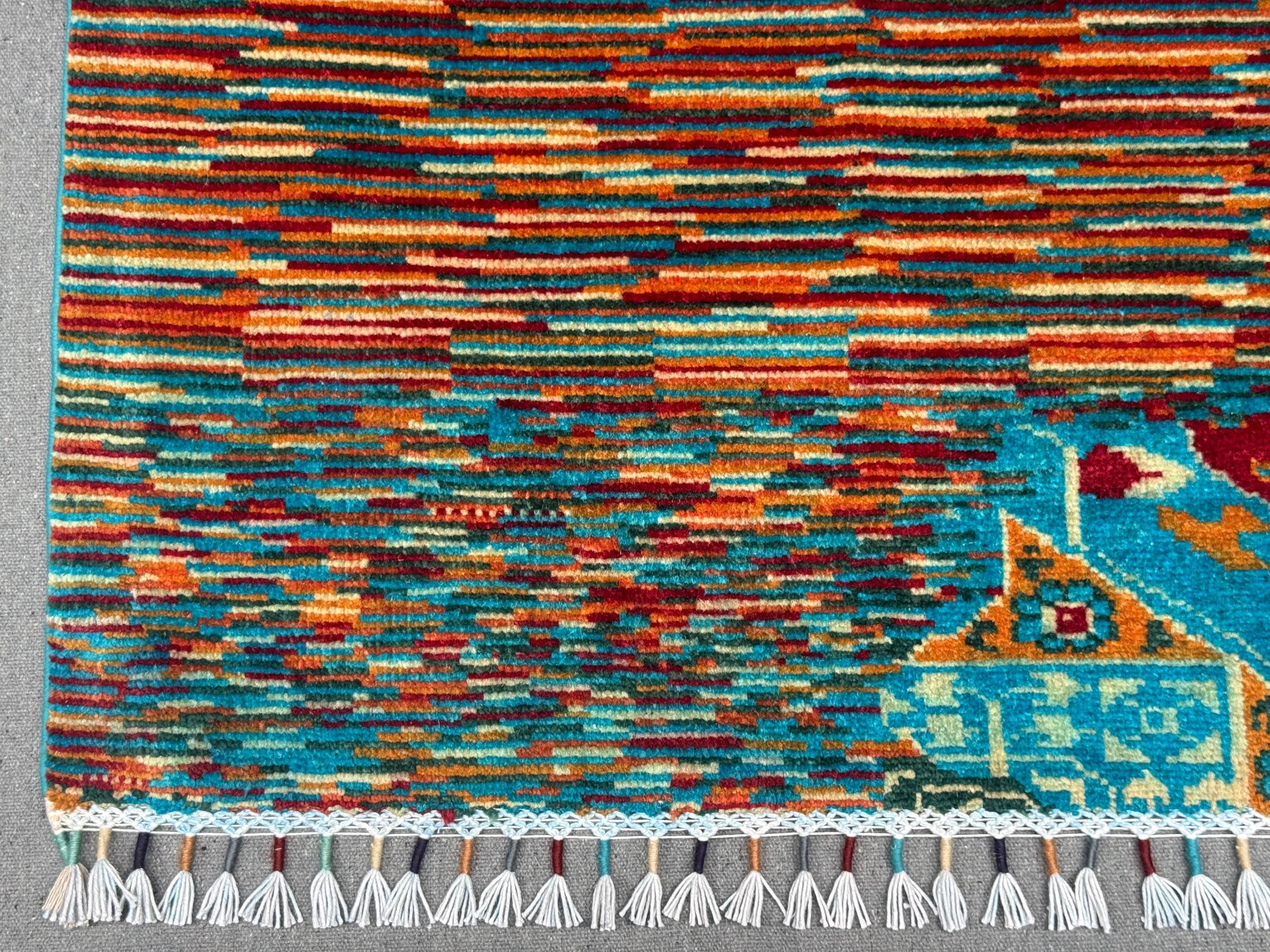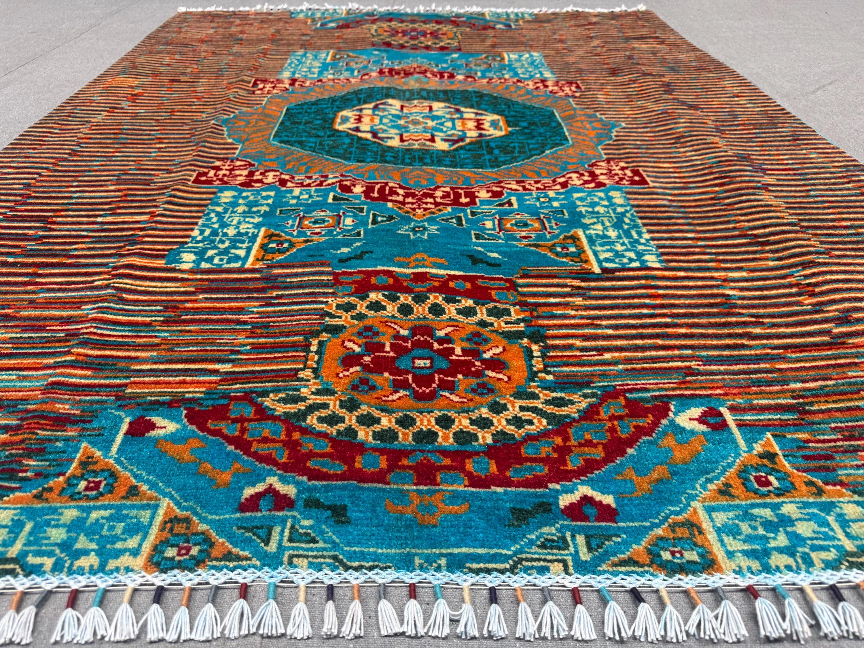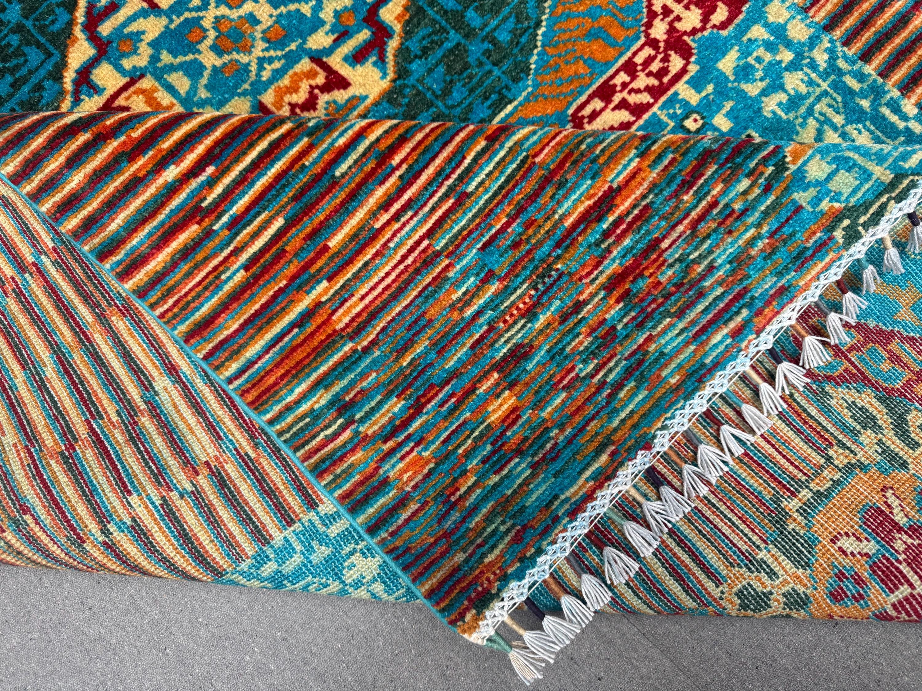 This brand new Mamluk Geometric rug is a striking fusion of traditional artistry and modern design. Hand-knotted from 100% fine wool, it features a mesmerizing geometric medallion pattern inspired by Mamluk architecture, enhanced with vibrant splashes of turquoise, red, rust, and green for a bold contemporary twist.