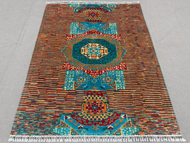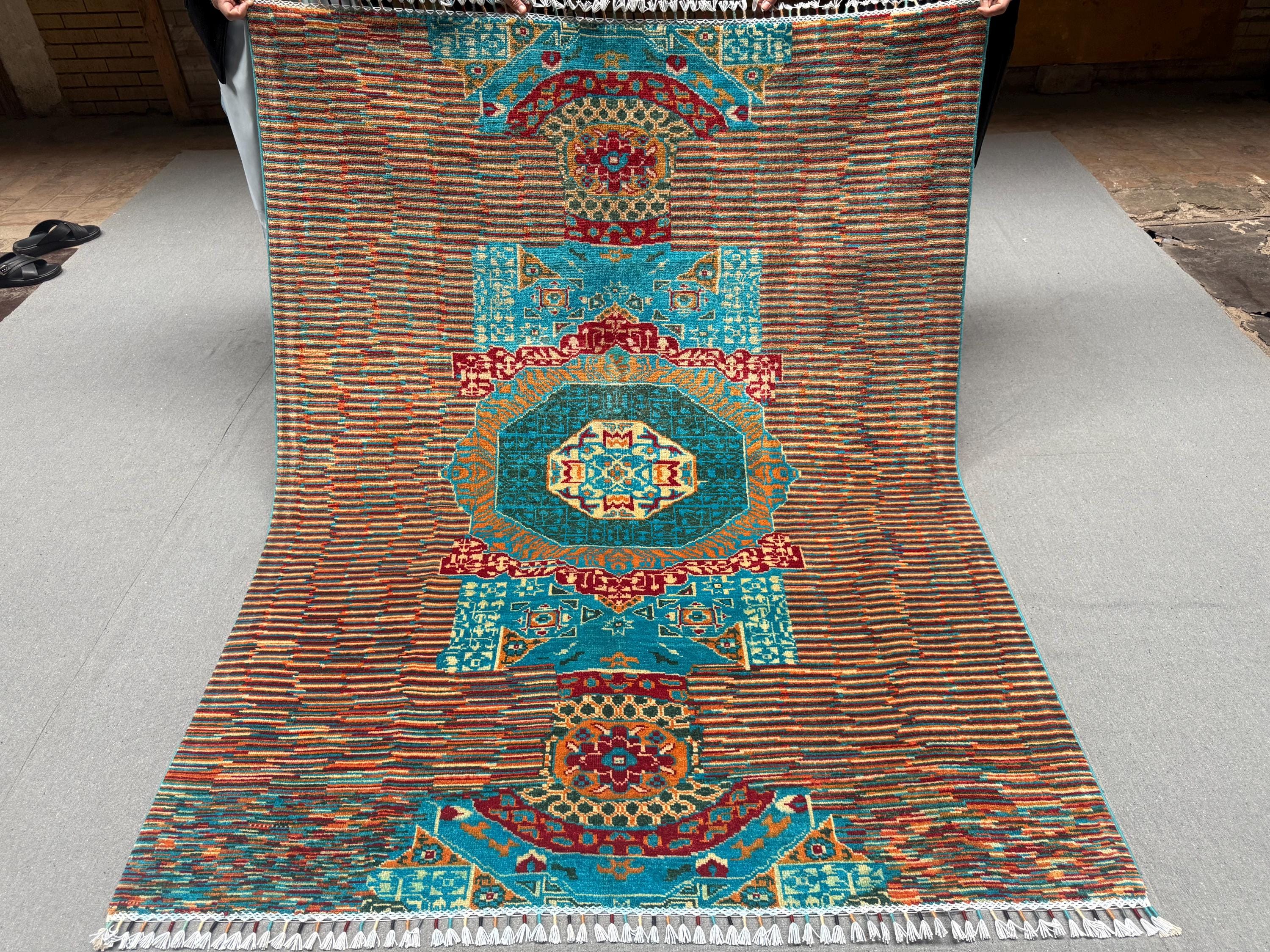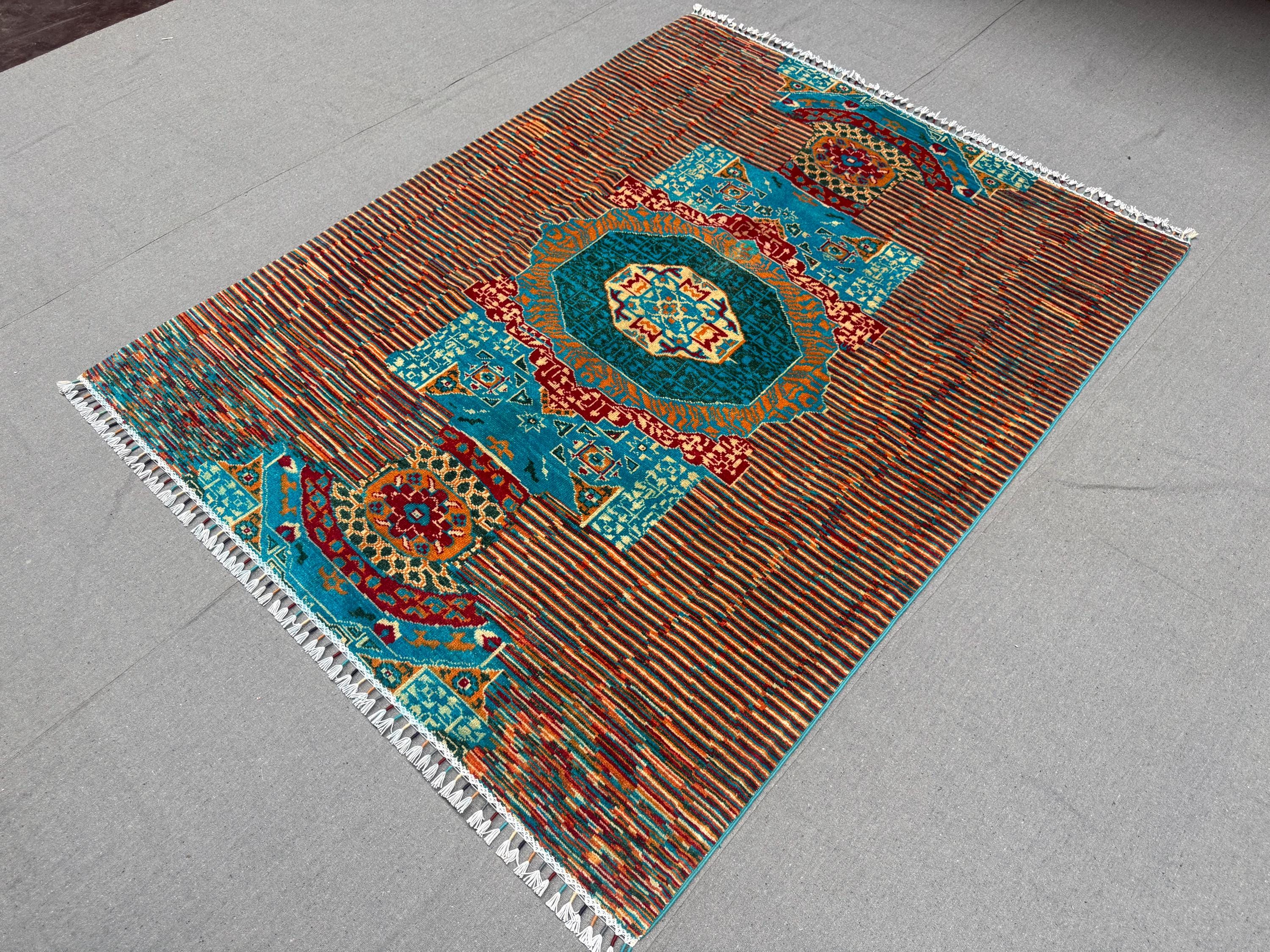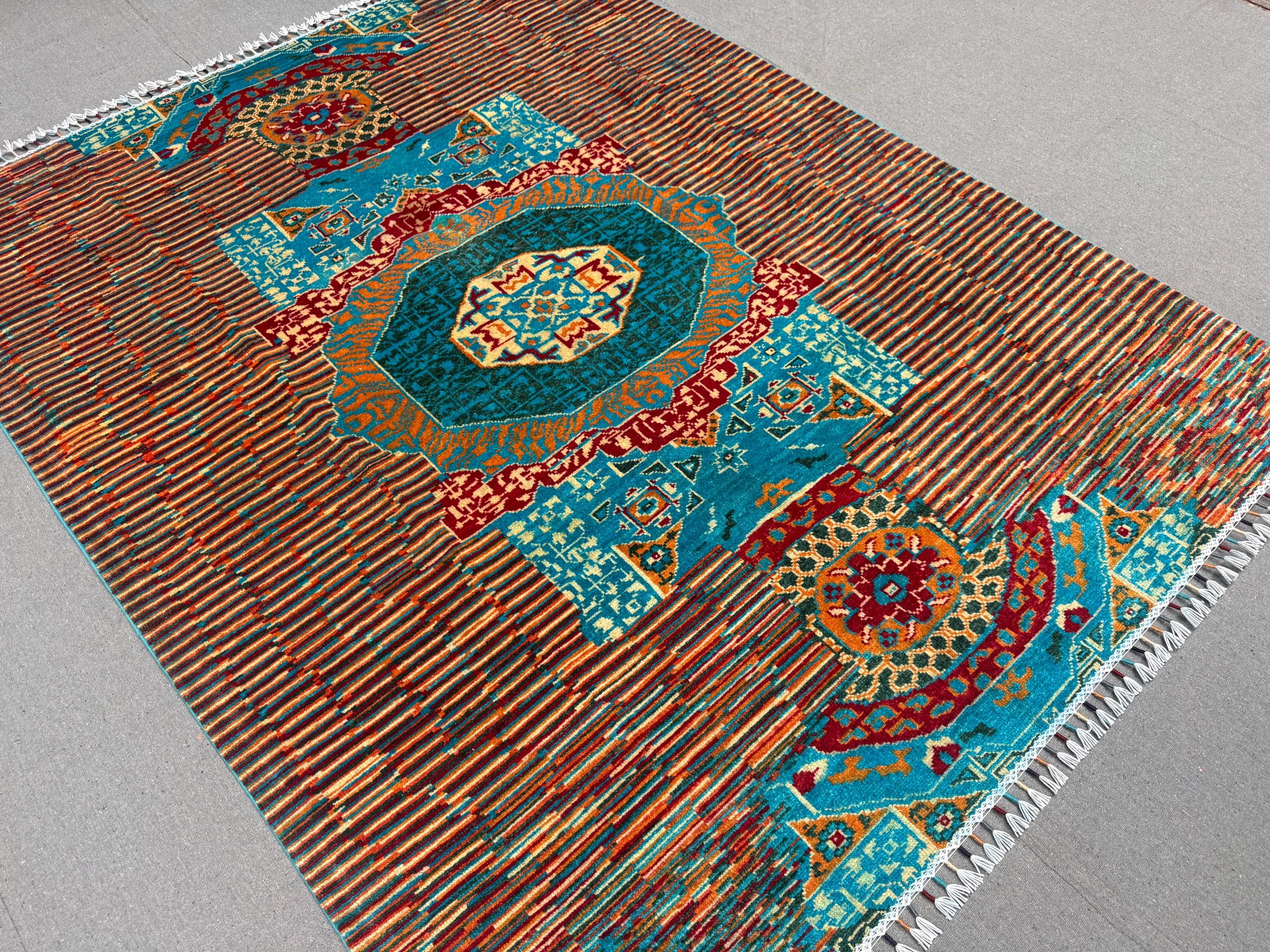 Handmade Mamluk Rug 5x6 ft Wool Area Rug Teal & Rust Geometric Carpet Modern Oriental Decor Hand-Knotted Medallion Accent Rug