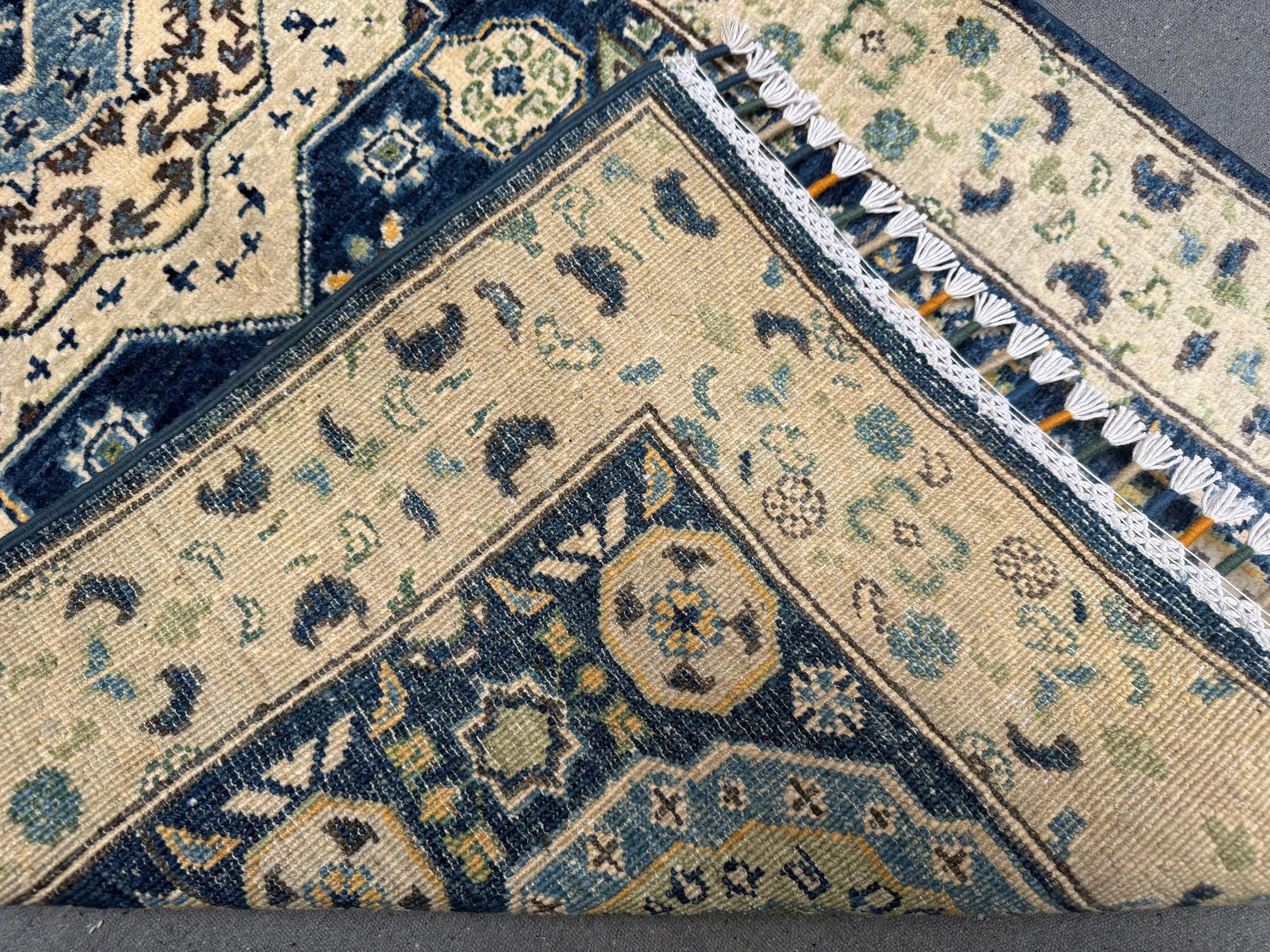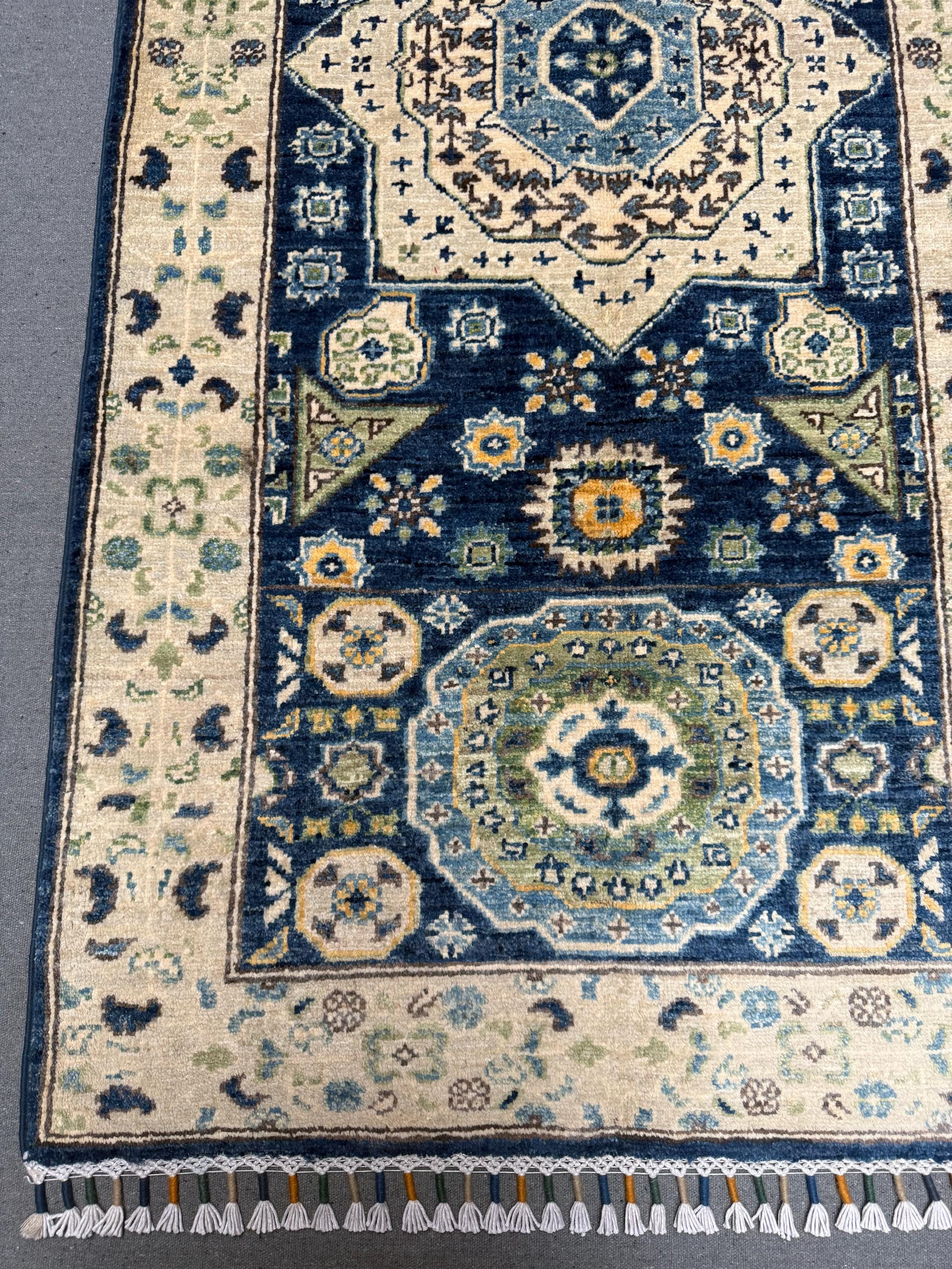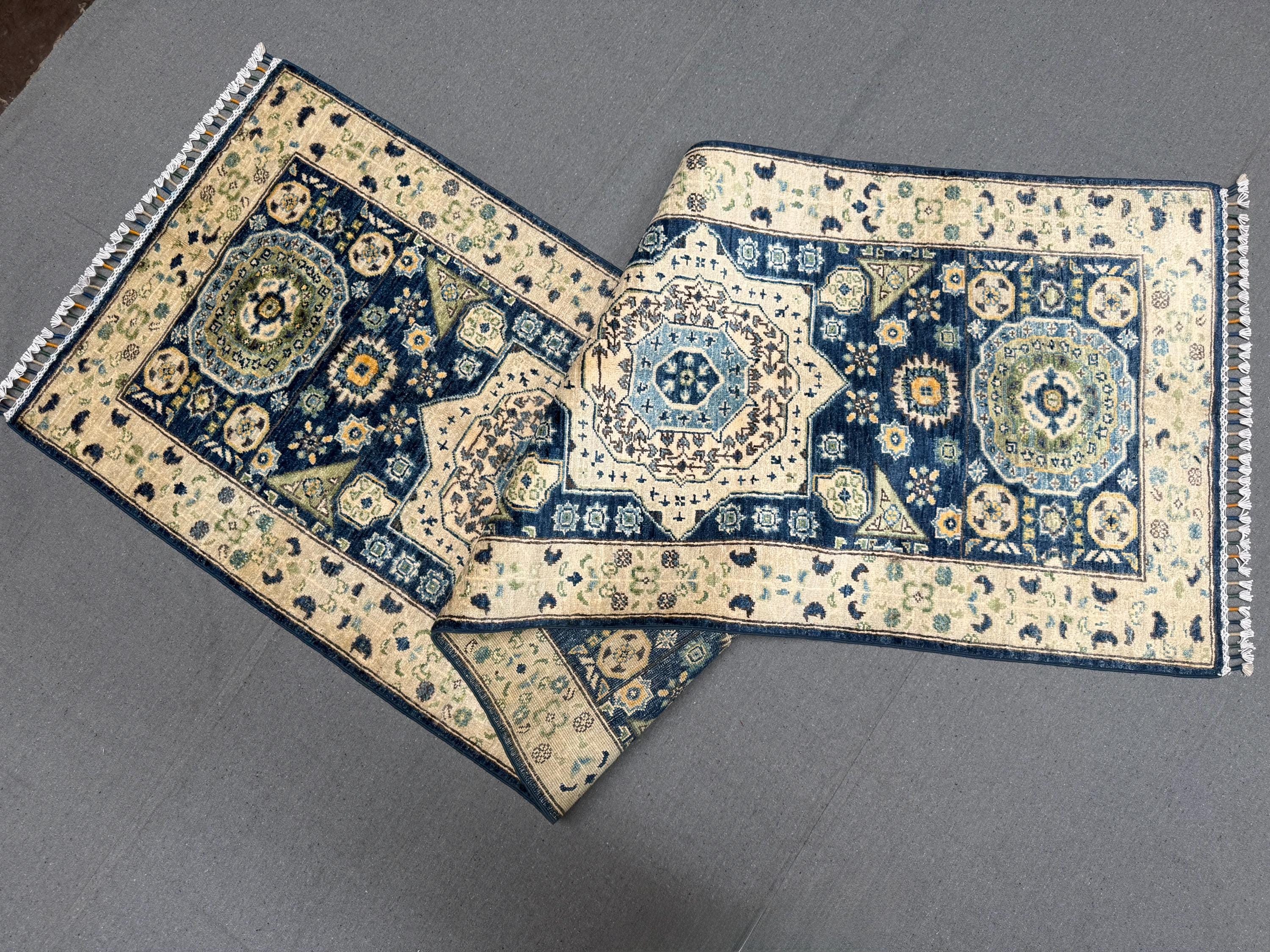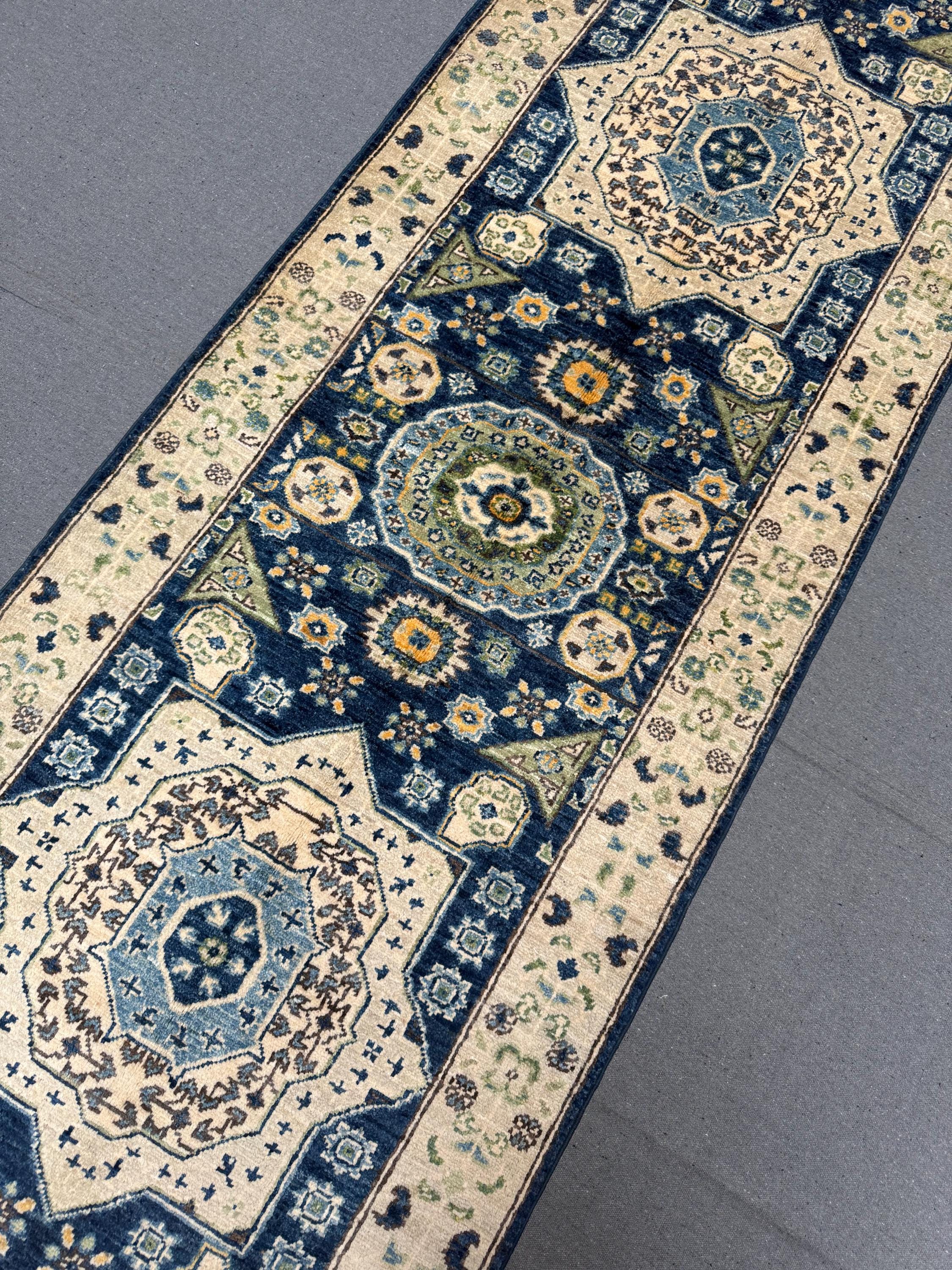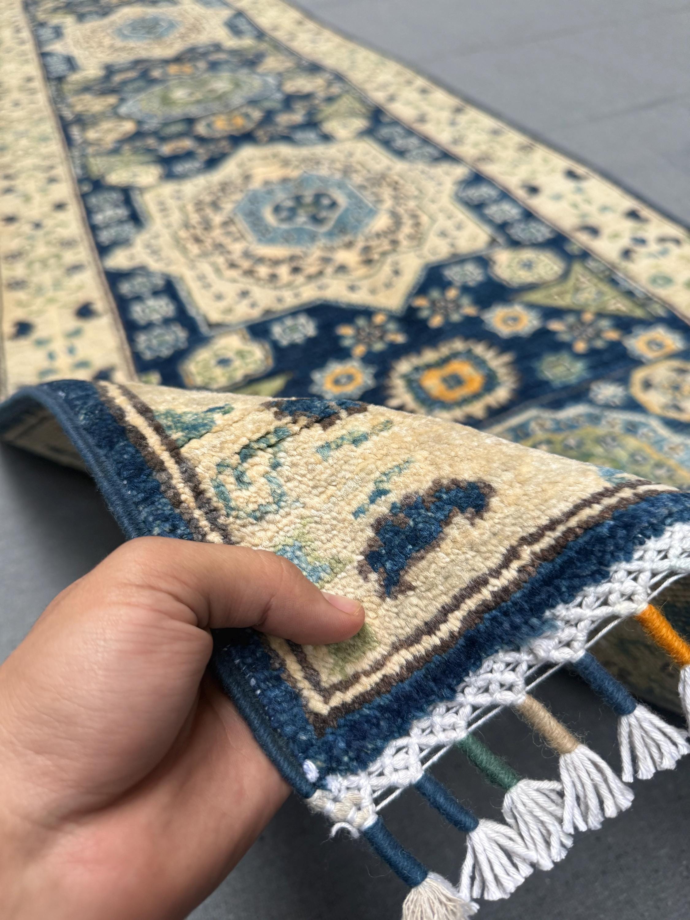 Add elegance and symmetry to your hallway with this handmade Mamluk runner rug, showcasing a detailed geometric design in rich shades of blue, ivory, olive, and gold. The repeating medallions and intricate motifs create a visually balanced and sophisticated look that instantly enhances any entryway, kitchen, hallway, or staircase landing.