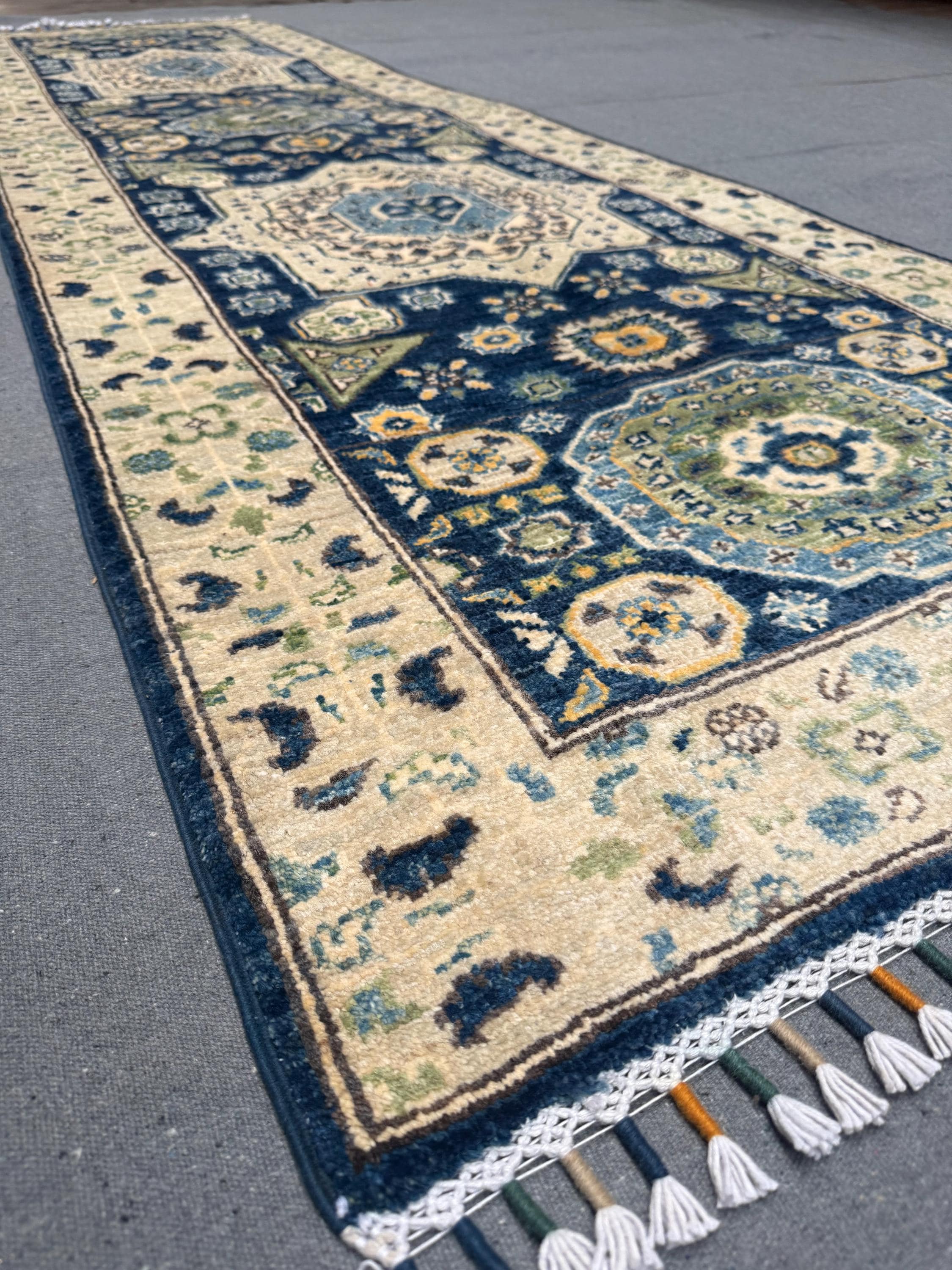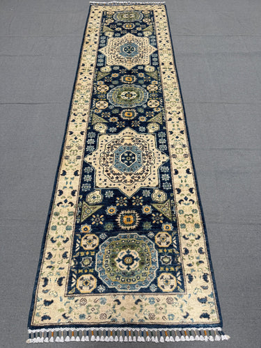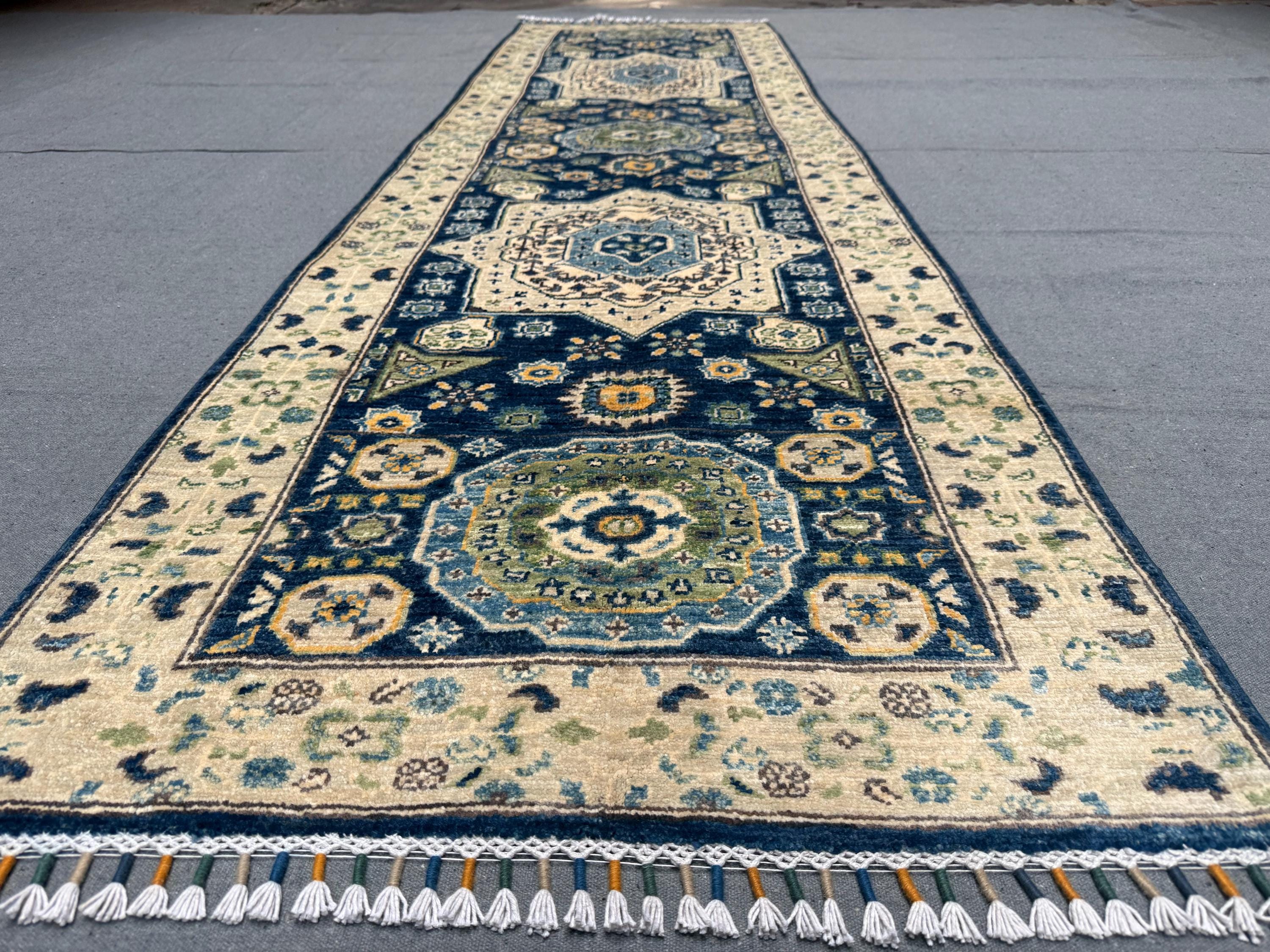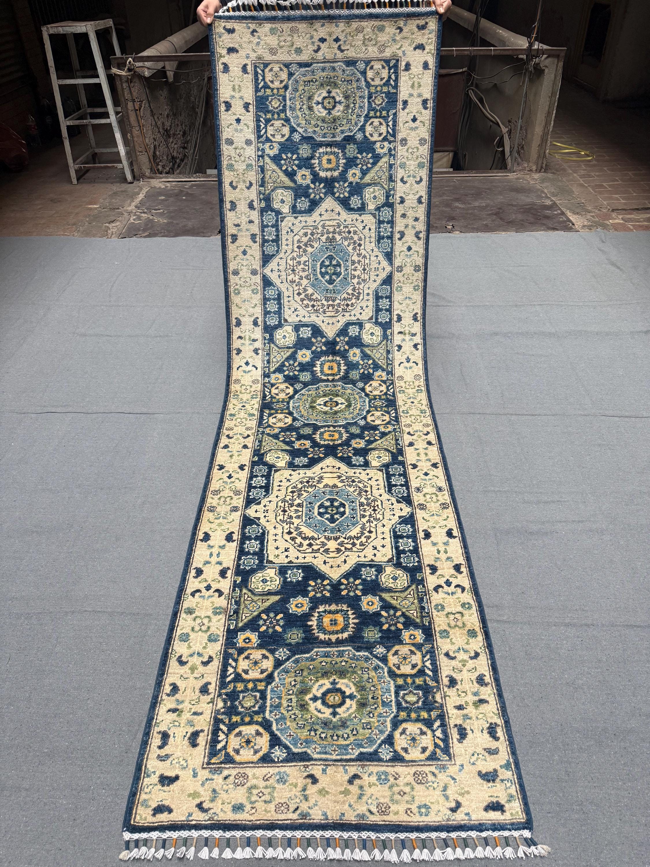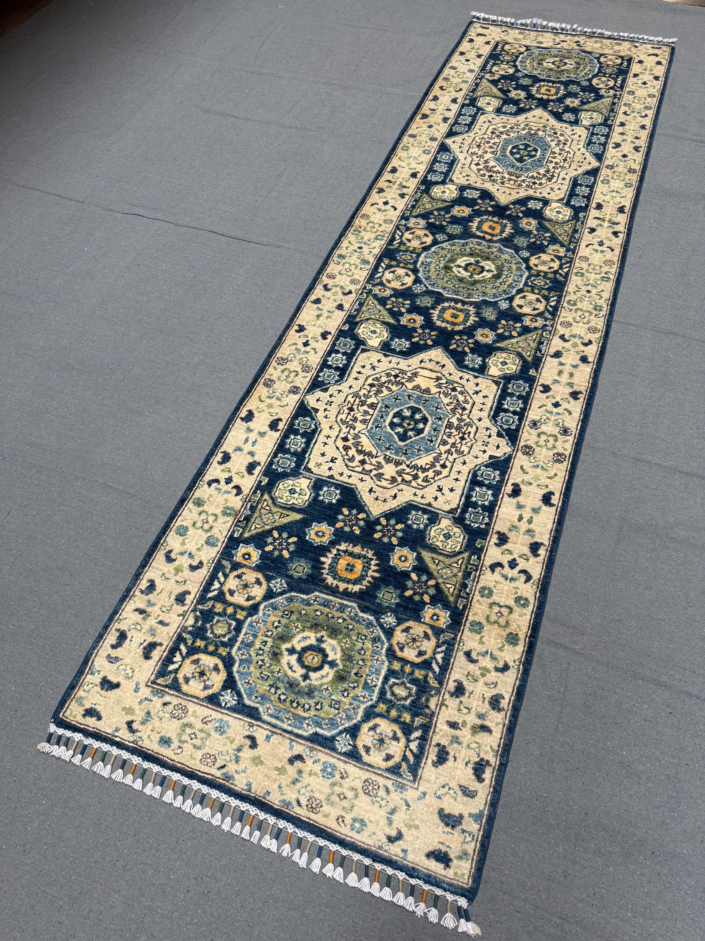 Handmade Mamluk Runner Rug 3x9 ft Wool Hallway Runner Blue & Ivory Geometric Carpet Long Hand-Knotted Rug for Entryway Stair Decor