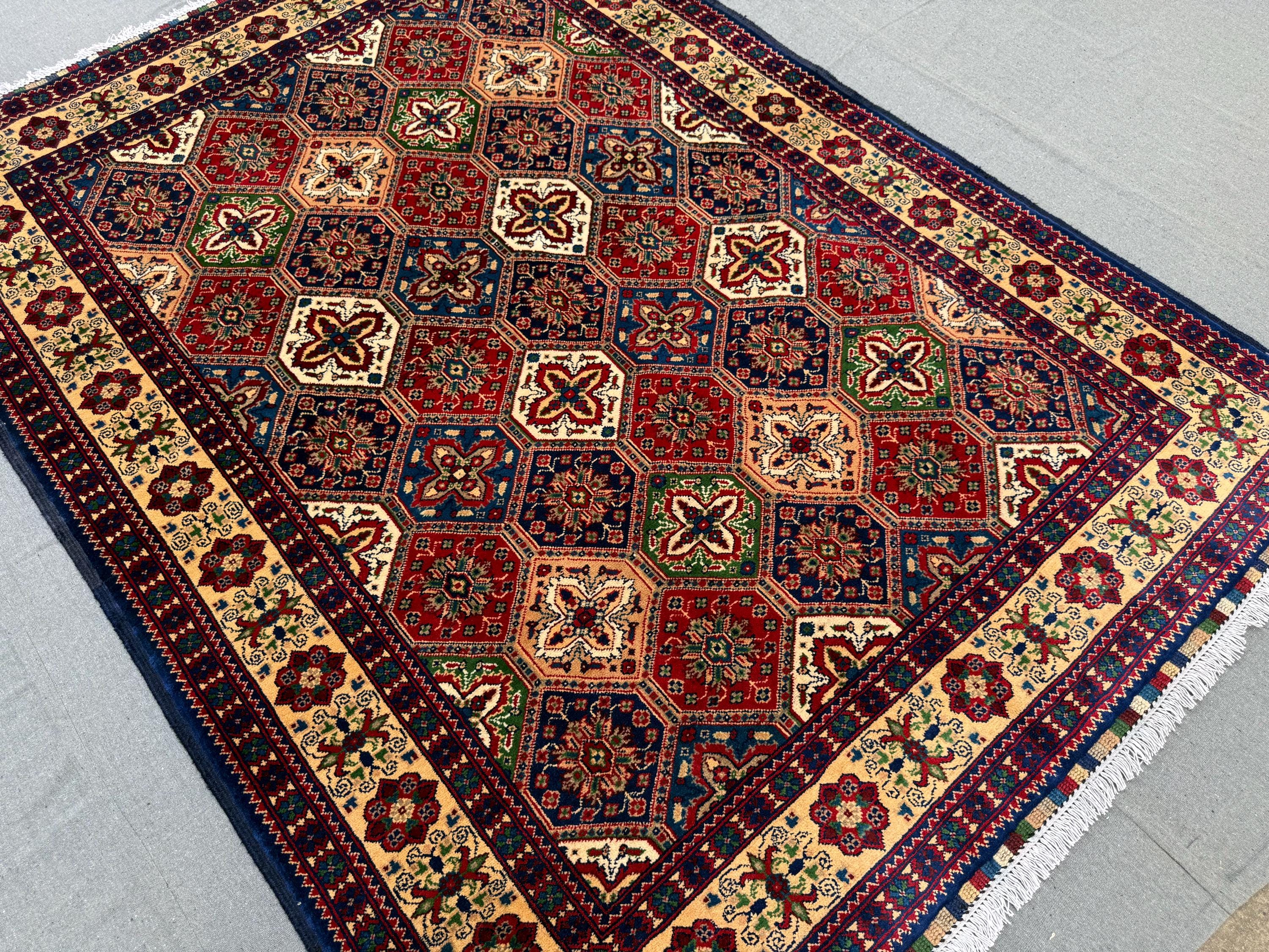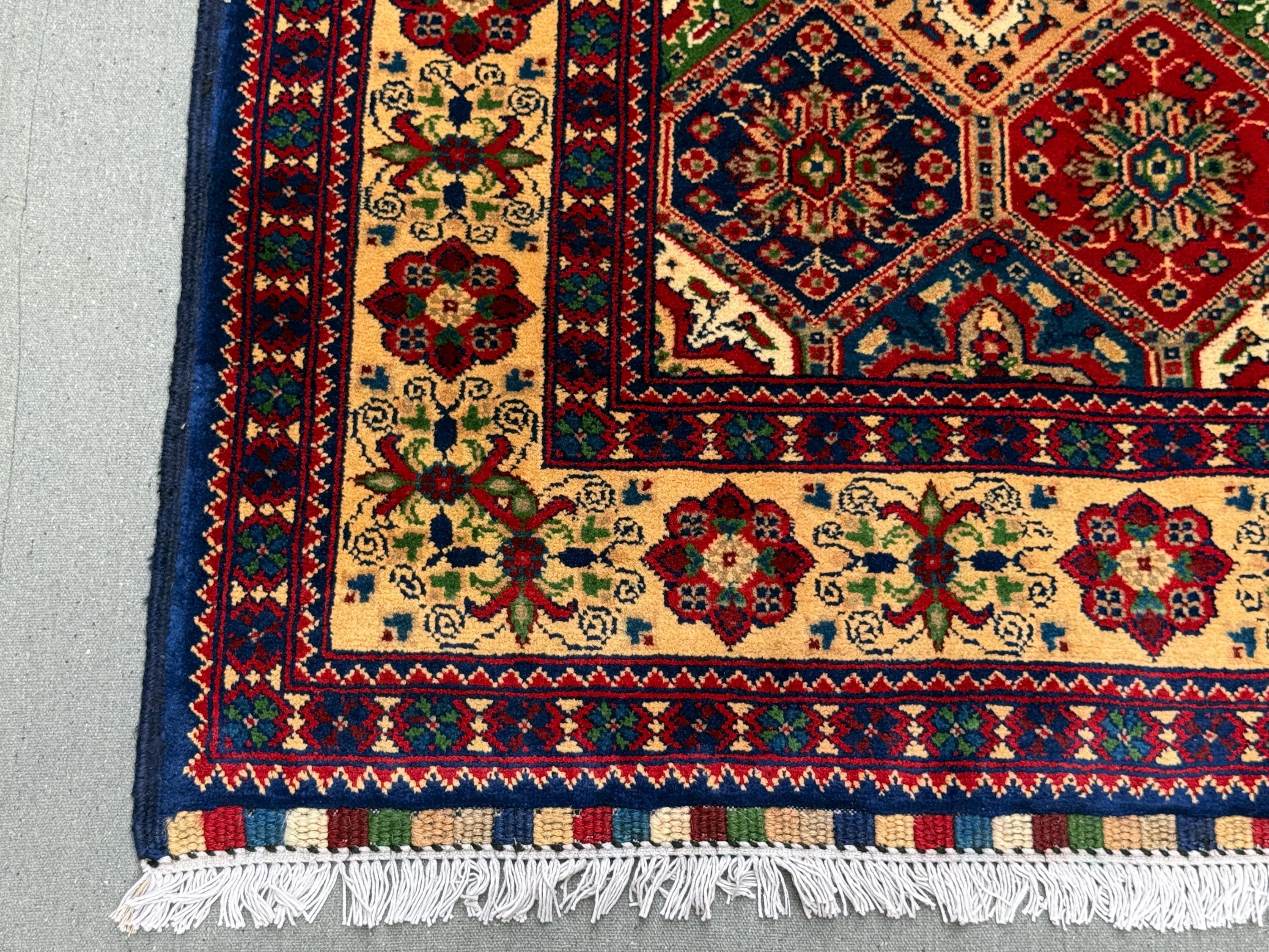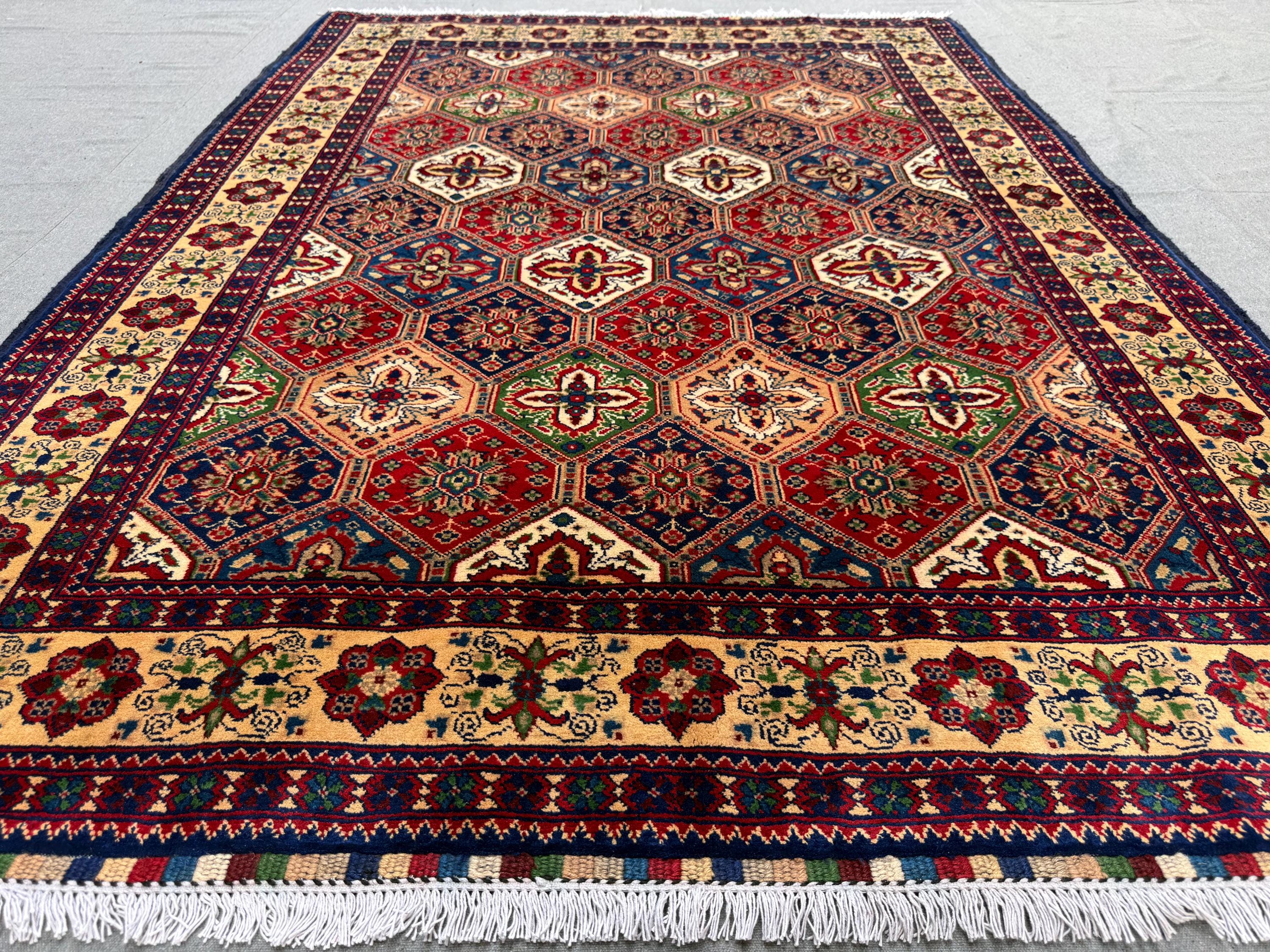 Woven with 100% handspun wool and dyed with natural vegetable colors, this rug delivers both authenticity and durability. Its approx. 5x7 ft size is perfect for medium-sized spaces such as living rooms, dining rooms, or bedrooms.